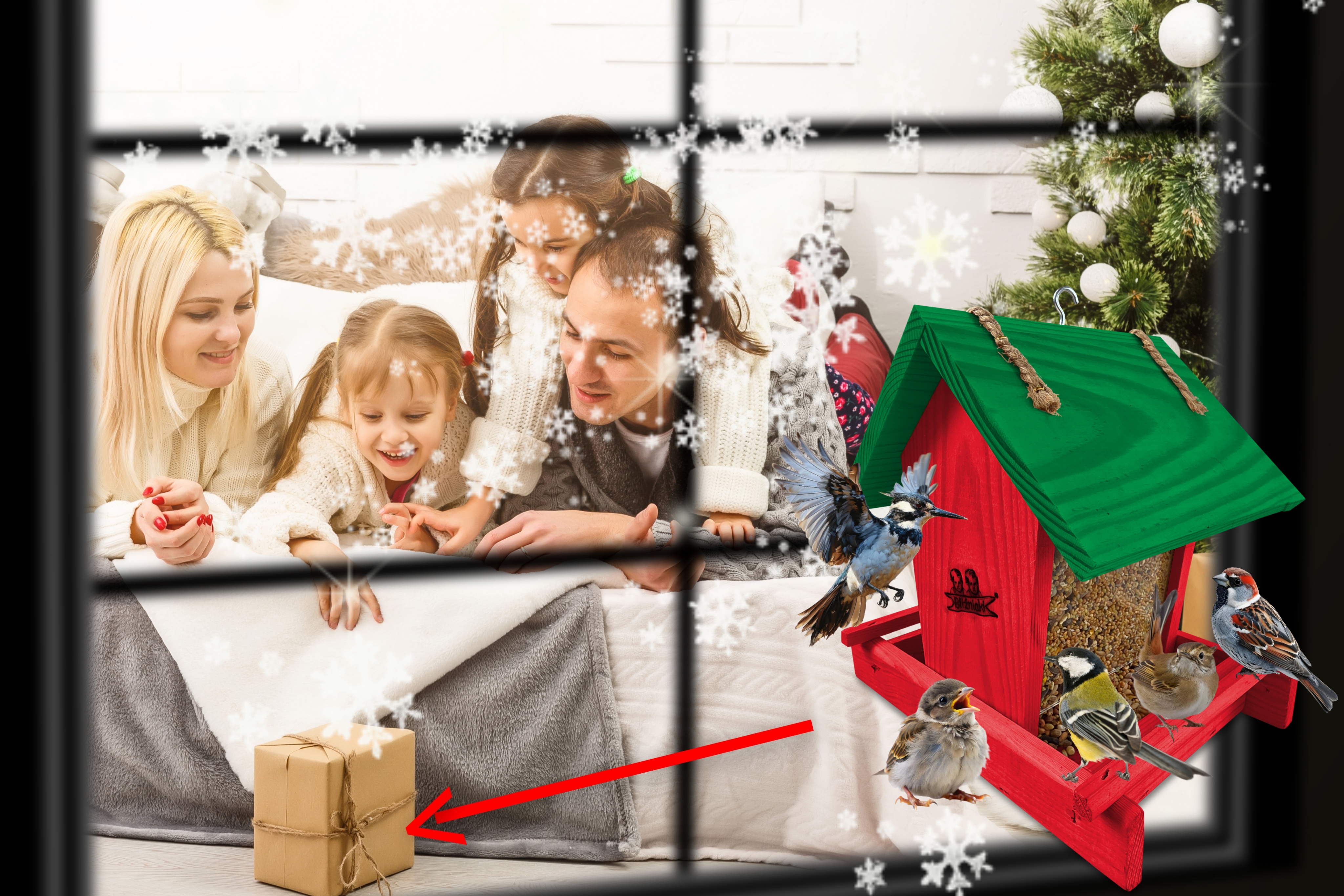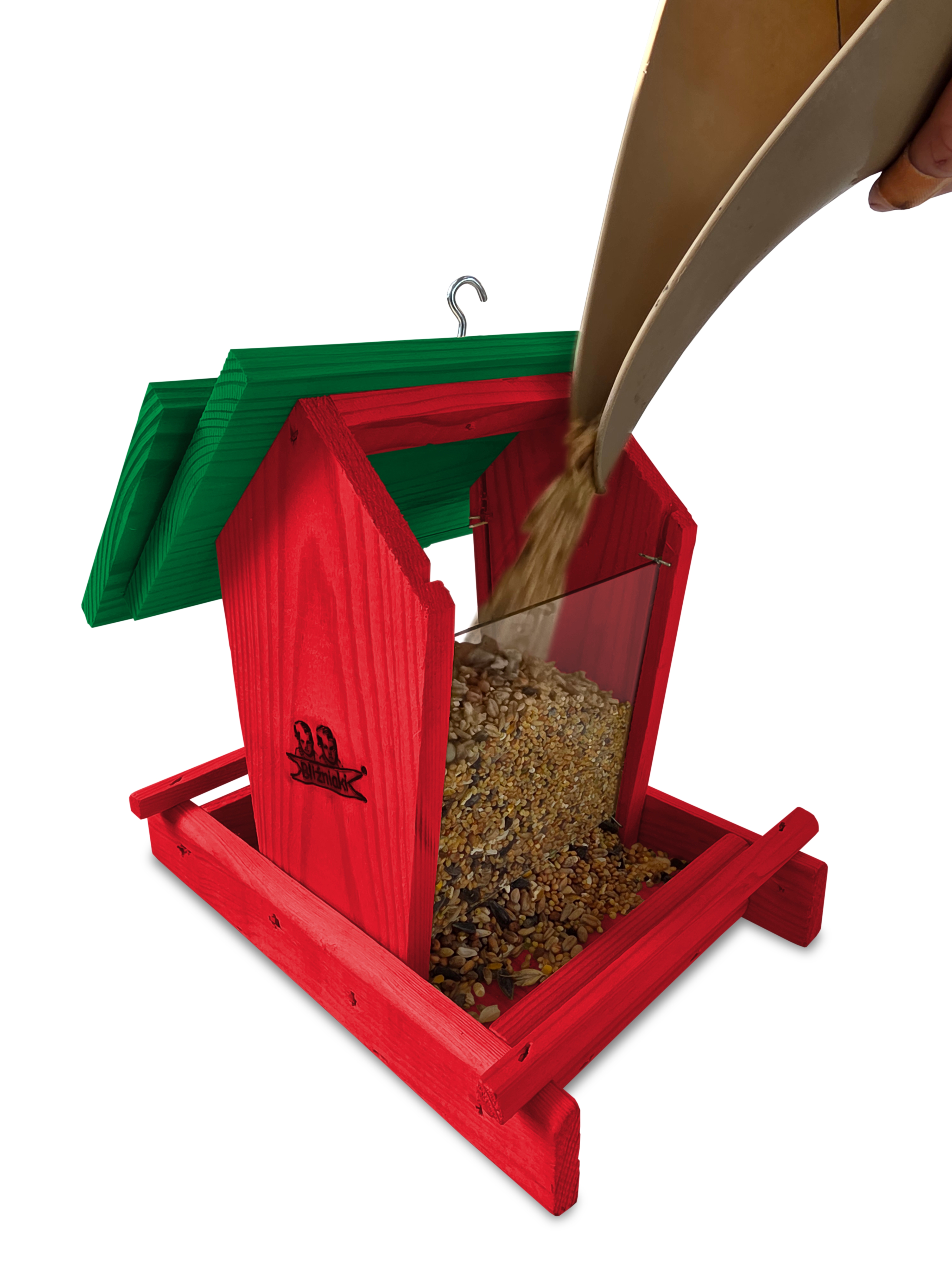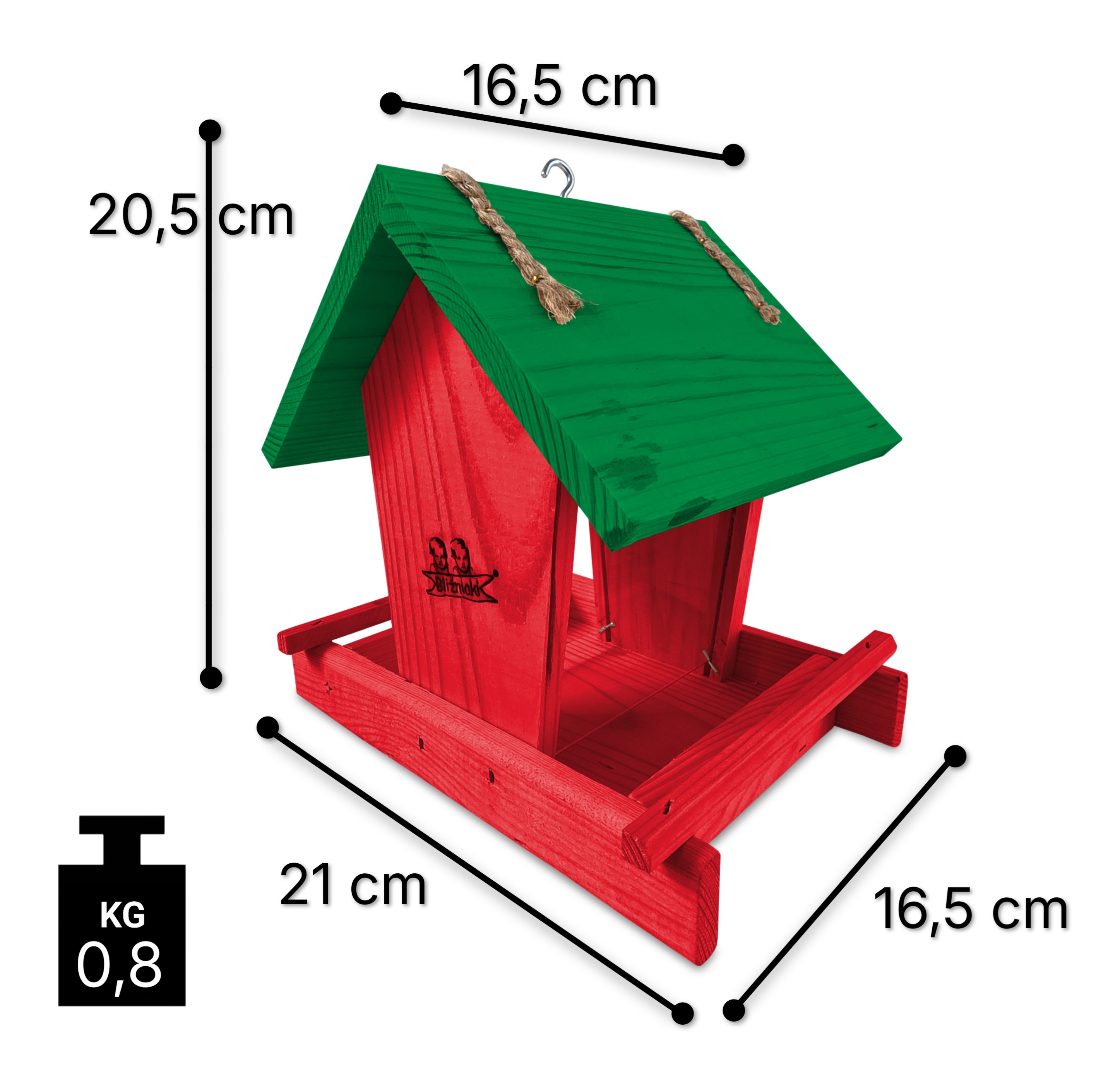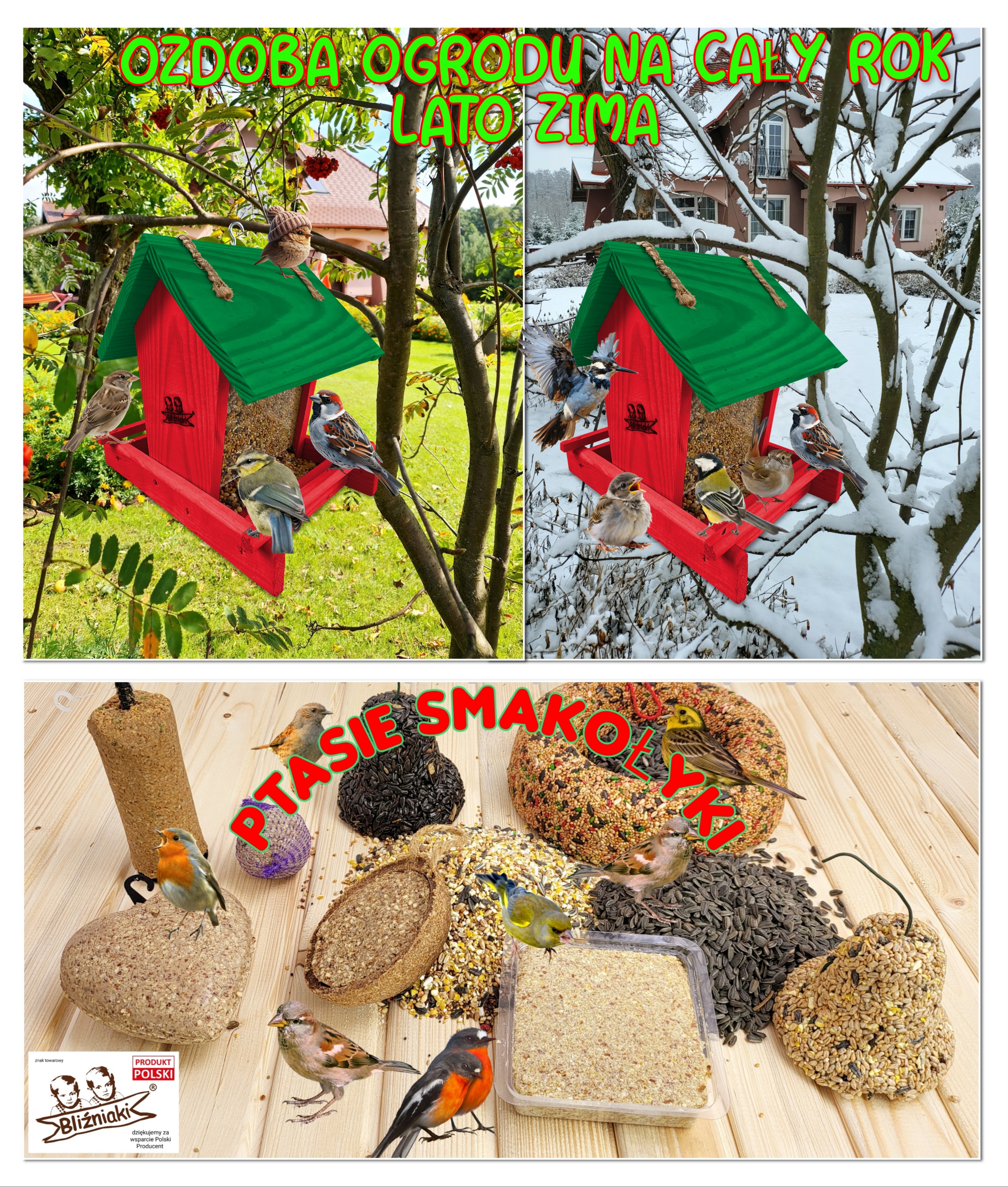 - Karmnik wykonany jest w całości z drewna iglastego, KOLOR CZERWONY Z CIEMNOZIELONYM DACHEM