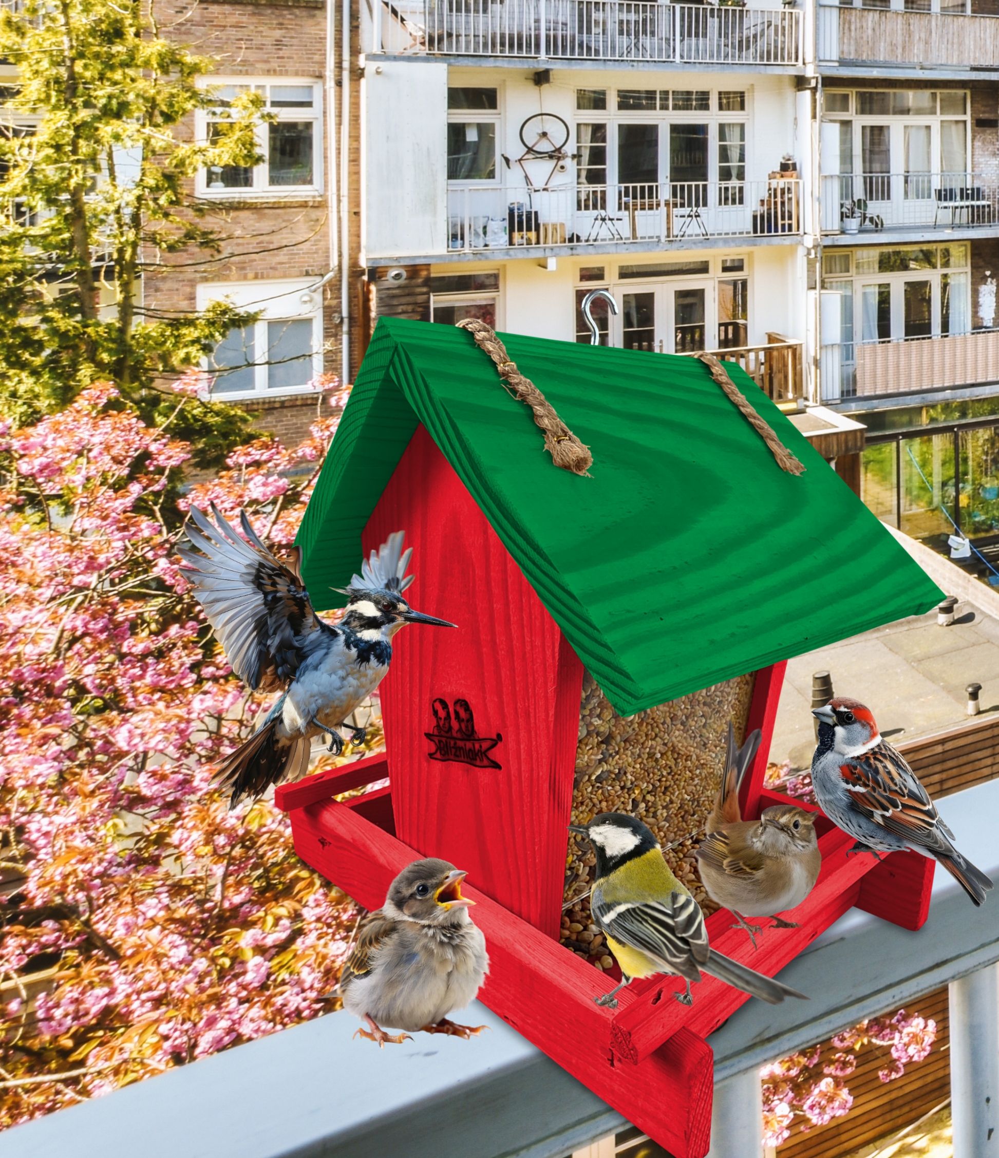Karmnik posiada haczyk, umożliwiający zawieszenie go na balkonie, drzewie, pod dachem altany. Dzięki temu przylatujące do niego ptaki nie staną się łatwym kąskiem dla kotów i innych zwierząt. Dzięki małym gabarytom, z łatwością można wkomponować go w elementy architektury ogrodowej, na balkonie czy nawet parapecie.