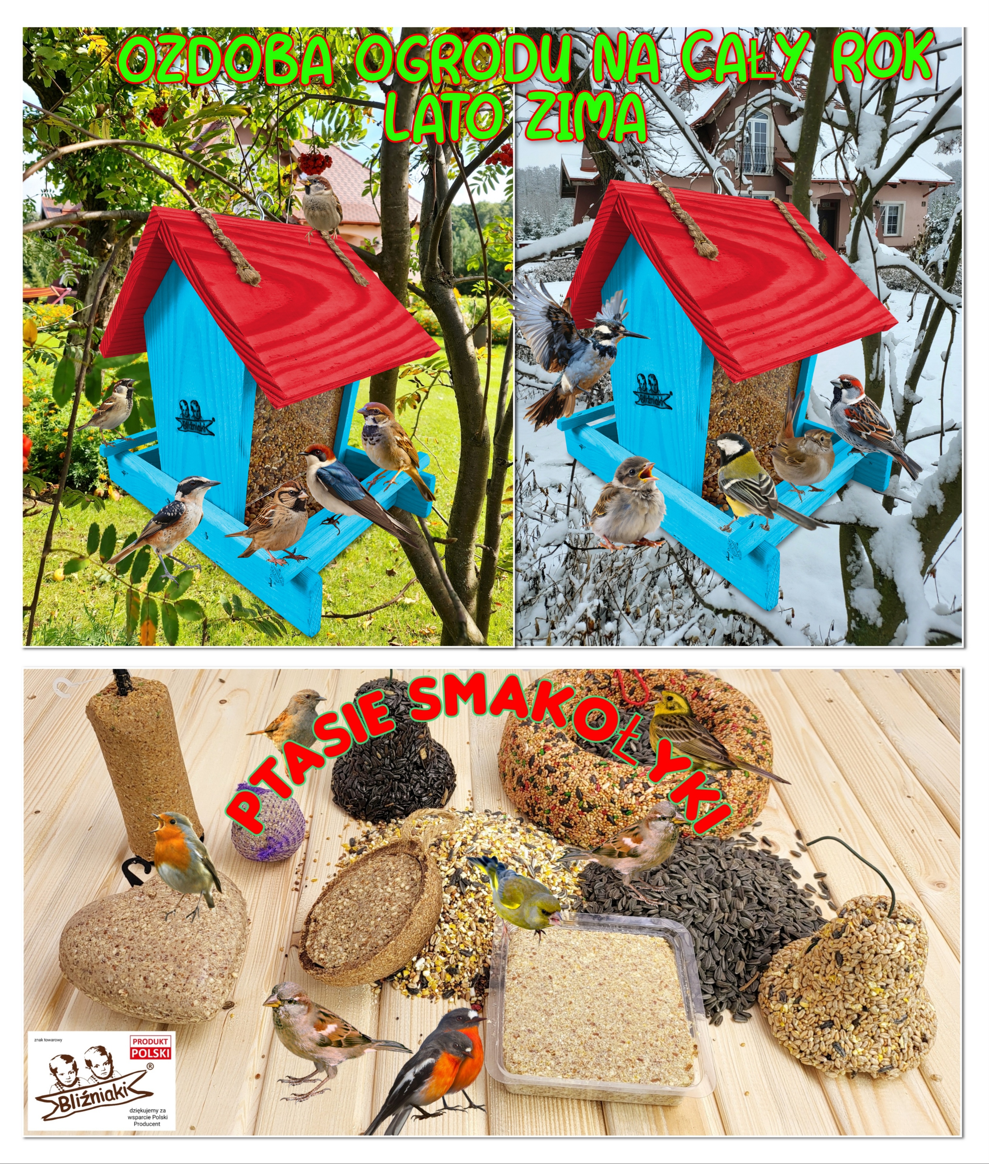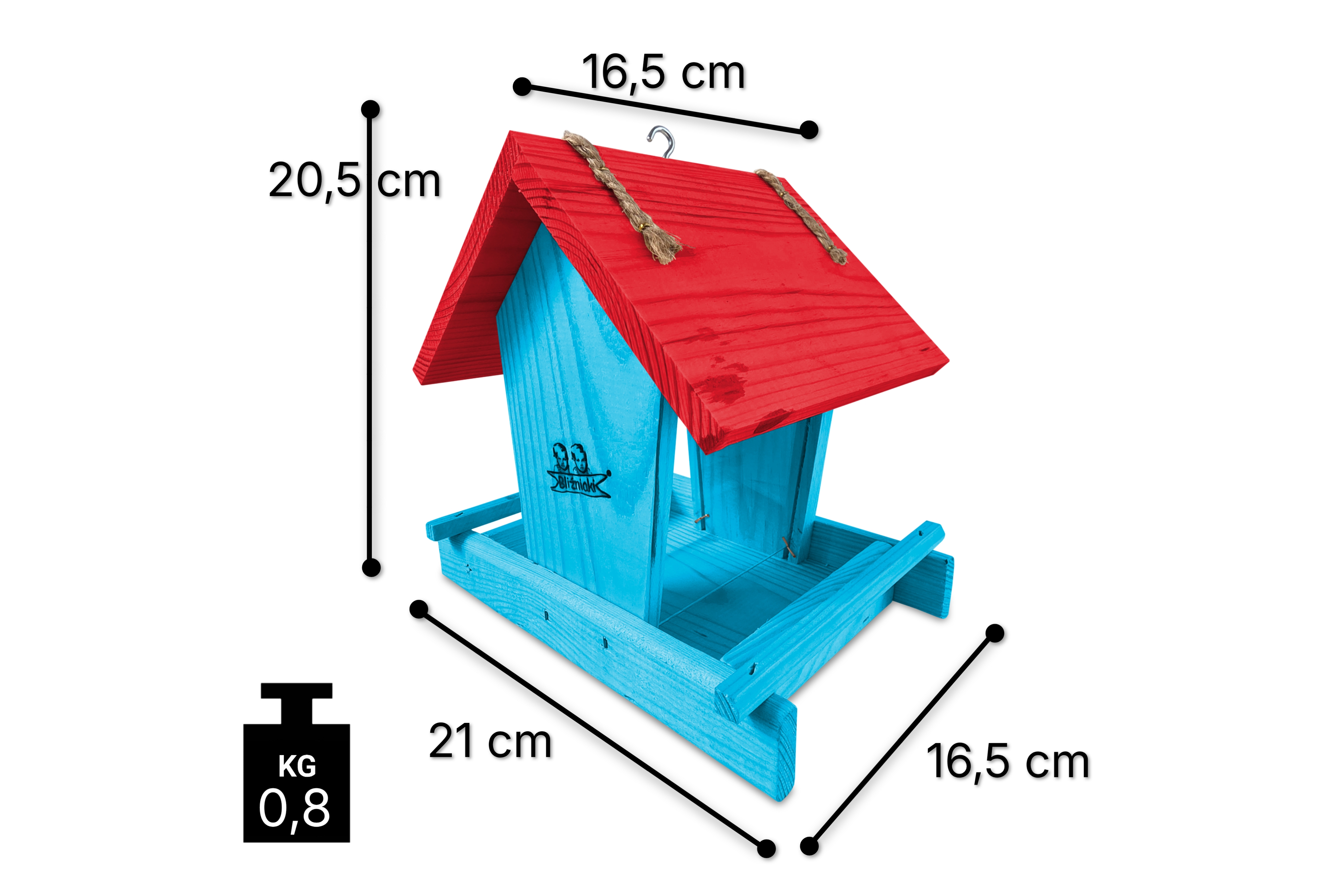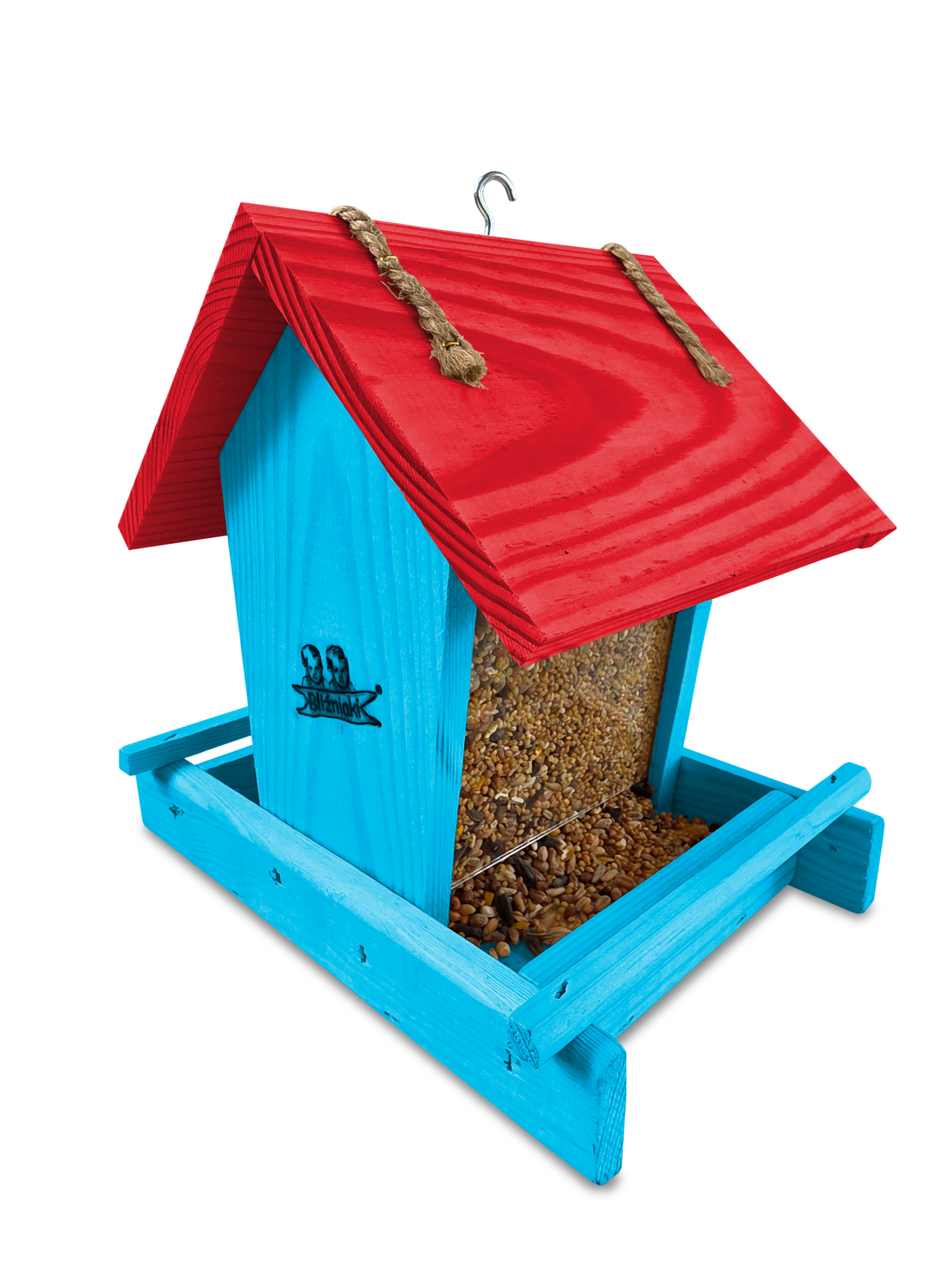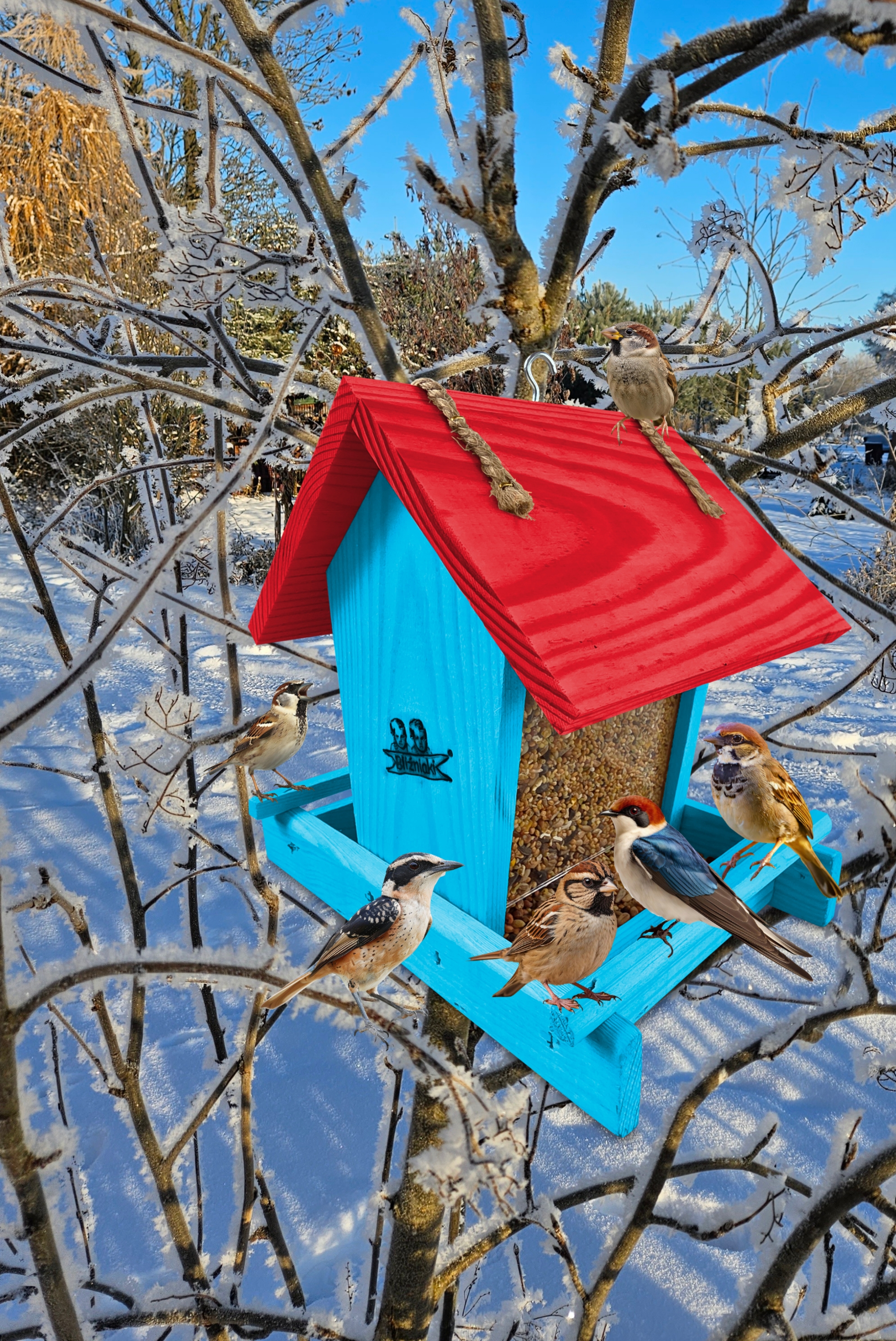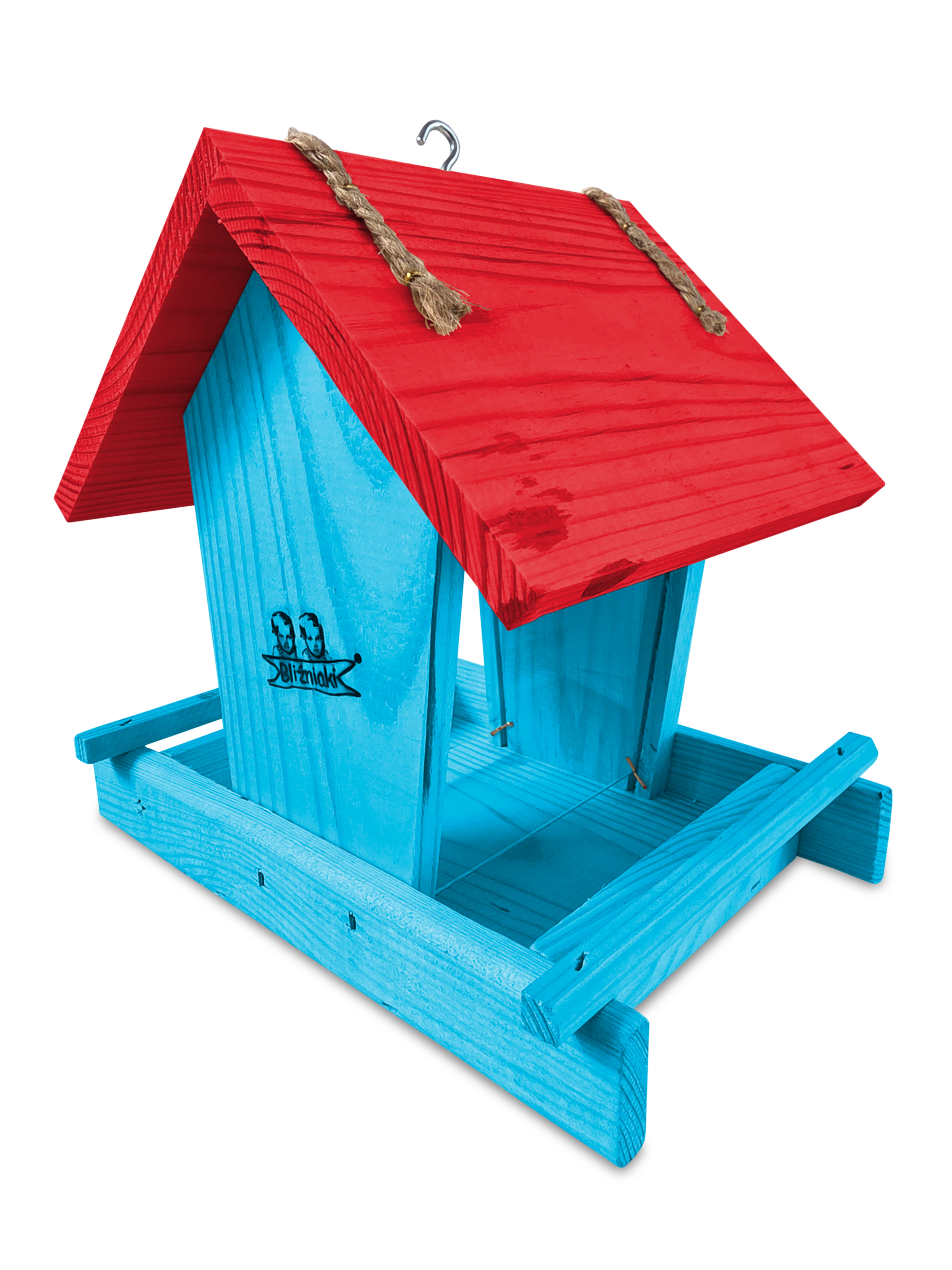 - Karmnik wykonany jest w całości z drewna iglastego, KOLOR JASNONIEBIESKI Z CZERWONYM DACHEM