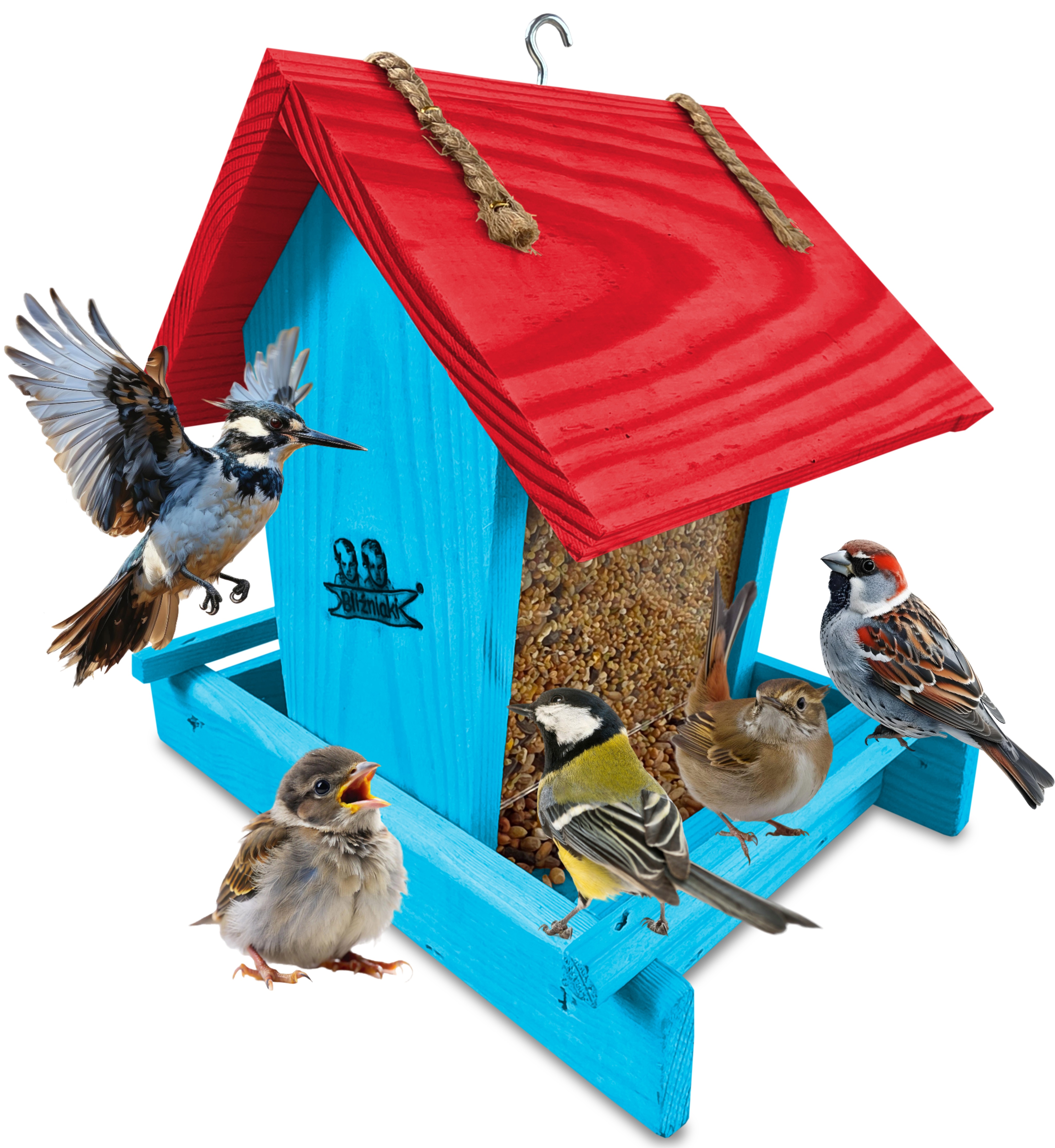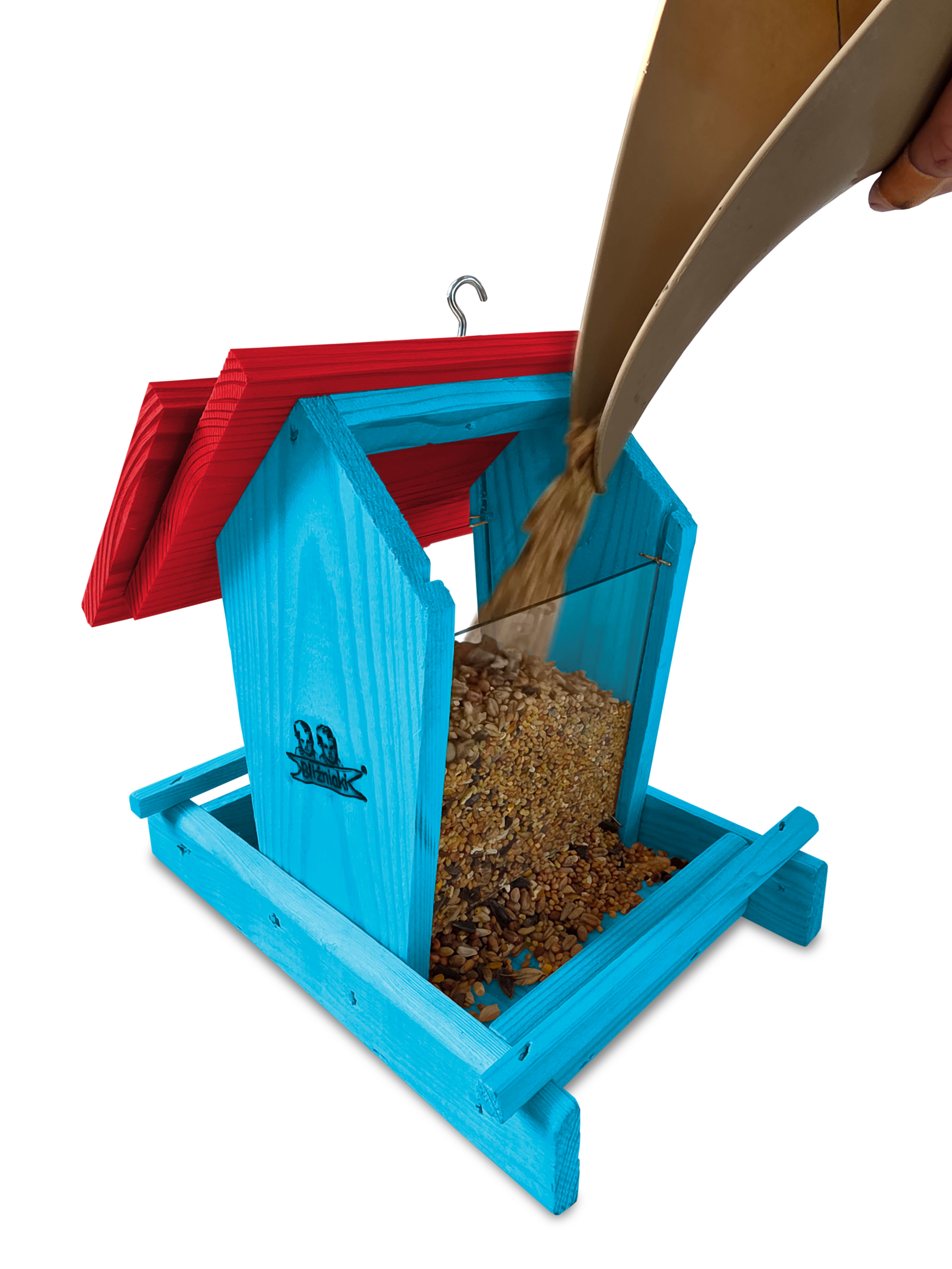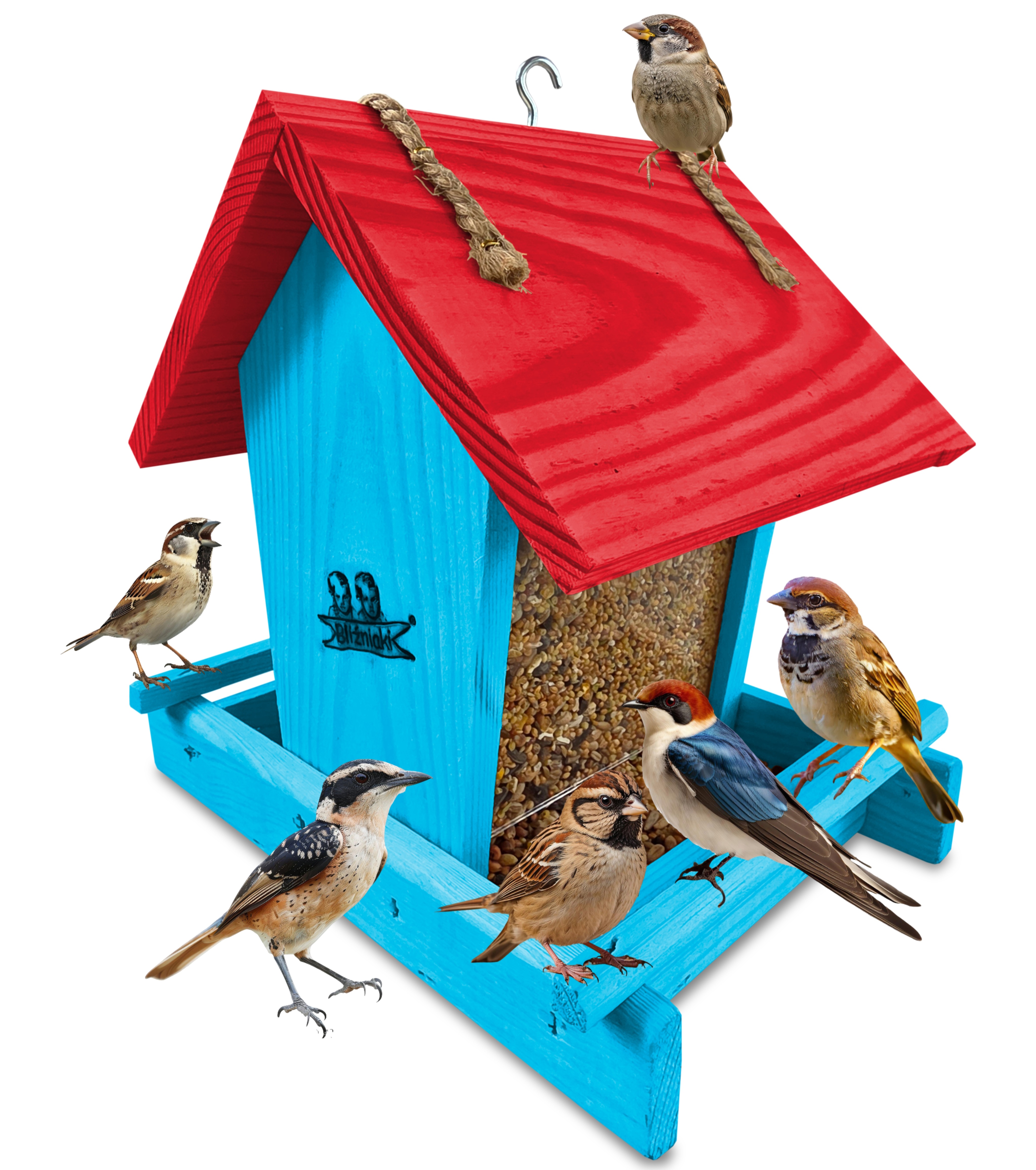 Przedmiotem sprzedaży jest ozdobny drewniany karmnik dla ptaków z dozownikiem ziarna model K29 NBP CB kolor jasnoniebieski z czerwonym dachem