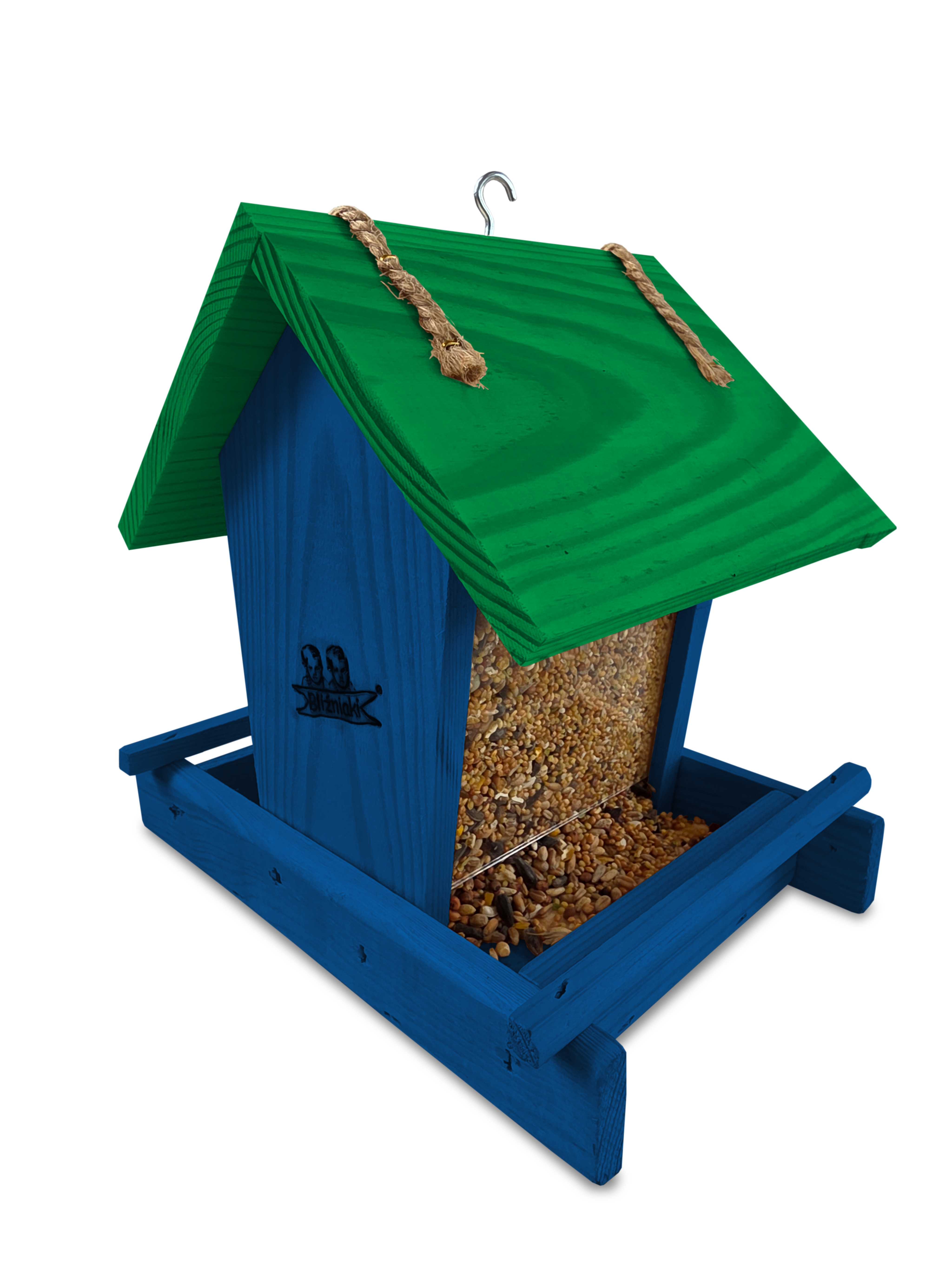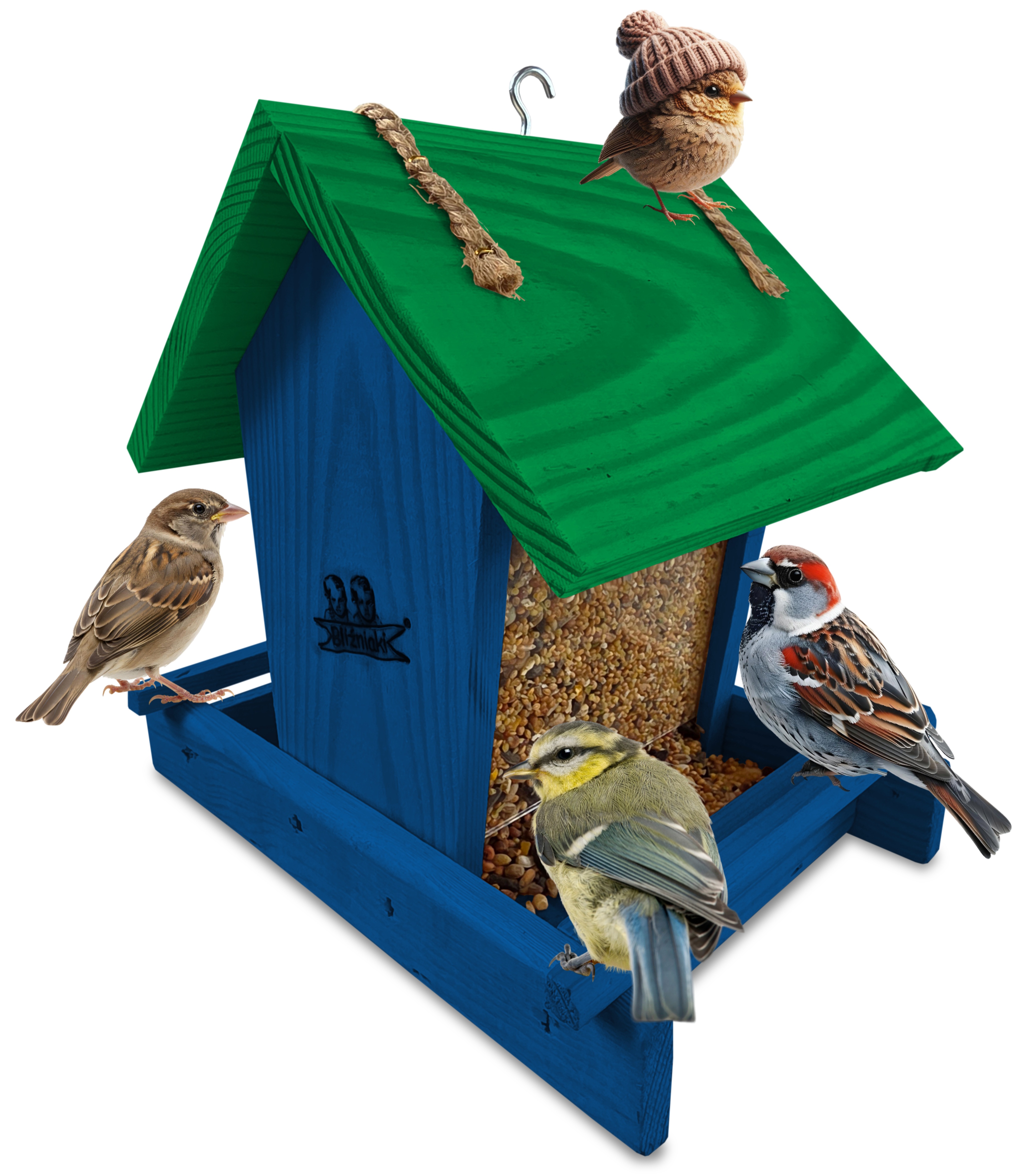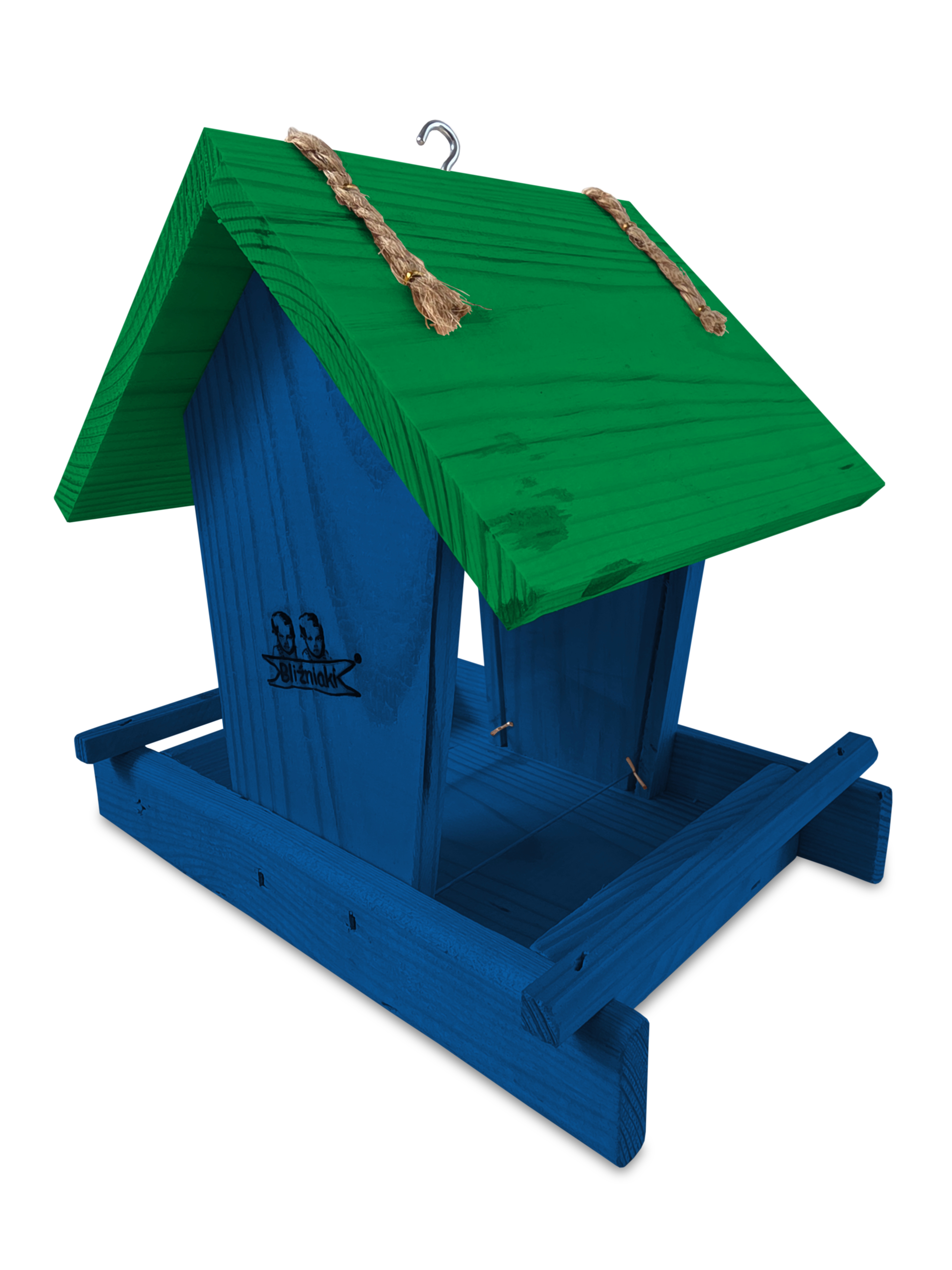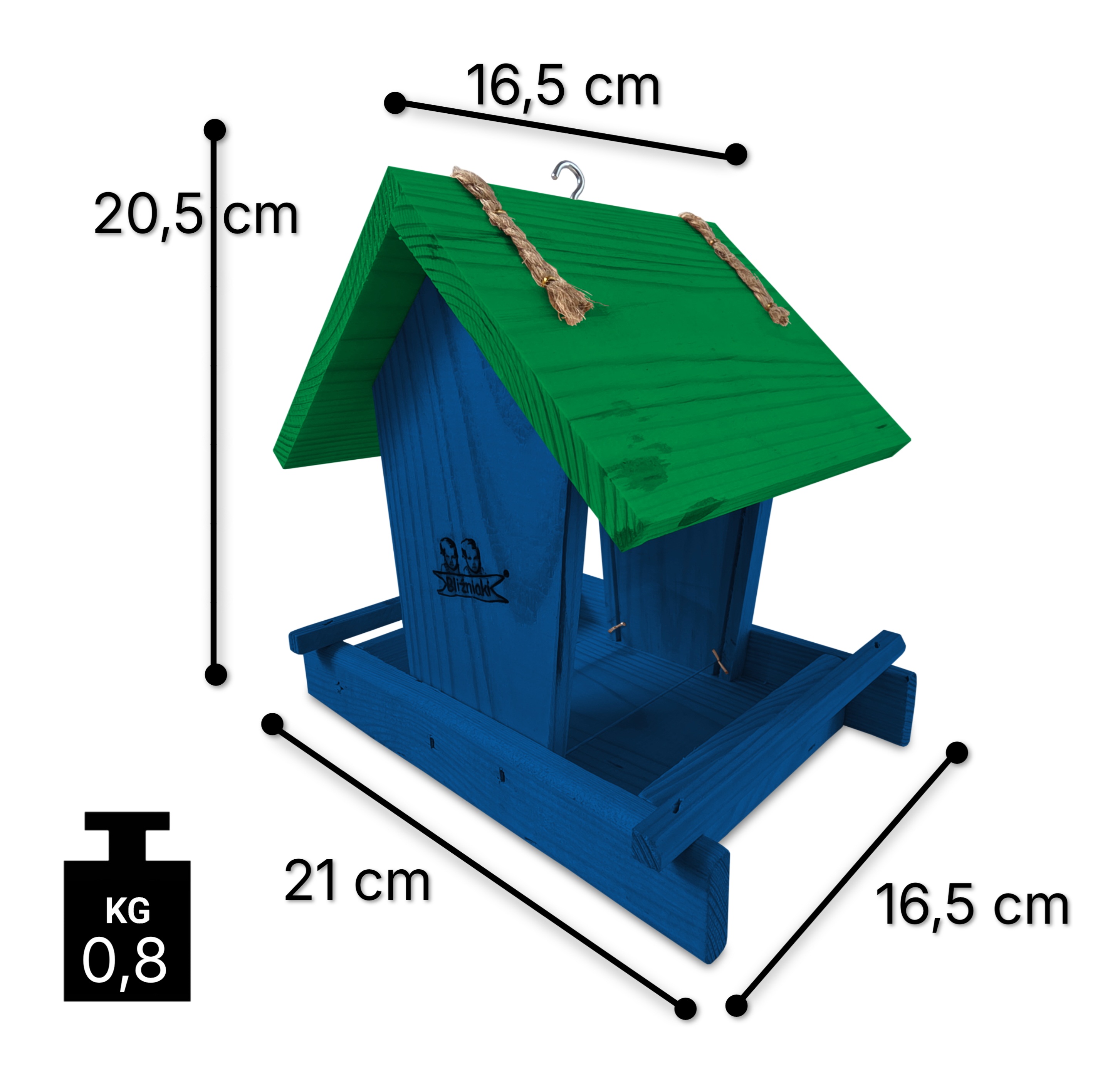 - Karmnik wykonany jest w całości z drewna iglastego, KOLOR CIEMNONIEBIESKI Z CIEMNOZIELONYM DACHEM