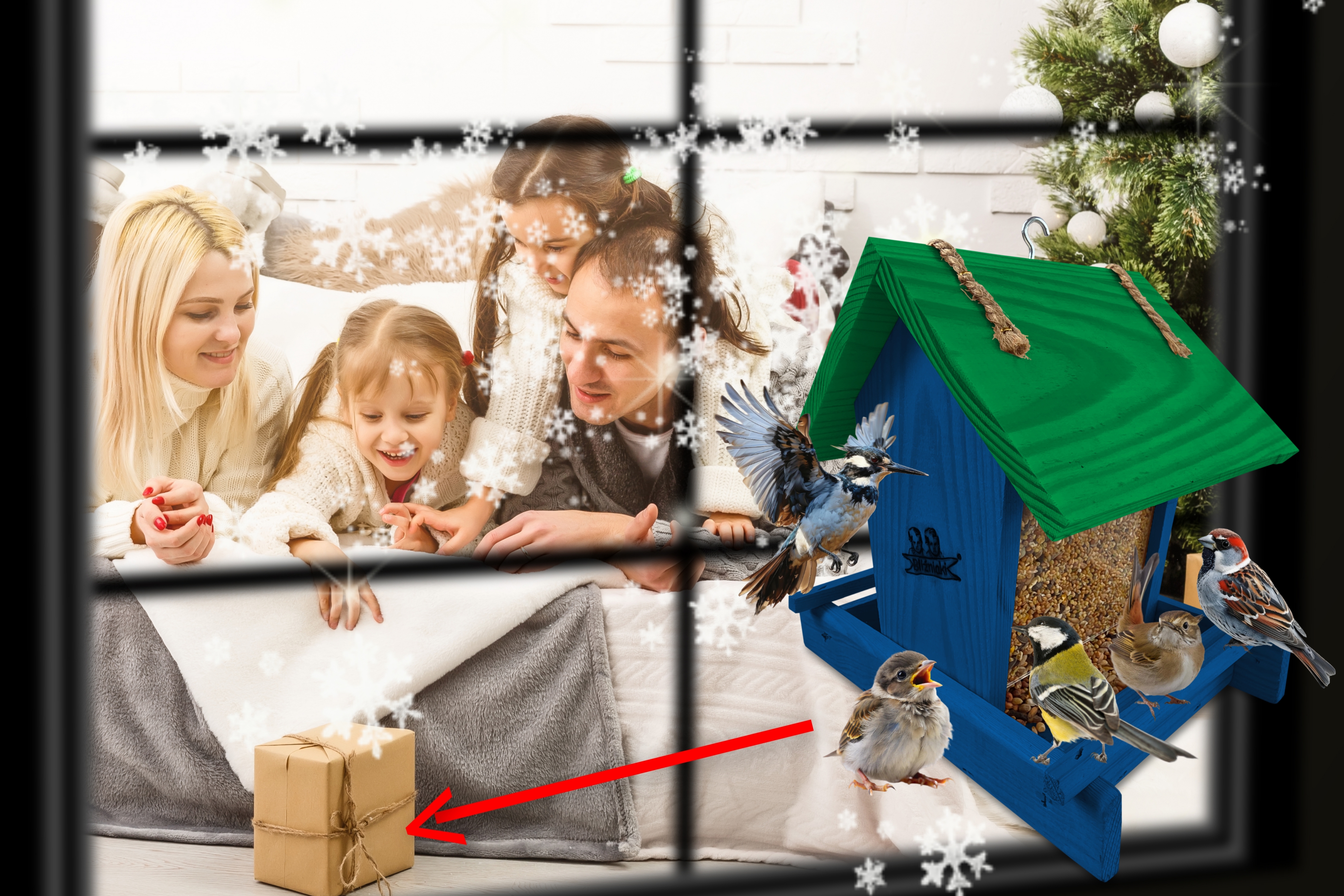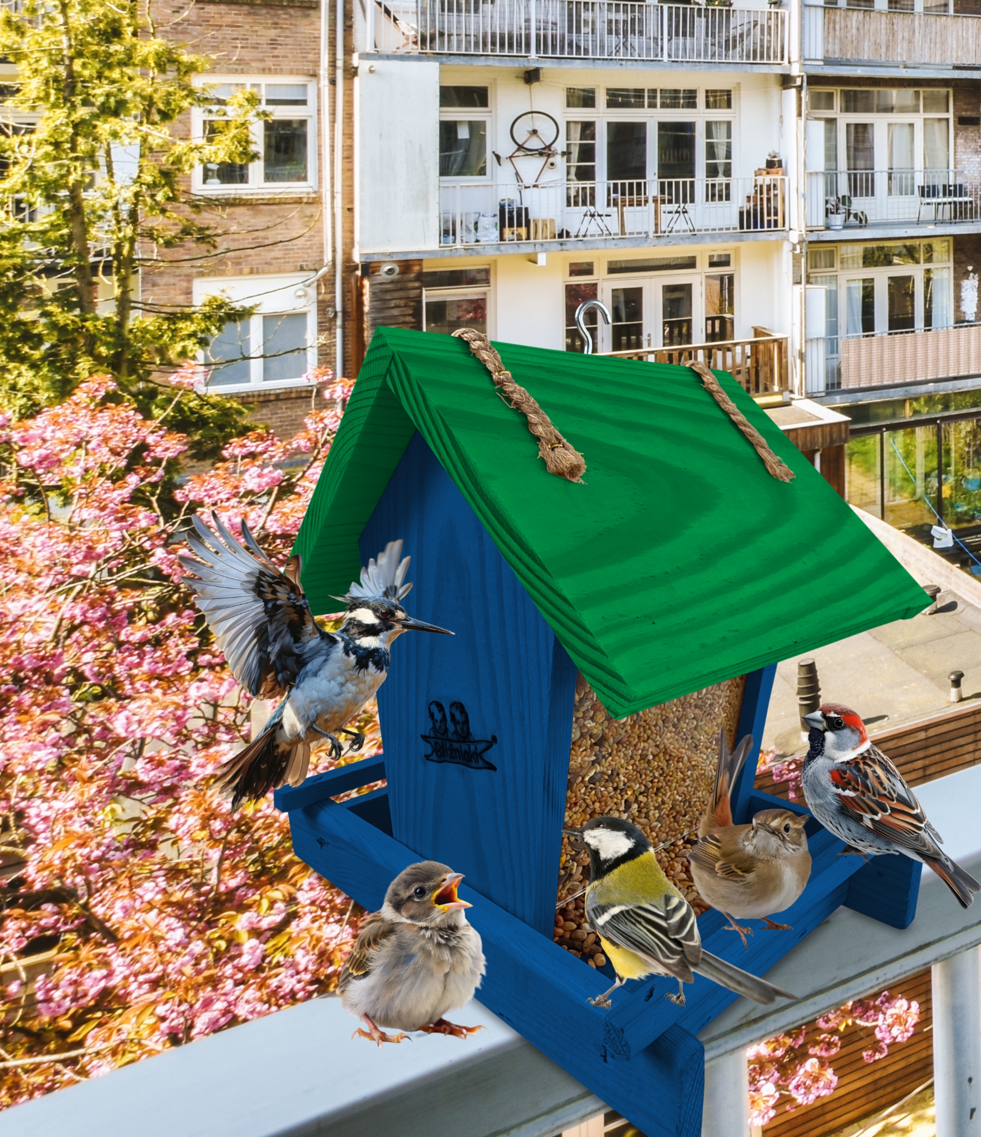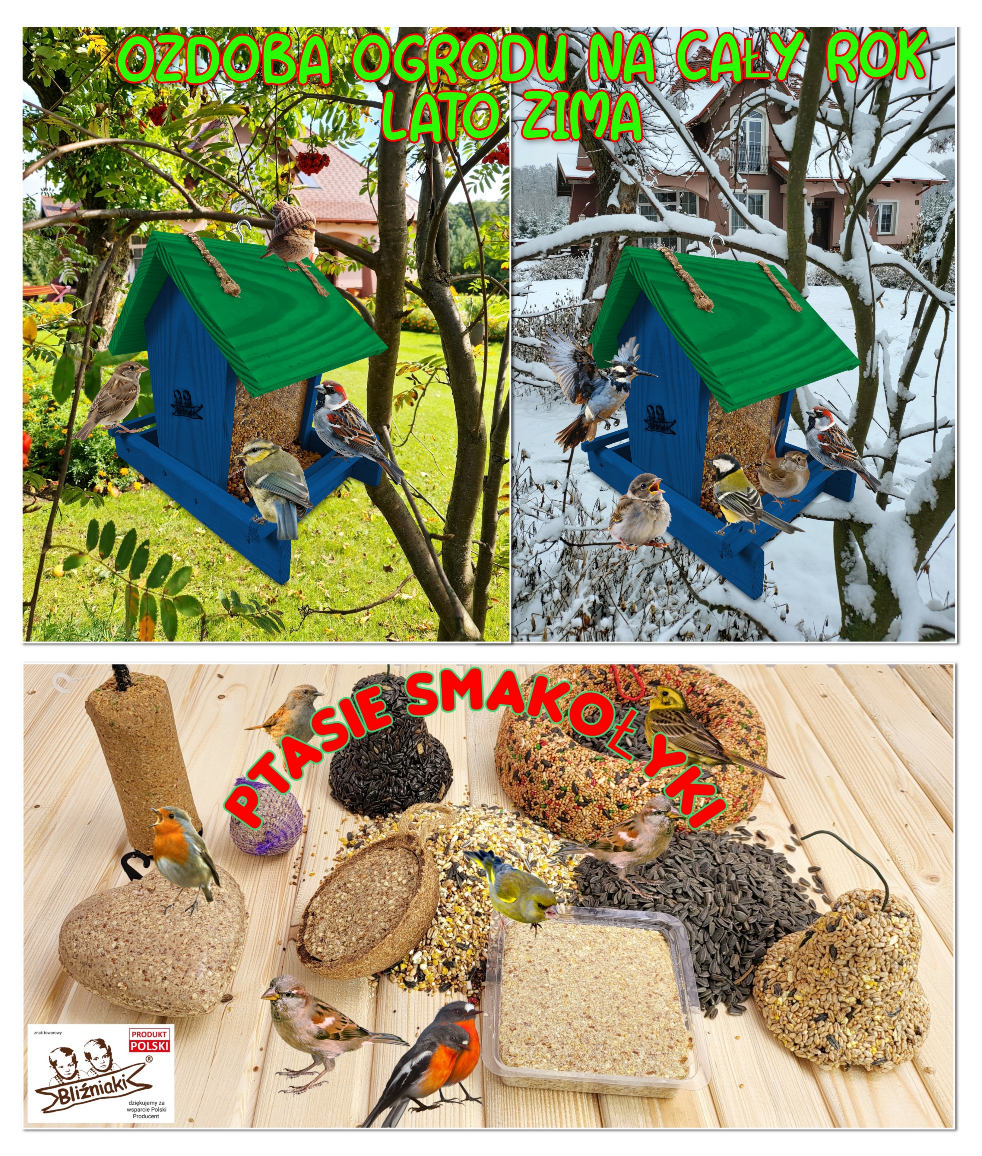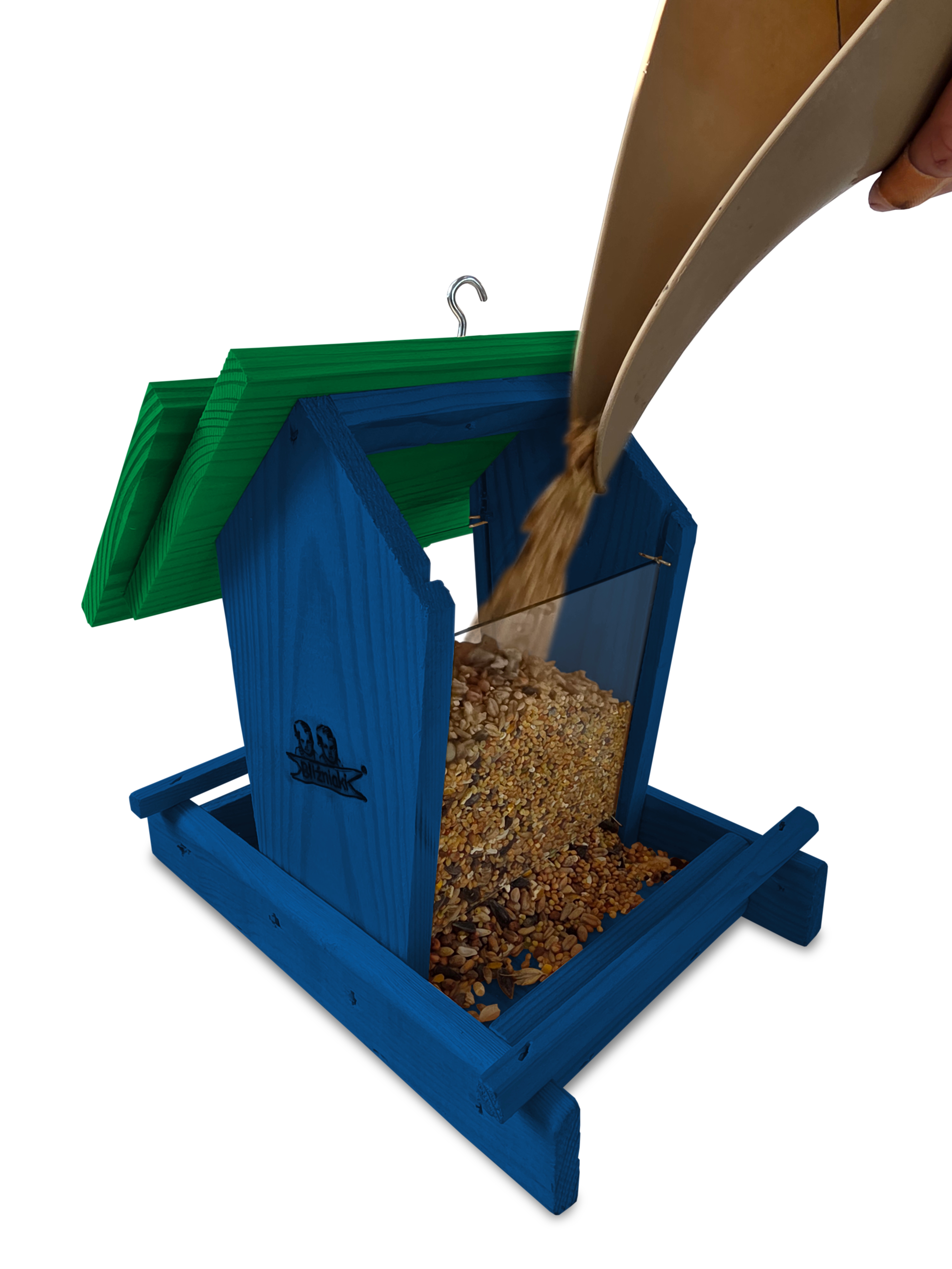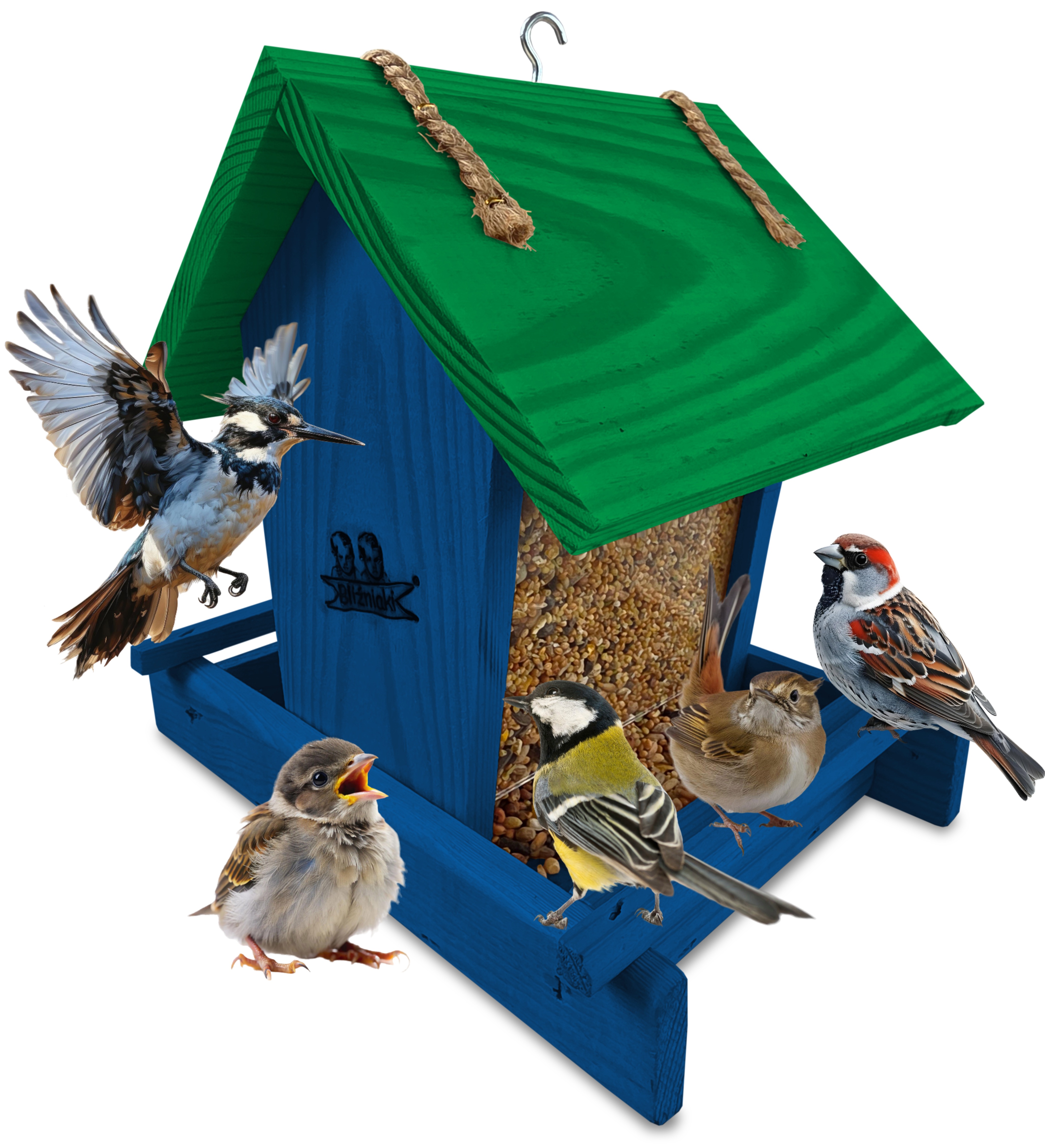 - Karmnik wykonany jest w całości z drewna iglastego, KOLOR CIEMNONIEBIESKI Z CIEMNOZIELONYM DACHEM