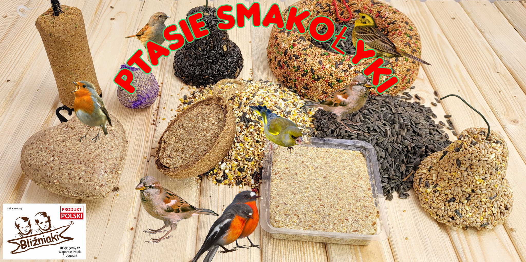- Karma dla ptaków – dostępna w różnych mieszankach dostosowanych do potrzeb wróbelków, sikorek i innych gatunków.