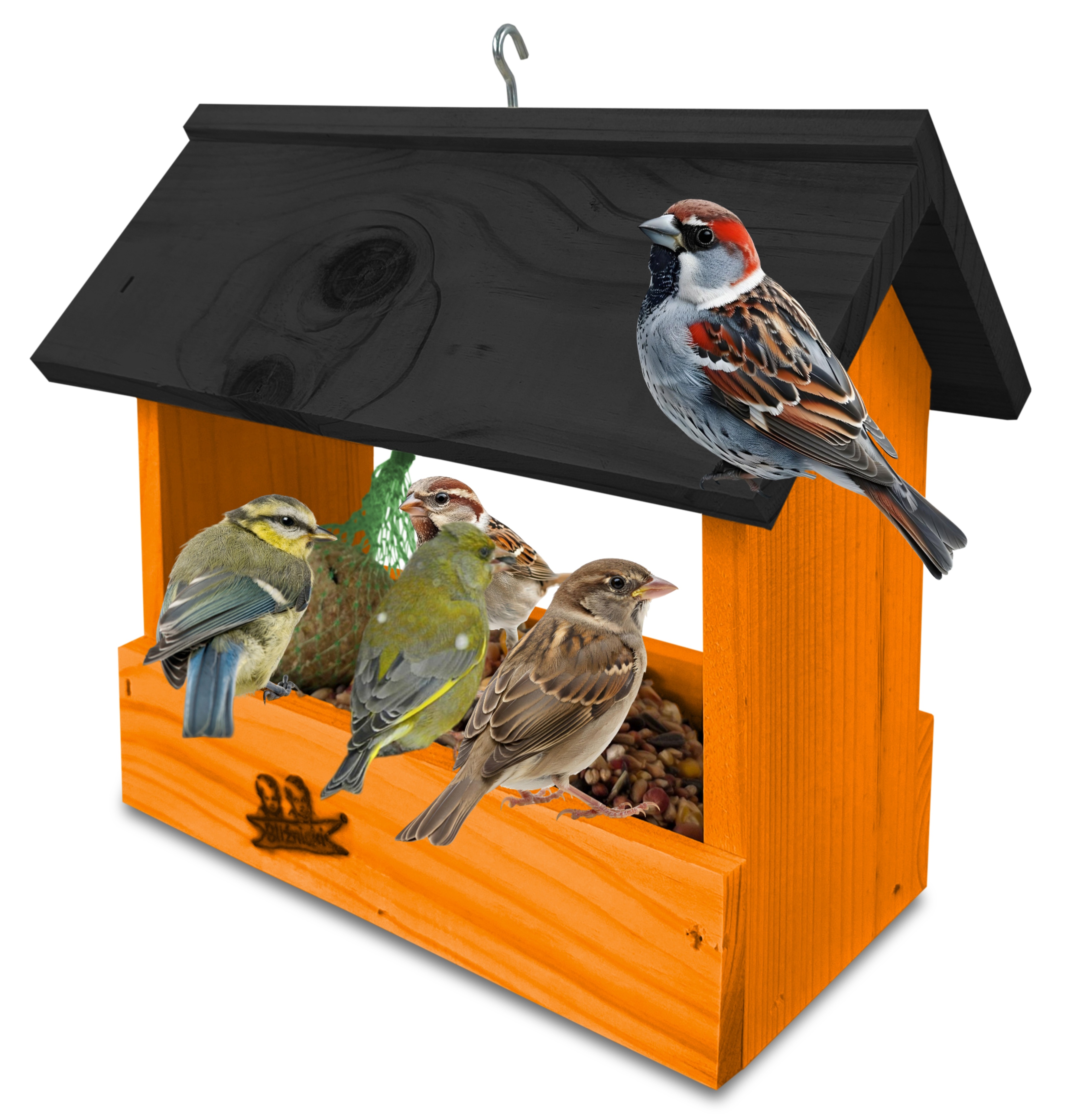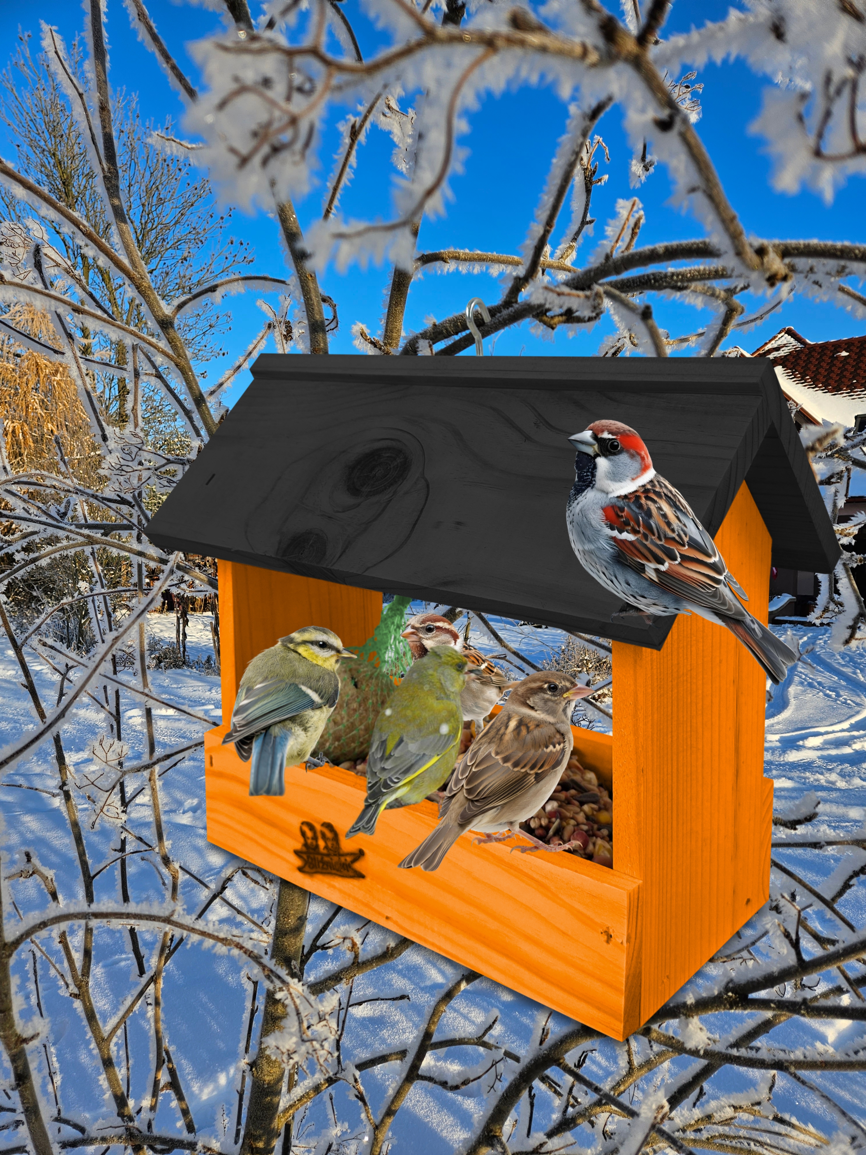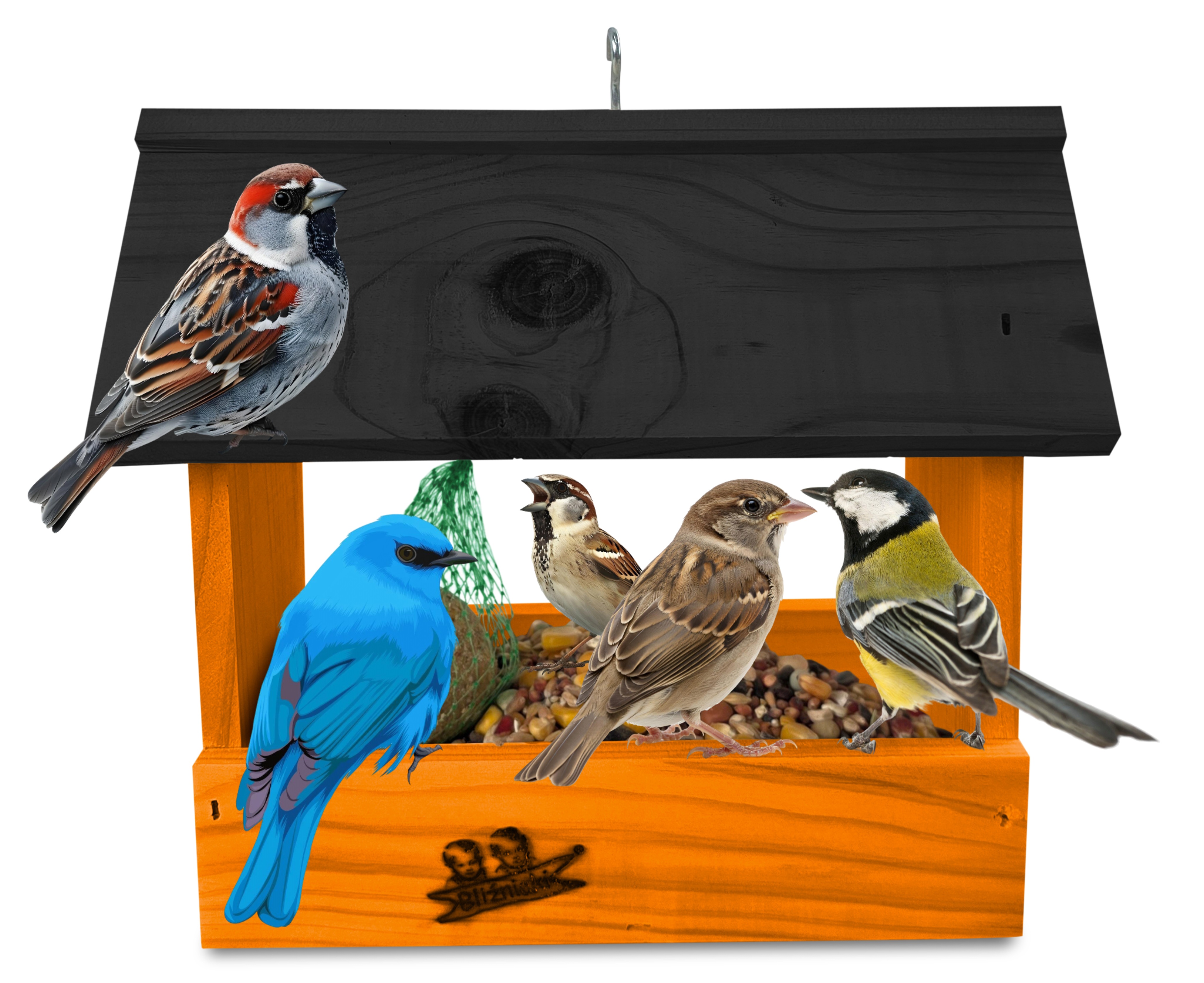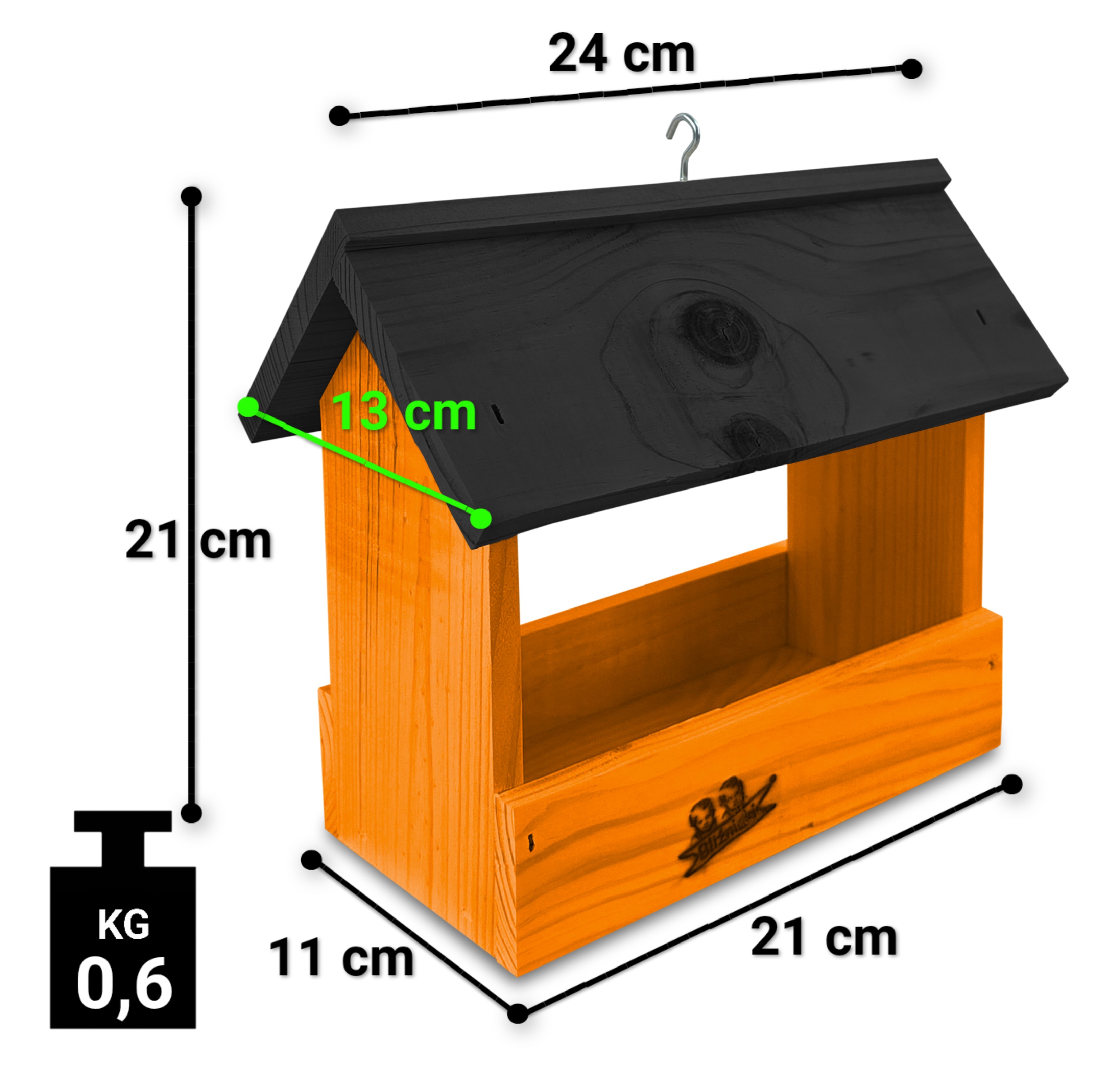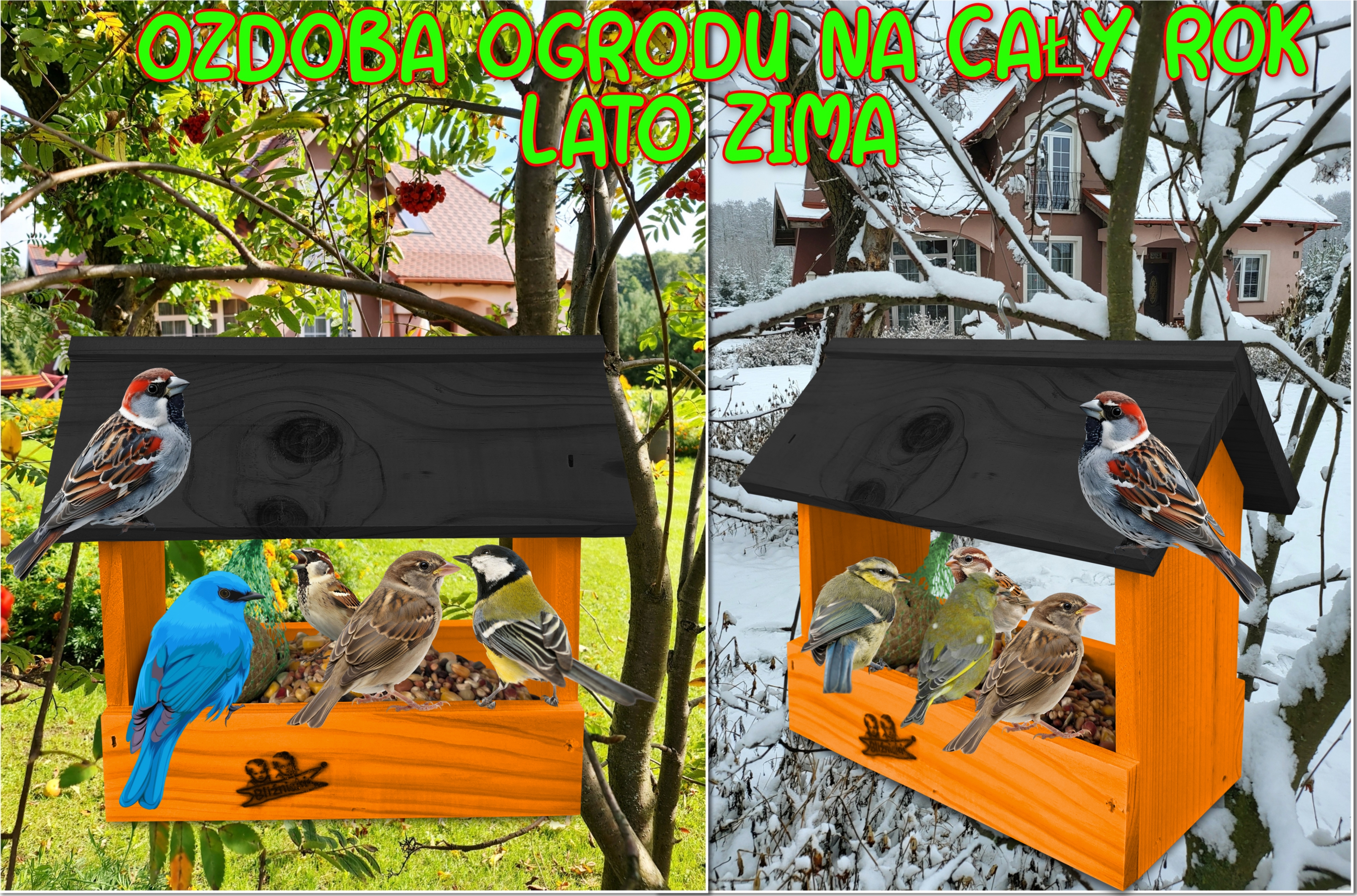 - Karmnik wykonany jest w całości z drewna iglastego, KOLOR POMARAŃCZOWY Z CZARNYM DACHEM