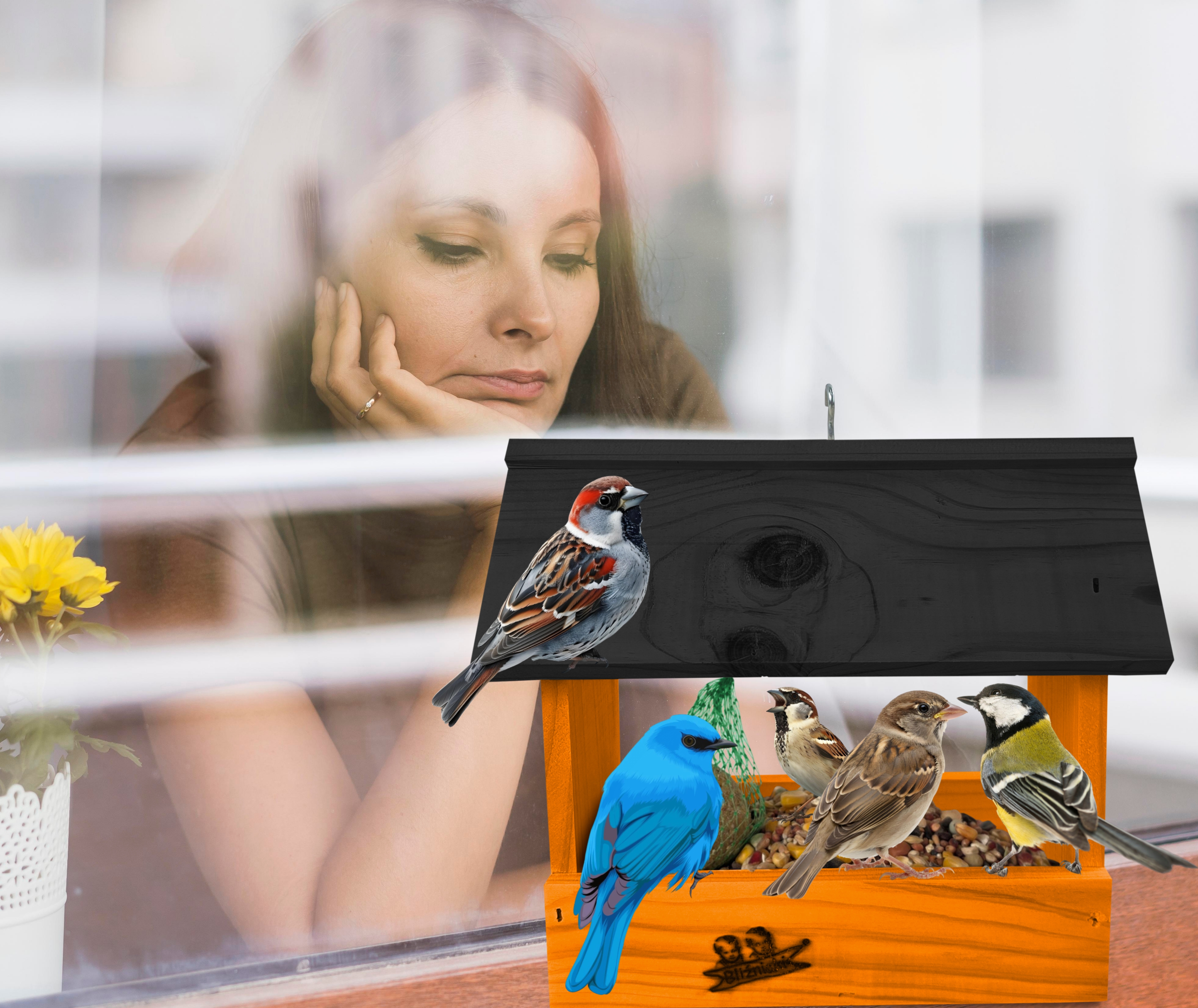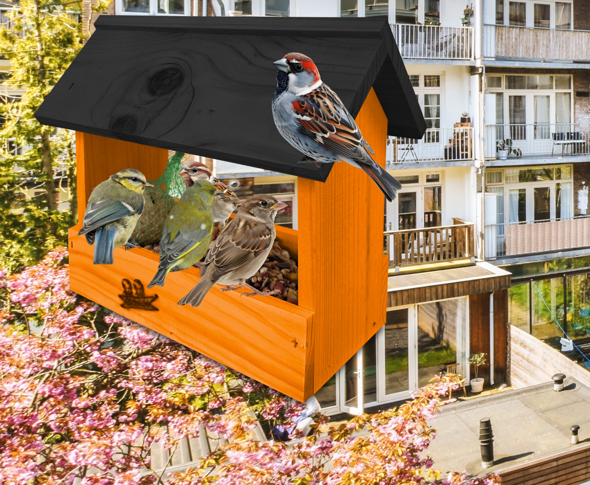 Przedmiotem sprzedaży jest ozdobny drewniany karmnik dla ptaków budka domek na balkon K204 B CZ kolor pomarańczowy z czarnym dachem