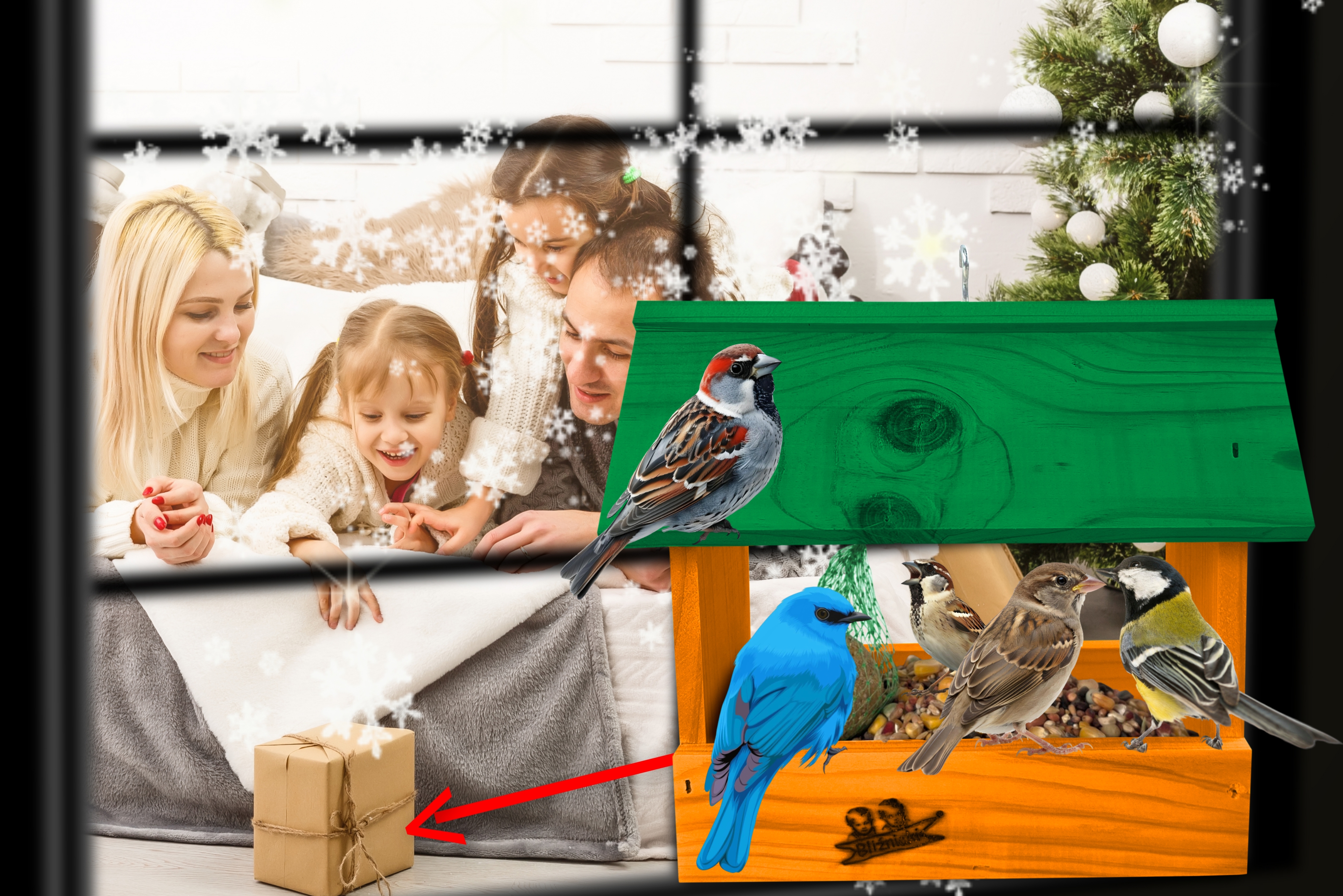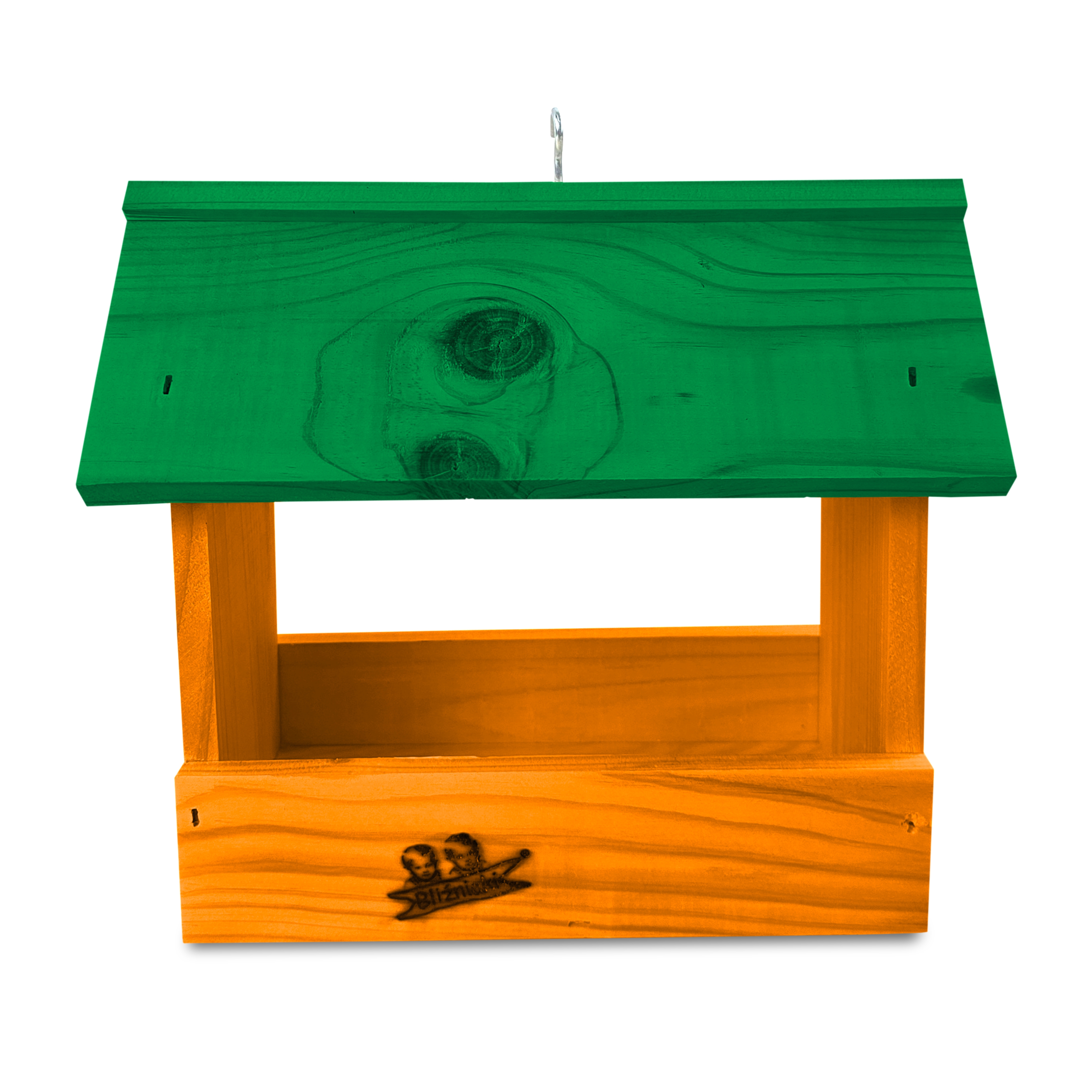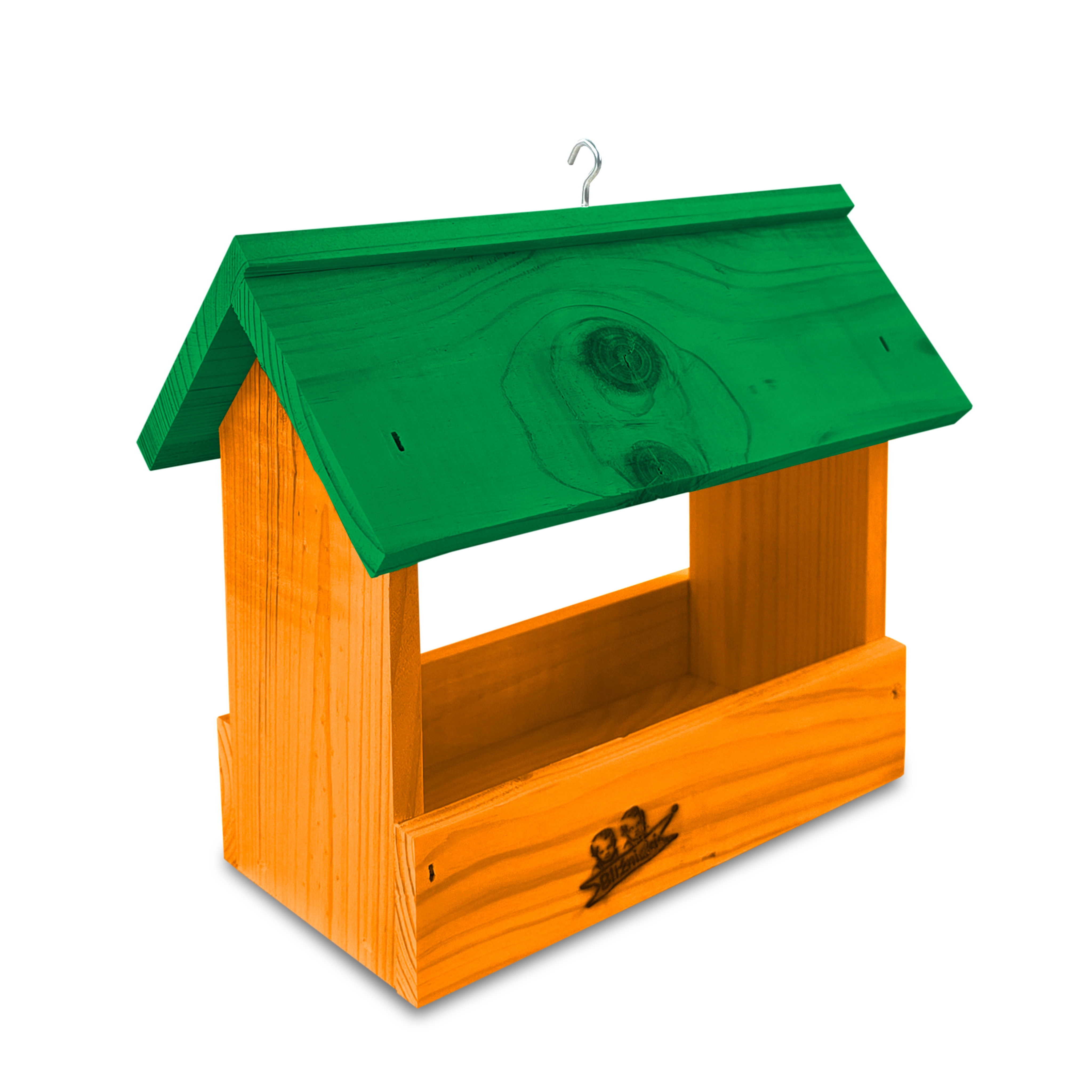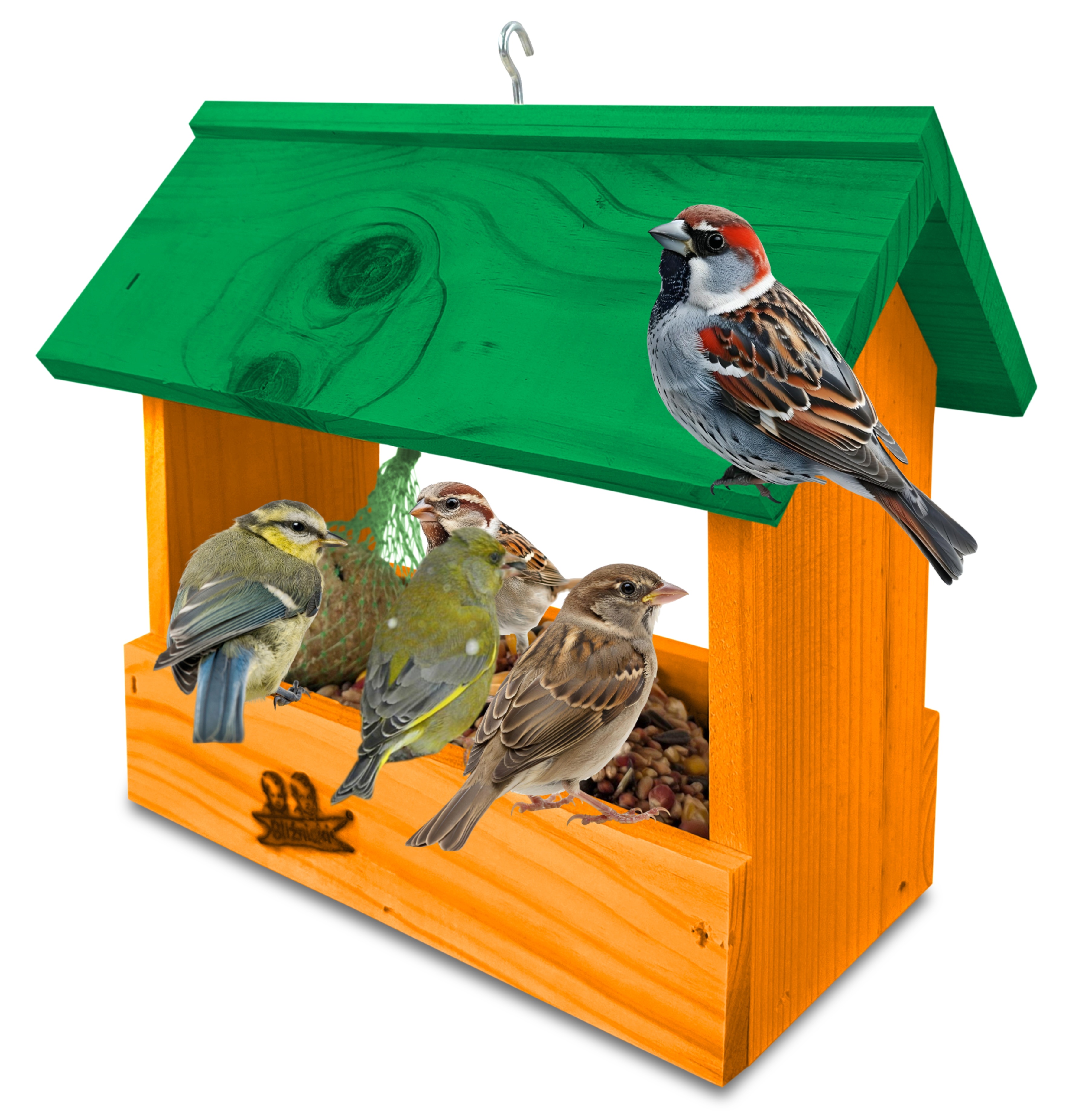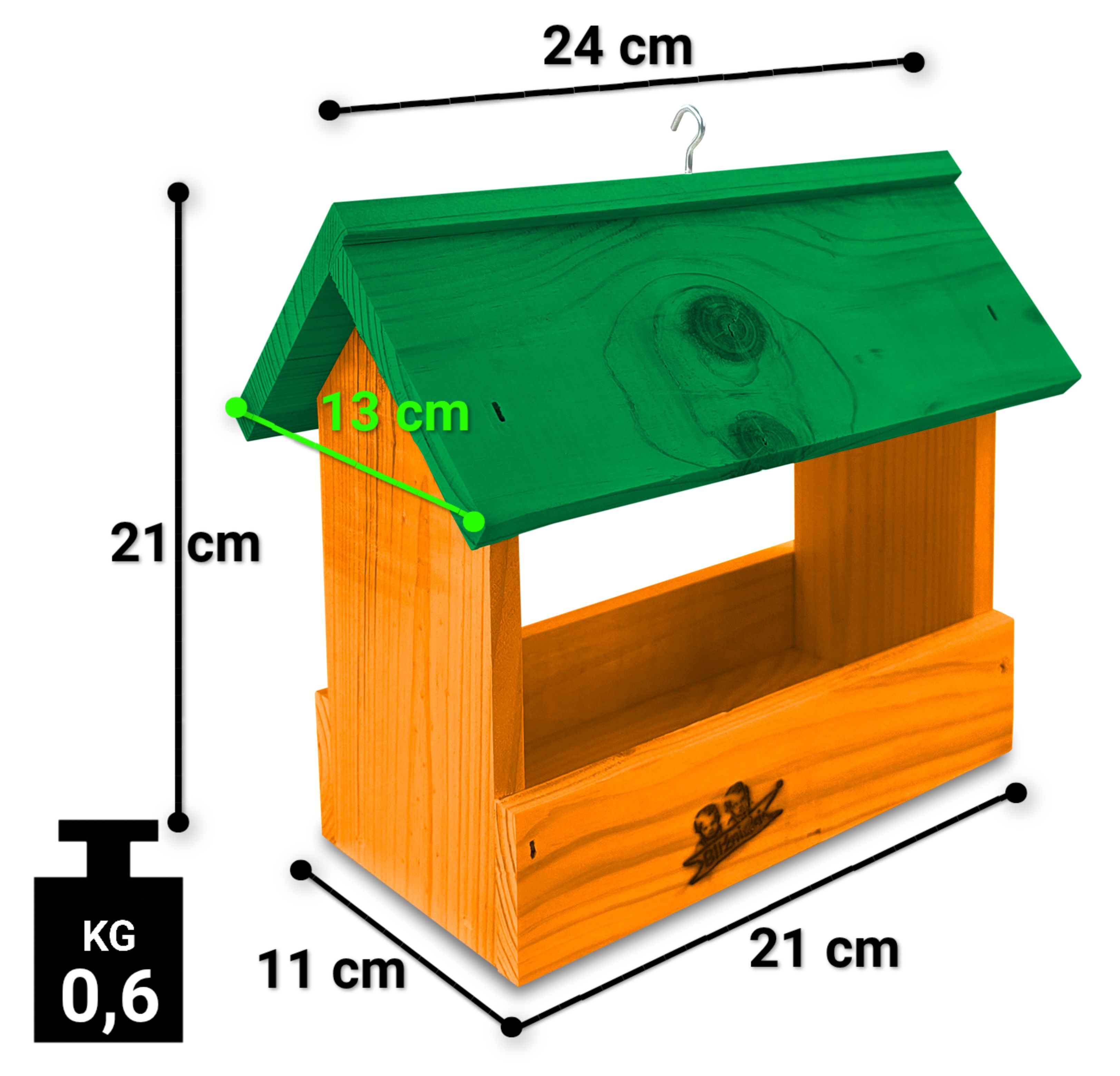 - Karmnik wykonany jest w całości z drewna iglastego, KOLOR POMARAŃCZOWY Z ZIELONYM DACHEM