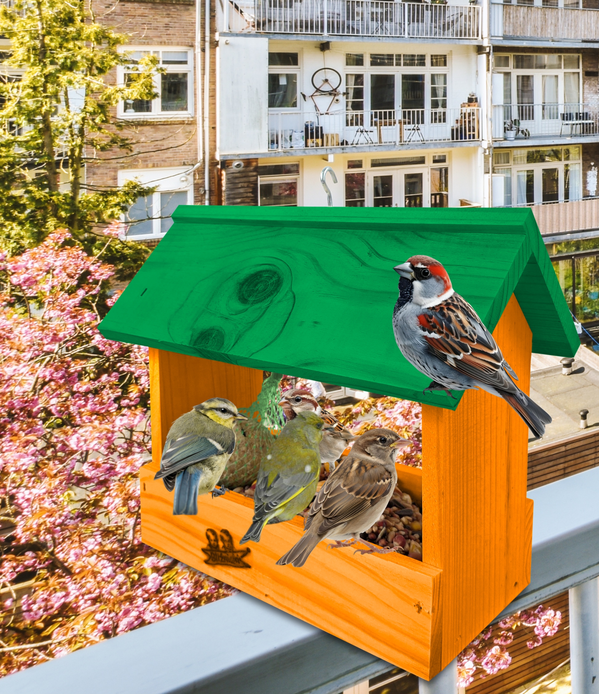Przedmiotem sprzedaży jest ozdobny drewniany karmnik dla ptaków budka domek na balkon K204 B K kolor pomarańczowy z zielonym dachem