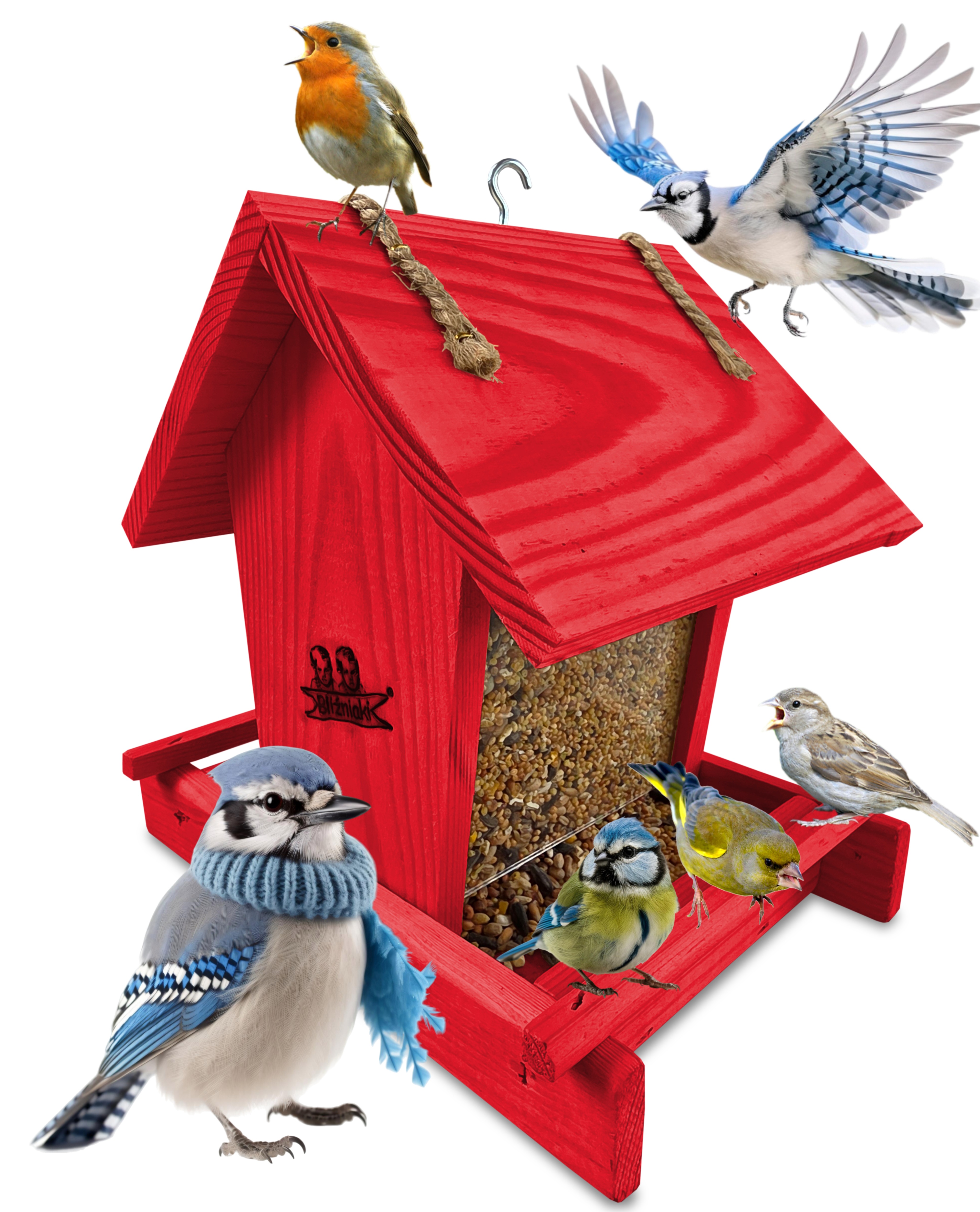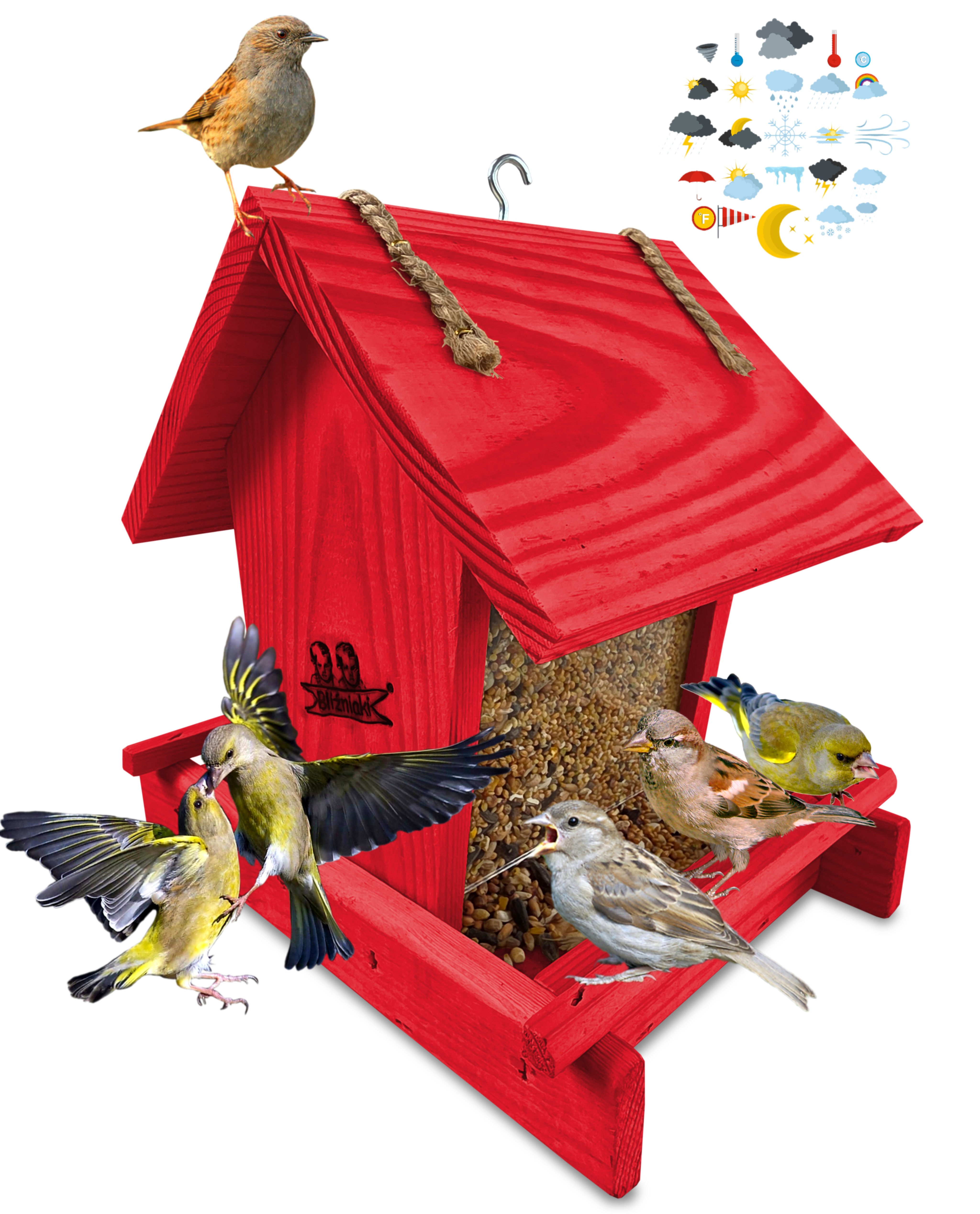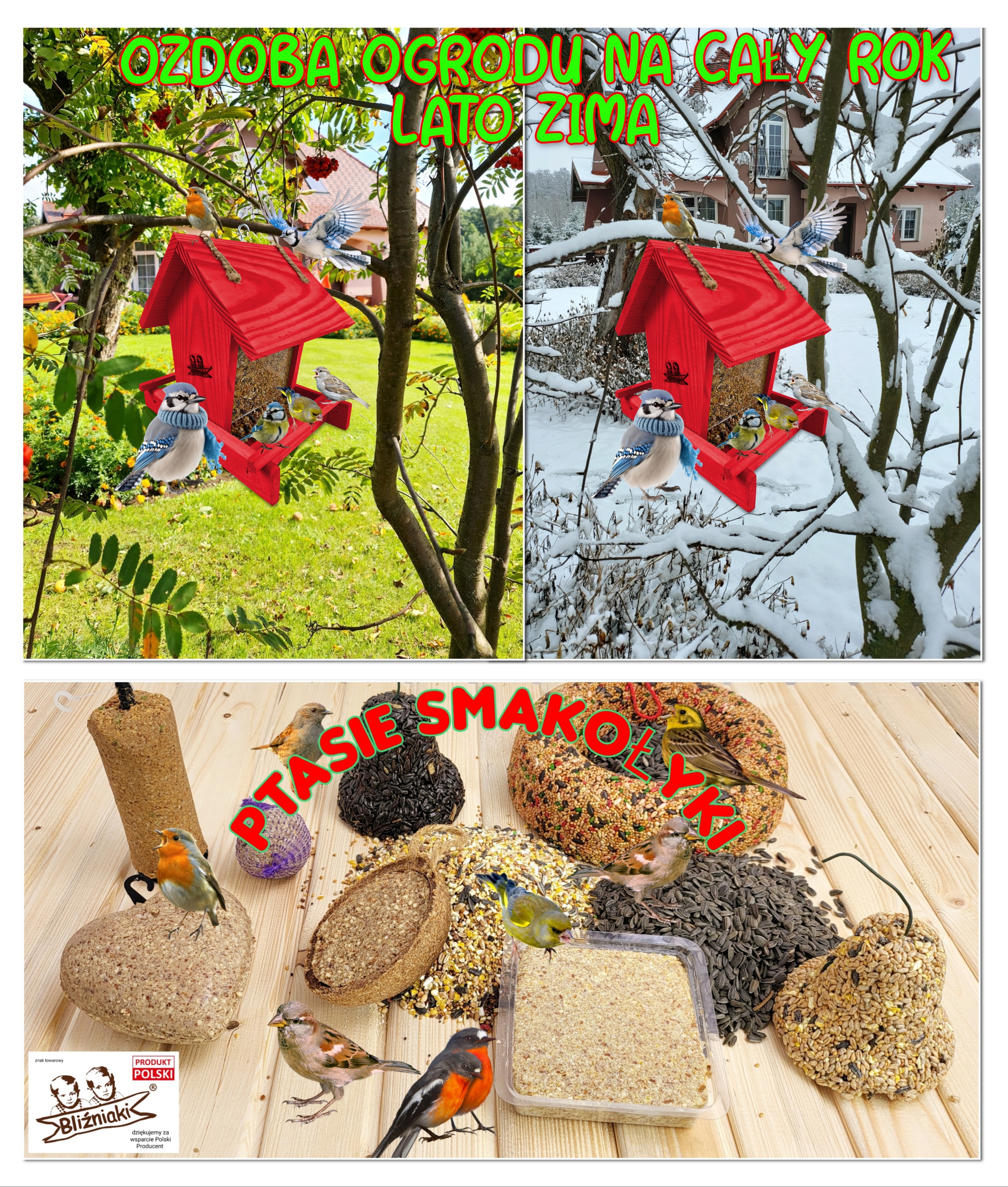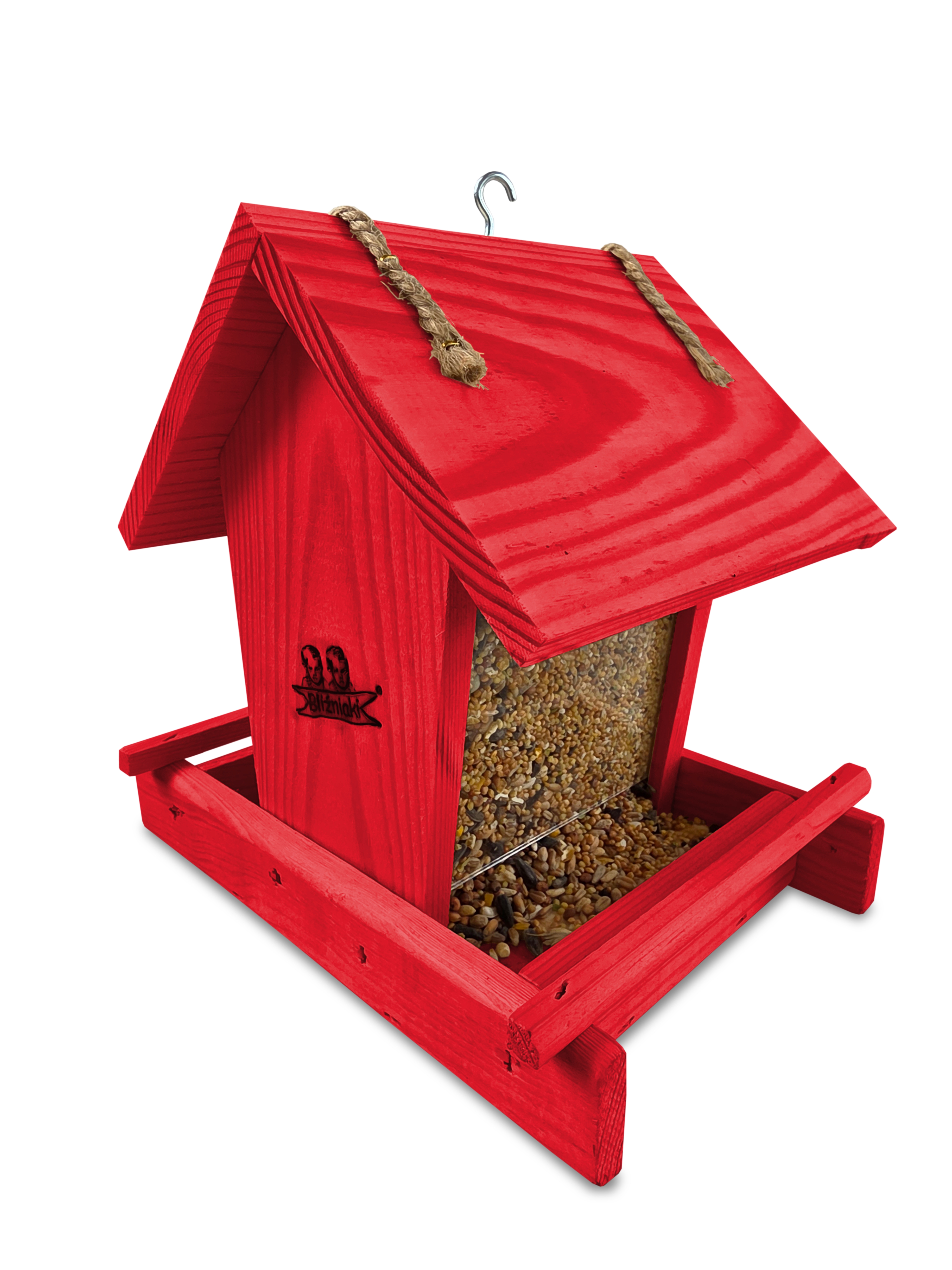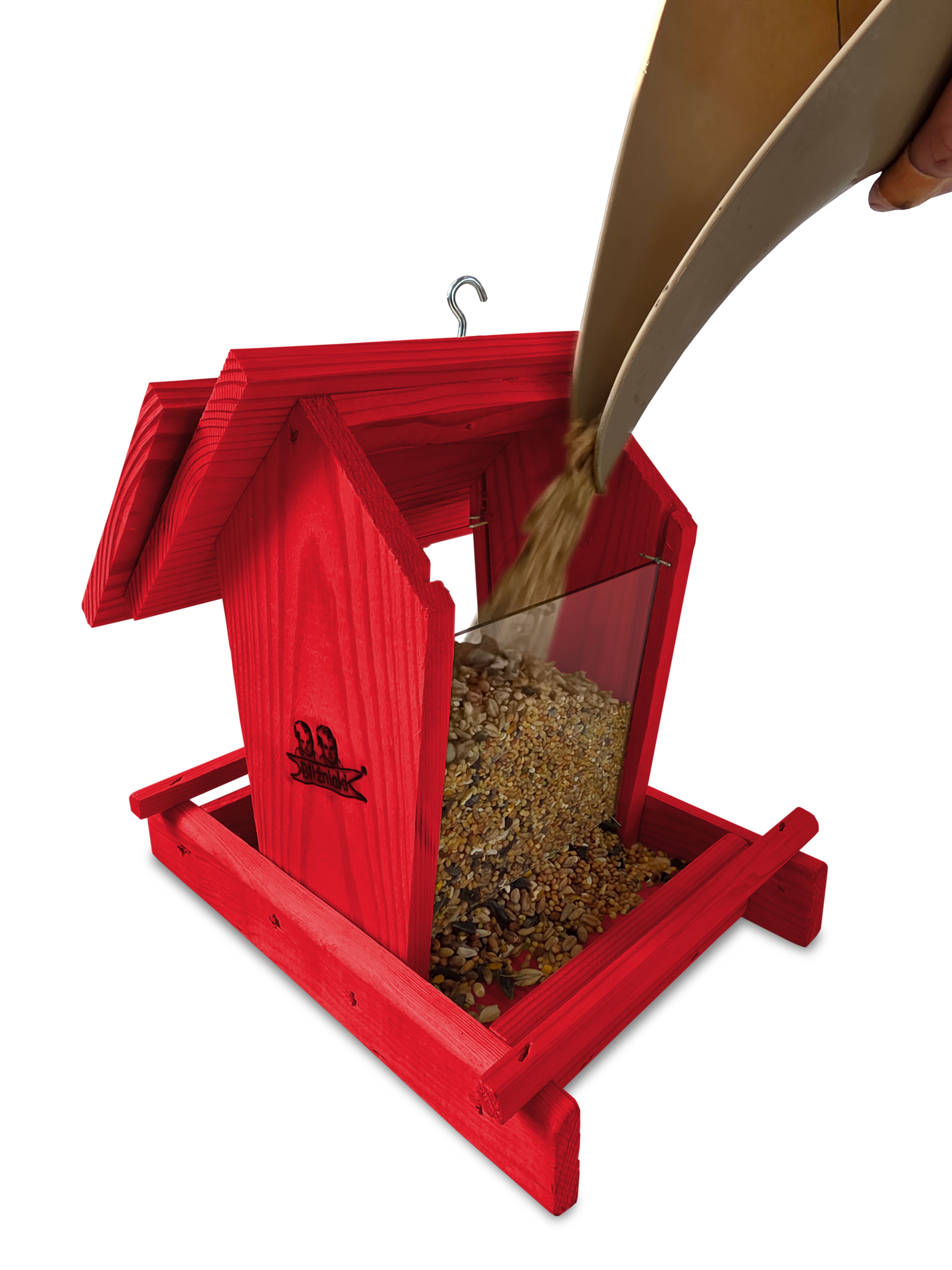Przedmiotem sprzedaży jest ozdobny drewniany Karmnik dla ptaków z dozownikiem ziarna model K29 CB w kolorze czerwonym