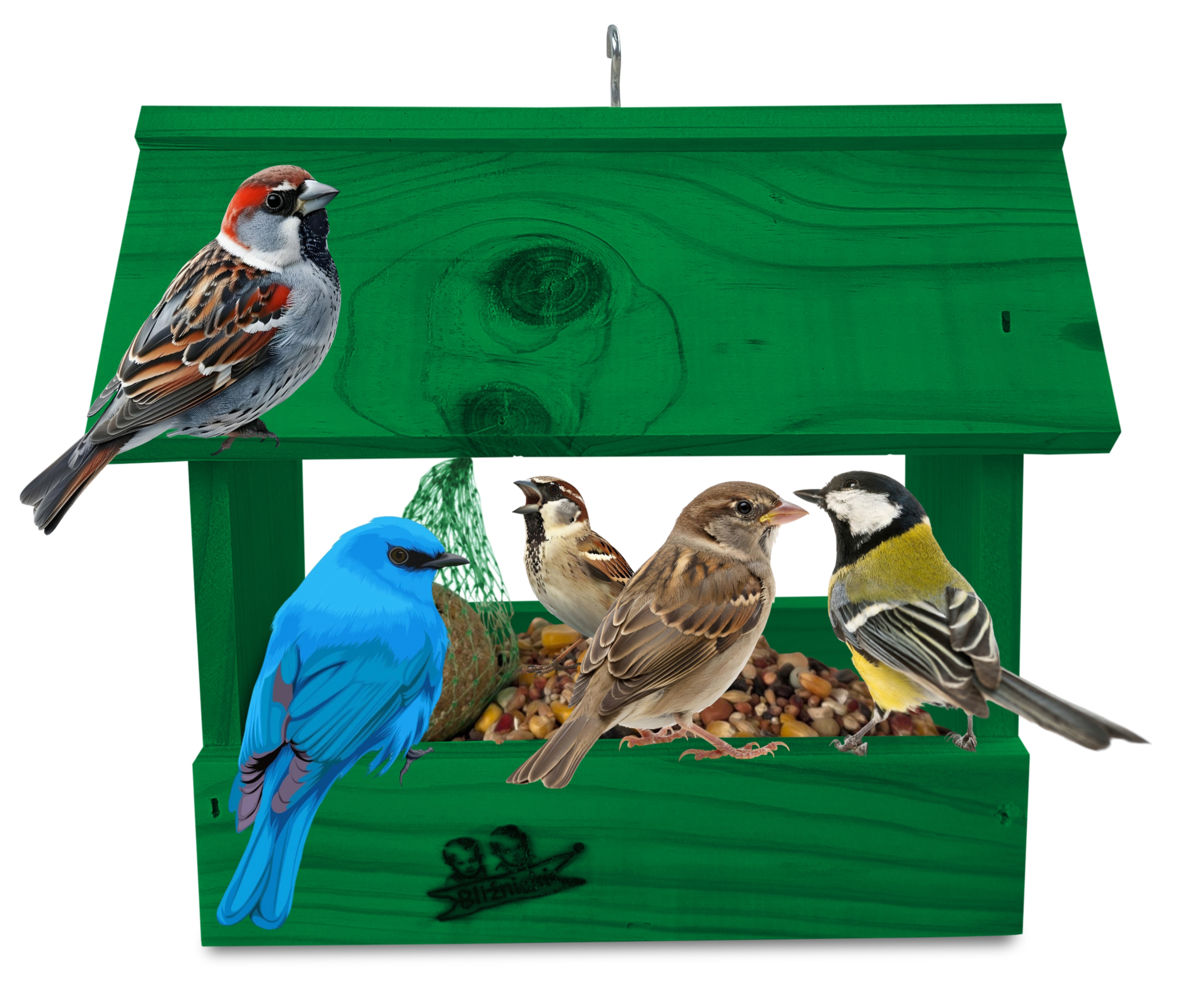 - U góry widoczny jest haczyk umożliwiający zawieszenie karmnika w dowolnym miejscu, możliwe jest również jego postawienie