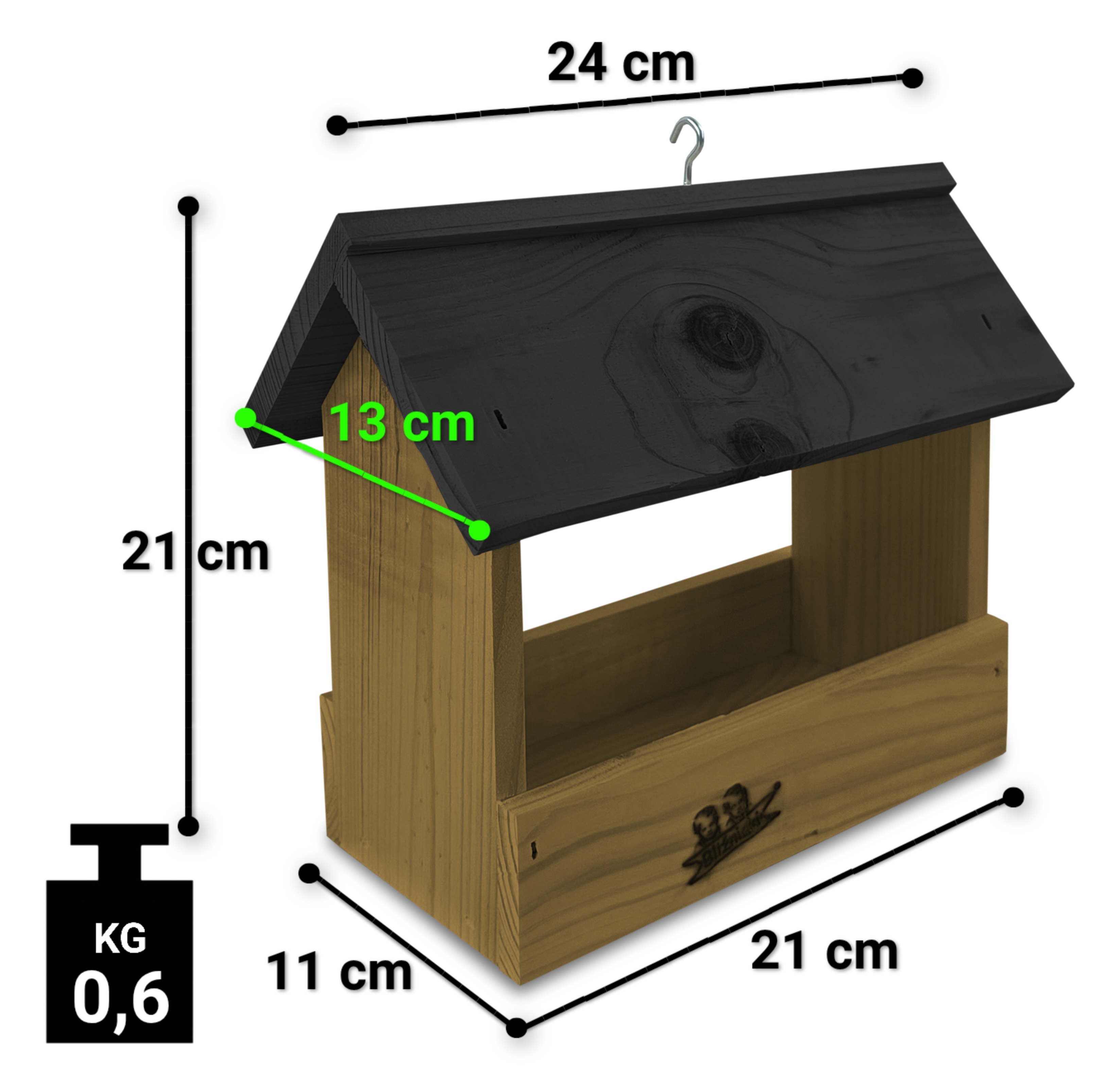 - Karmnik wykonany jest w całości z drewna iglastego, KOLOR DĘBOWY Z CZARNYM DACHEM