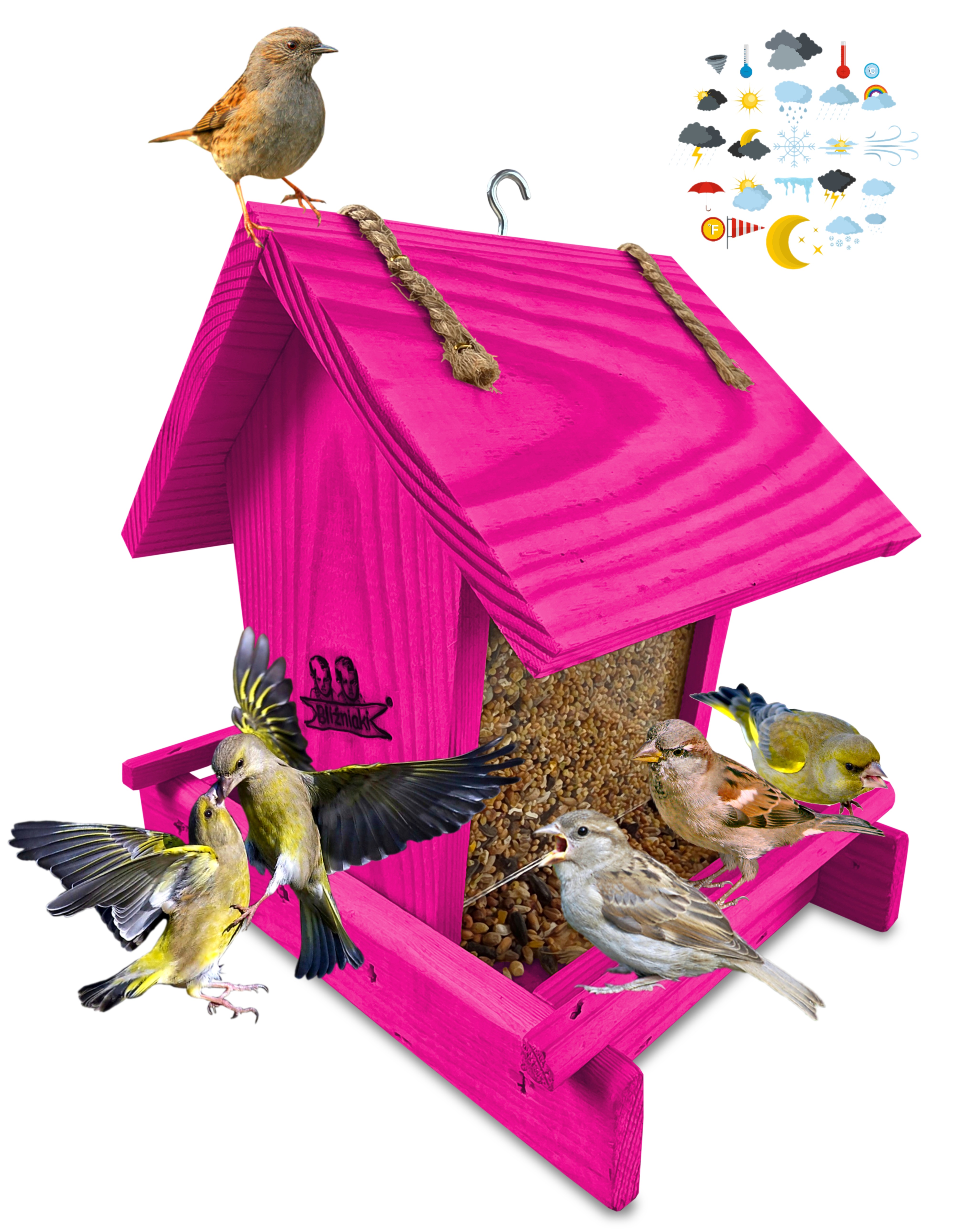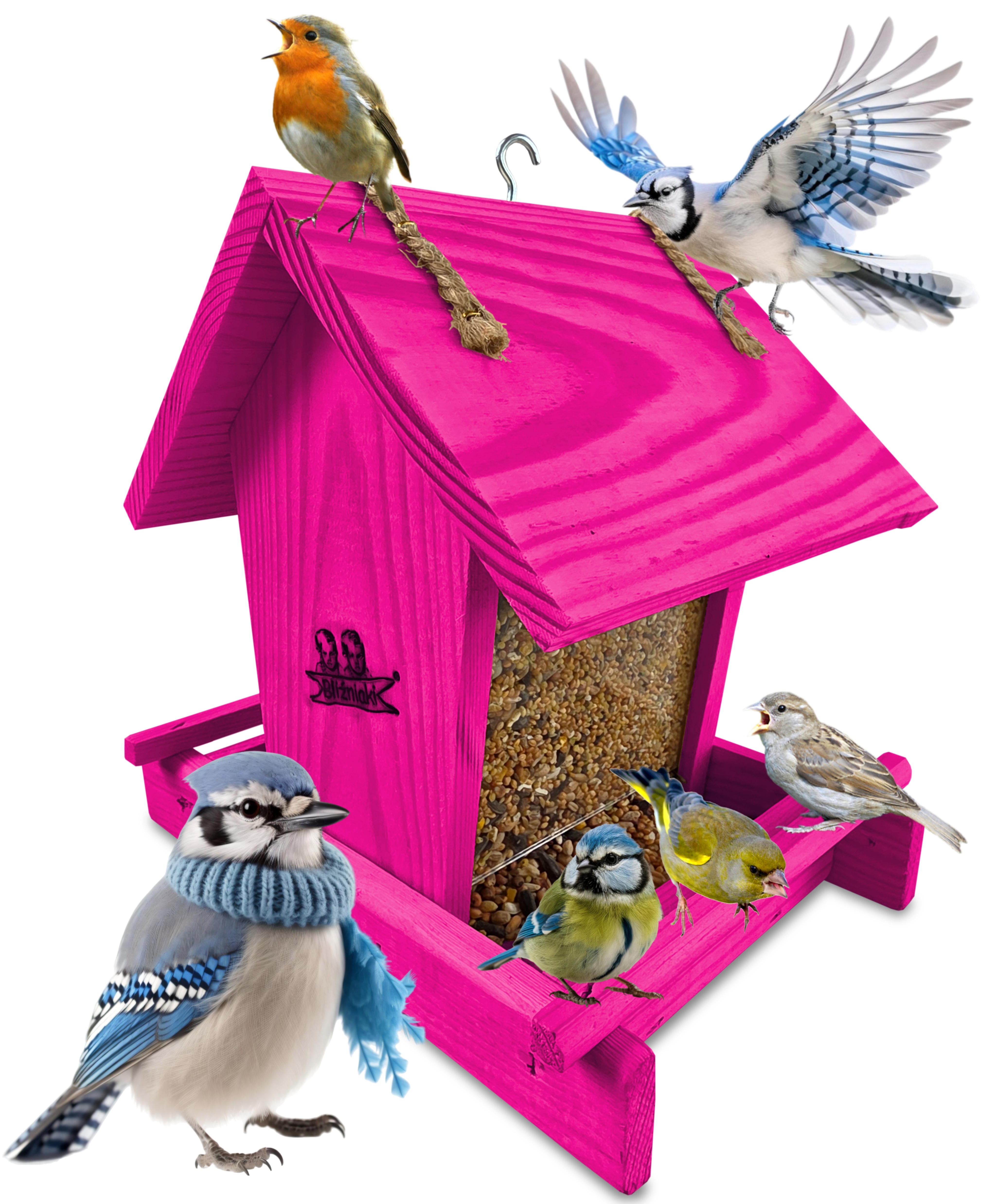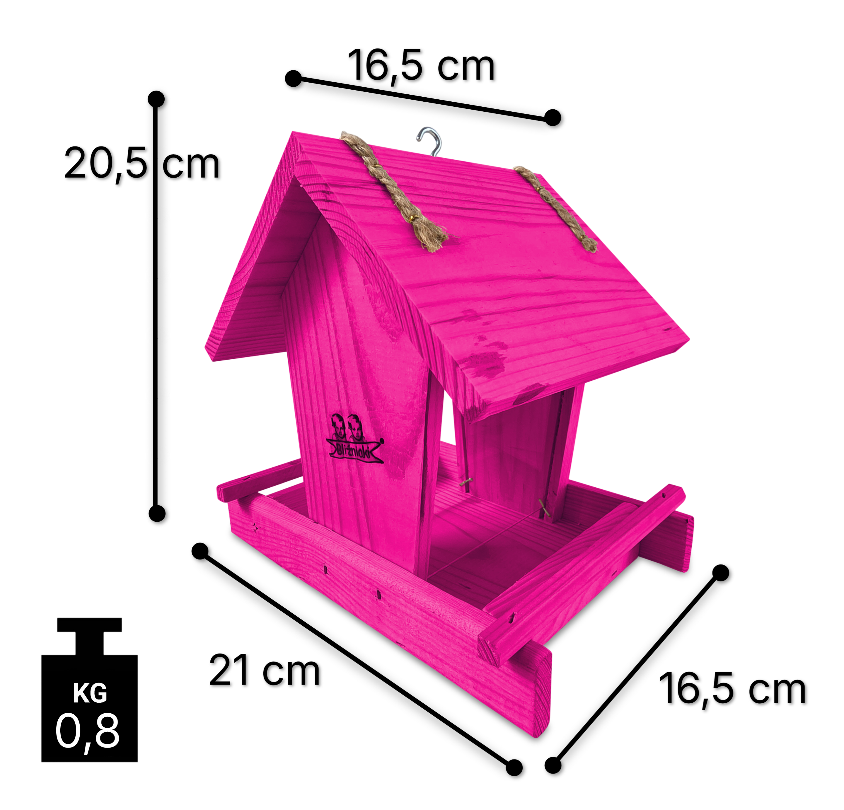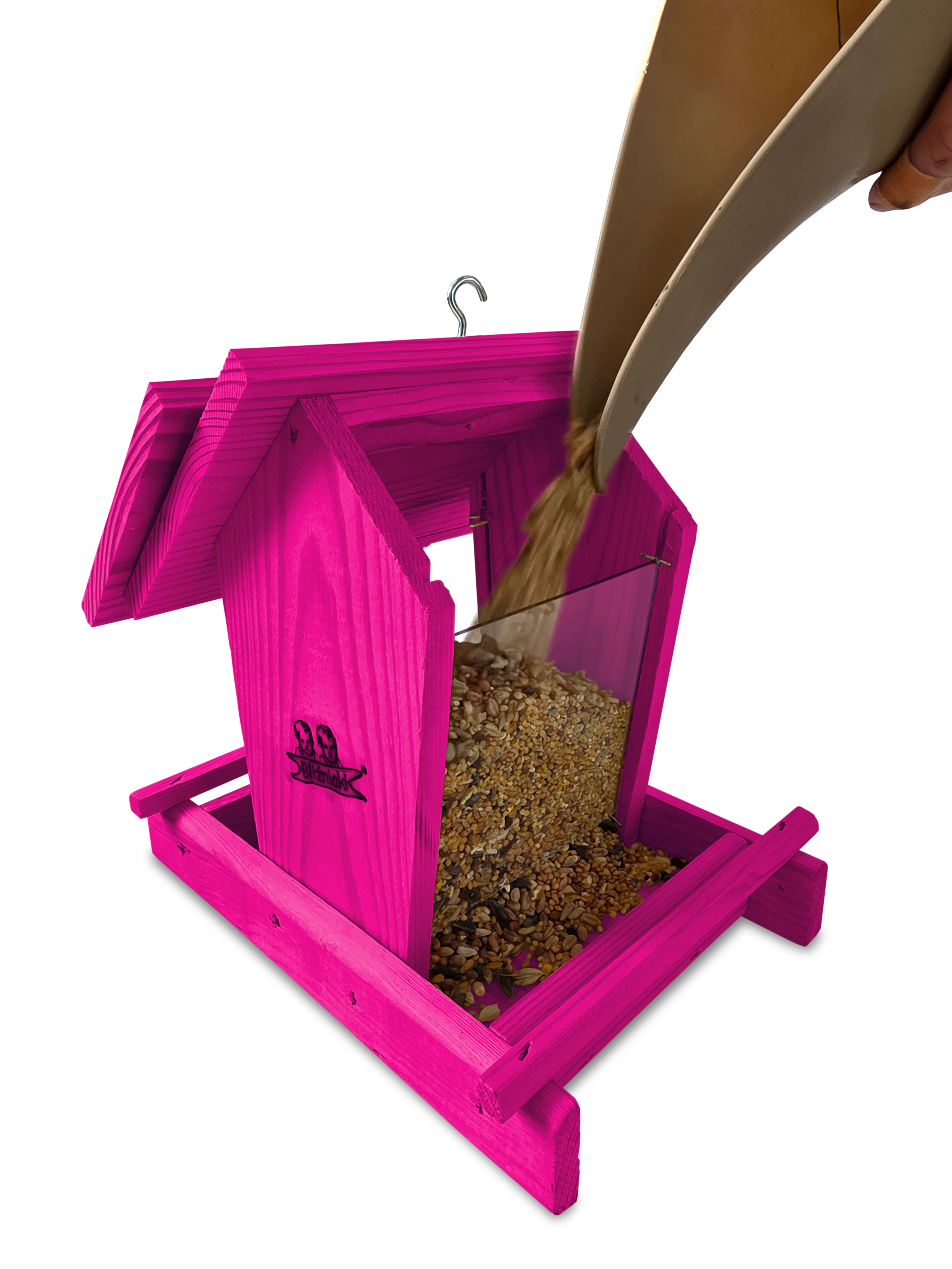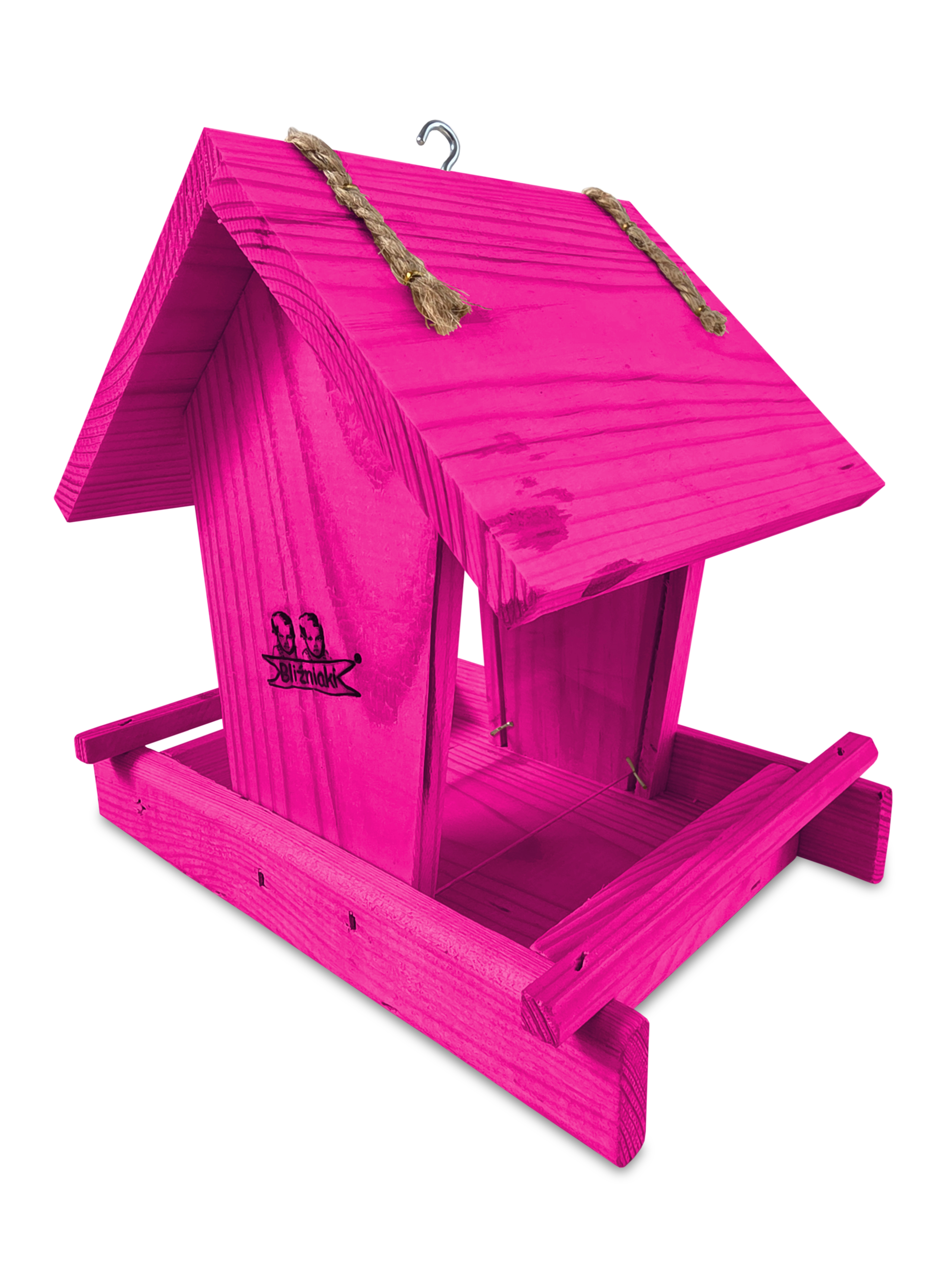 Przedmiotem sprzedaży jest ozdobny drewniany karmnik dla ptaków z dozownikiem ziarna model K29 RÓ w kolorze ciemnoróżowym