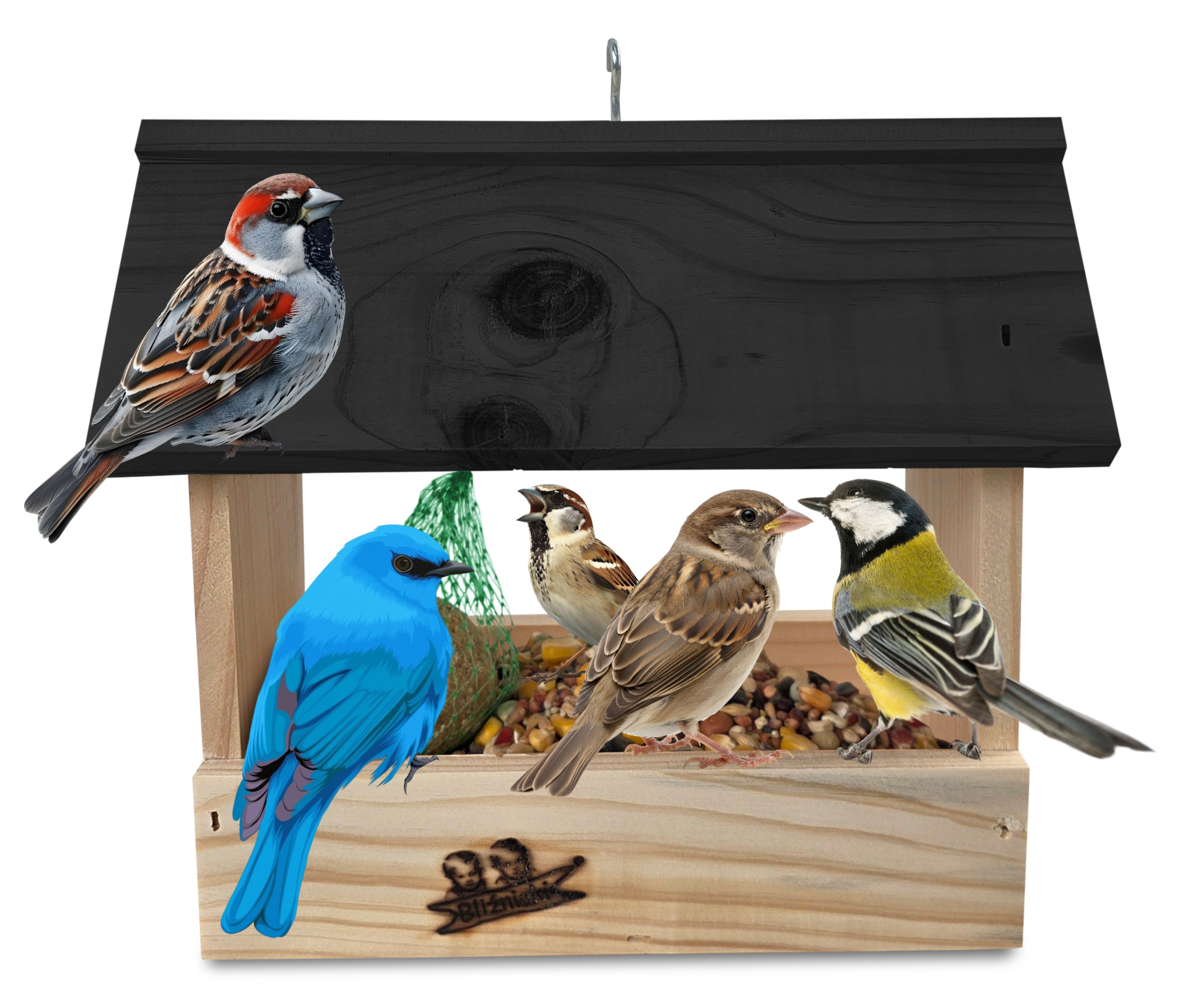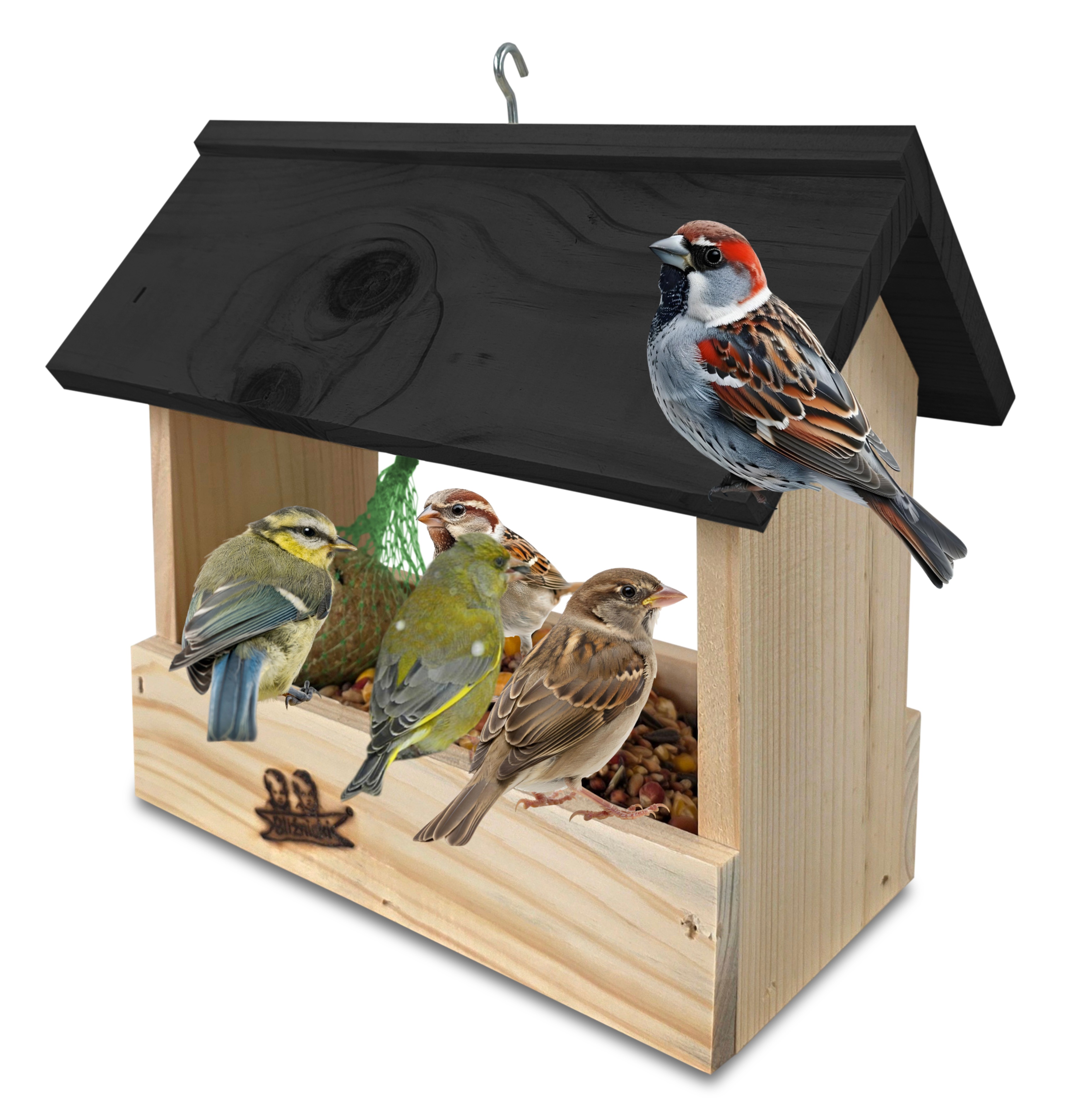 - U góry widoczny jest haczyk umożliwiający zawieszenie karmnika w dowolnym miejscu, możliwe jest również jego postawienie
