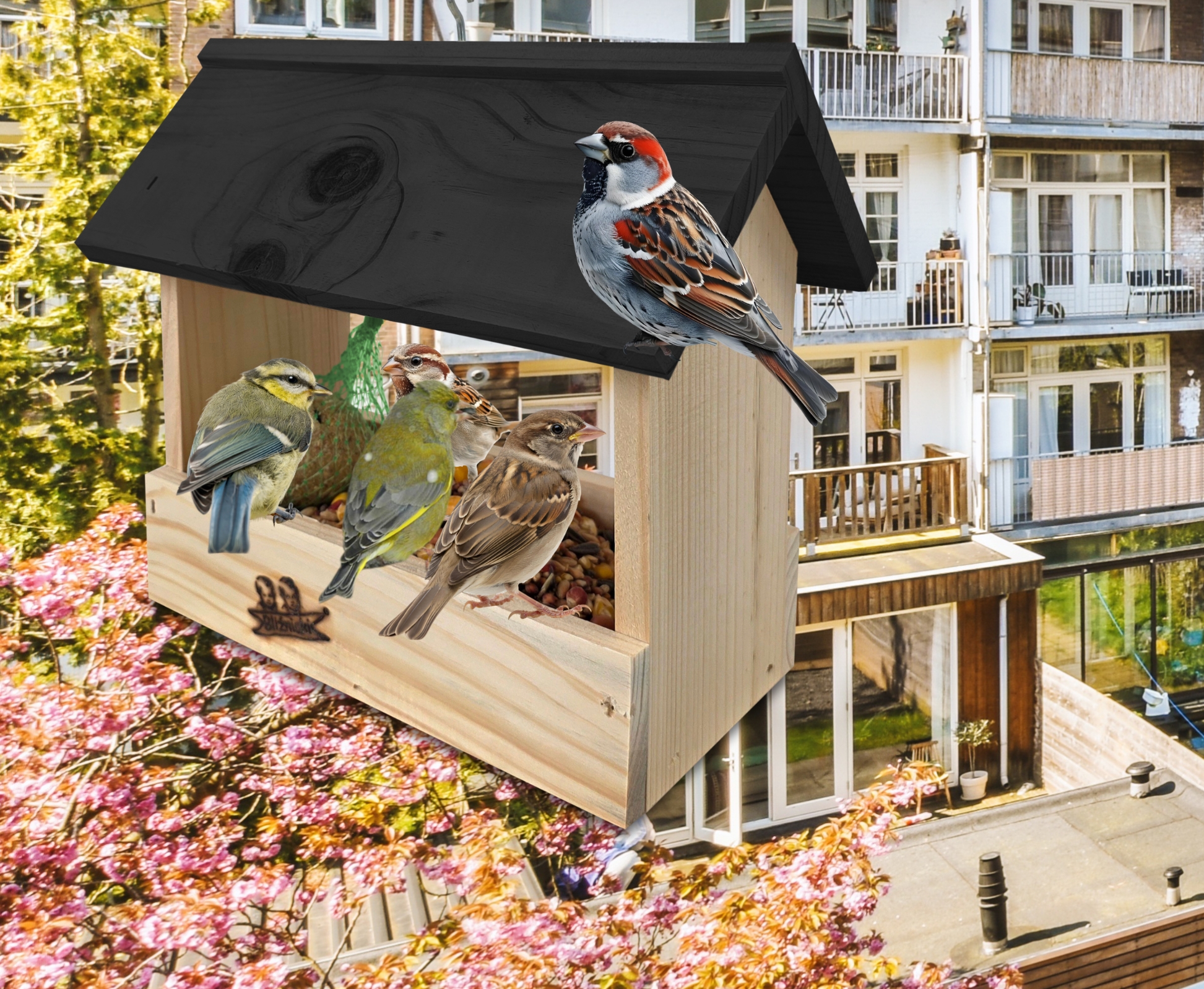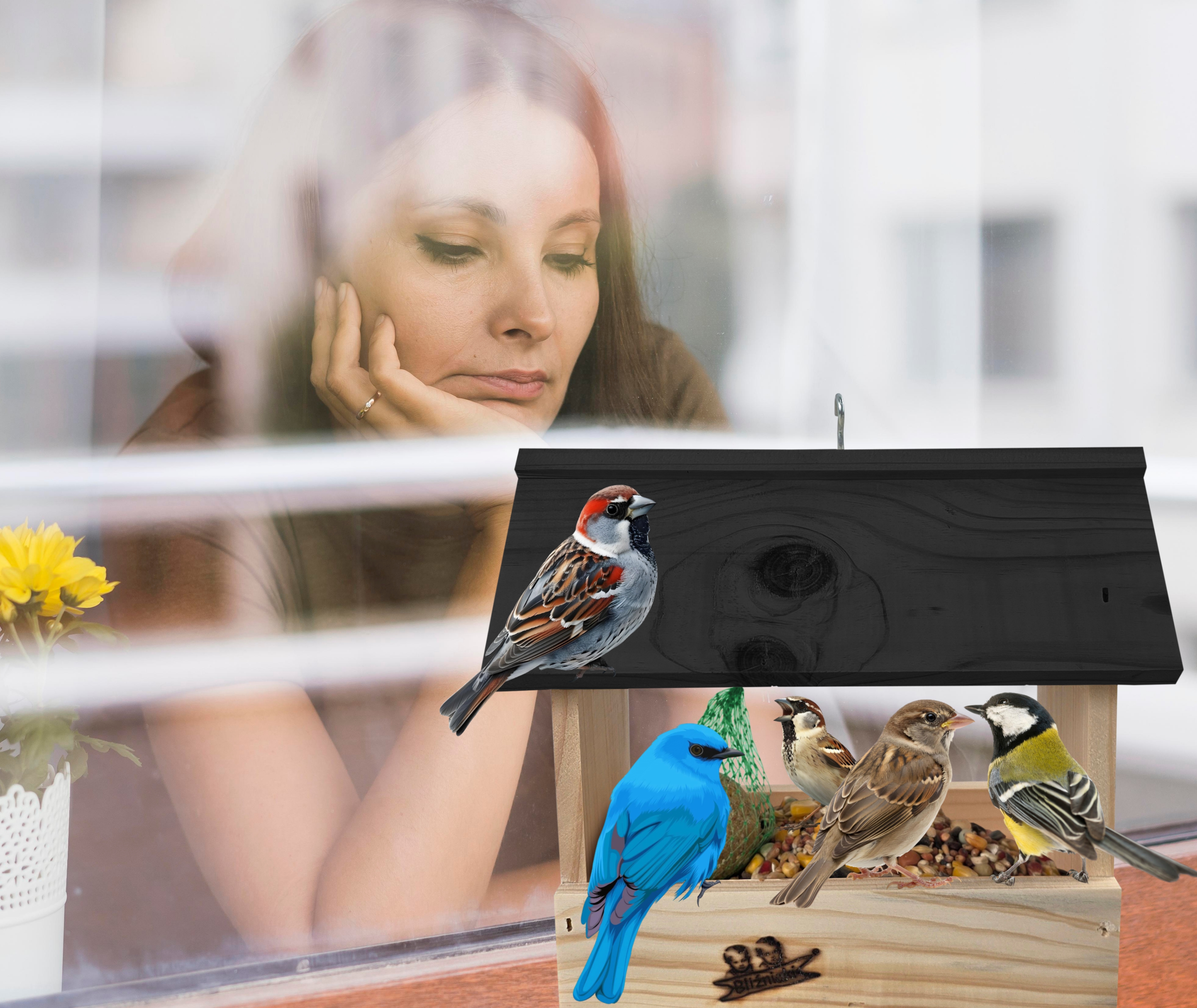 Przedmiotem sprzedaży jest ozdobny drewniany karmnik dla ptaków budka domek na balkon K204 N CZ w kolorze naturalnego drewna z czarnym dachem