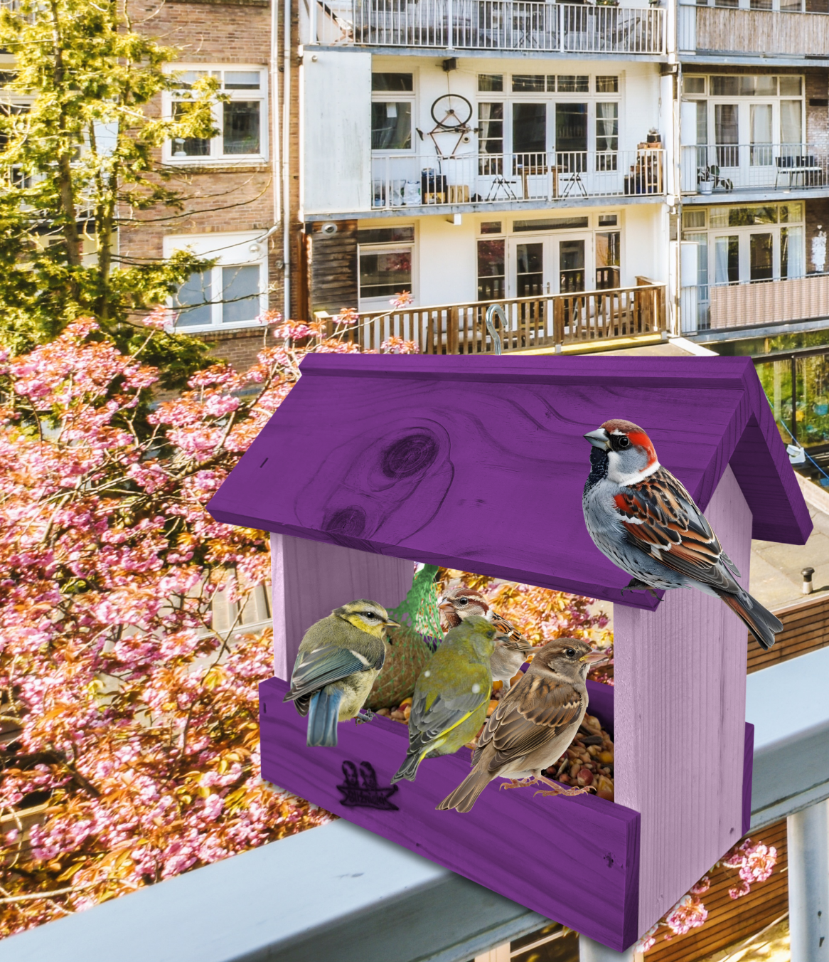 Przedmiotem sprzedaży jest ozdobny drewniany karmnik dla ptaków budka domek na balkon K204a FNP FN w dwóch odcieniach fioletu - jasny i ciemny