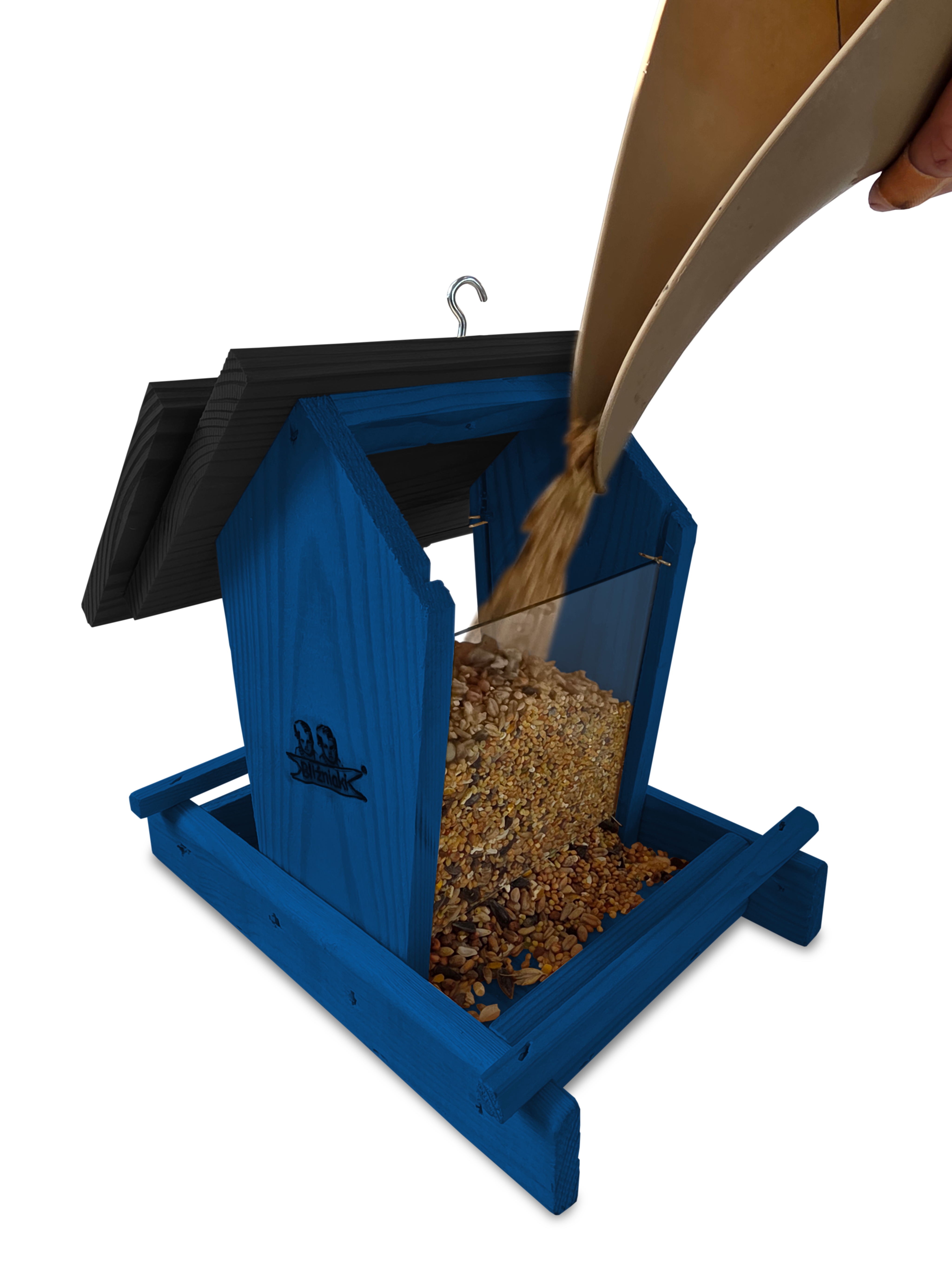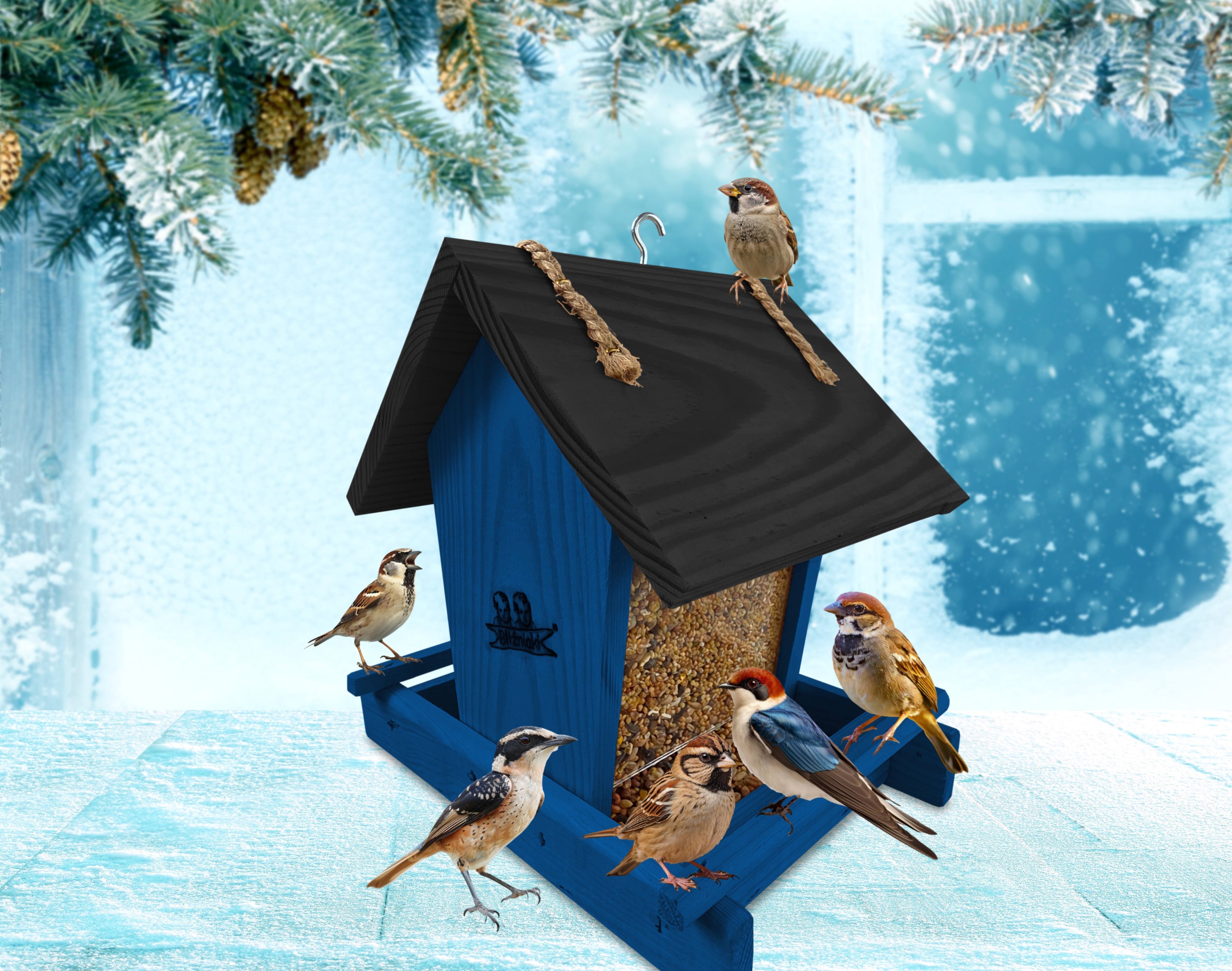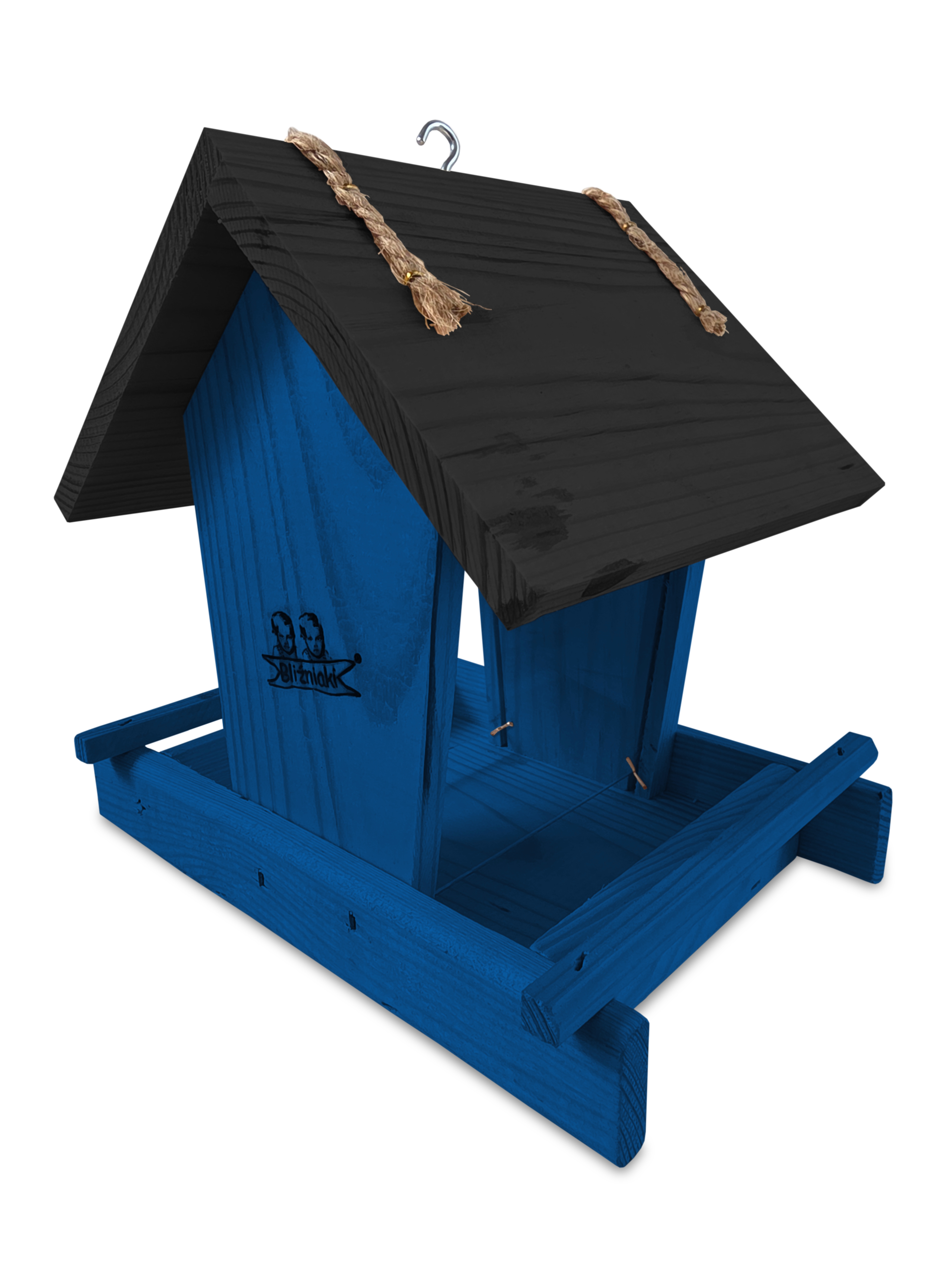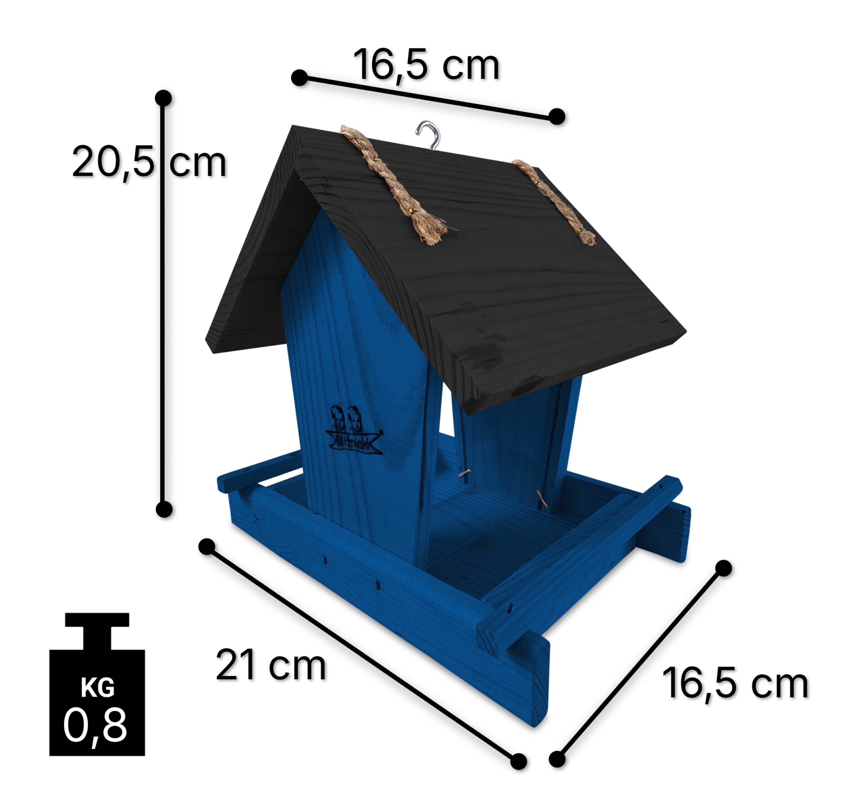- Karmnik wykonany jest w całości z drewna iglastego, KOLOR CIEMNY NIEBIESKI Z CZARNYM DACHEM