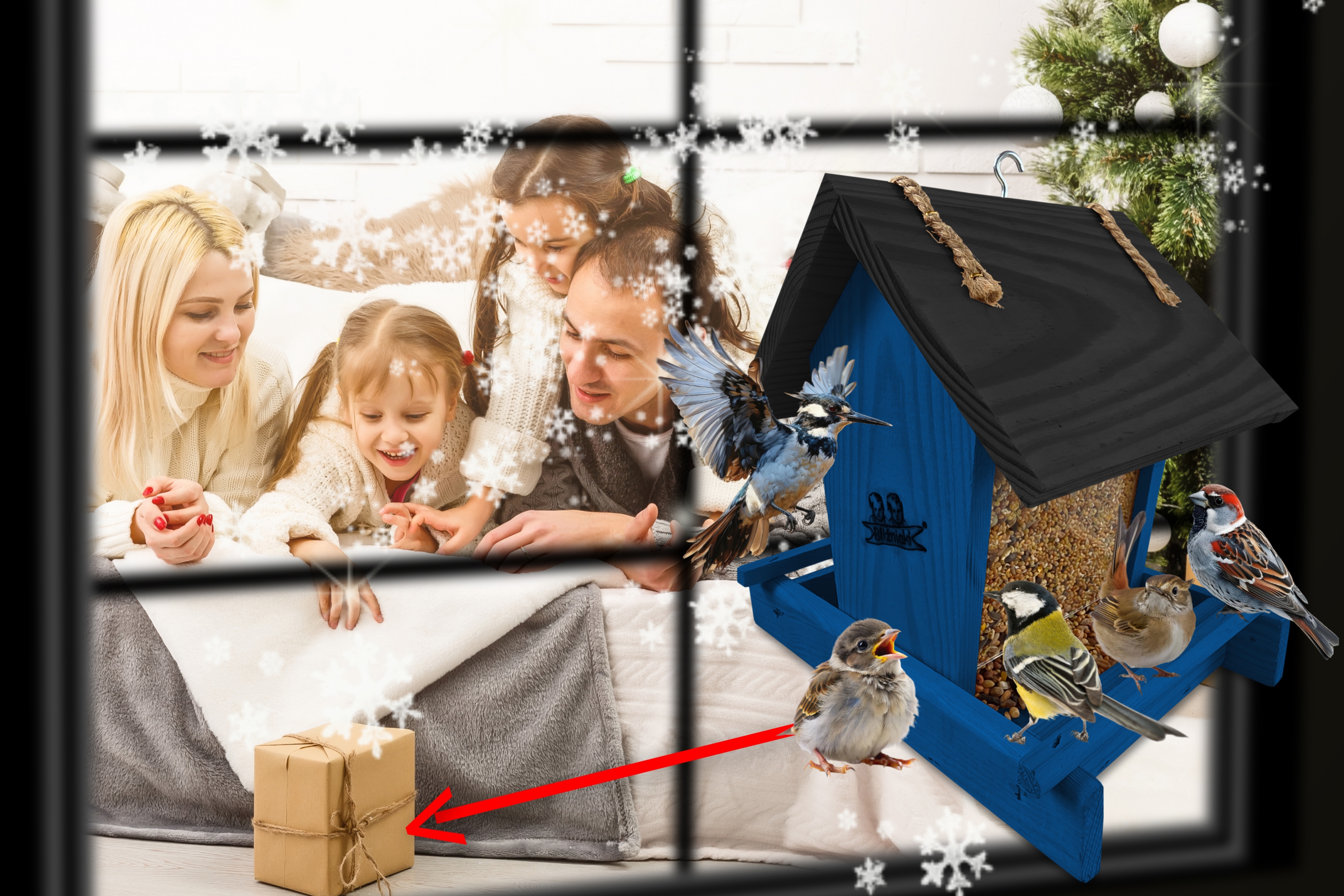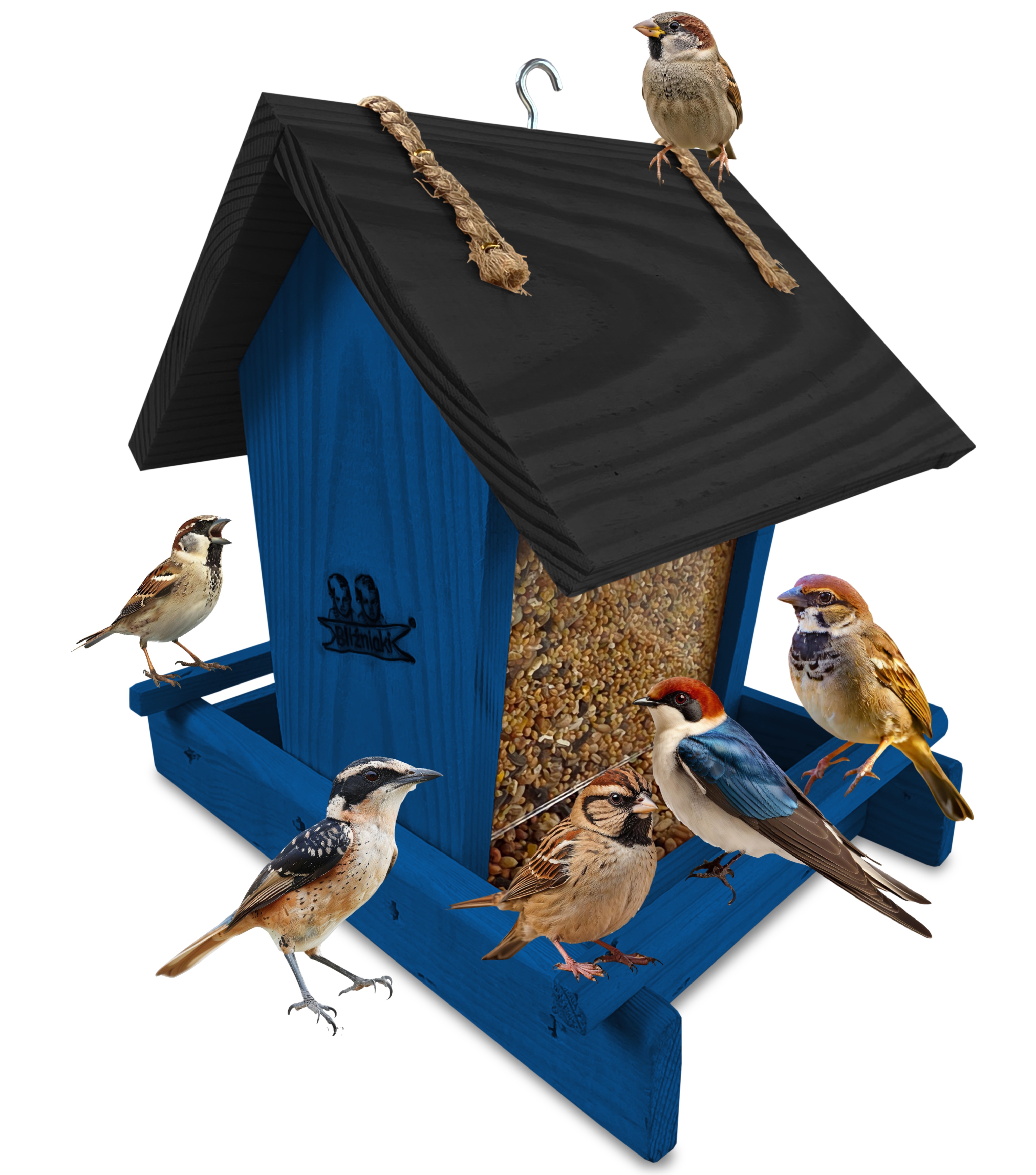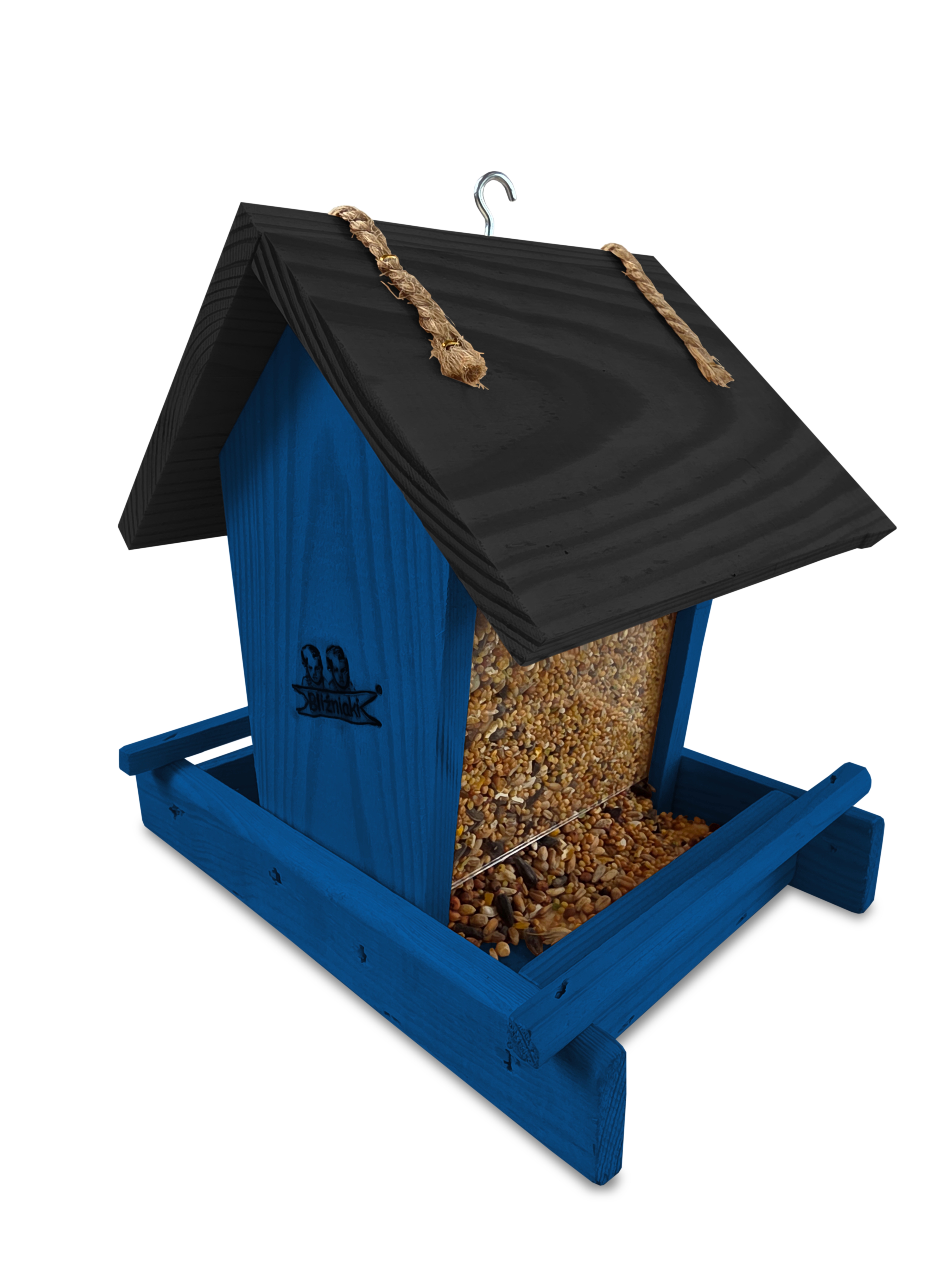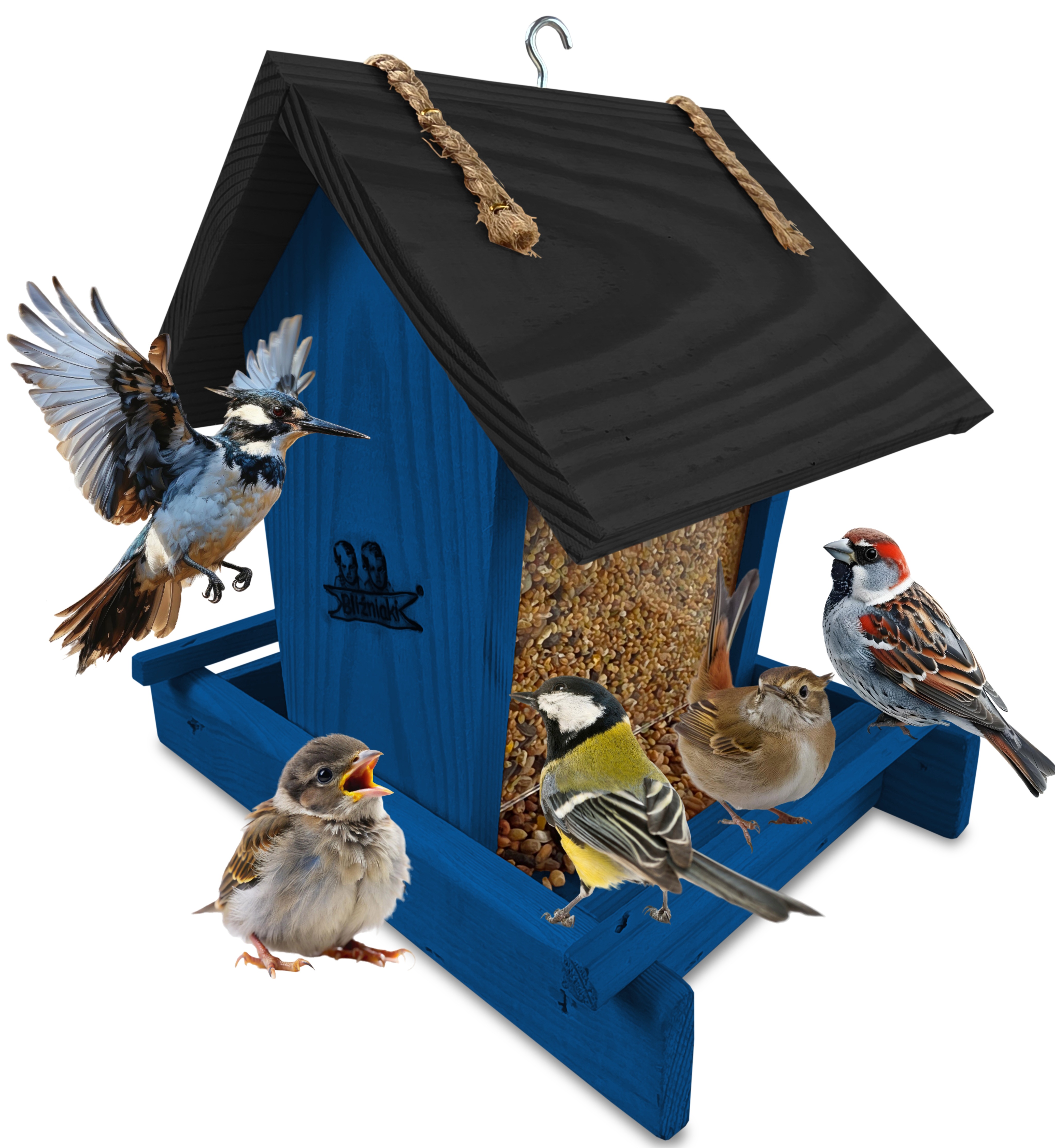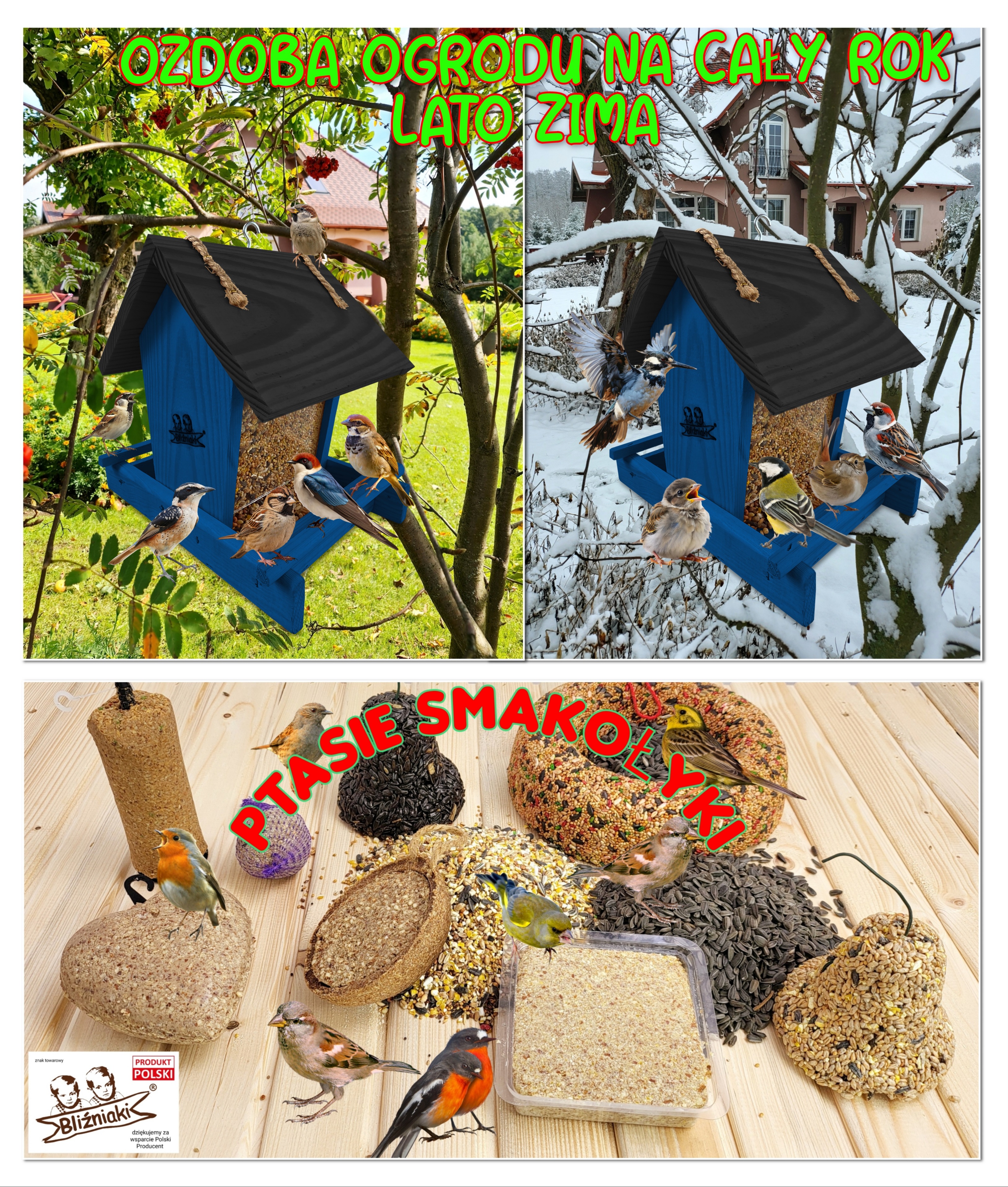 - Karmnik wykonany jest w całości z drewna iglastego, KOLOR CIEMNY NIEBIESKI Z CZARNYM DACHEM
