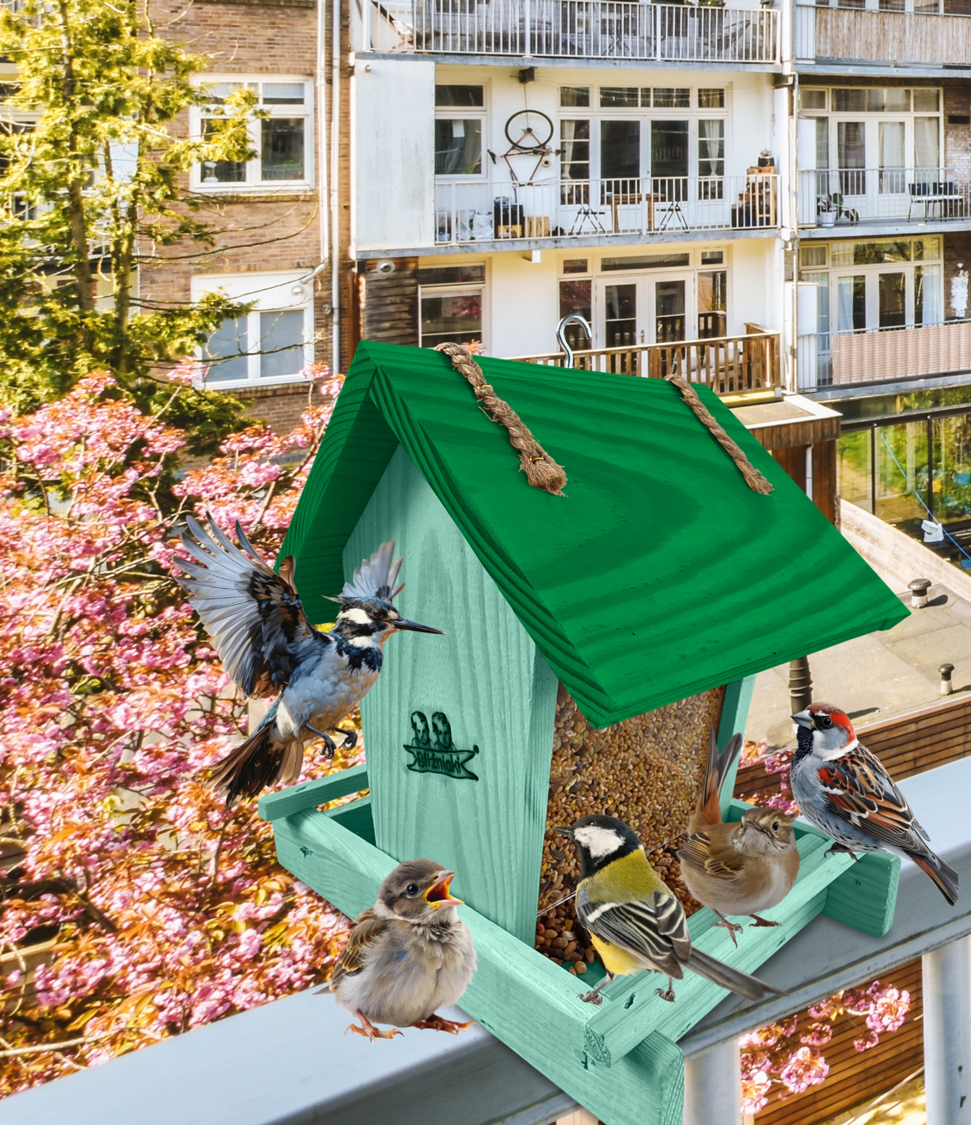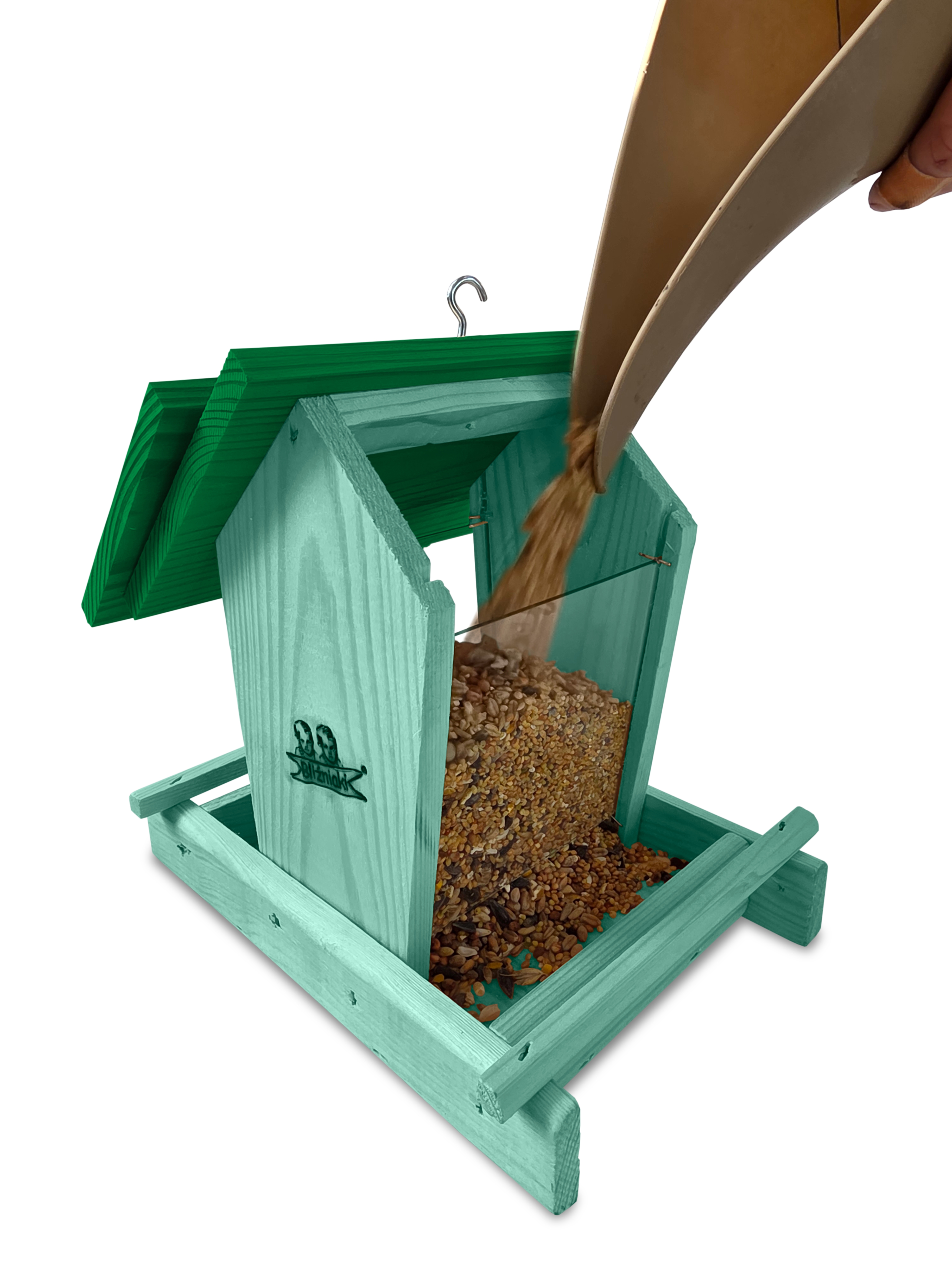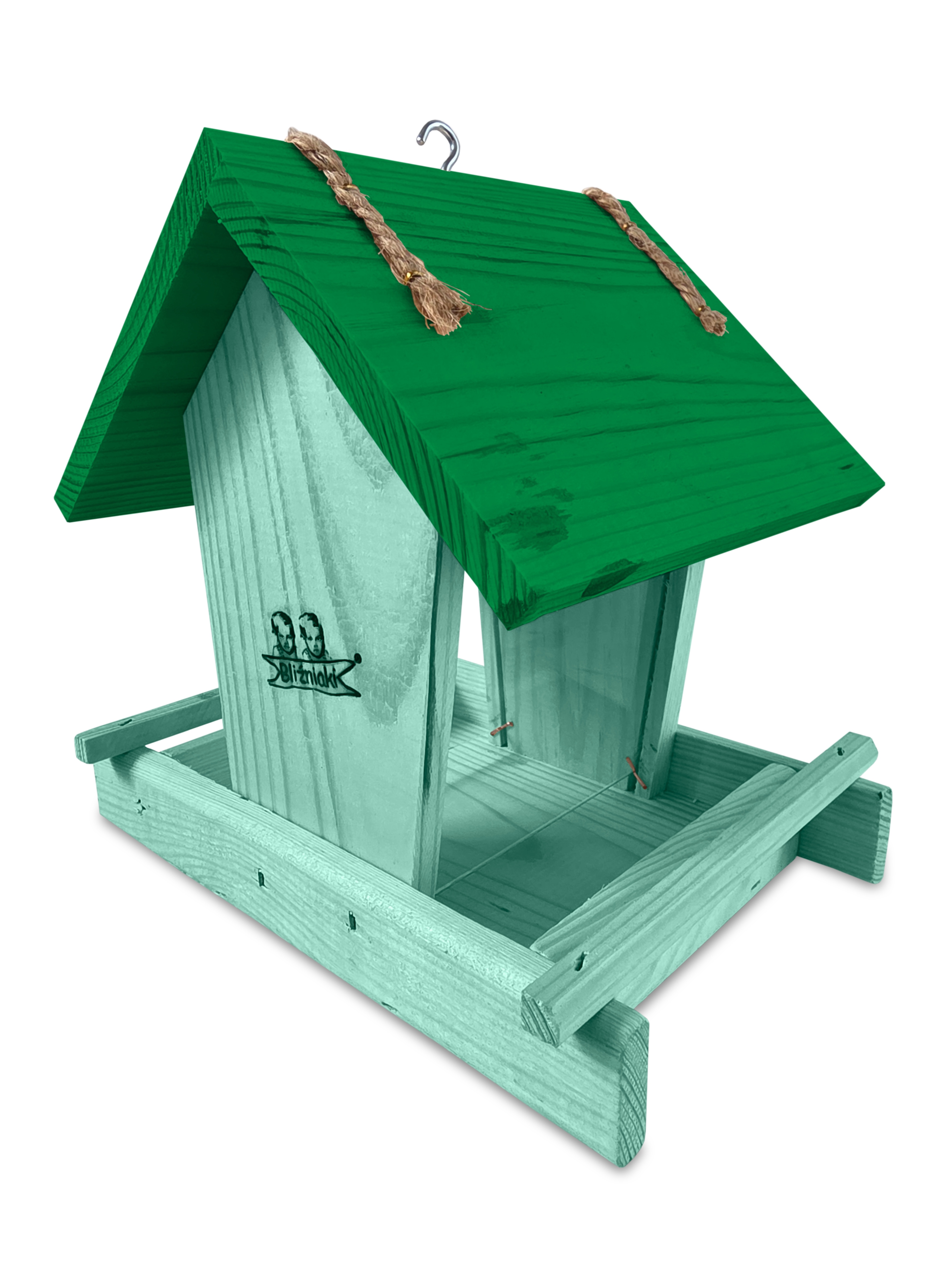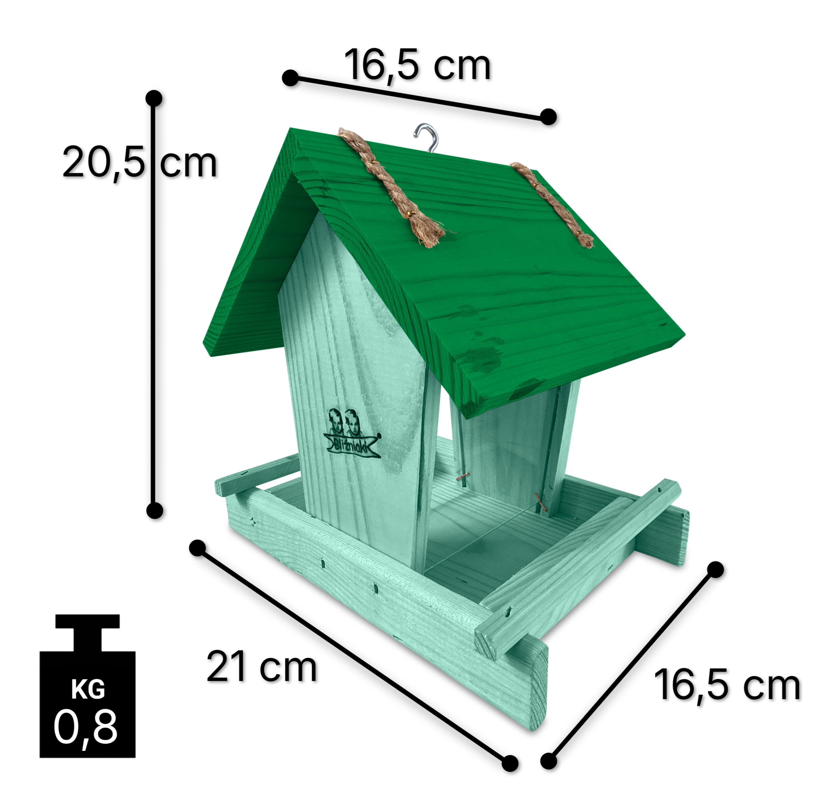 - Karmnik wykonany jest w całości z drewna iglastego, KOLOR JASNA MORSKA ZIELEŃ Z CIEMNOZIELONYM DACHEM