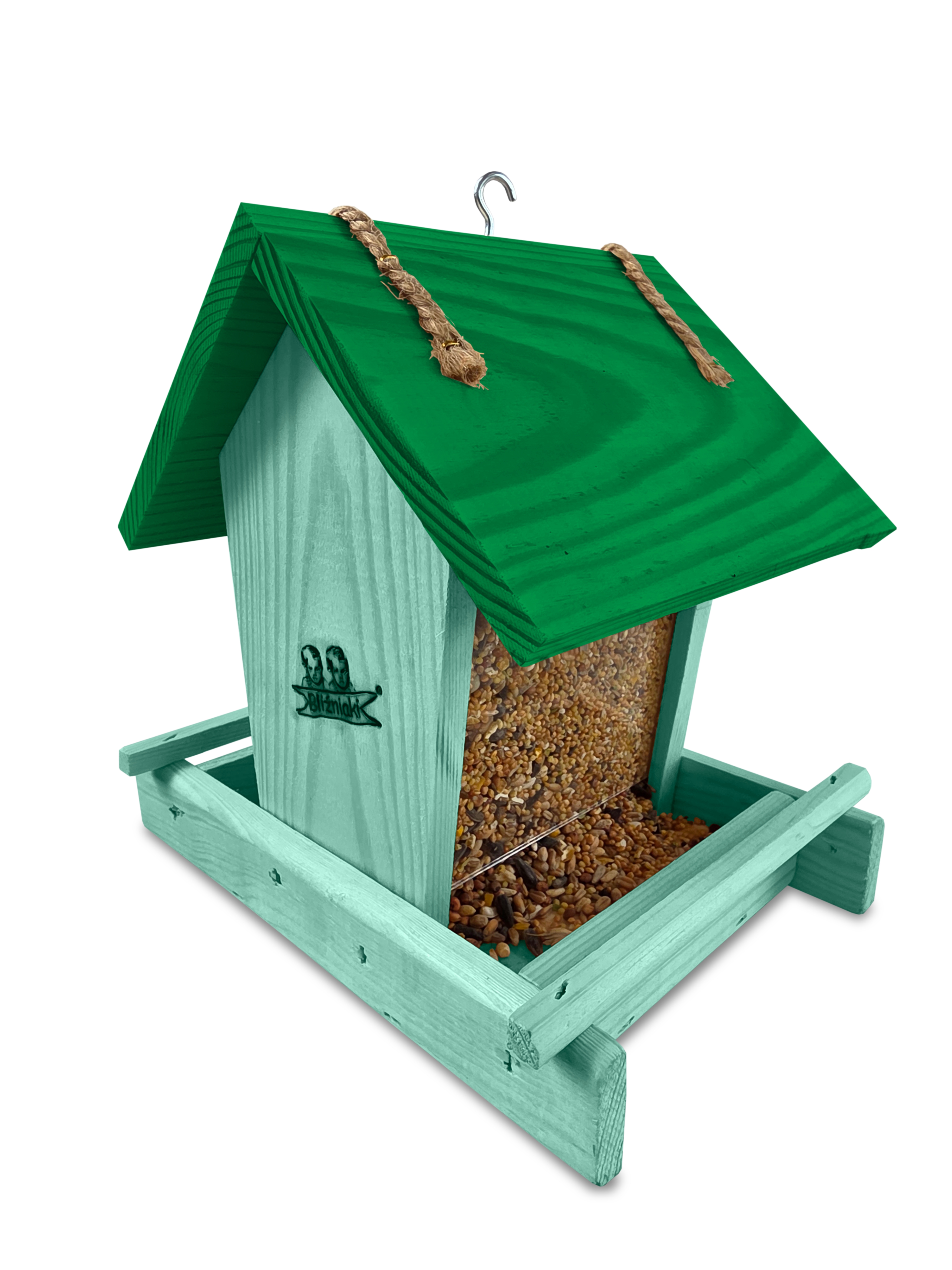 Przedmiotem sprzedaży jest ozdobny drewniany karmnik dla ptaków z dozownikiem ziarna model K29 MRP K w kolor jasna morska zieleń z ciemnozielonym dachem