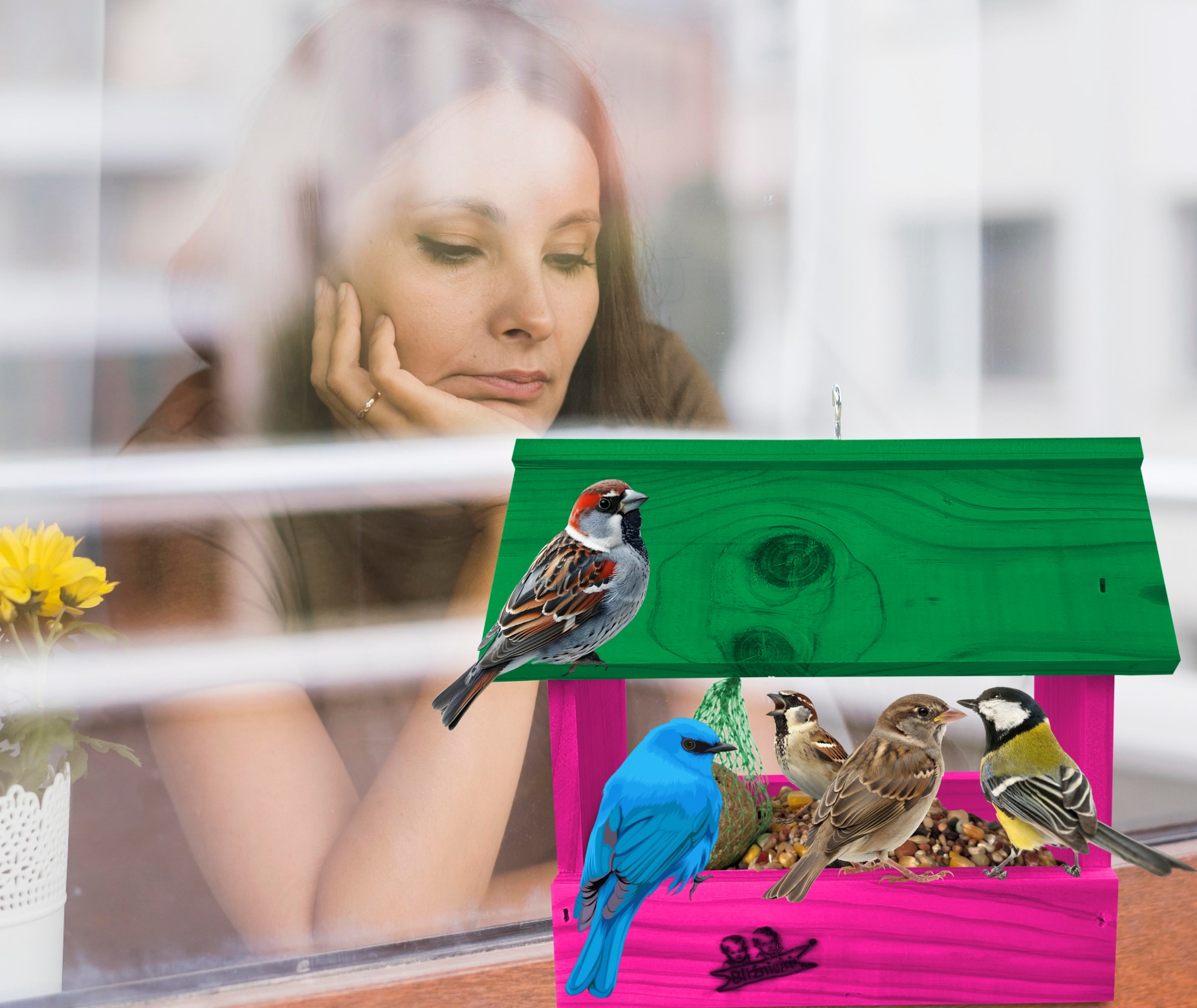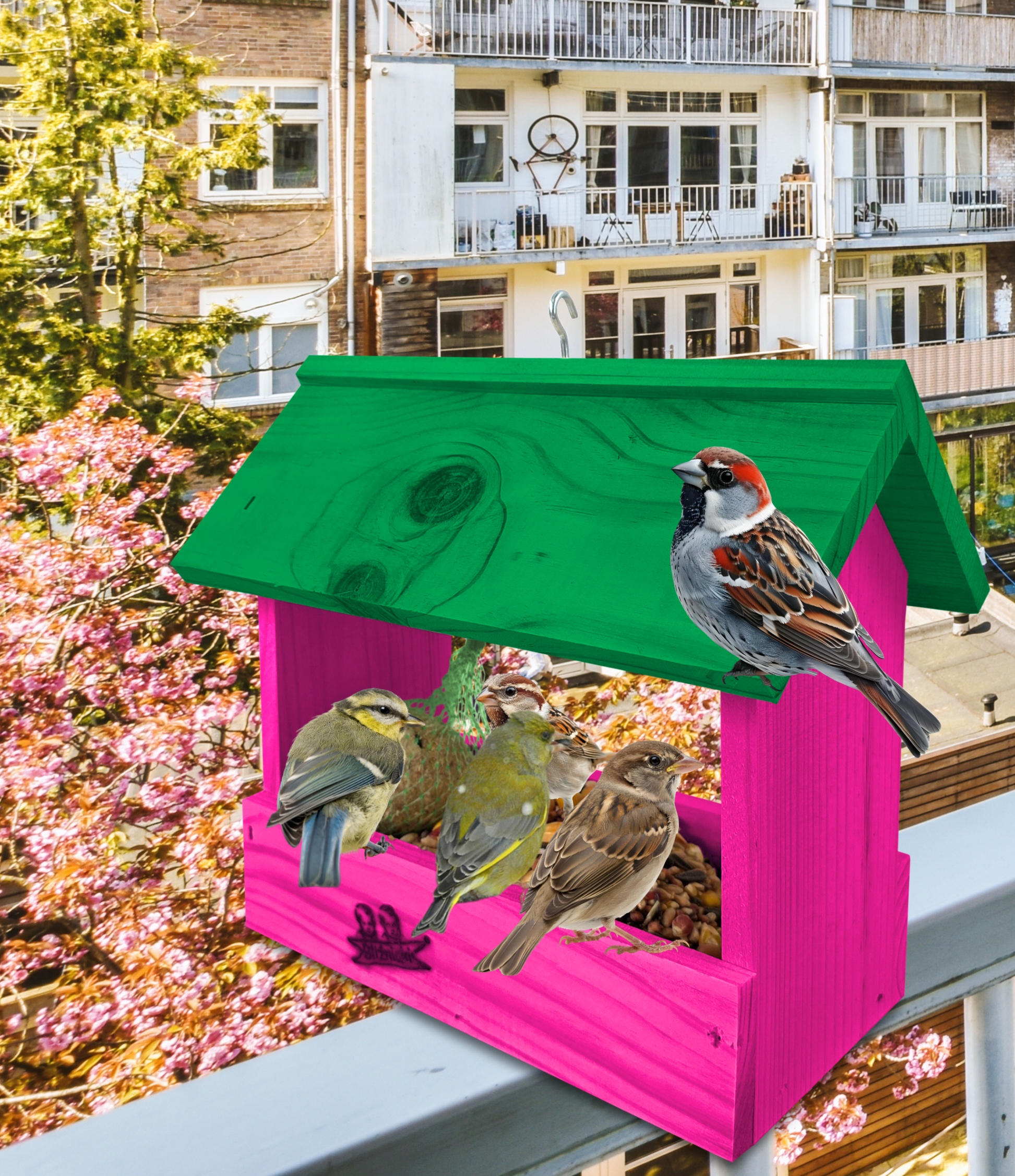 Przedmiotem sprzedaży jest ozdobny drewniany karmnik dla ptaków budka domek na balkon K204 RÓ K kolor ciemny róż z zielonym dachem