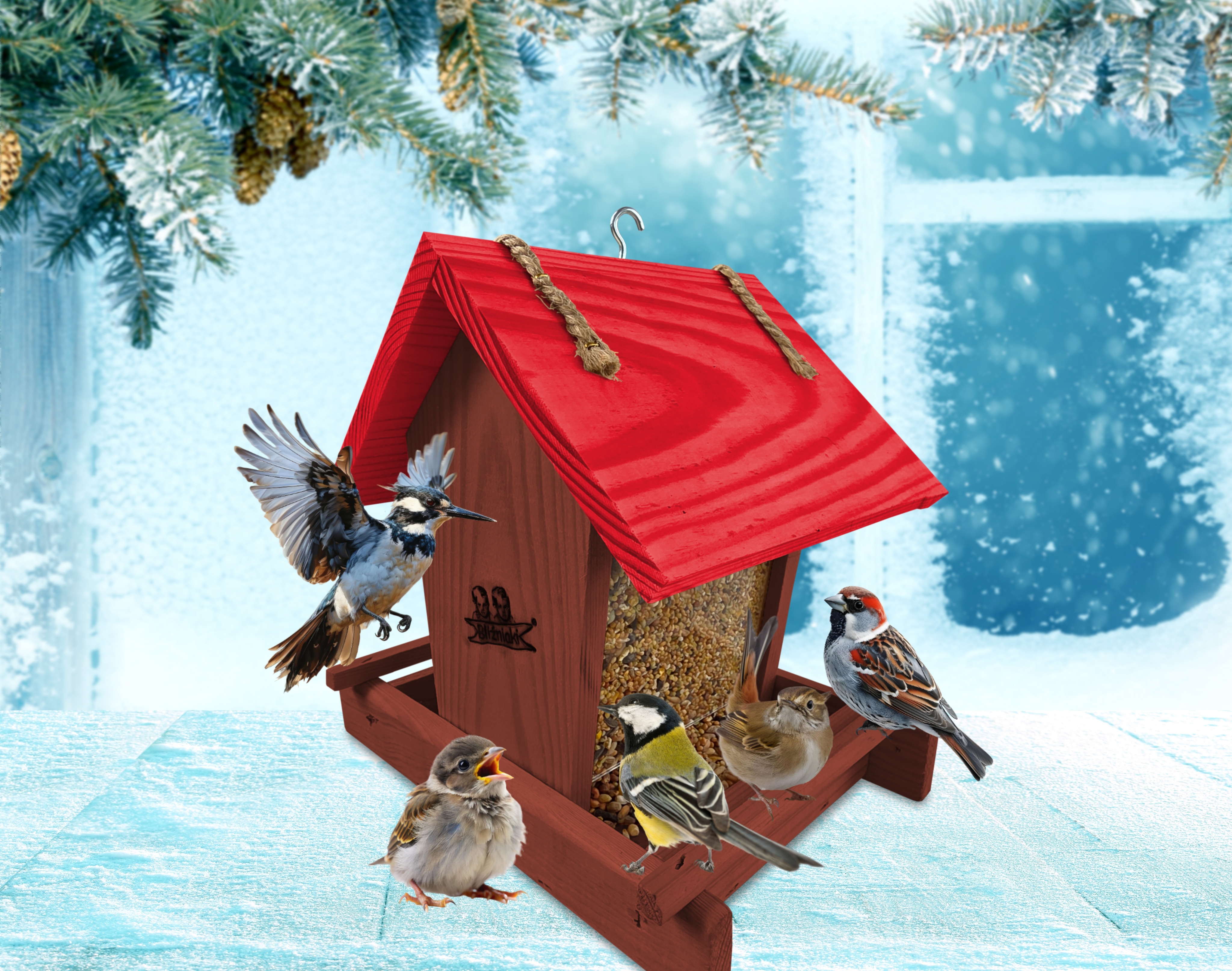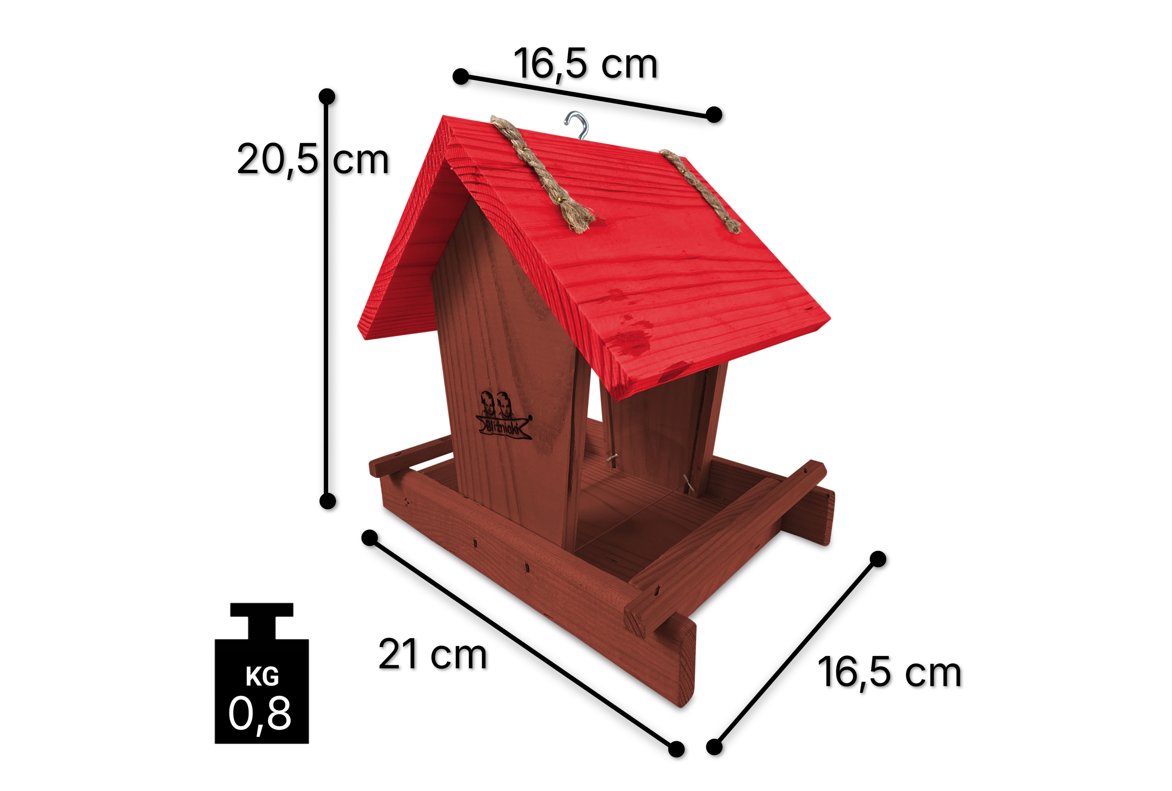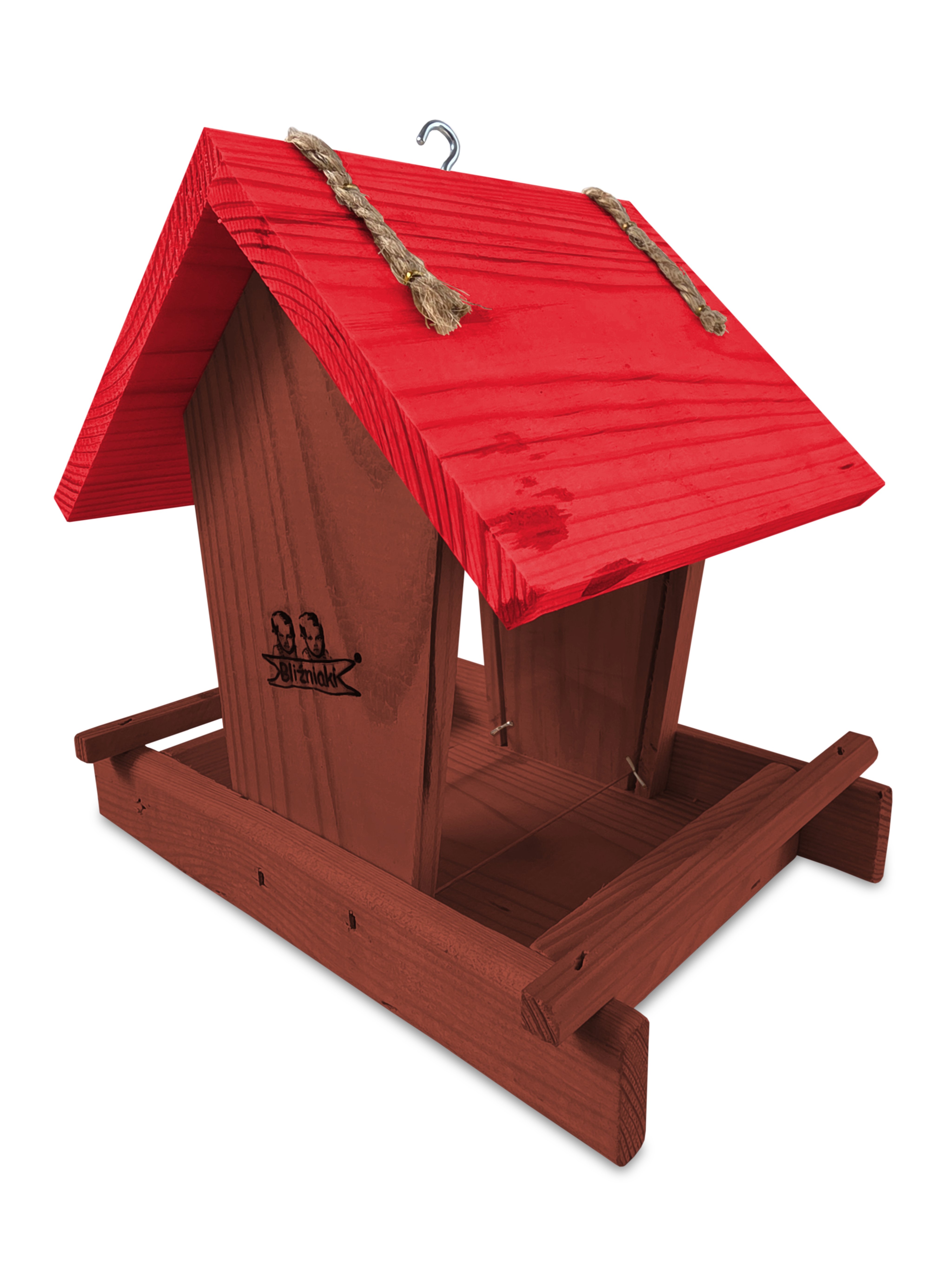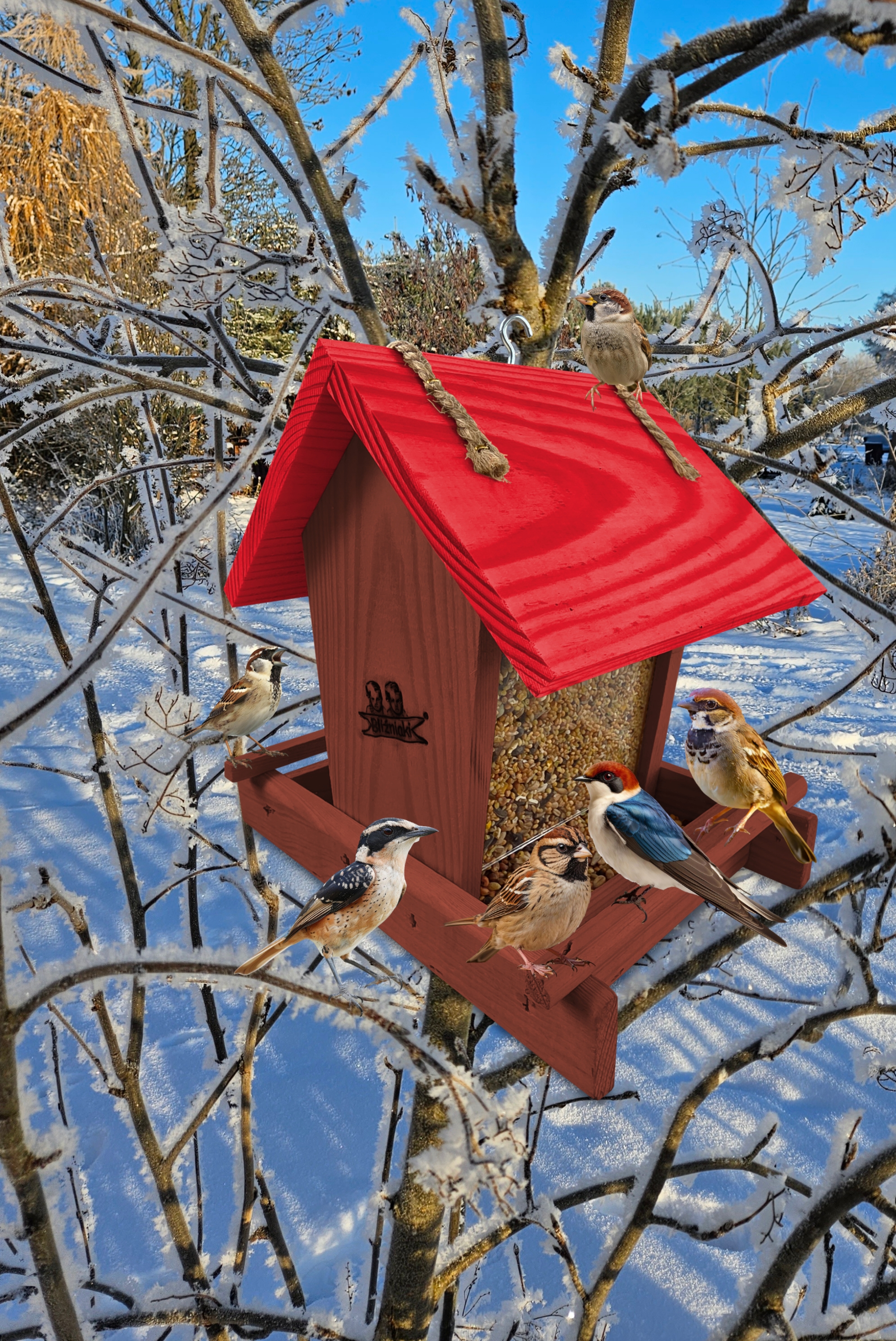 - Karmnik wykonany jest w całości z drewna iglastego, KOLOR BRĄZOWY Z CZERWONYM DACHEM