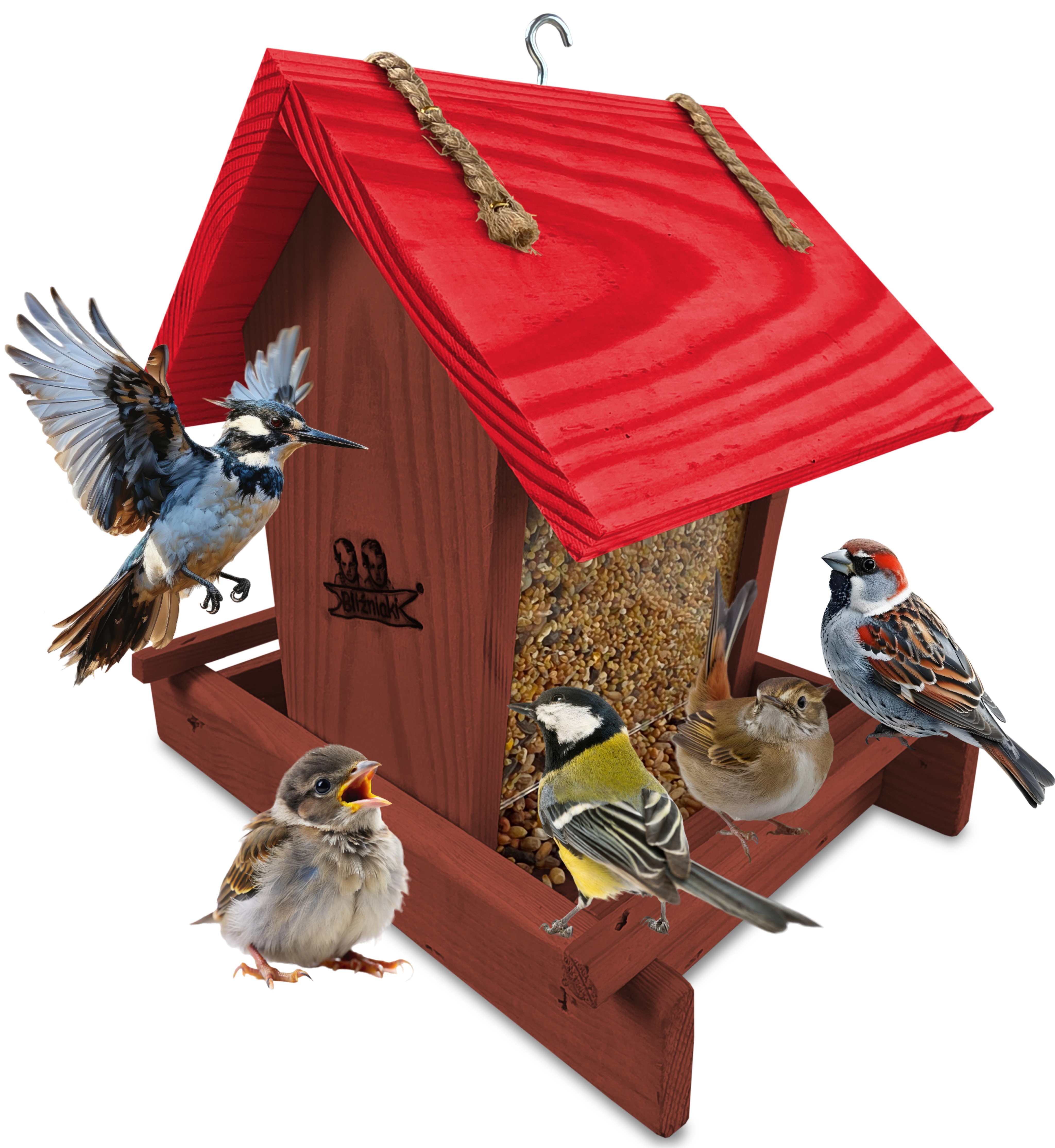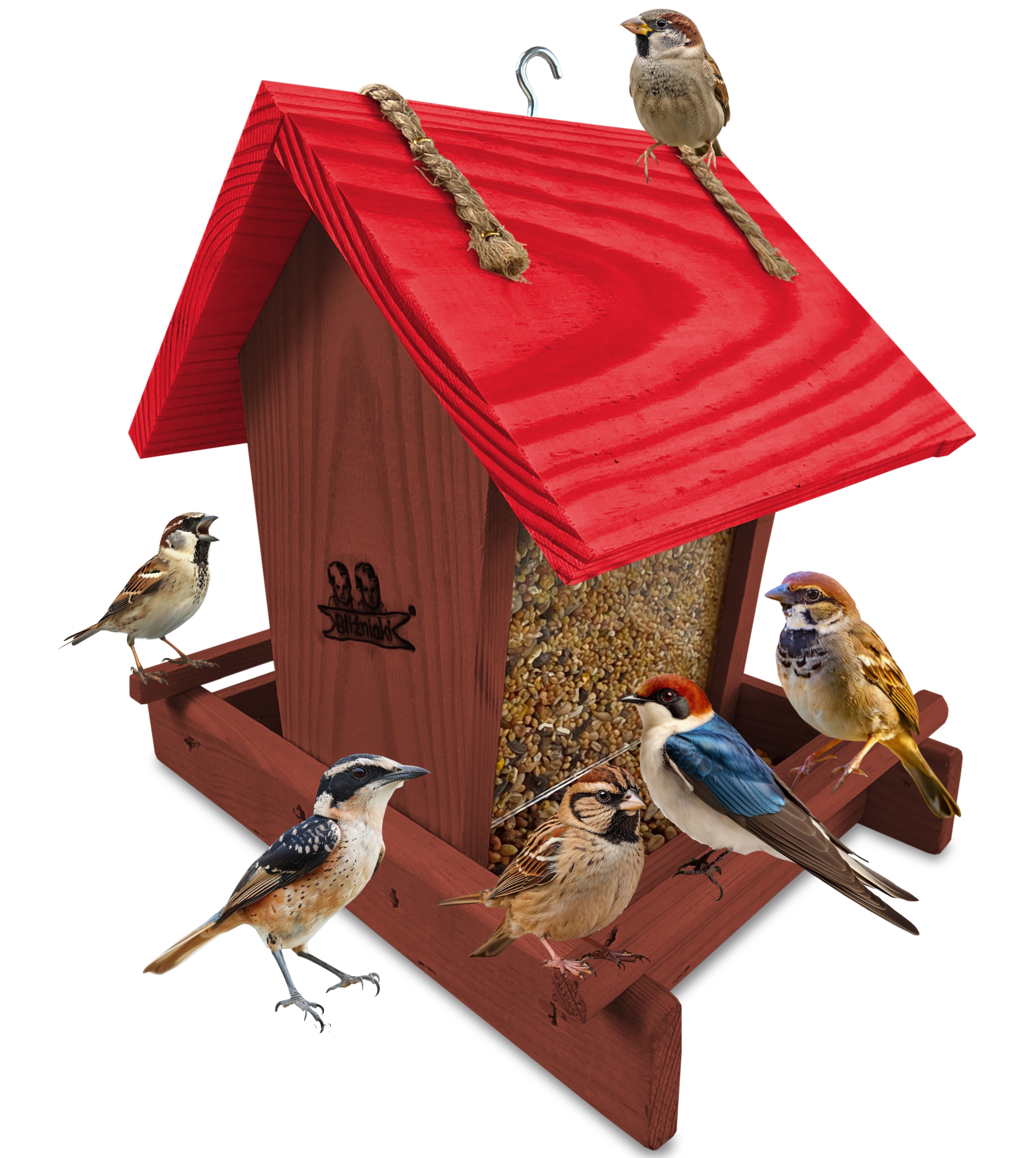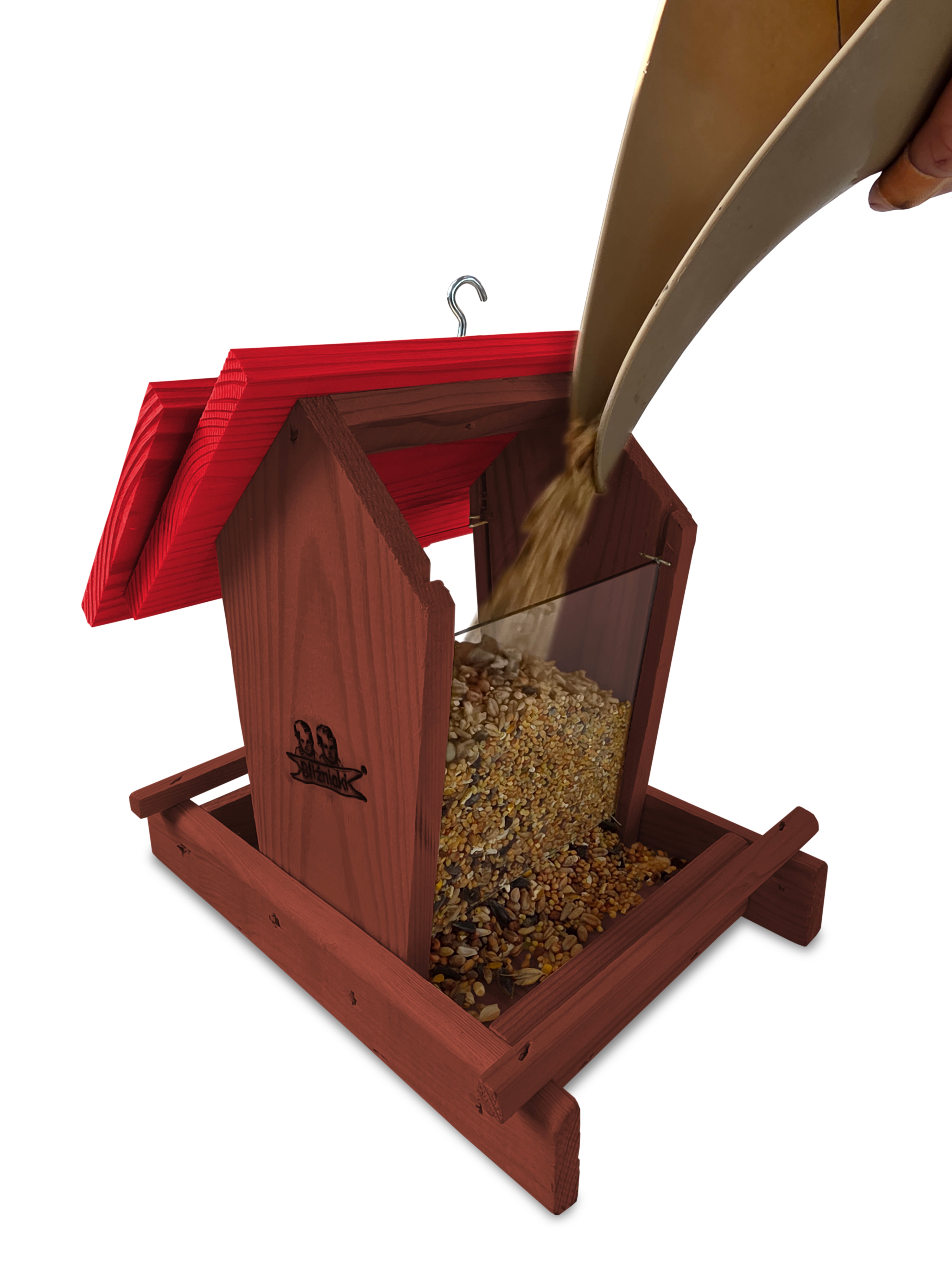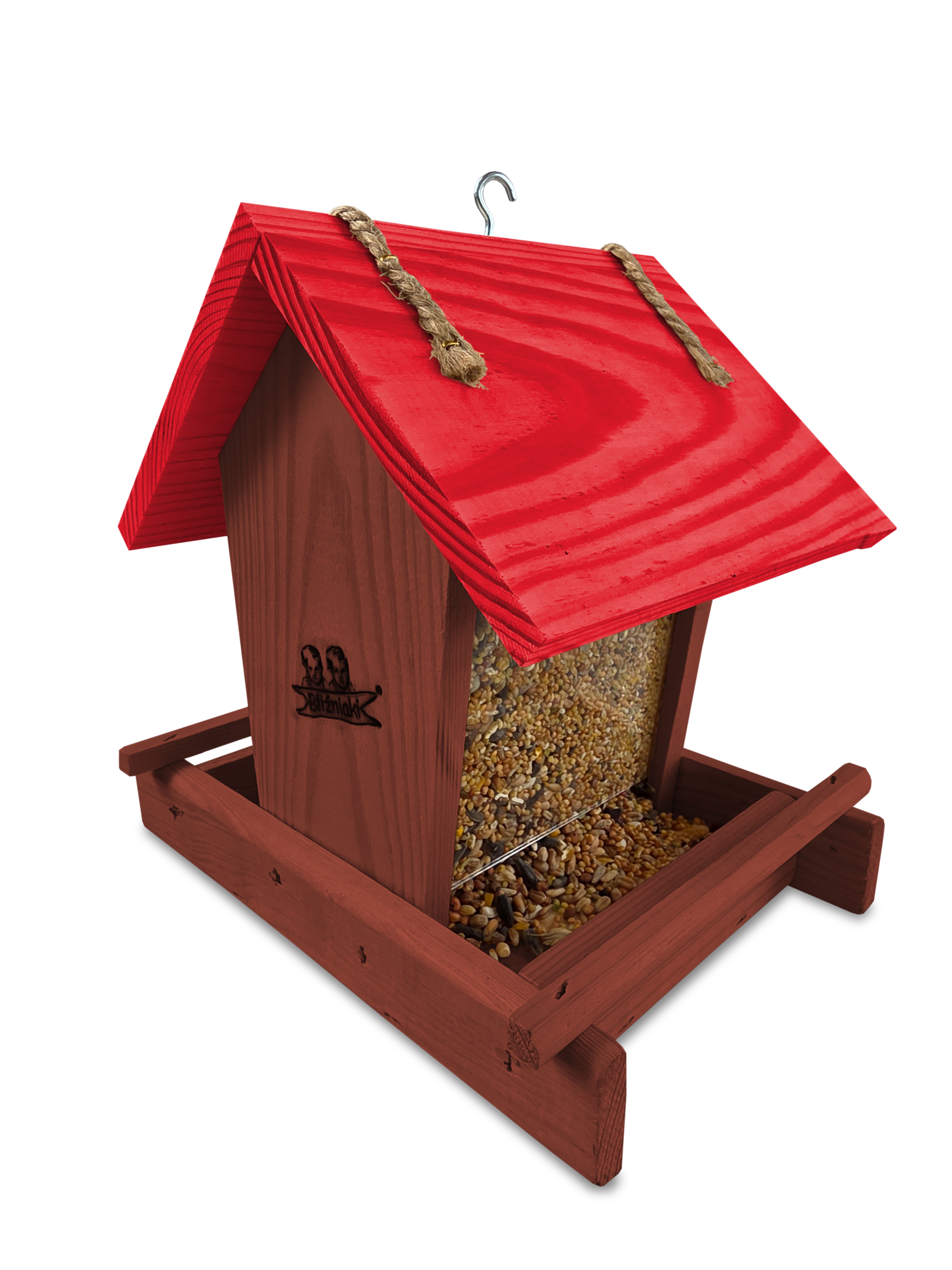 Przedmiotem sprzedaży jest ozdobny drewniany karmnik dla ptaków z dozownikiem ziarna model K29 O CB kolor brązowy z czerwonym dachem