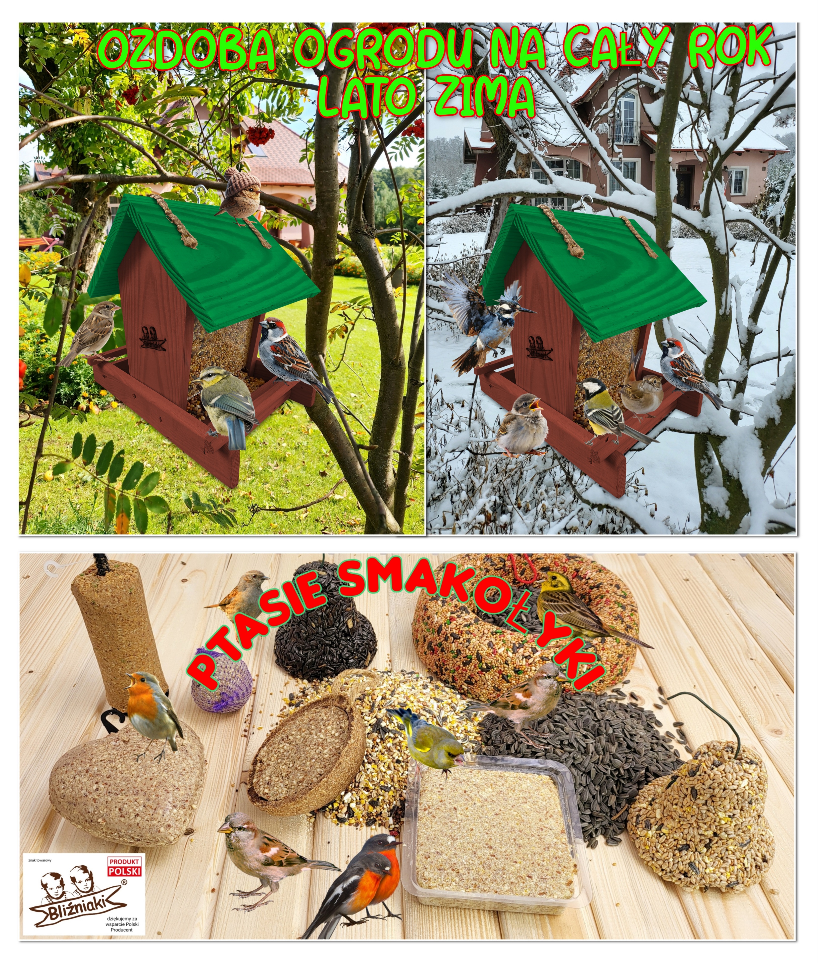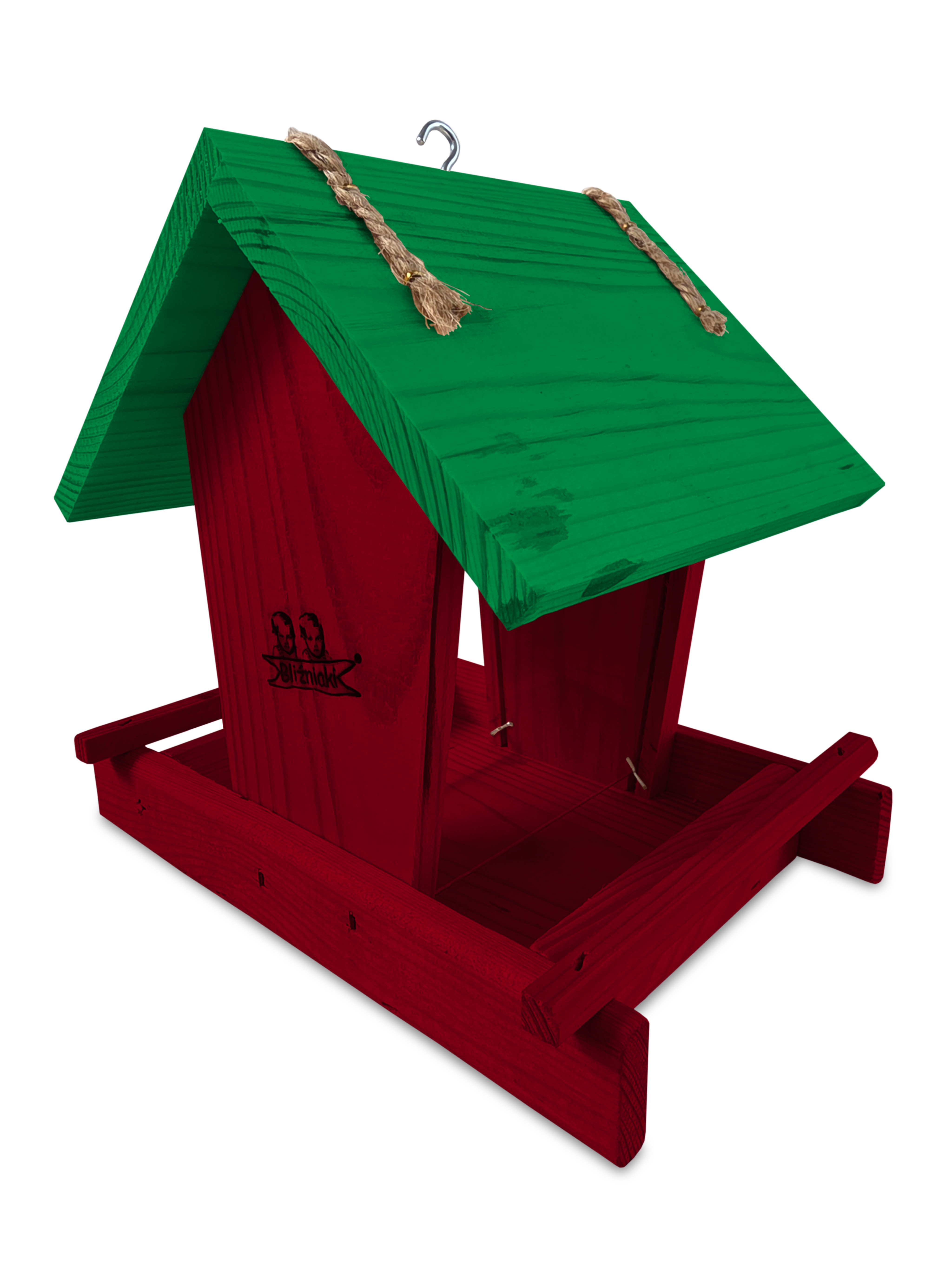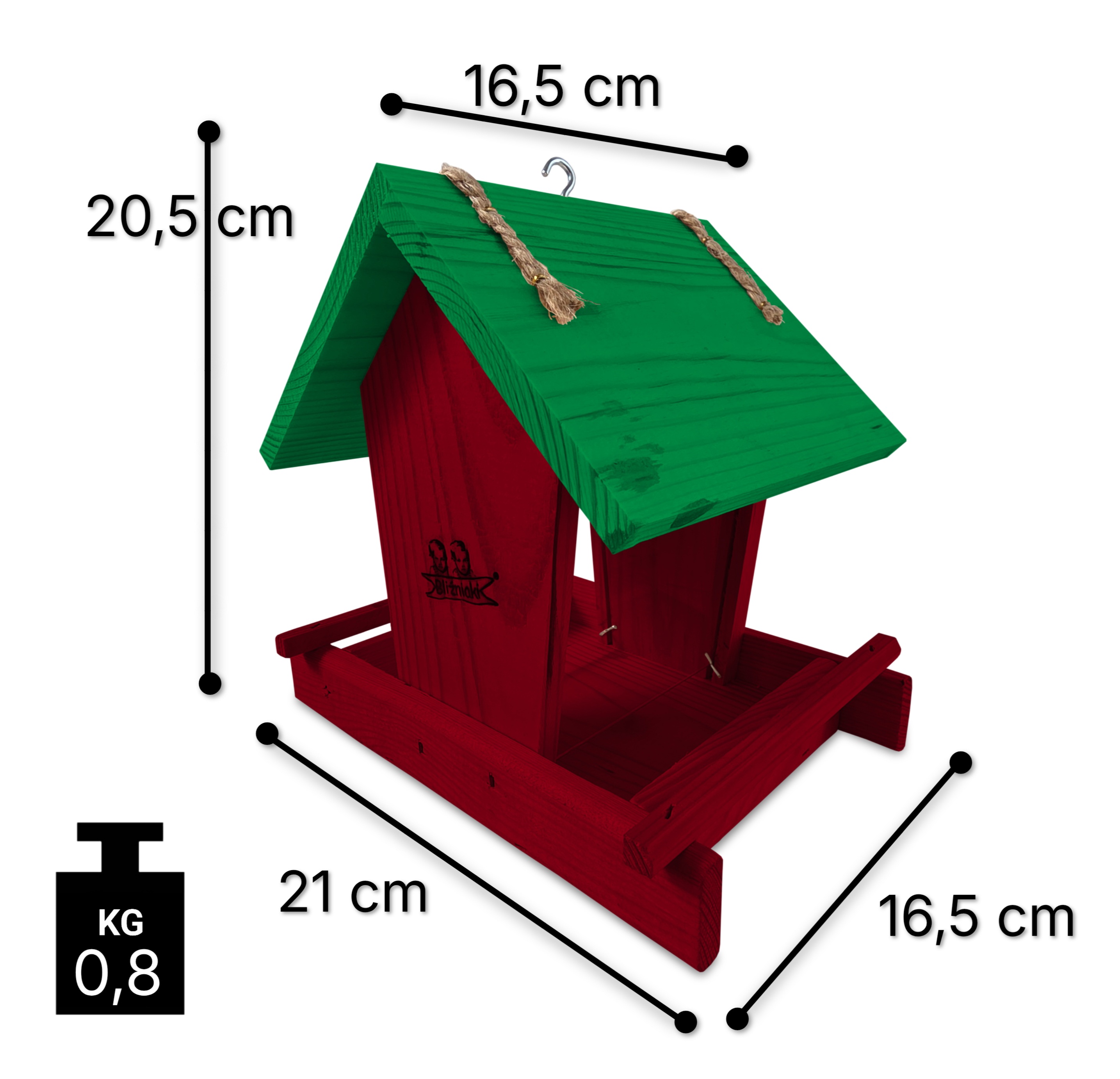- Karmnik wykonany jest w całości z drewna iglastego, KOLOR MAHONIOWY Z CIEMNOZIELONYM DACHEM