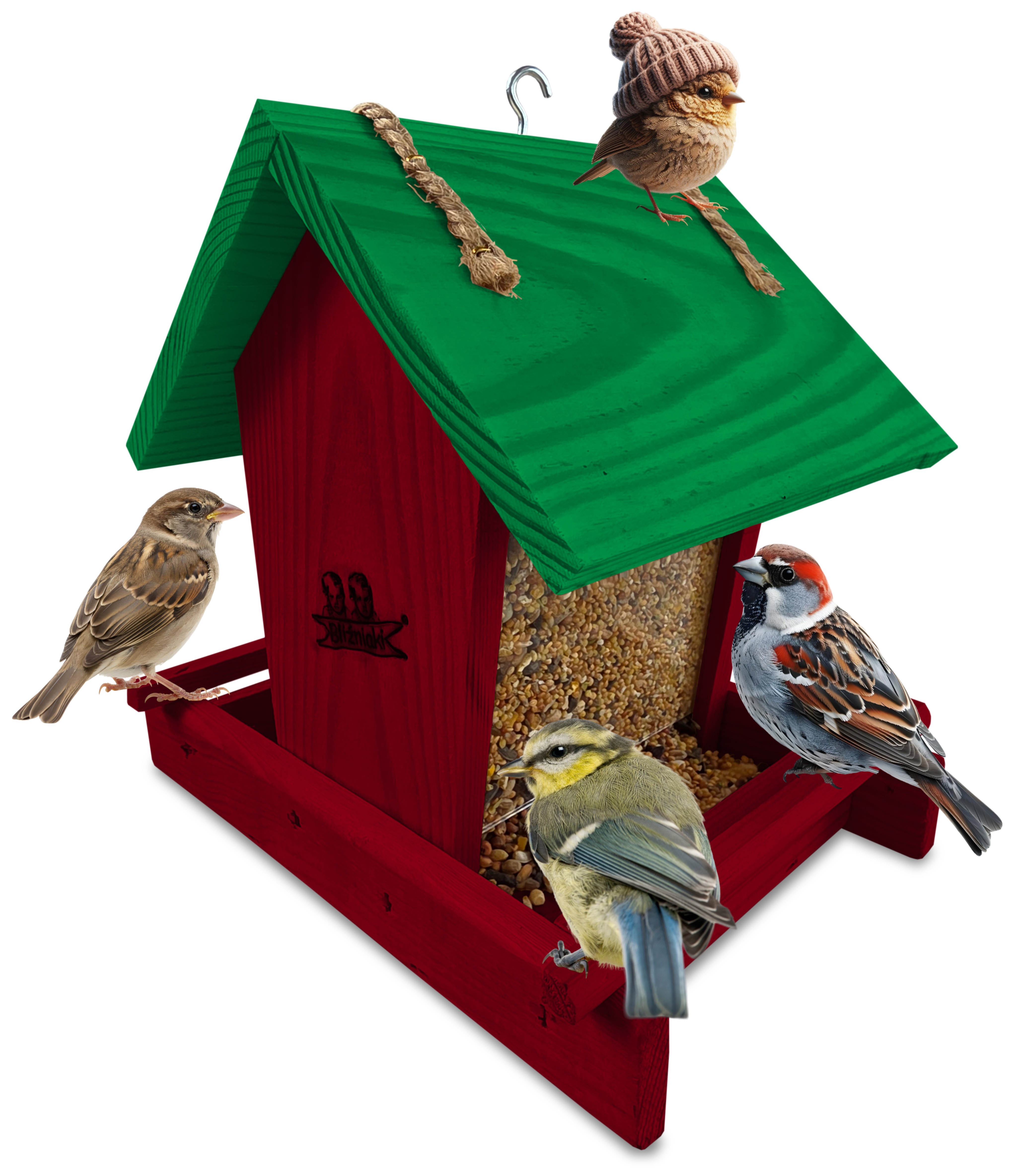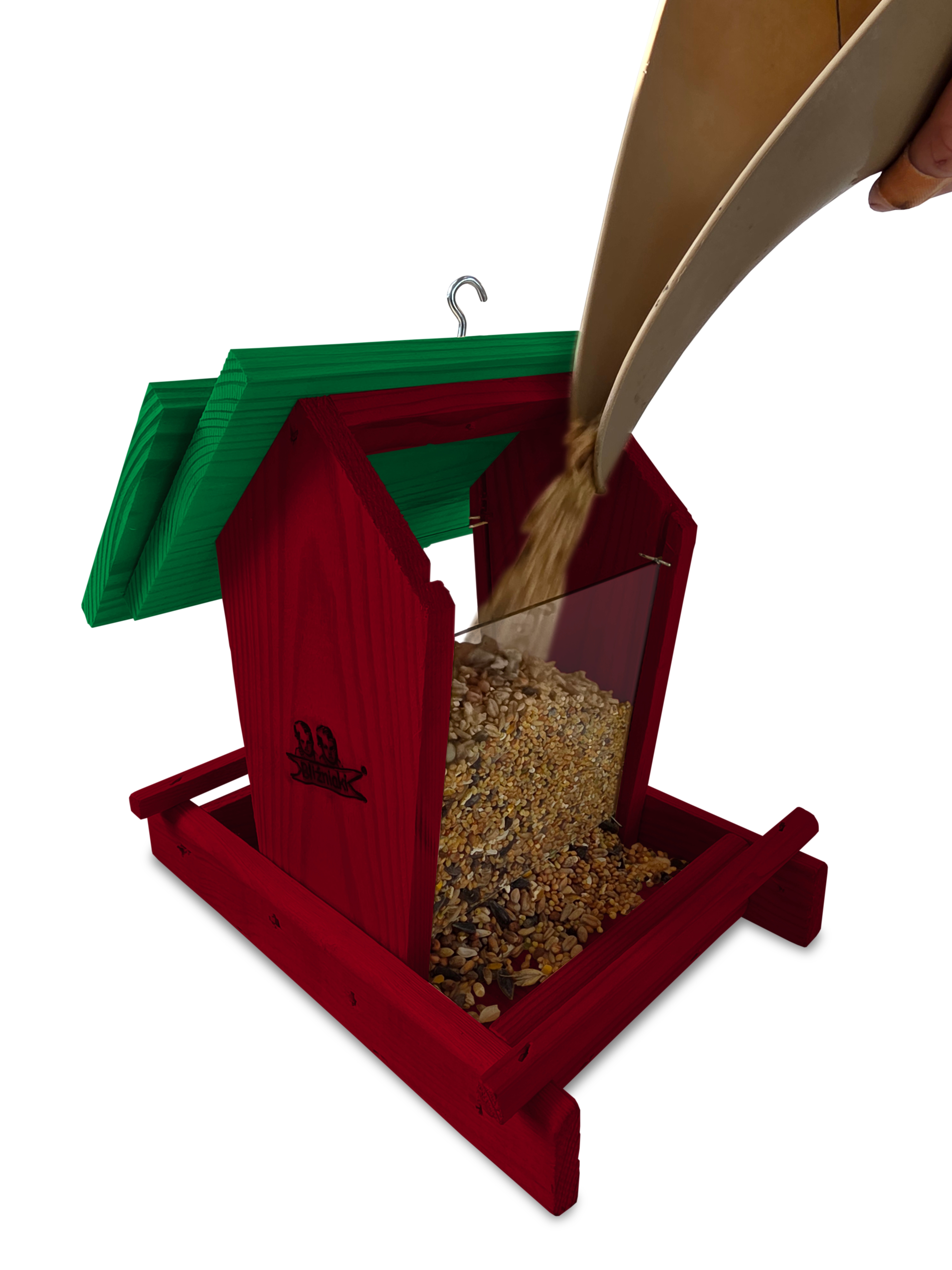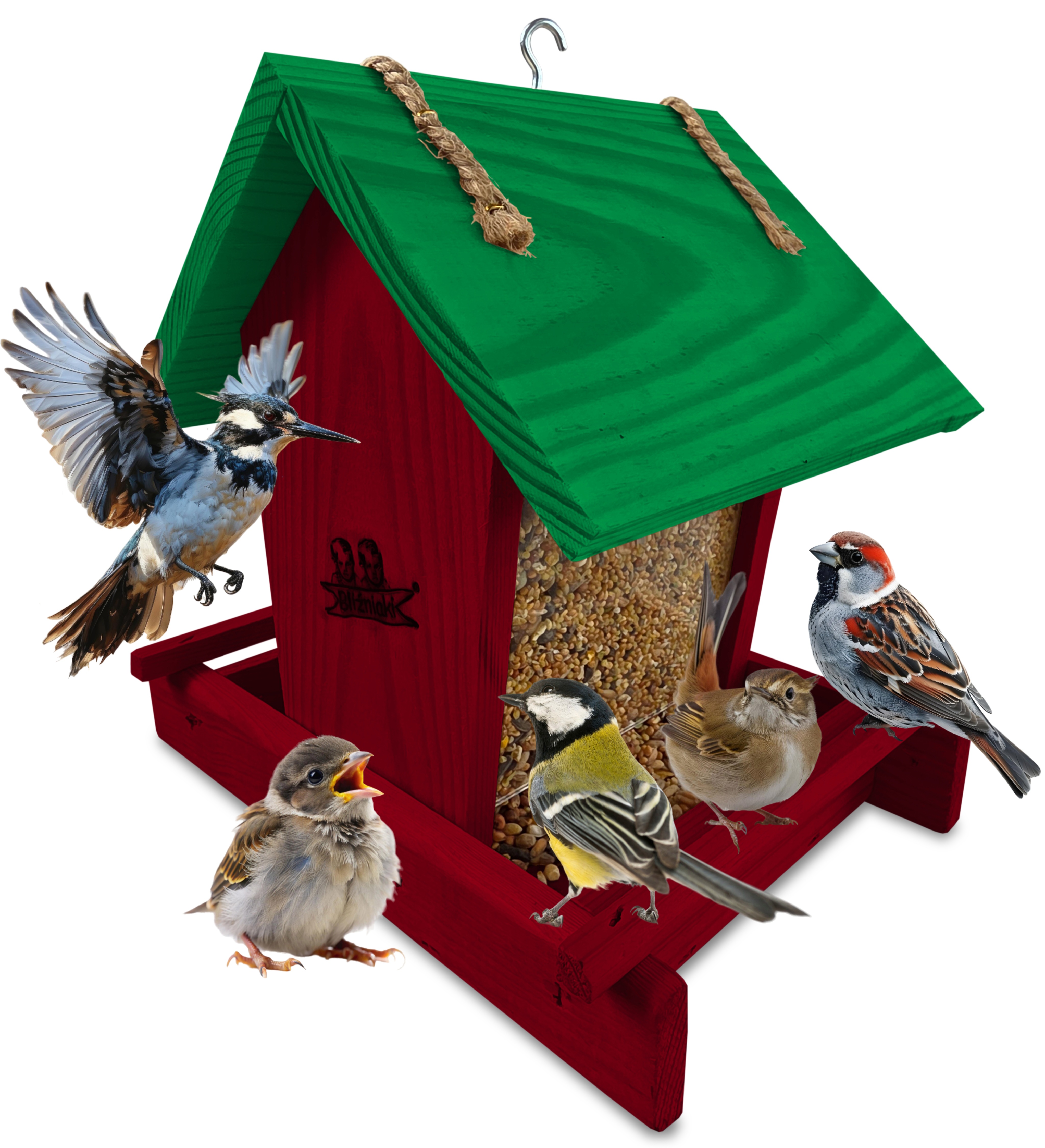 - Karmnik wykonany jest w całości z drewna iglastego, KOLOR MAHONIOWY Z CIEMNOZIELONYM DACHEM