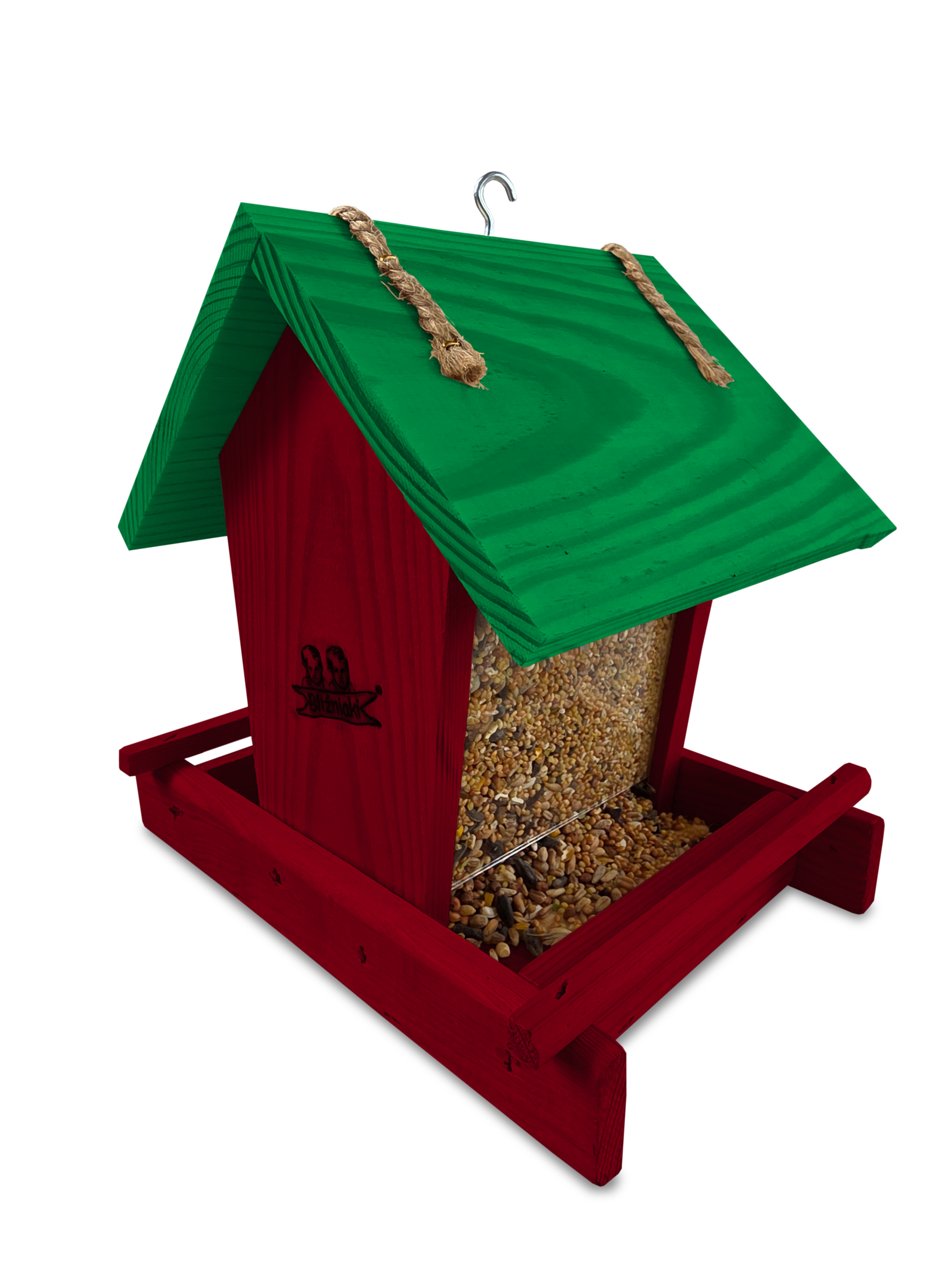 Przedmiotem sprzedaży jest ozdobny drewniany karmnik dla ptaków z dozownikiem ziarna model K29 MA K w kolorze mahoniowym z ciemnozielonym dachem