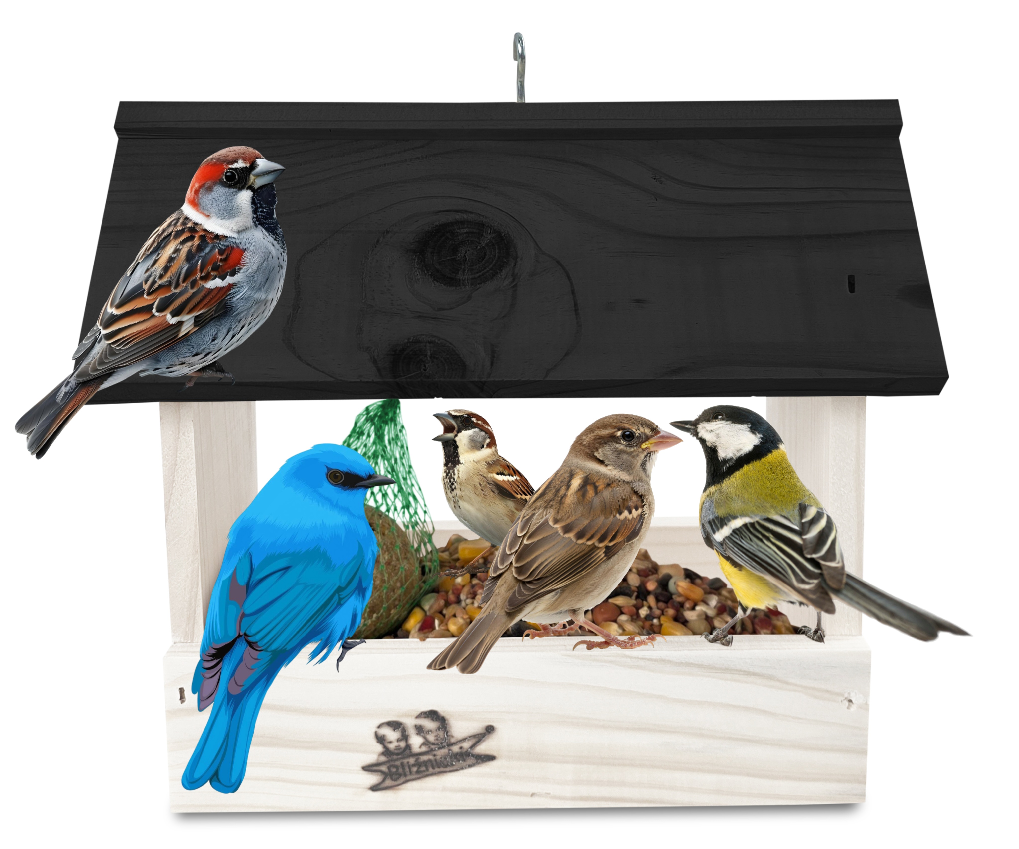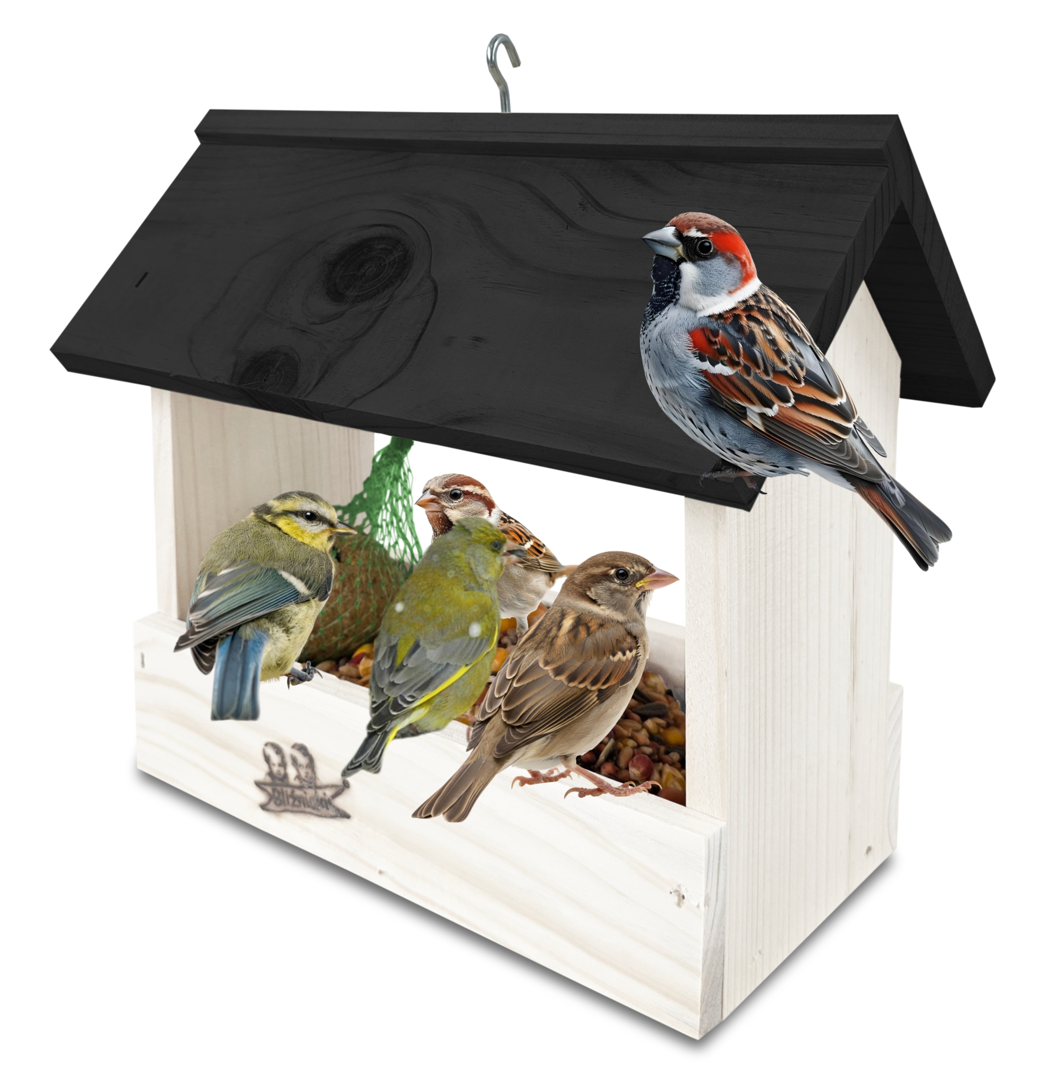 - U góry widoczny jest haczyk umożliwiający zawieszenie karmnika w dowolnym miejscu, możliwe jest również jego postawienie