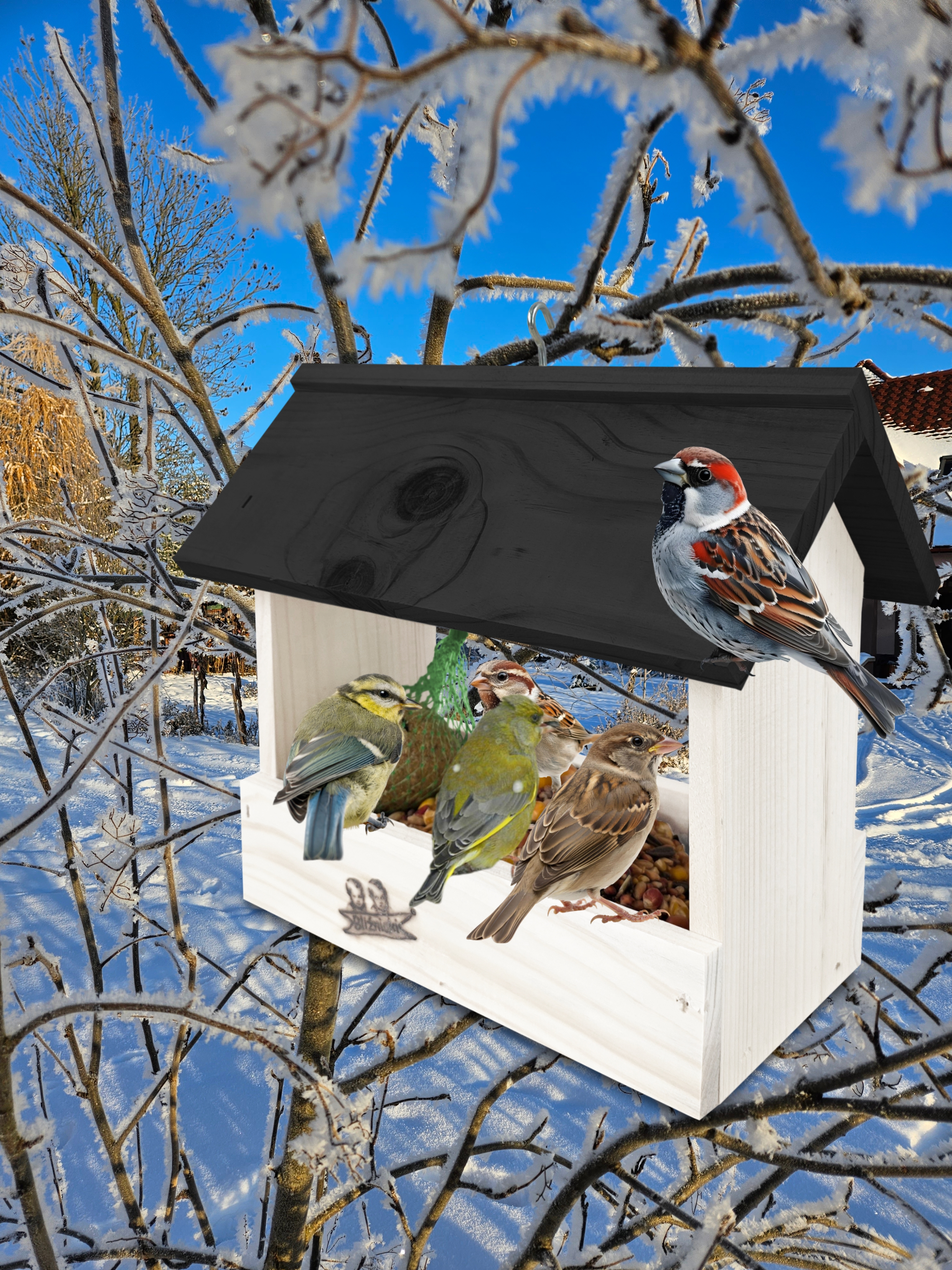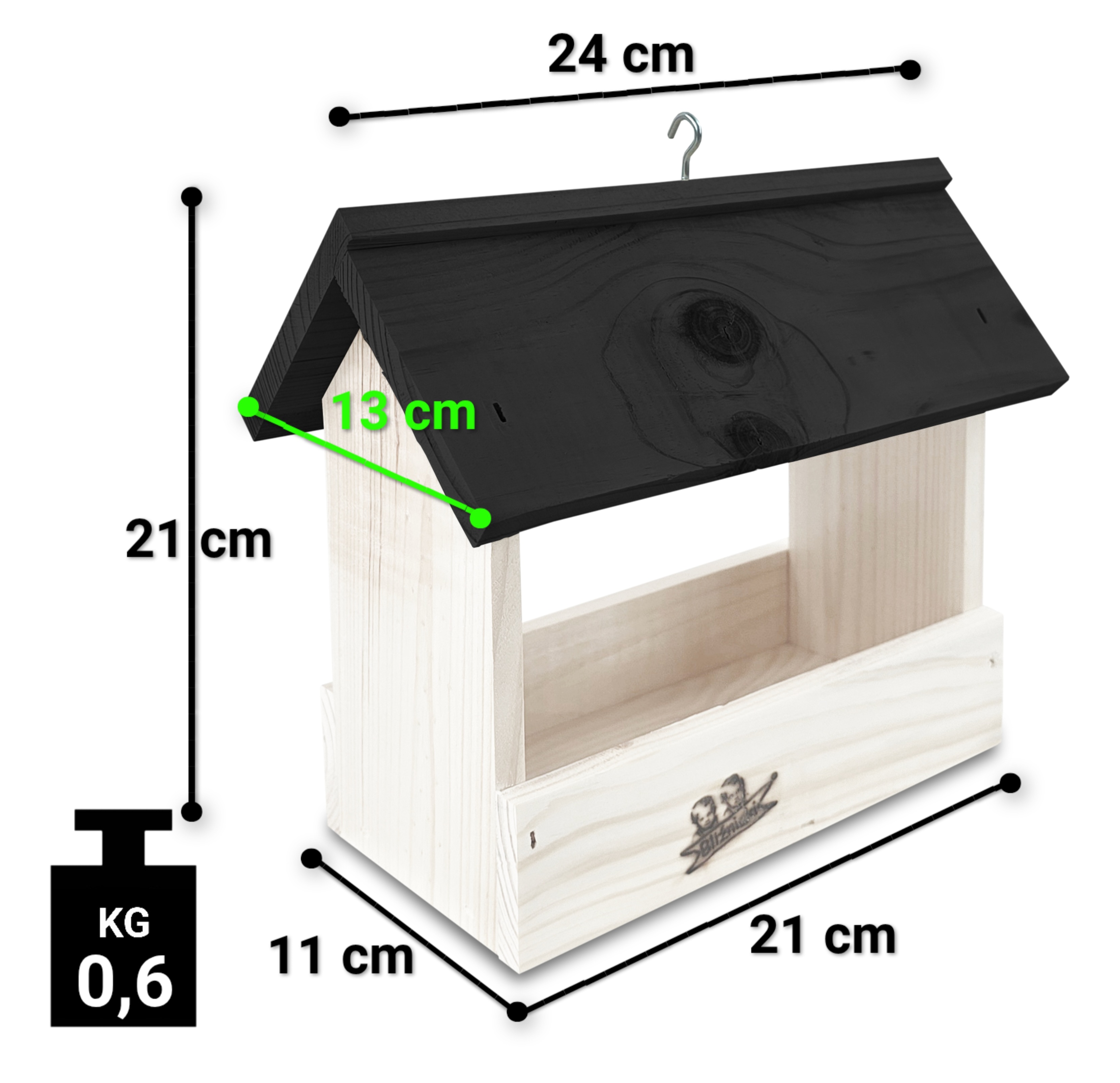 - Karmnik wykonany jest w całości z drewna iglastego, KOLOR BIAŁY Z CZARNYM DACHEM