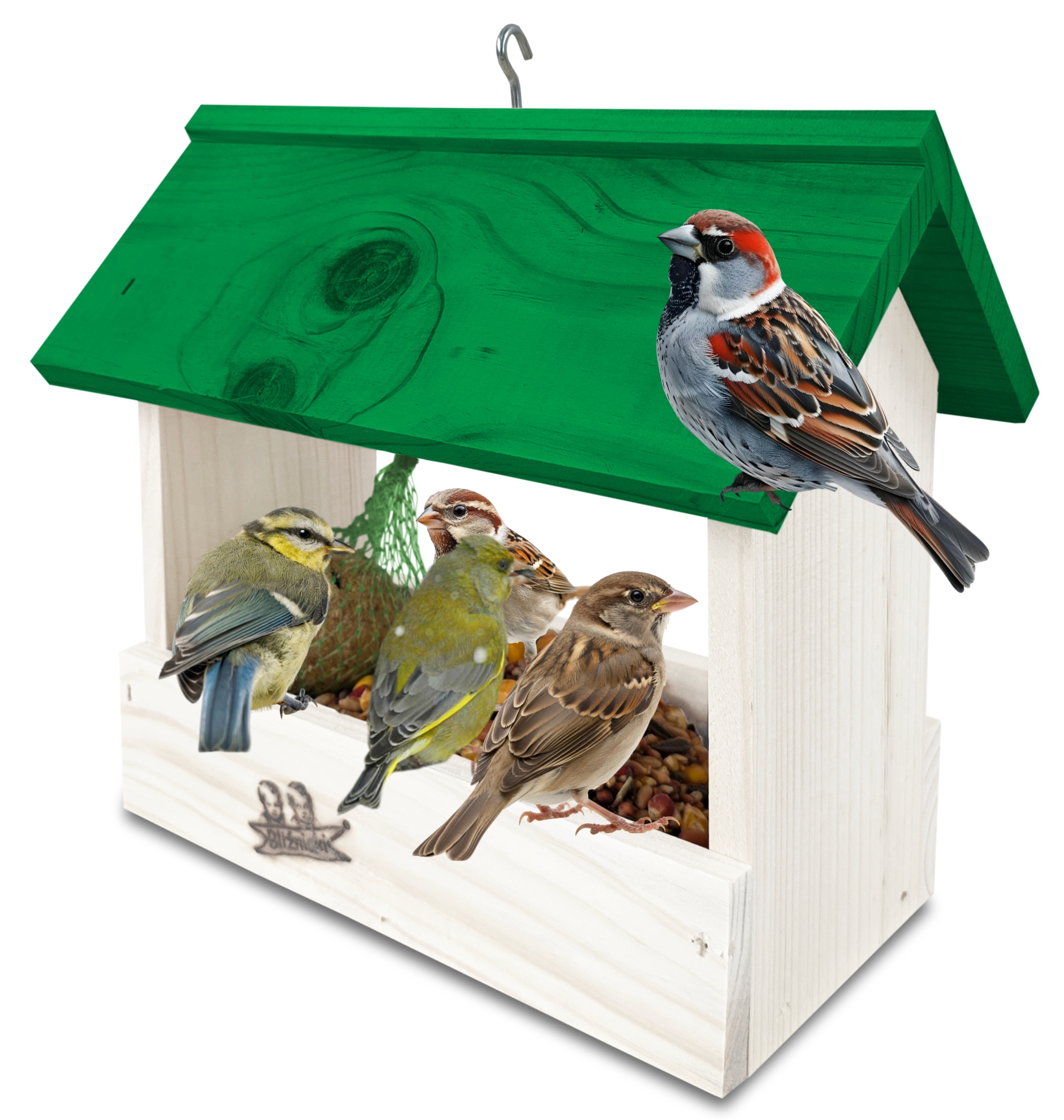 - U góry widoczny jest haczyk umożliwiający zawieszenie karmnika w dowolnym miejscu, możliwe jest również jego postawienie