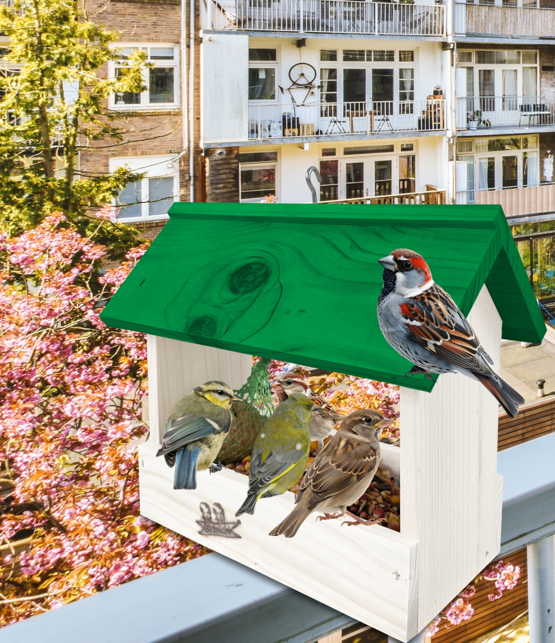 Przedmiotem sprzedaży jest ozdobny drewniany karmnik dla ptaków budka domek na balkon K204 BI K kolor biały z zielonym dachem