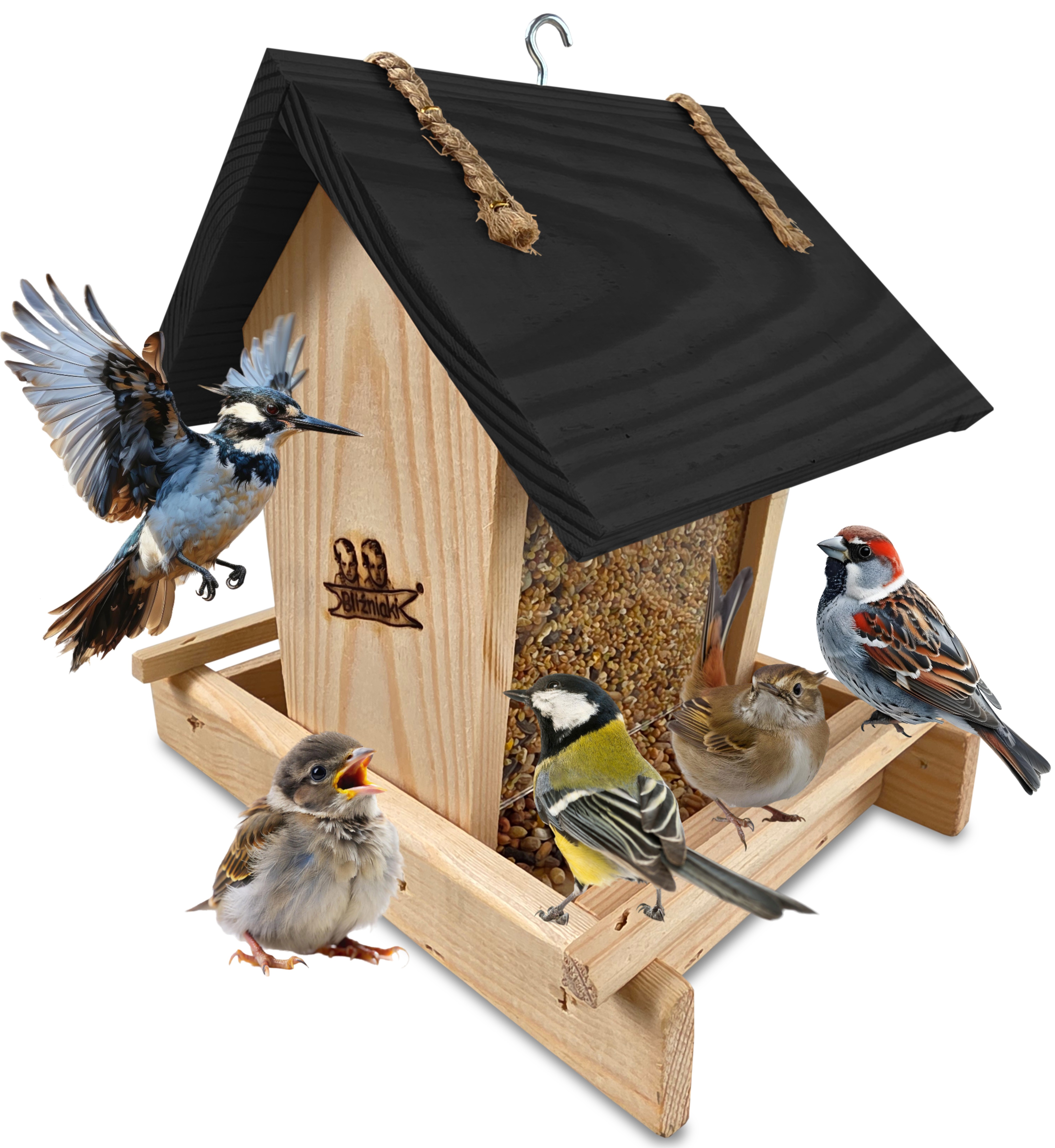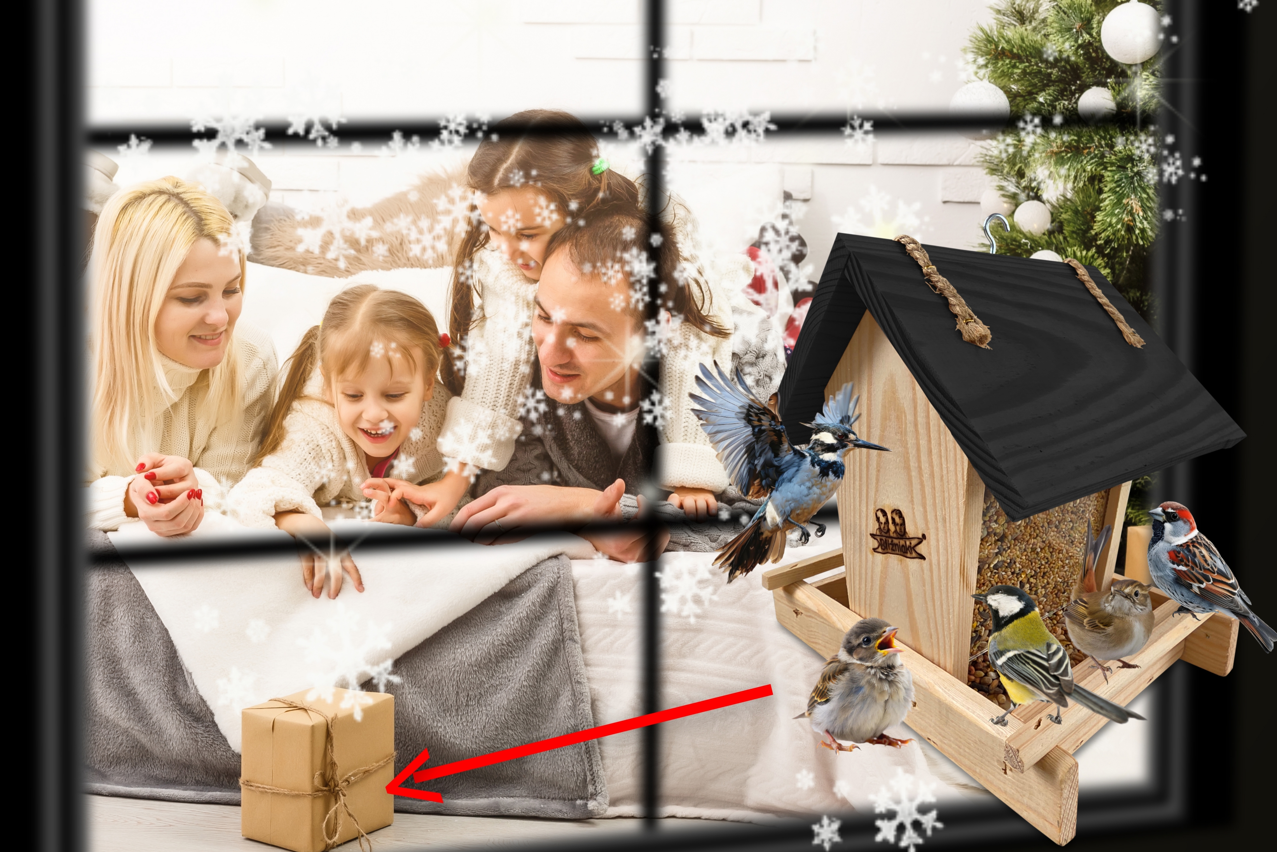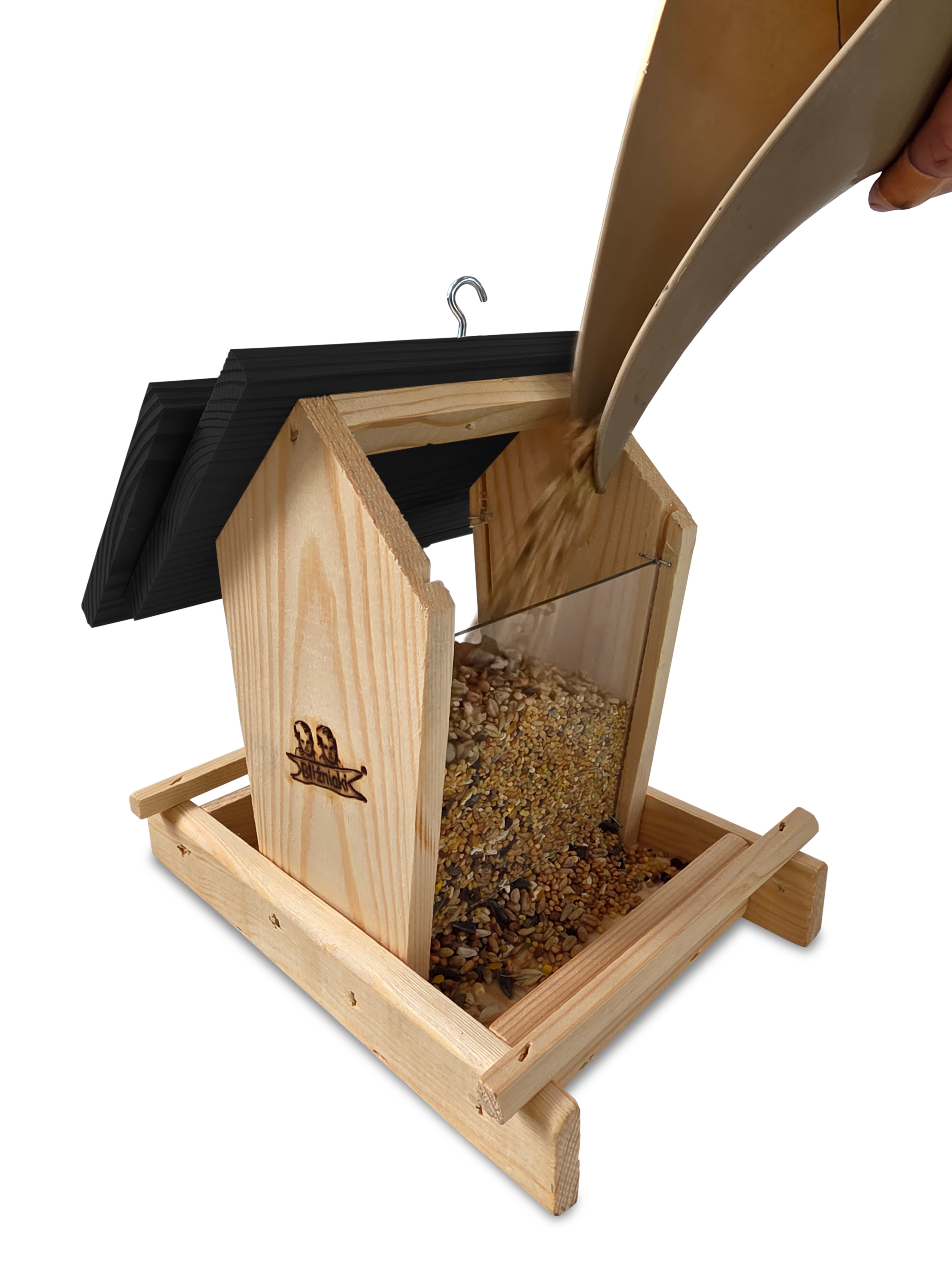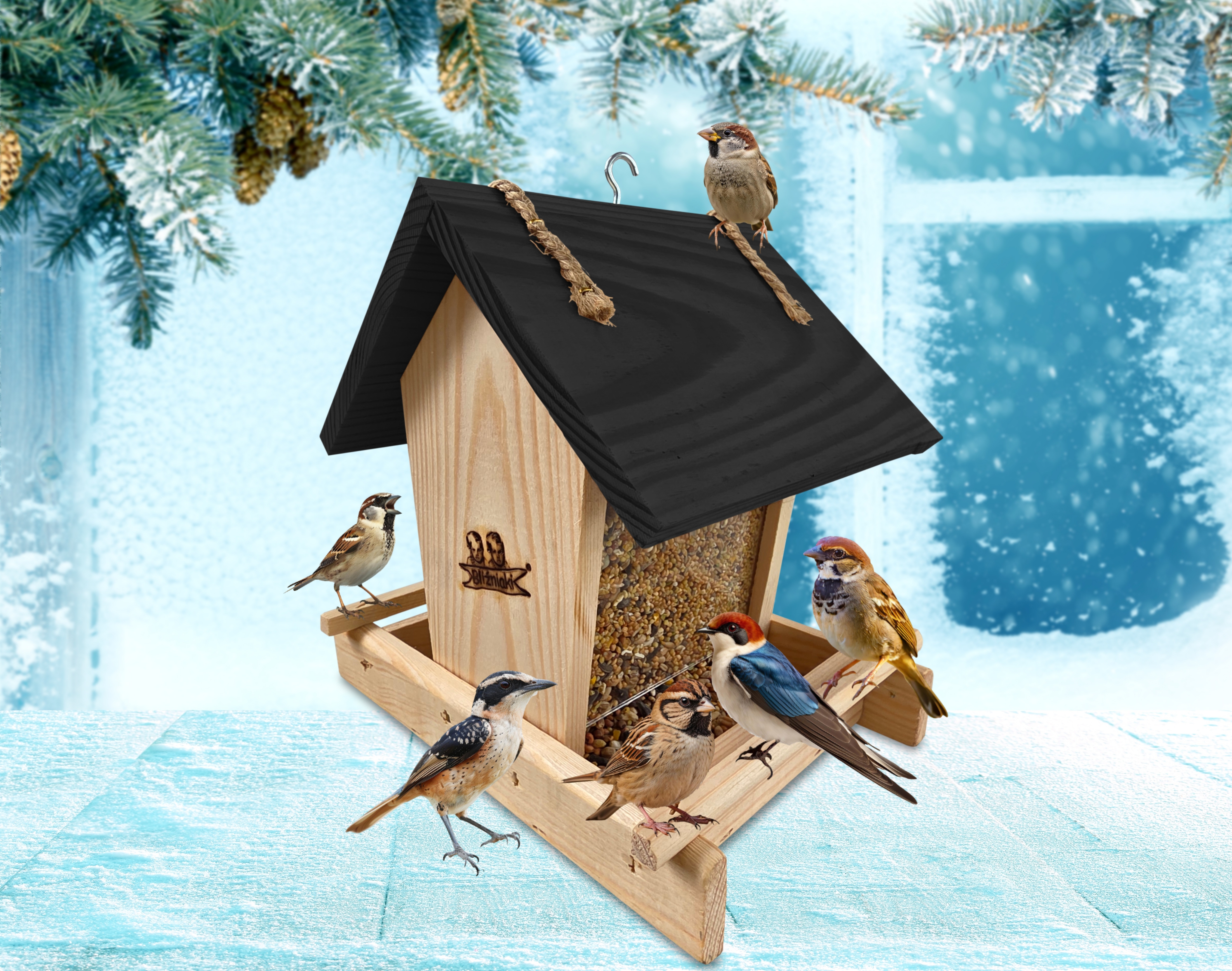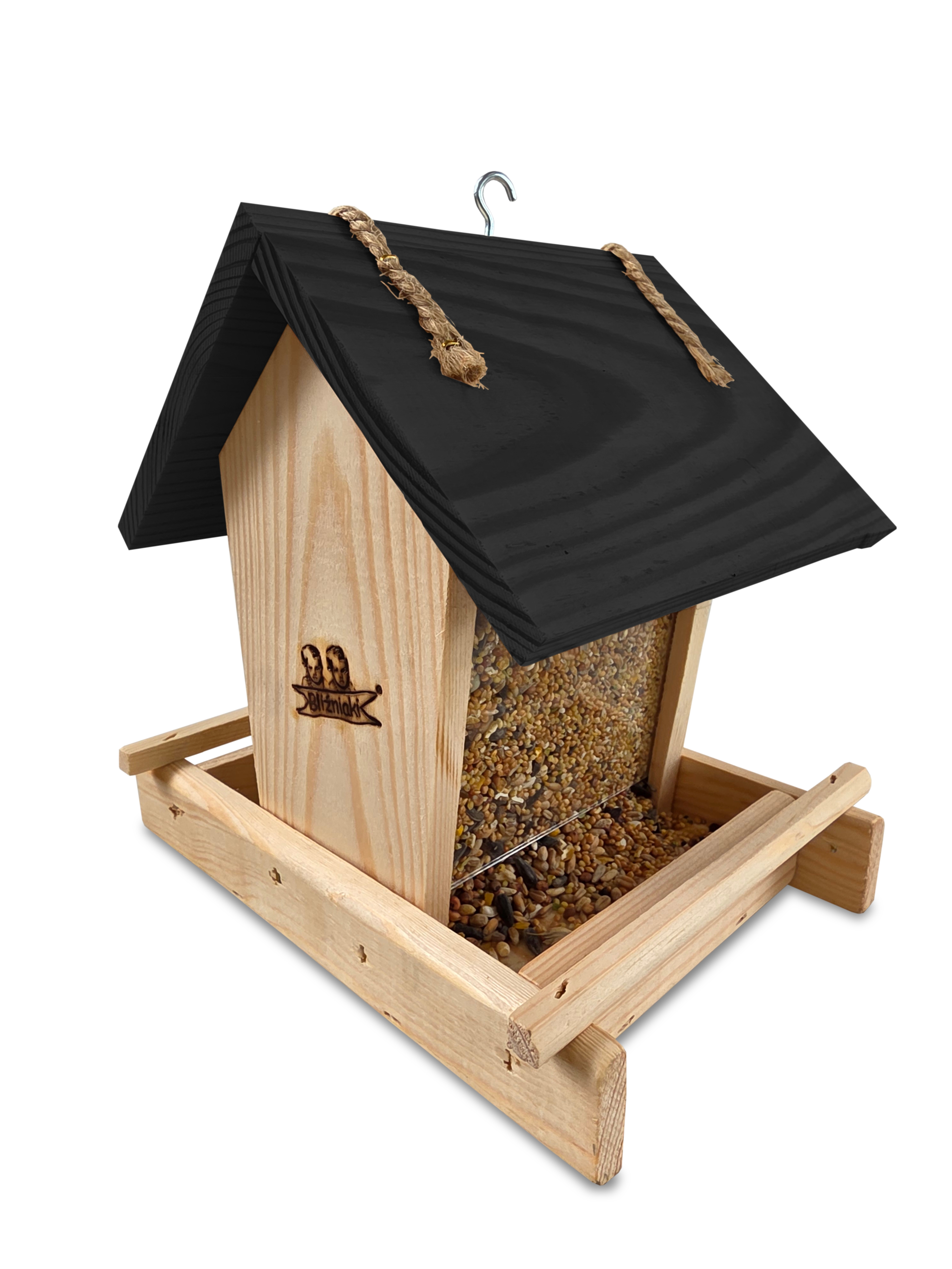 - Karmnik wykonany jest w całości z drewna iglastego, KOLOR NATURALNE DREWNO Z CZARNYM DACHEM