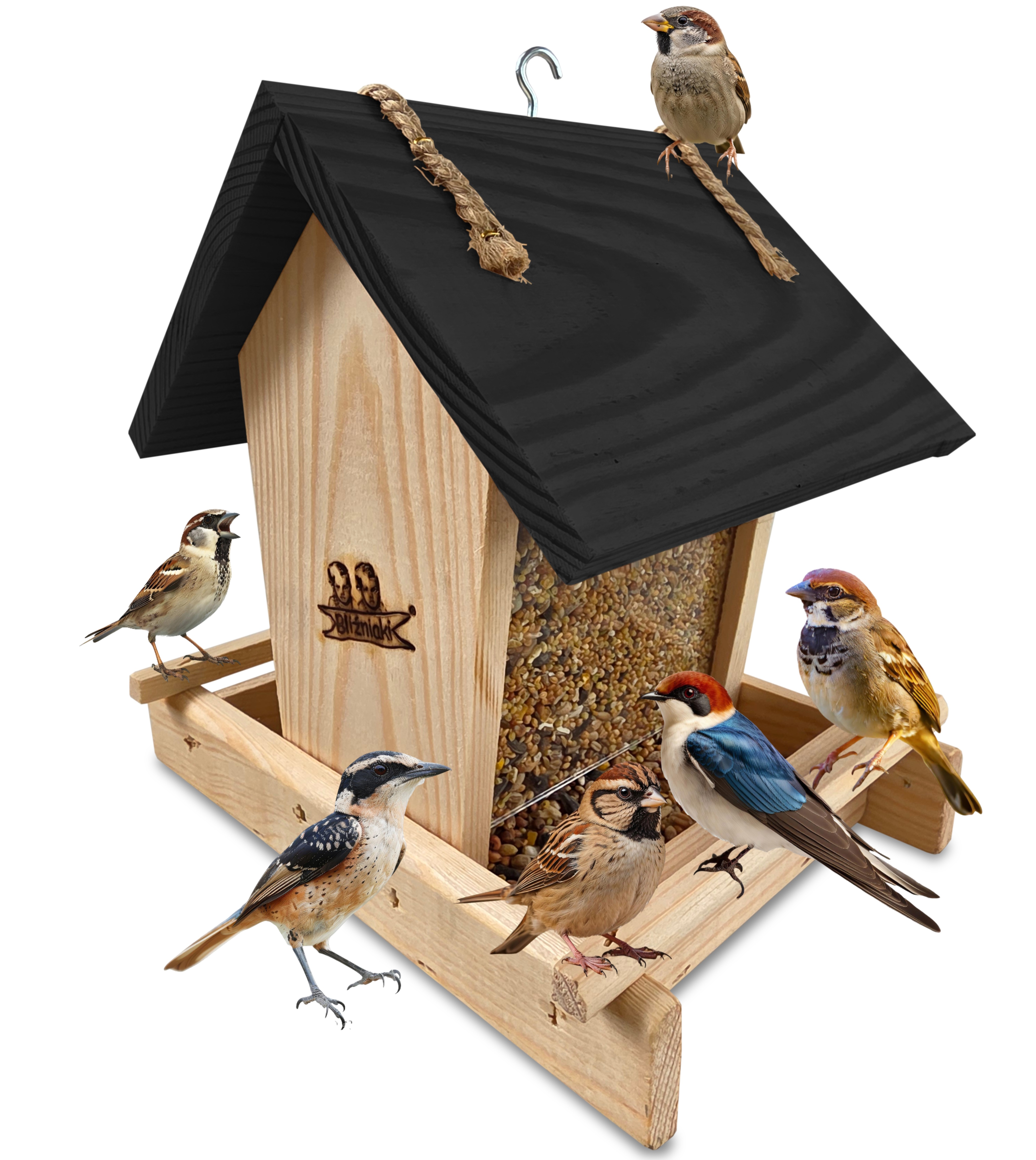 Przedmiotem sprzedaży jest ozdobny drewniany karmnik dla ptaków z dozownikiem ziarna model K29 N CZ w kolorze naturalnego drewna z czarnym dachem