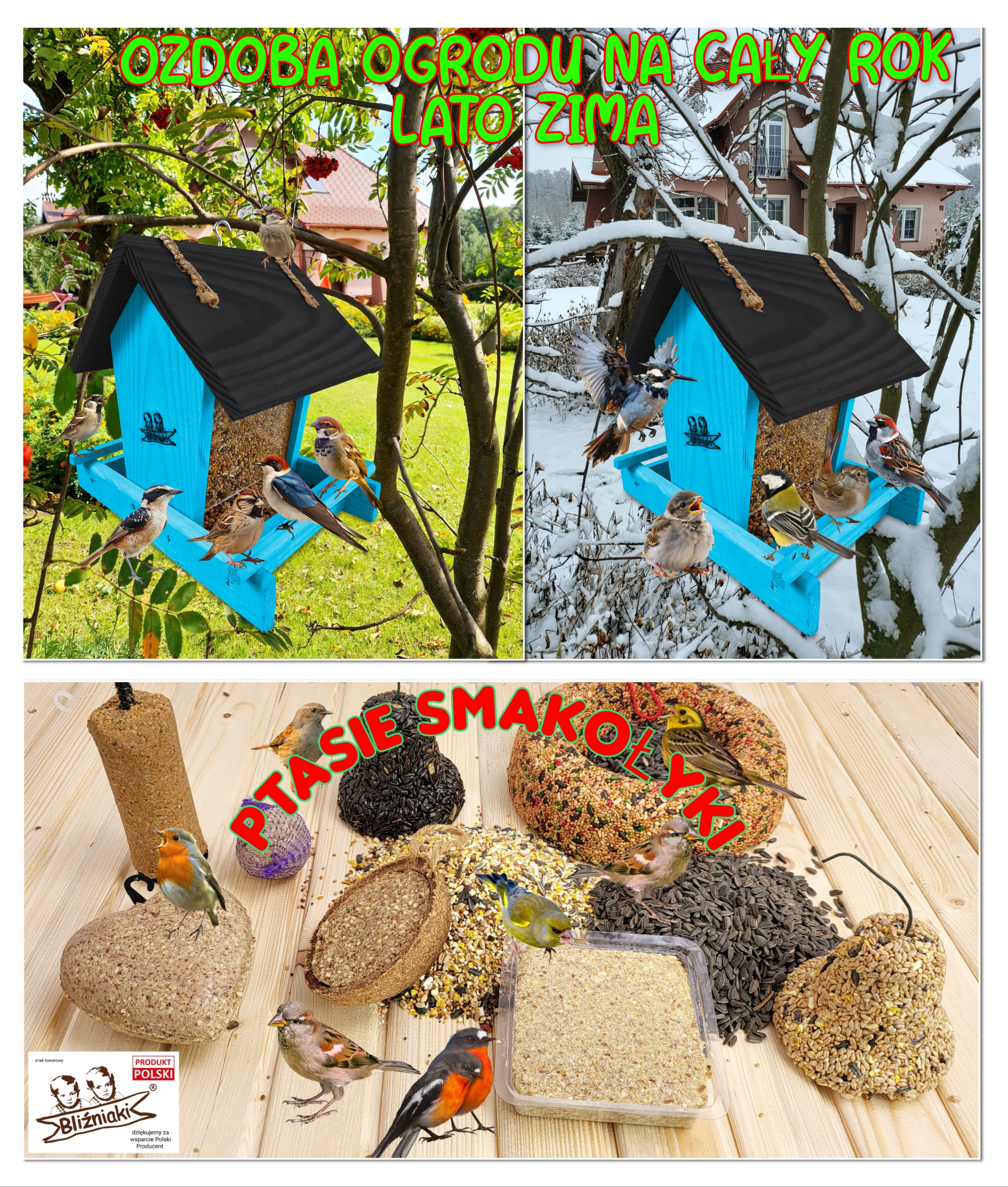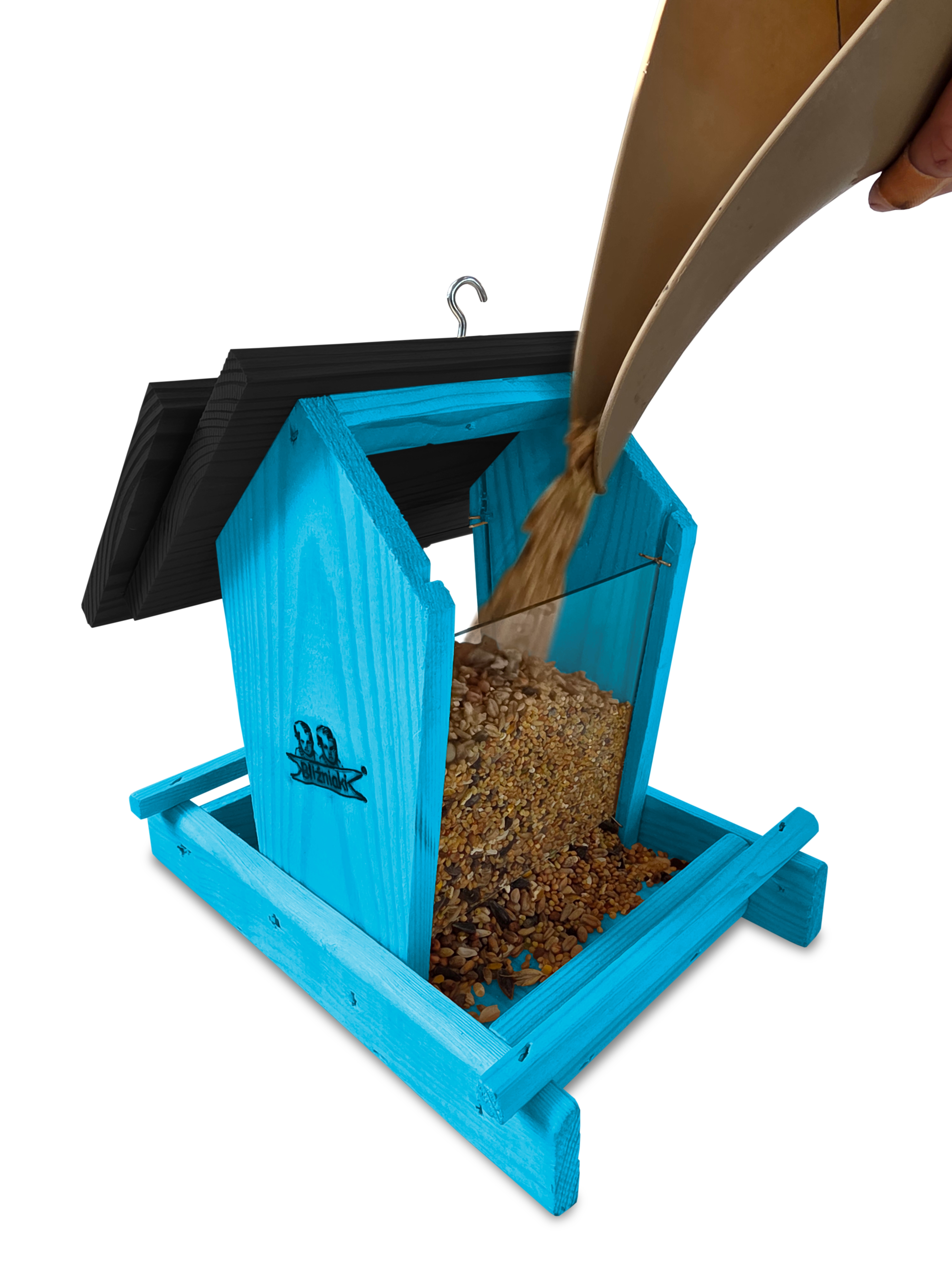 Karmnik drewniany niebieski dla ptaków do ogrodu dozownik z szybką sikorki dzwońce K29 NBP CZ