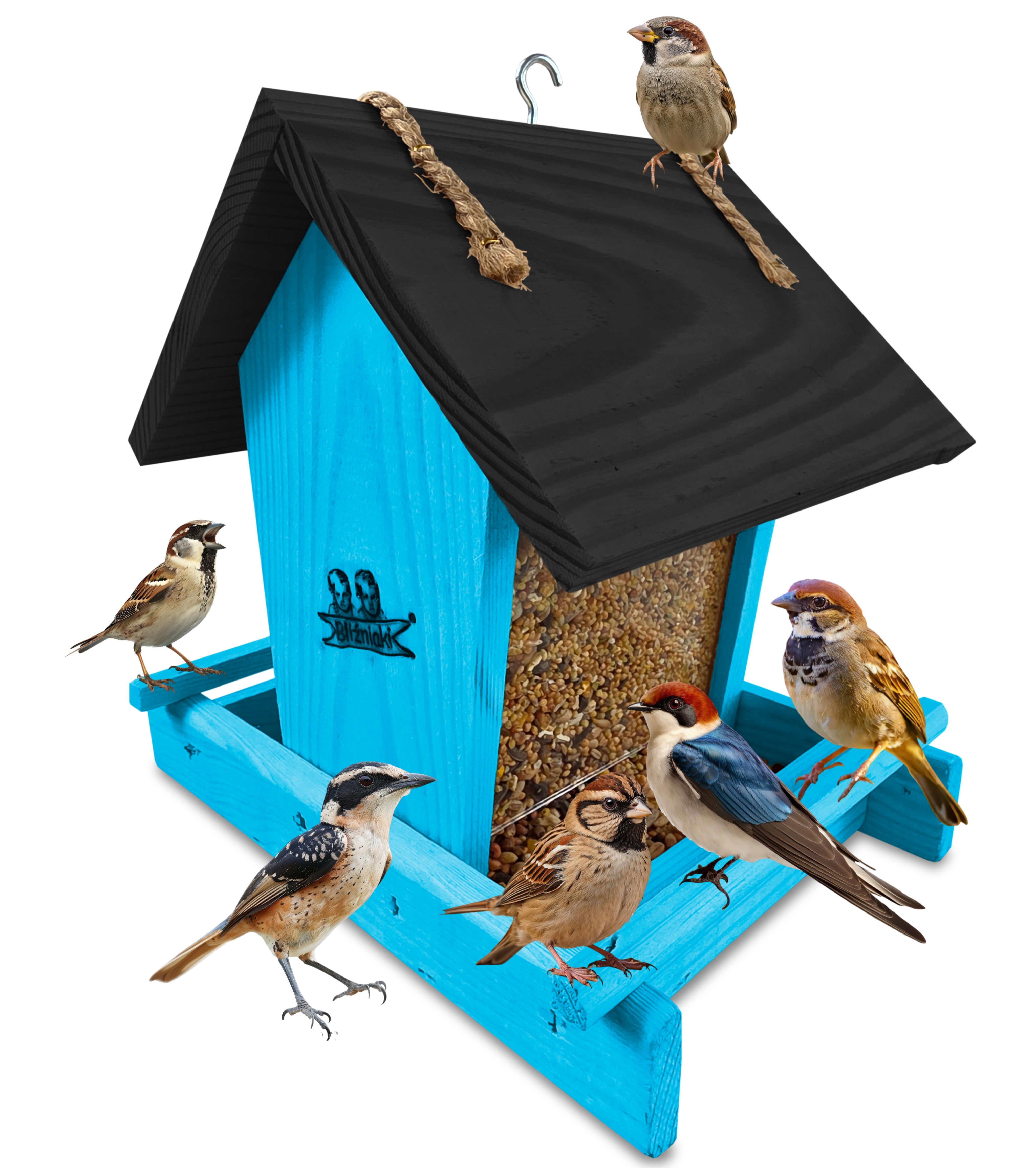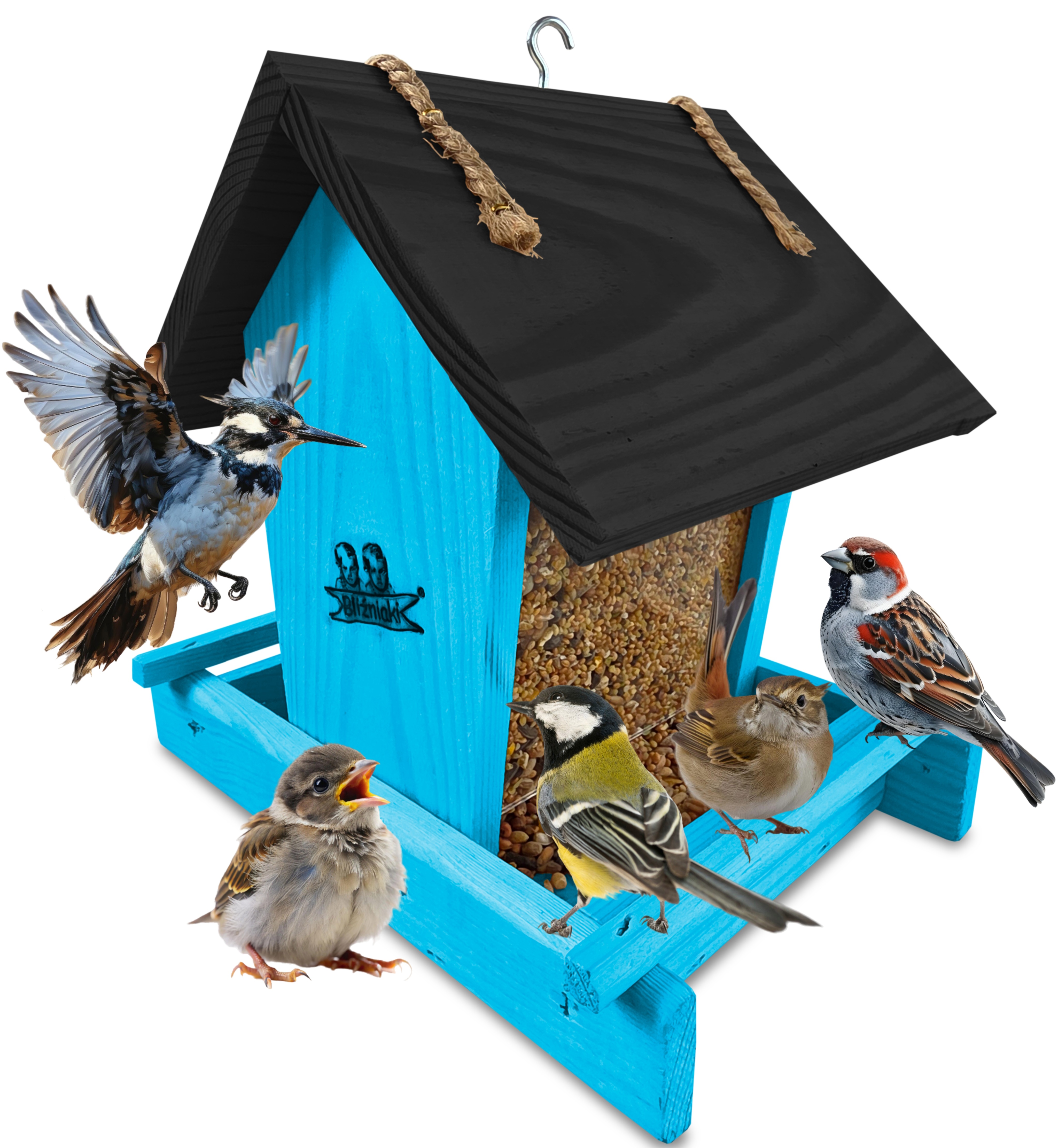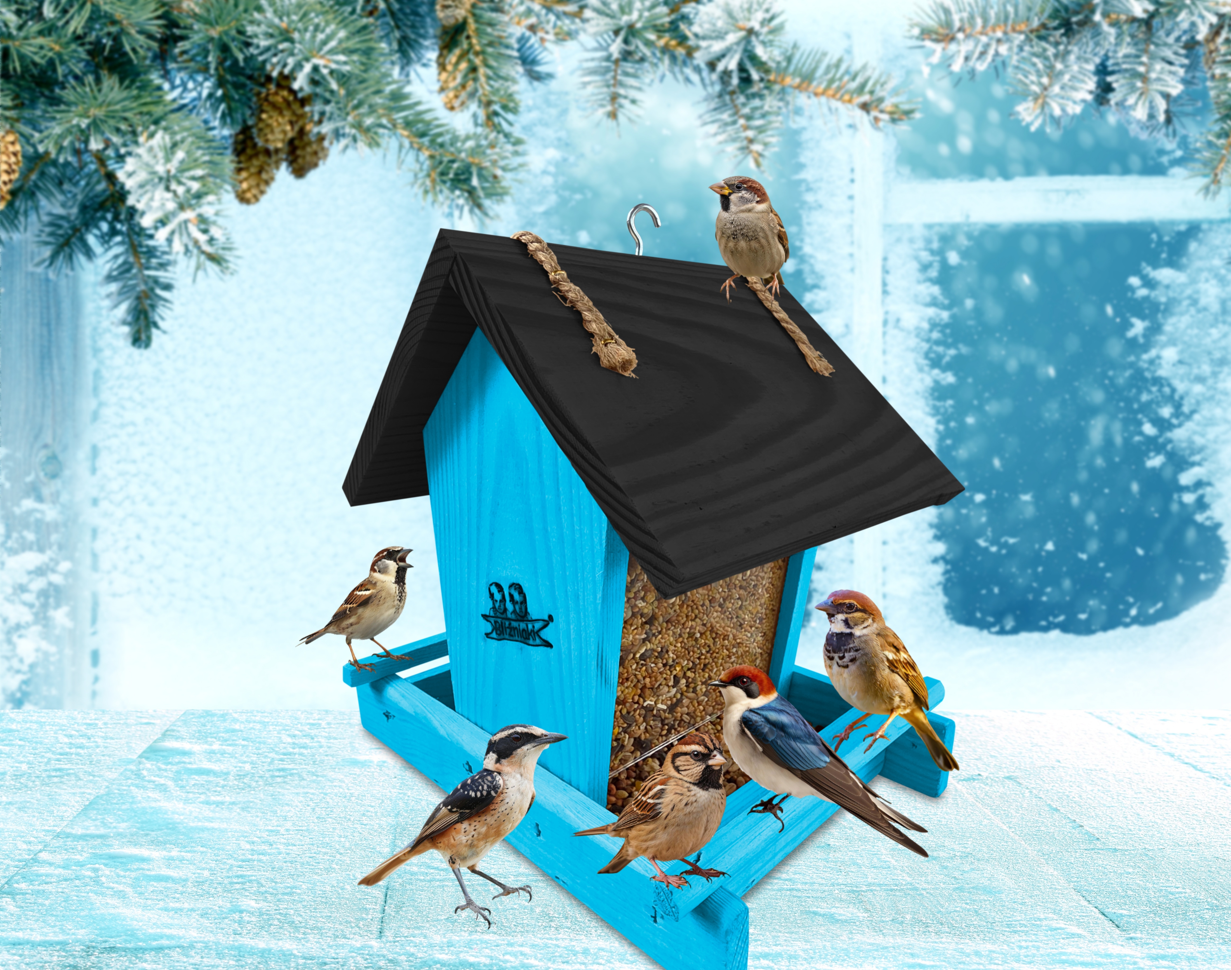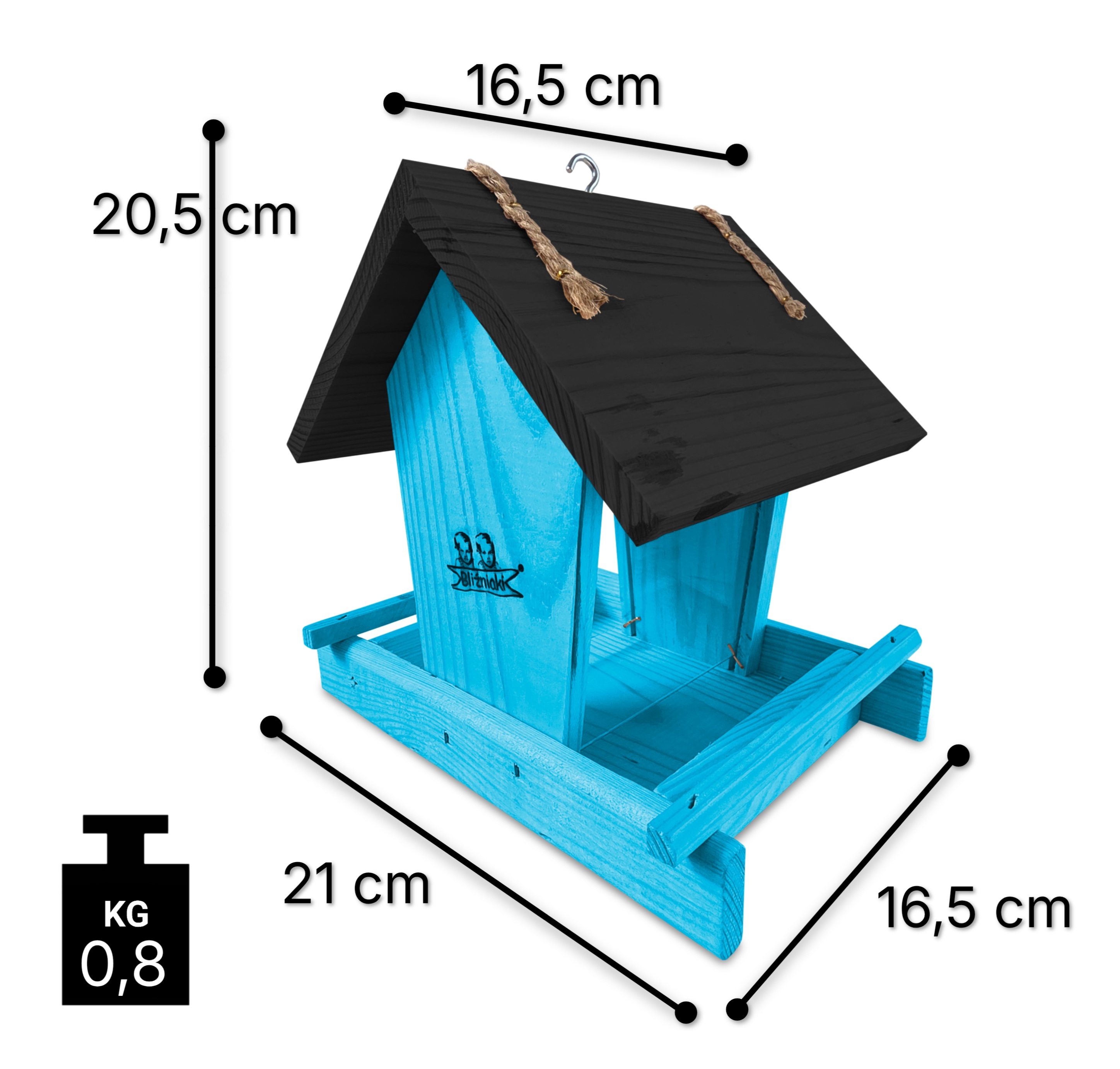 - Karmnik wykonany jest w całości z drewna iglastego, KOLOR JASNONIEBIESKI Z CZARNYM DACHEM
