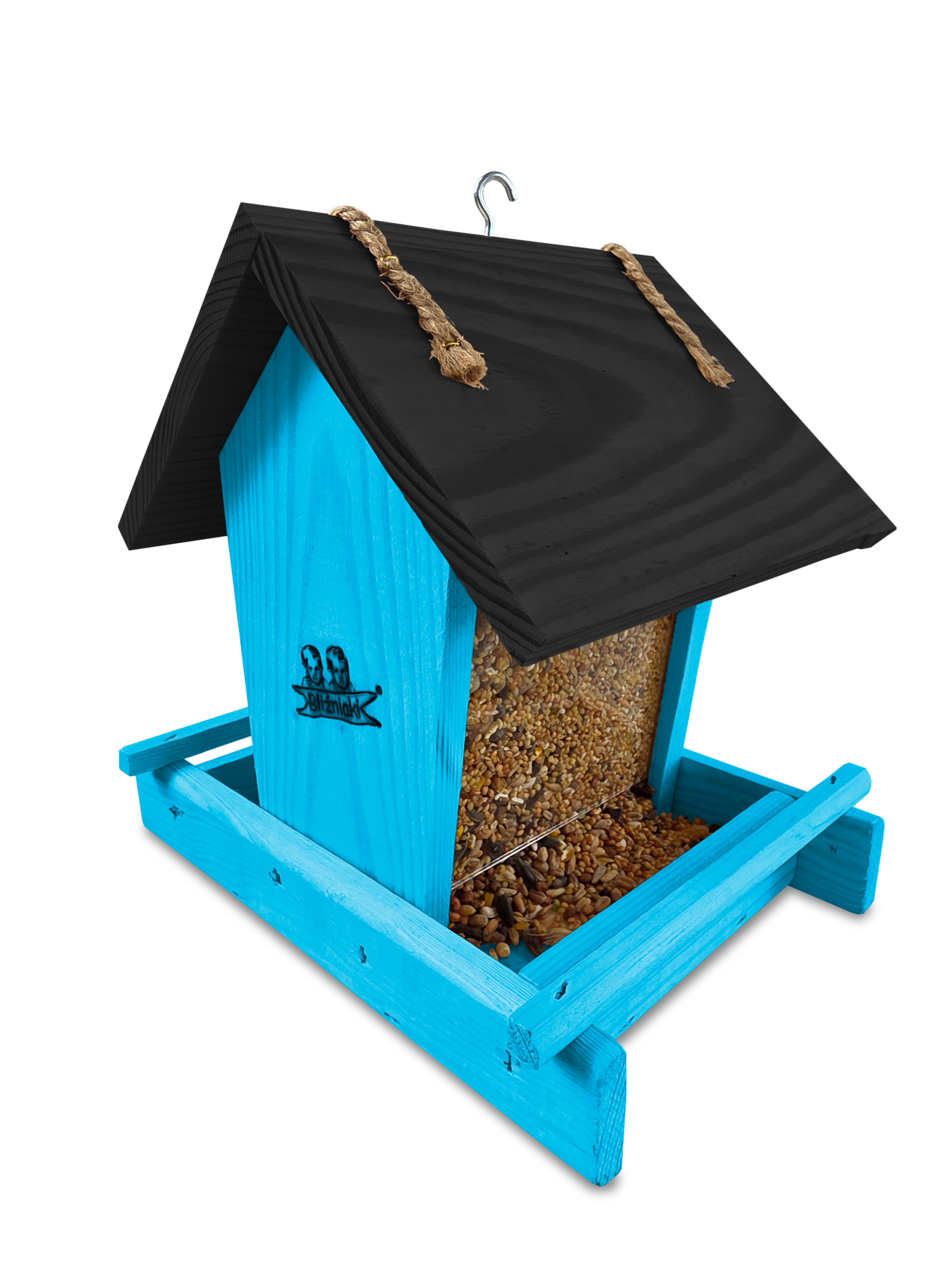 Przedmiotem sprzedaży jest ozdobny drewniany karmnik dla ptaków z dozownikiem ziarna model K29 NBP CZ w jasnoniebieskim kolorze z czarnym dachem