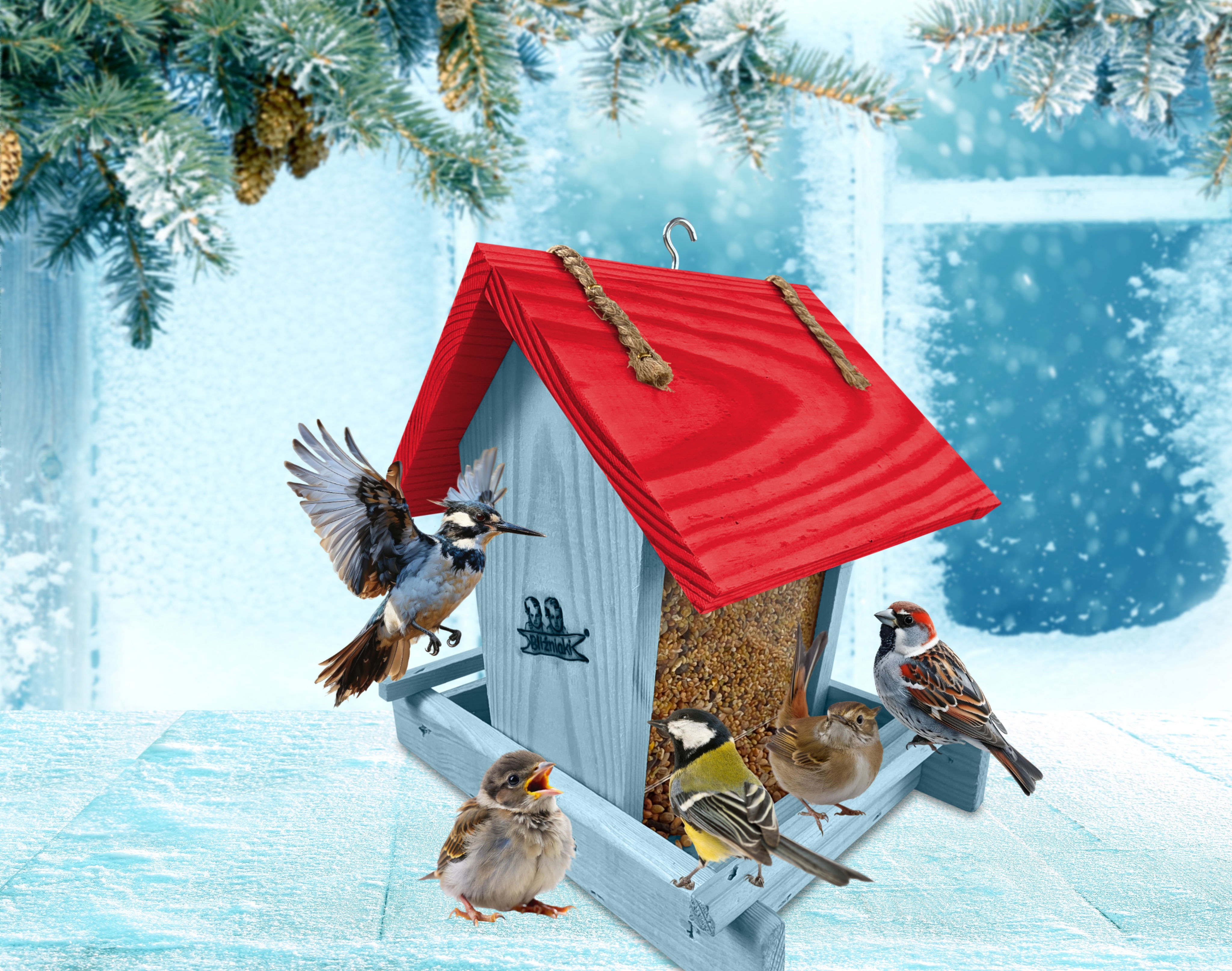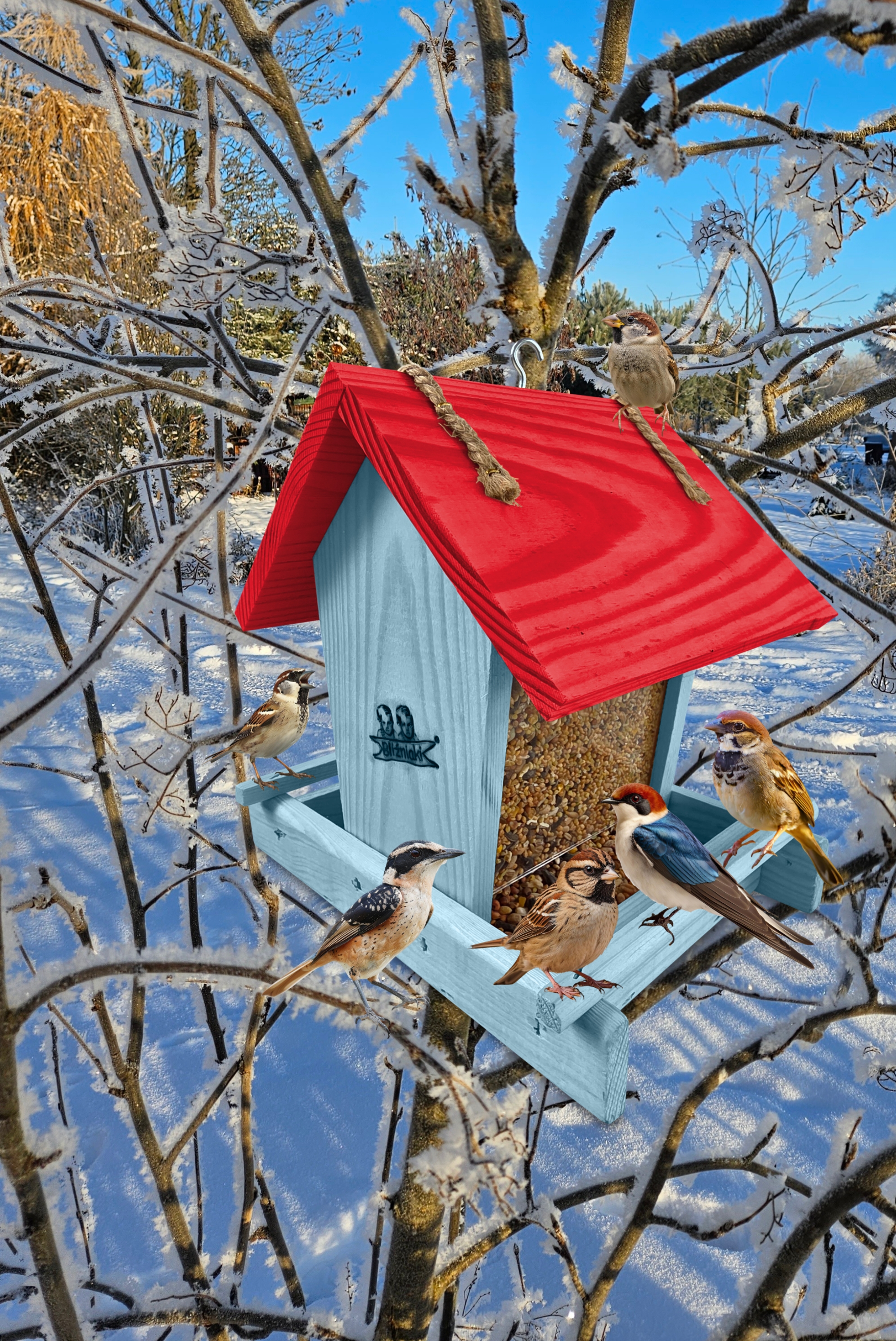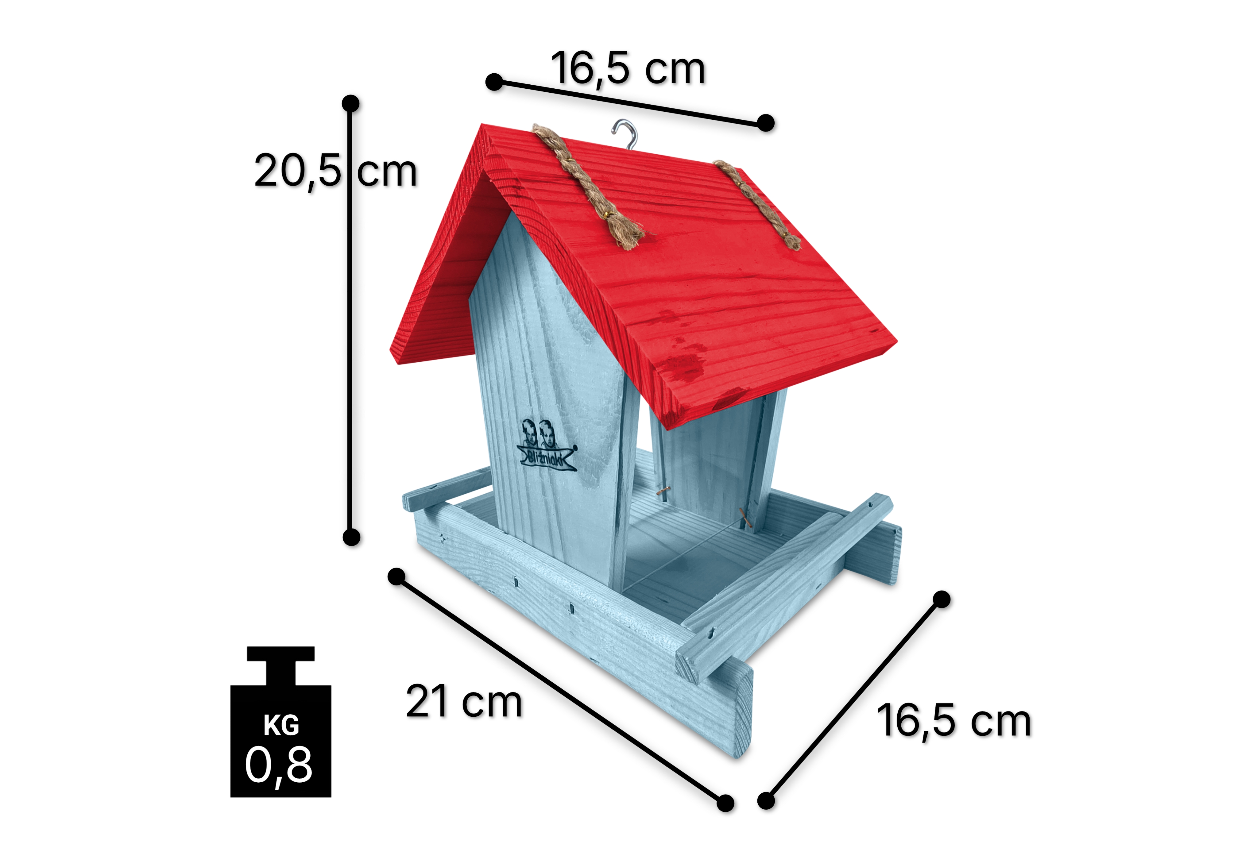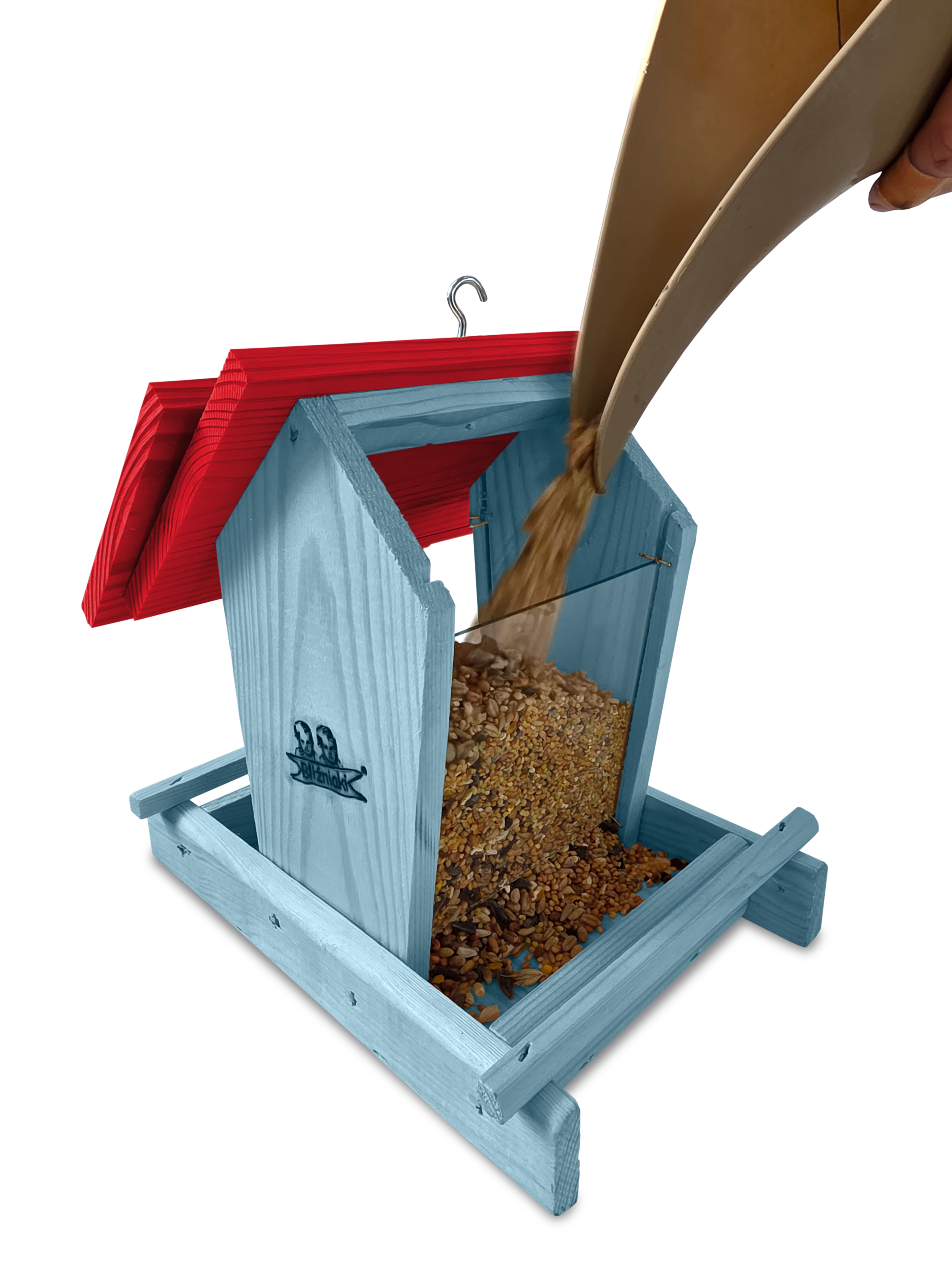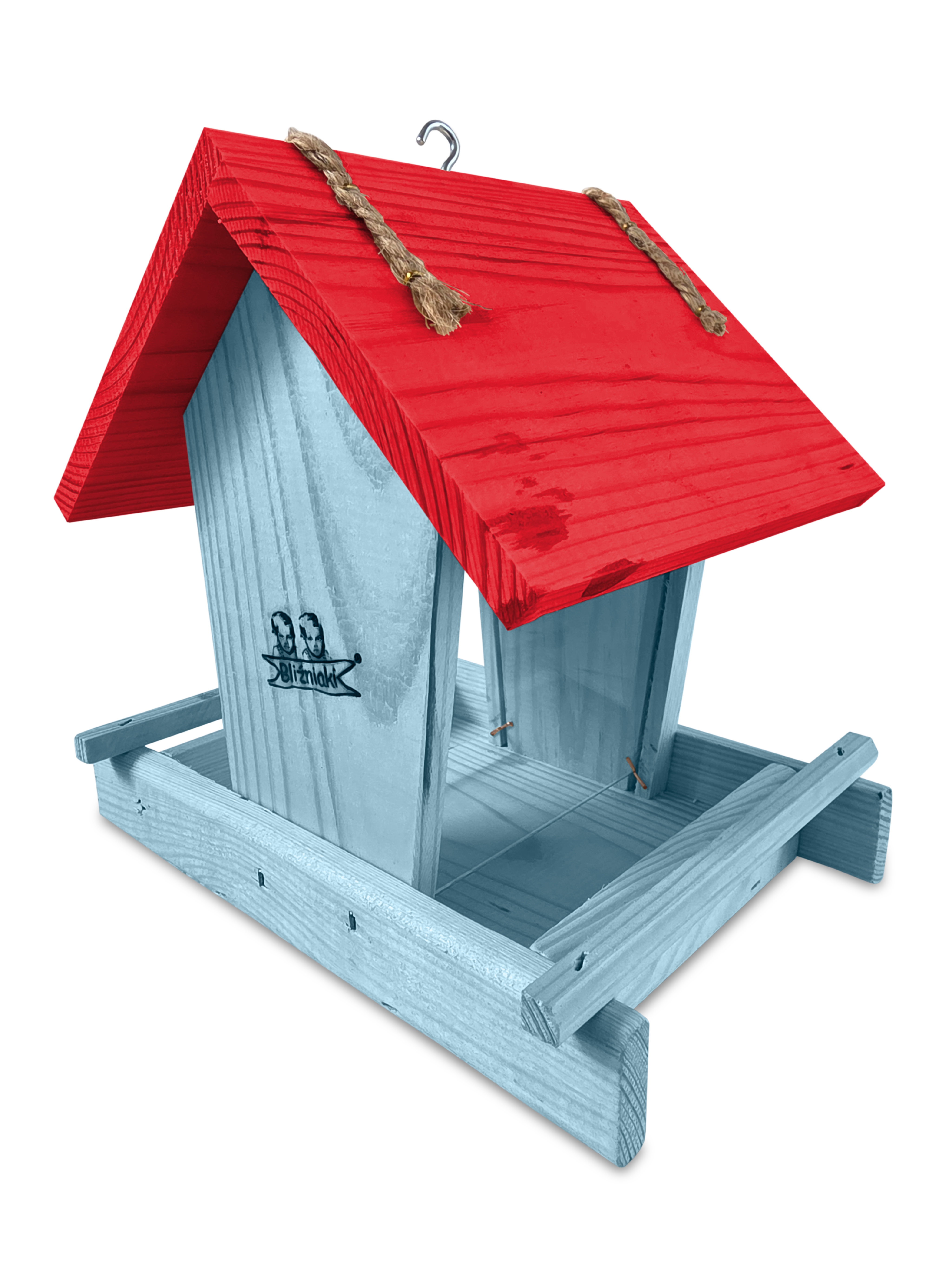 - Karmnik wykonany jest w całości z drewna iglastego, KOLOR PASTELOWY NIEBIESKI Z CZERWONYM DACHEM