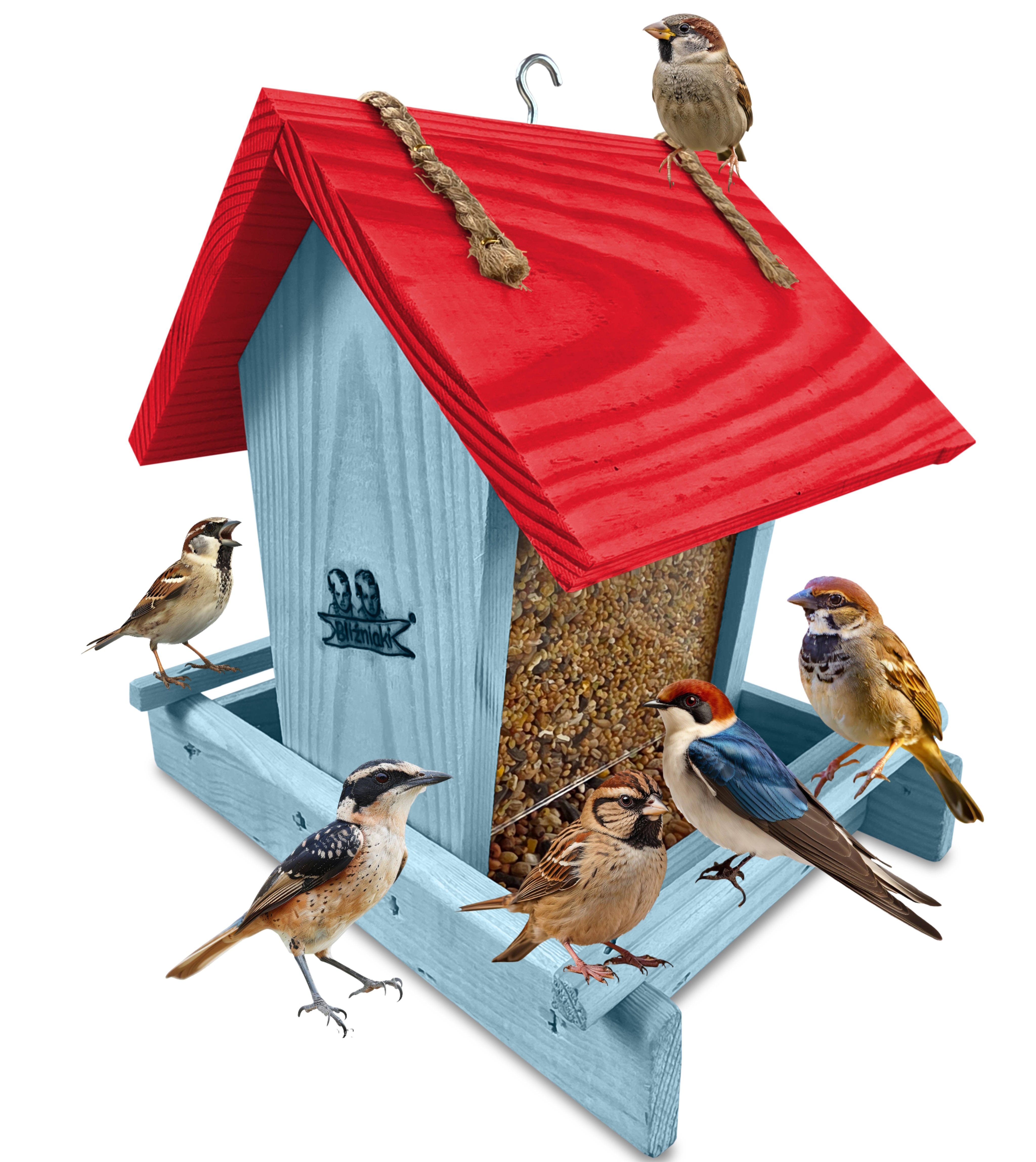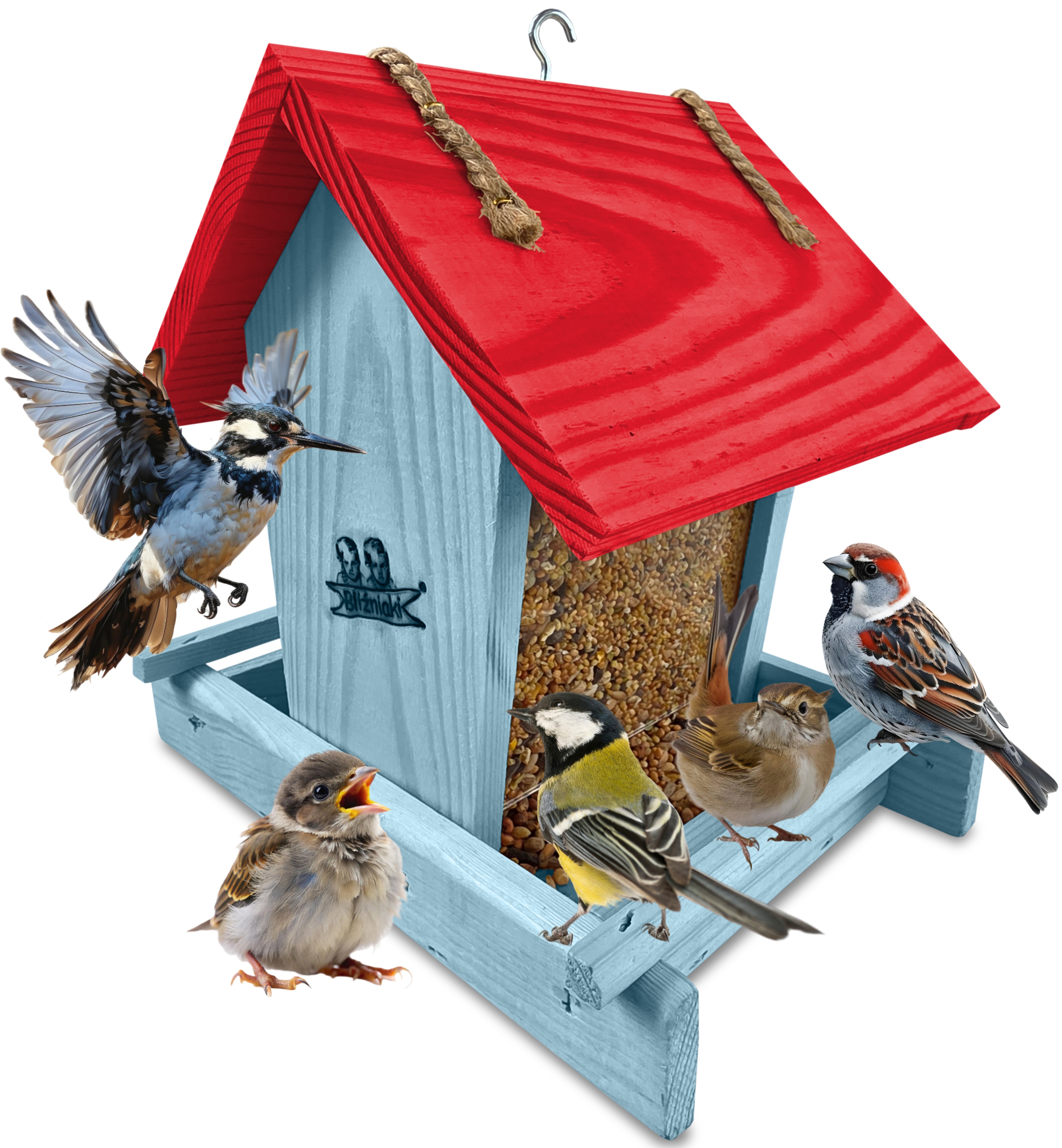 Przedmiotem sprzedaży jest ozdobny drewniany karmnik dla ptaków z dozownikiem ziarna model K29 NBPP CB kolor pastelowy niebieski z czerwonym dachem