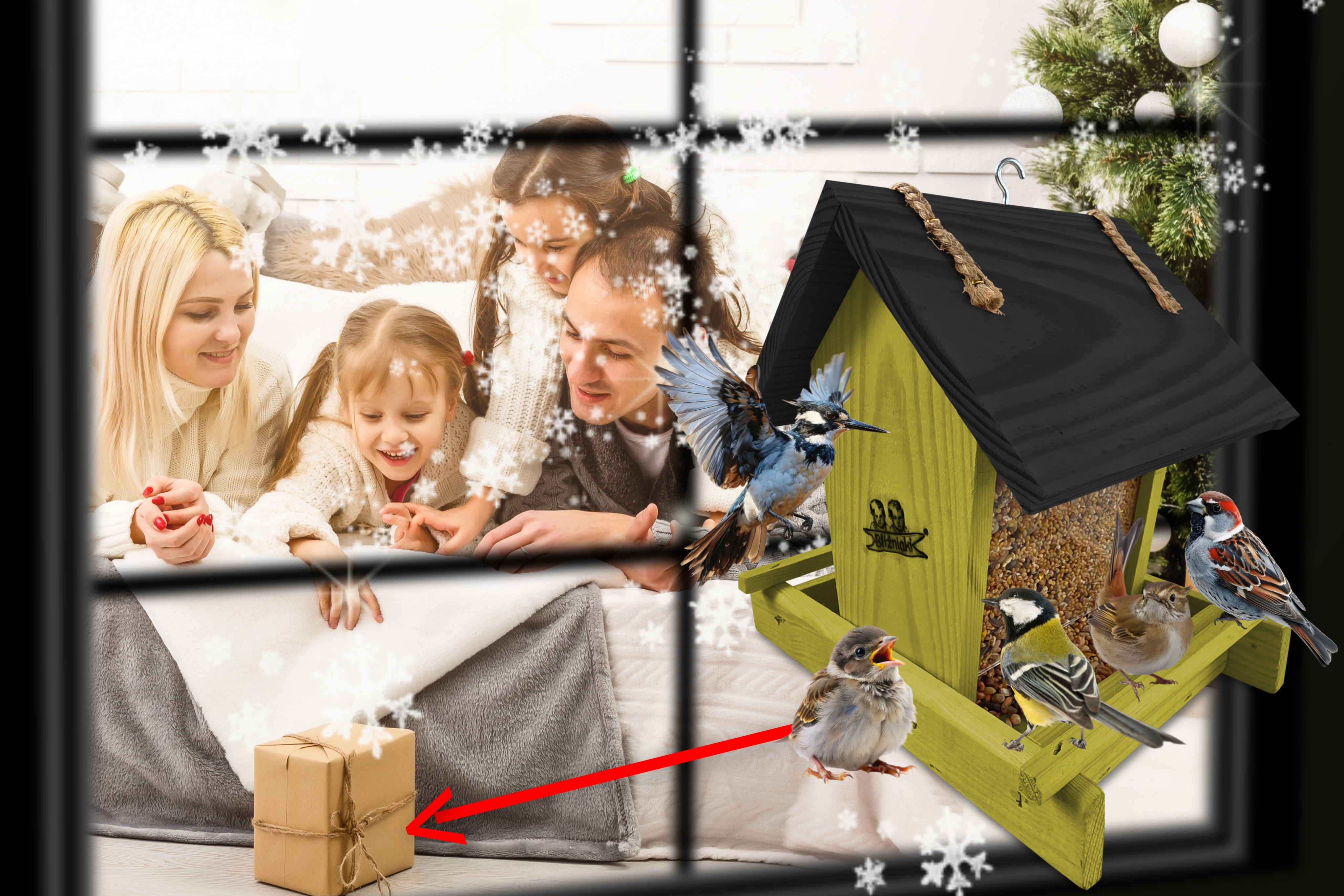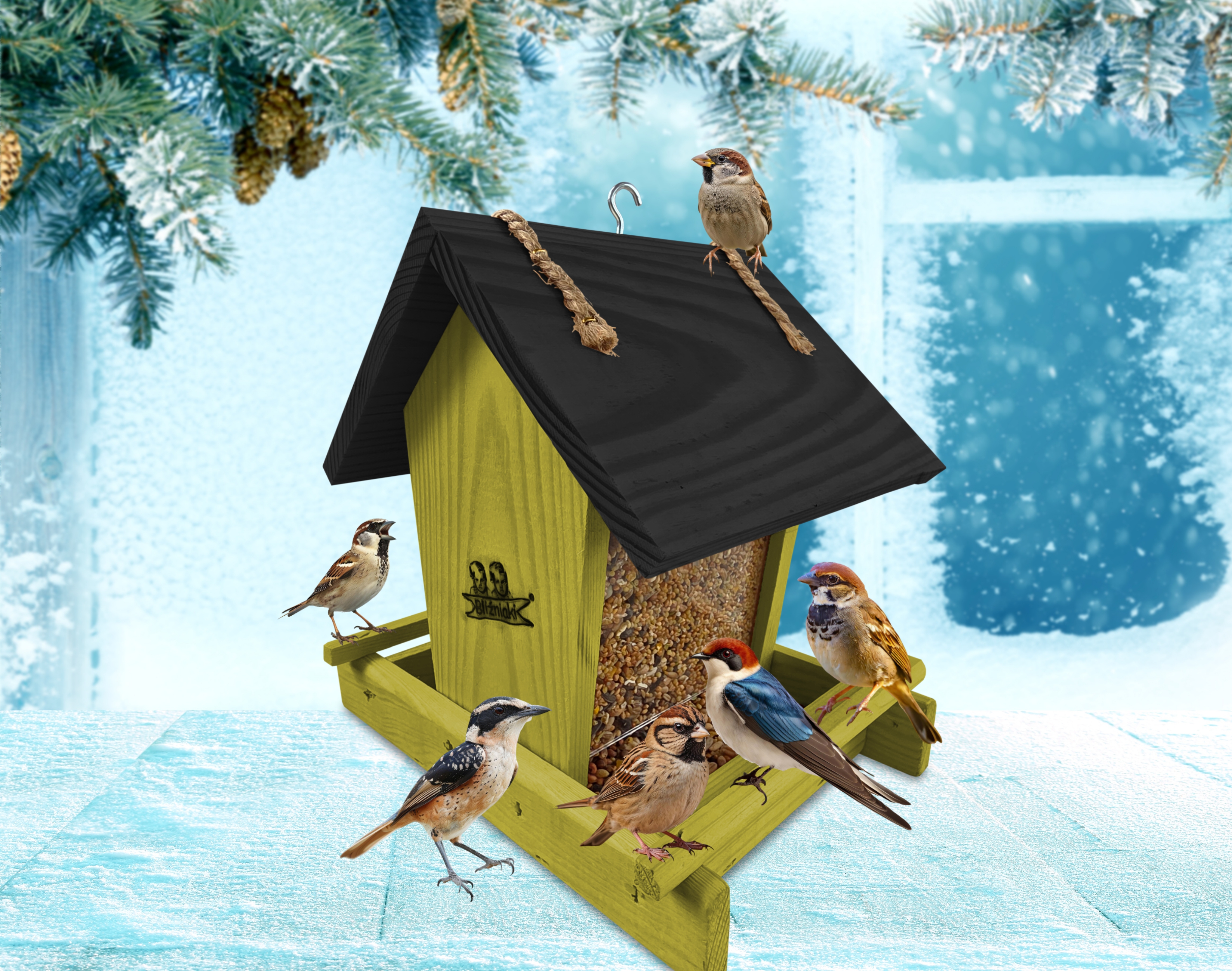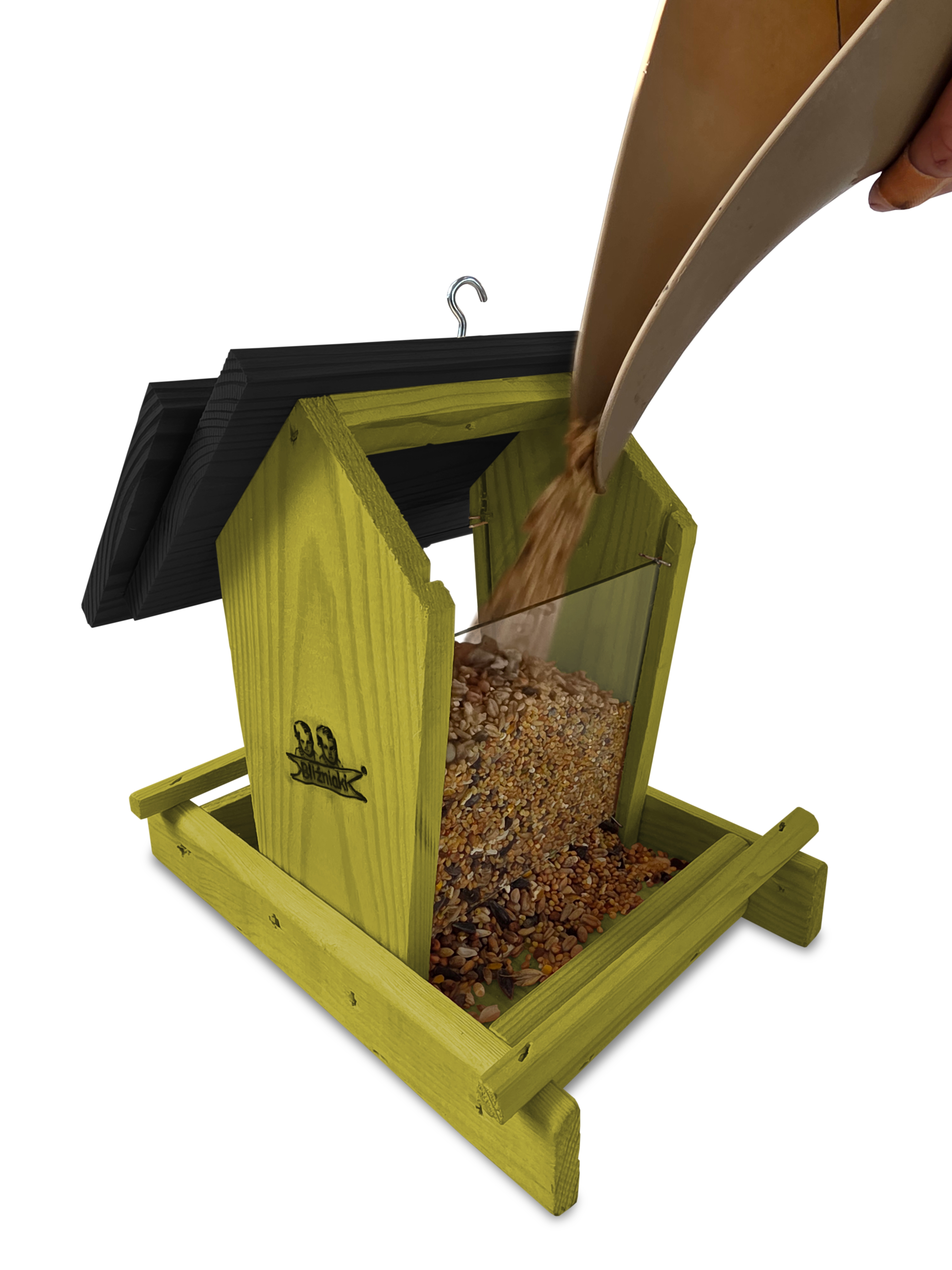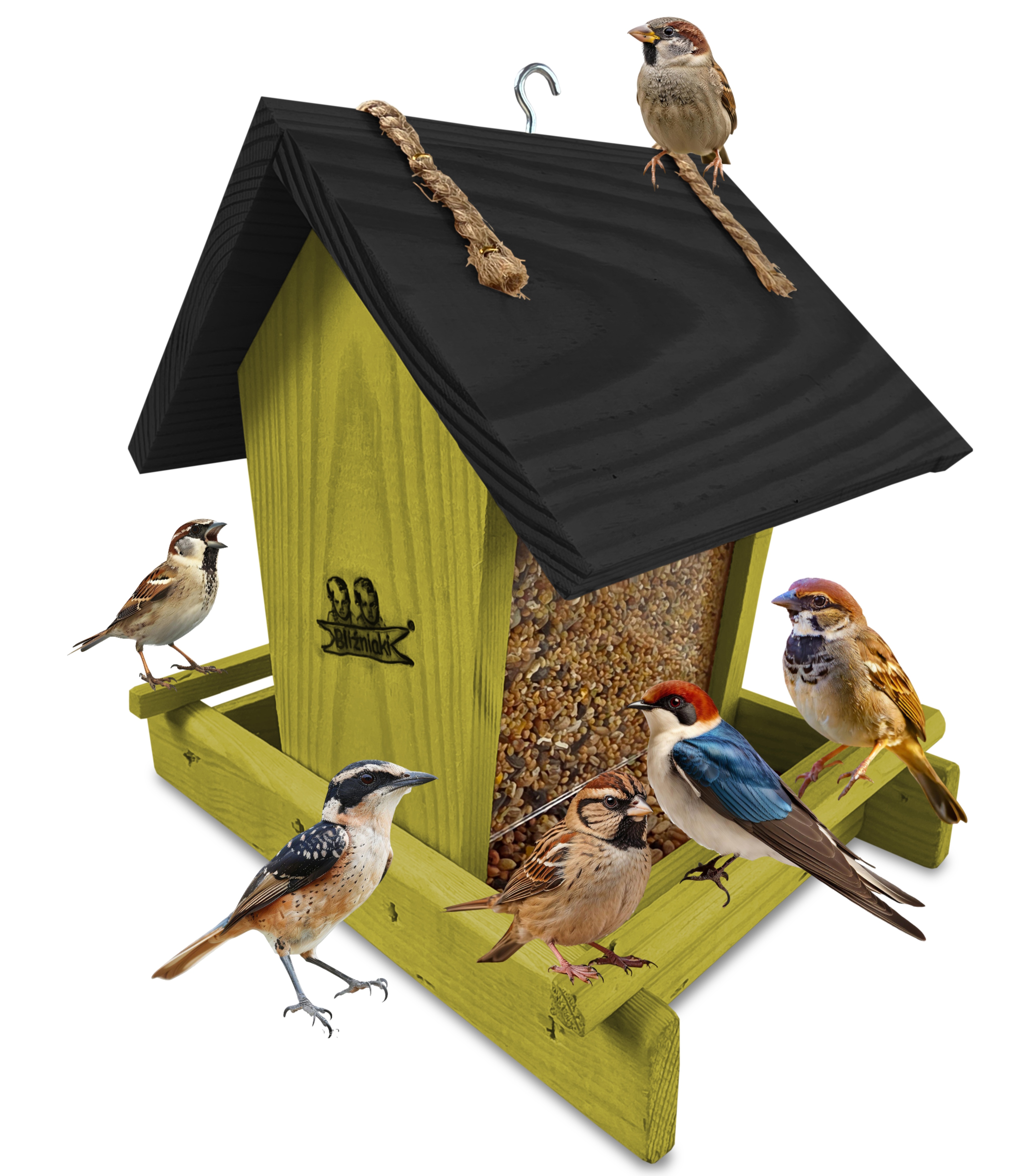 - Karmnik wykonany jest w całości z drewna iglastego, KOLOR OLIWKOWY Z CZARNYM DACHEM