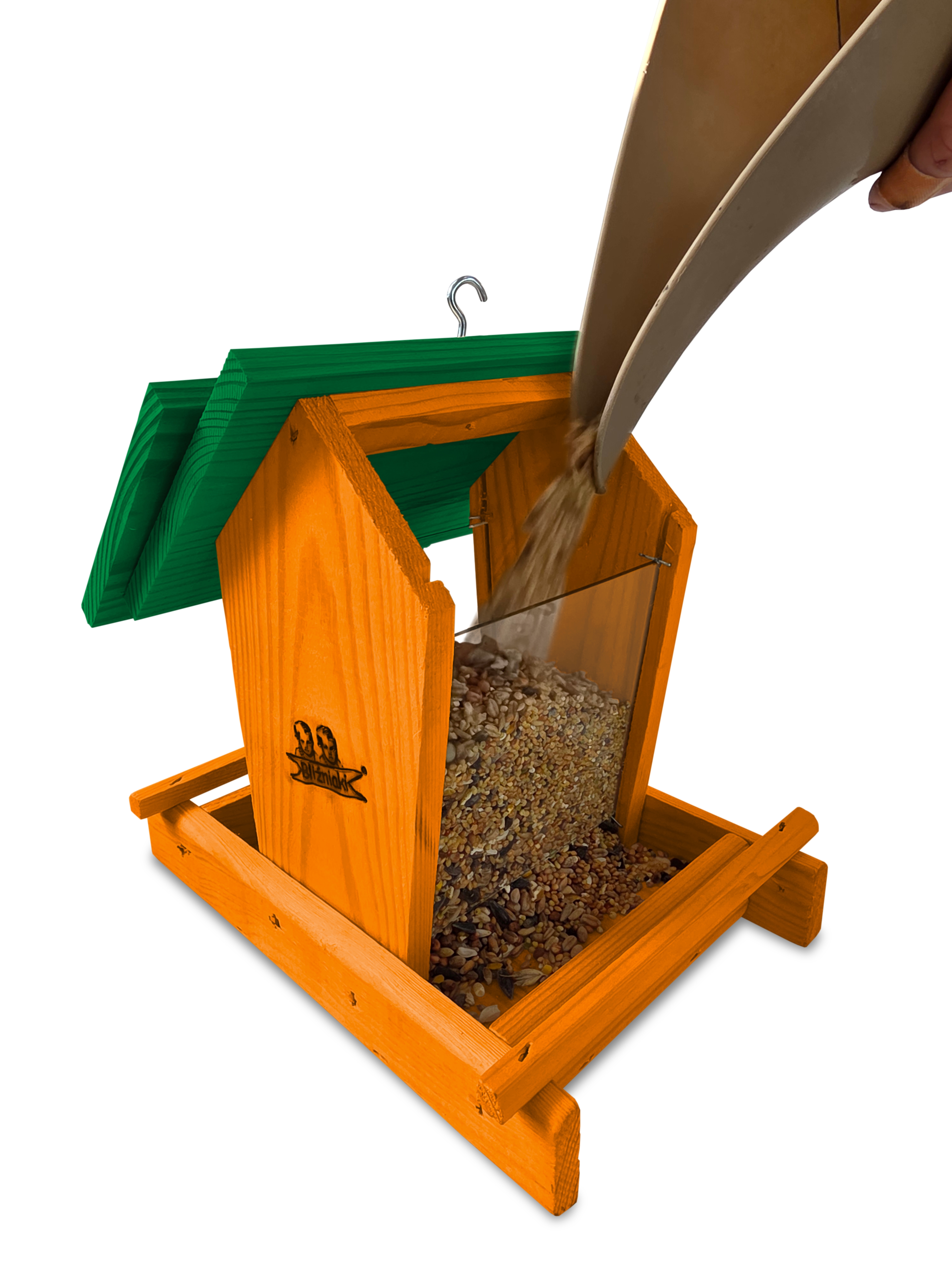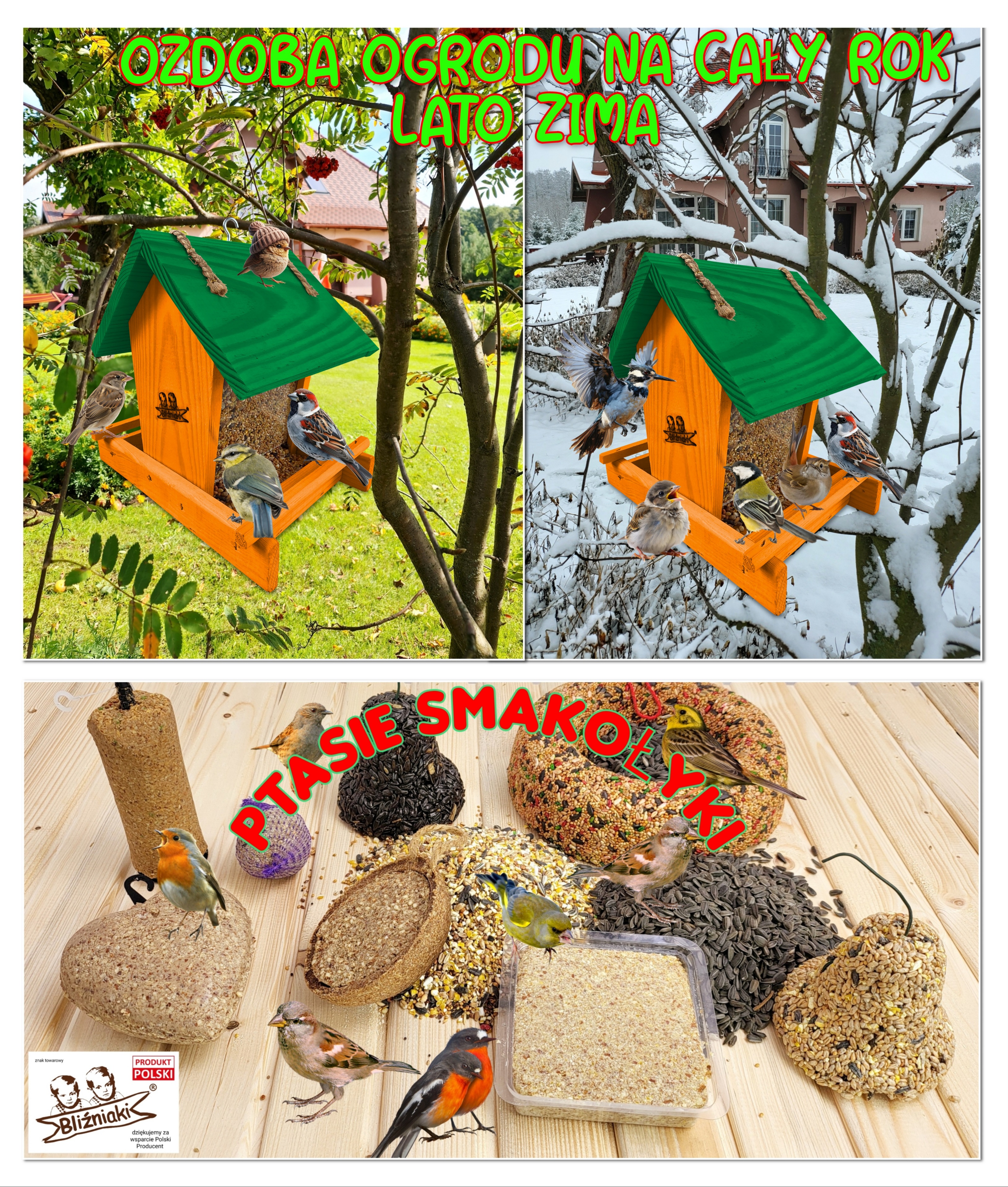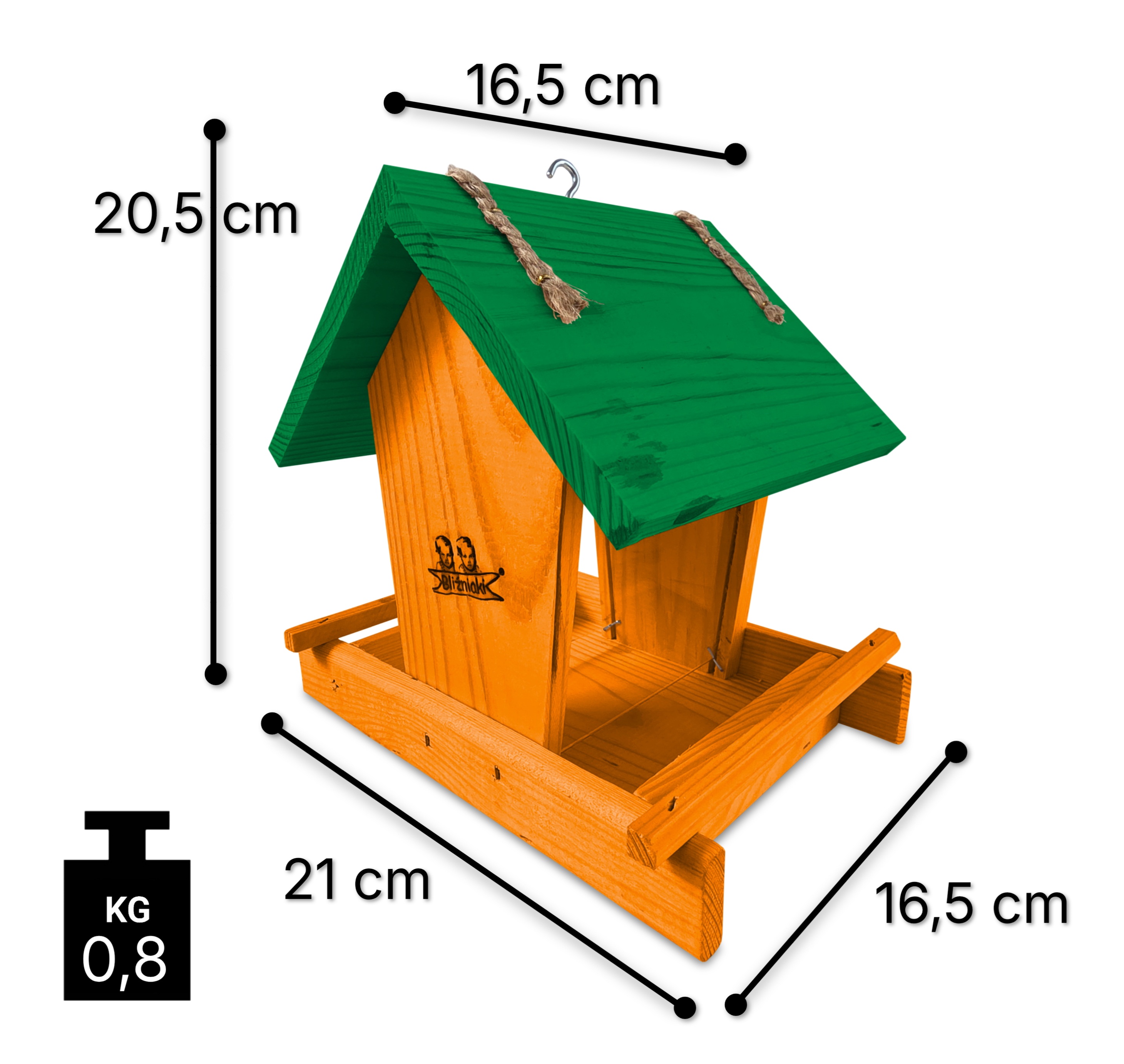 - Karmnik wykonany jest w całości z drewna iglastego, KOLOR POMARAŃCZOWY Z CIEMNOZIELONYM DACHEM