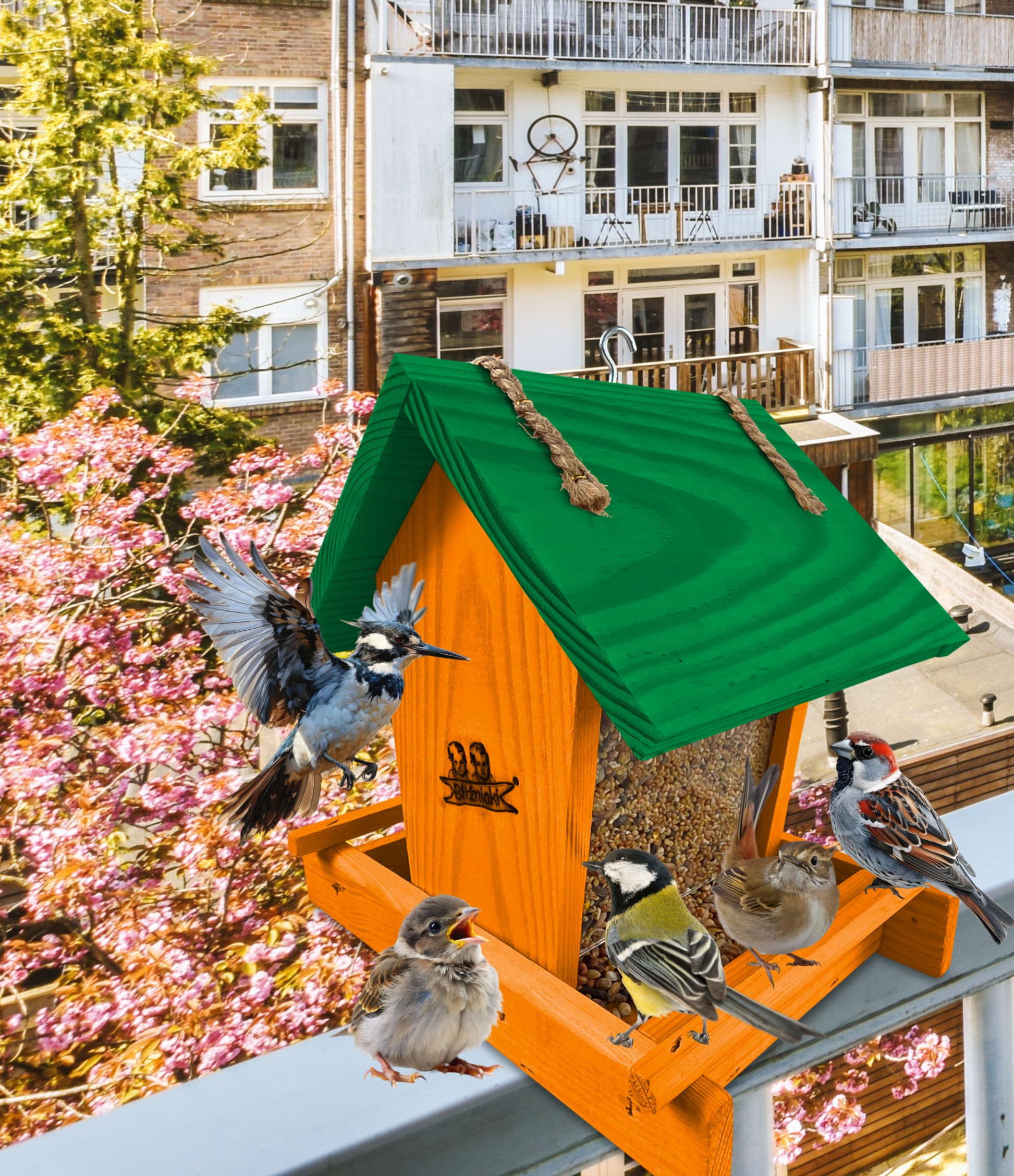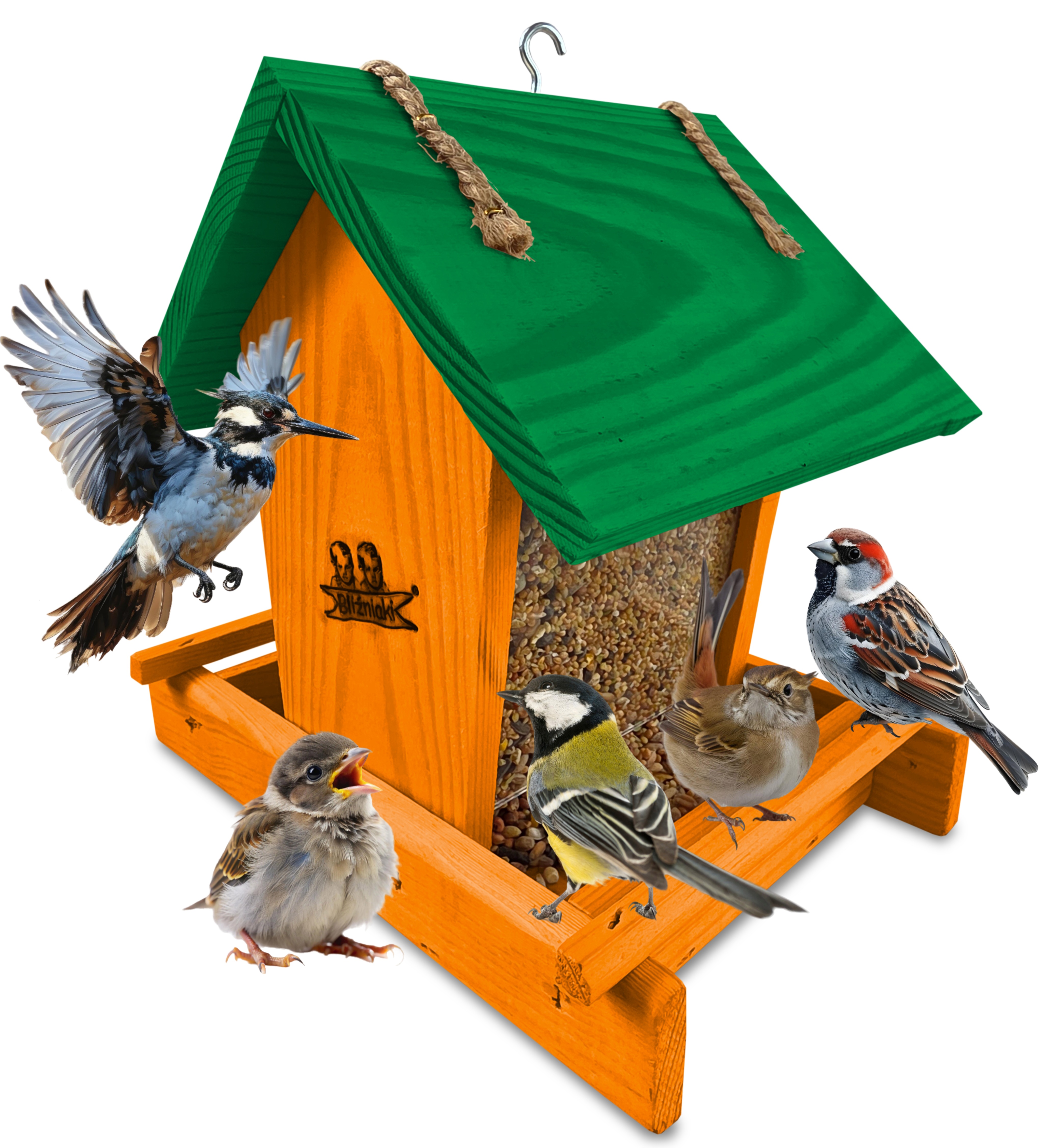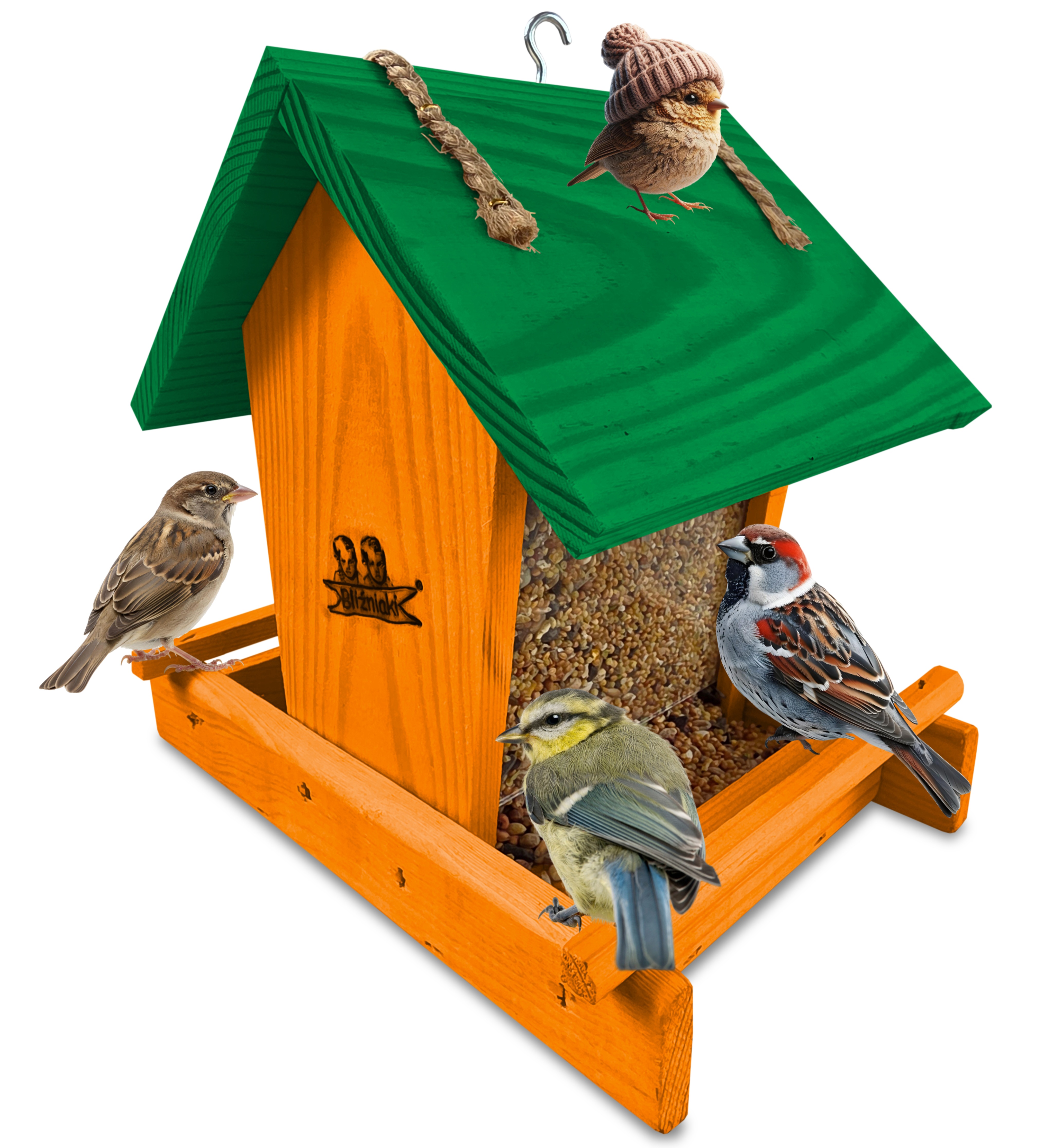- Karmnik wykonany jest w całości z drewna iglastego, KOLOR POMARAŃCZOWY Z CIEMNOZIELONYM DACHEM