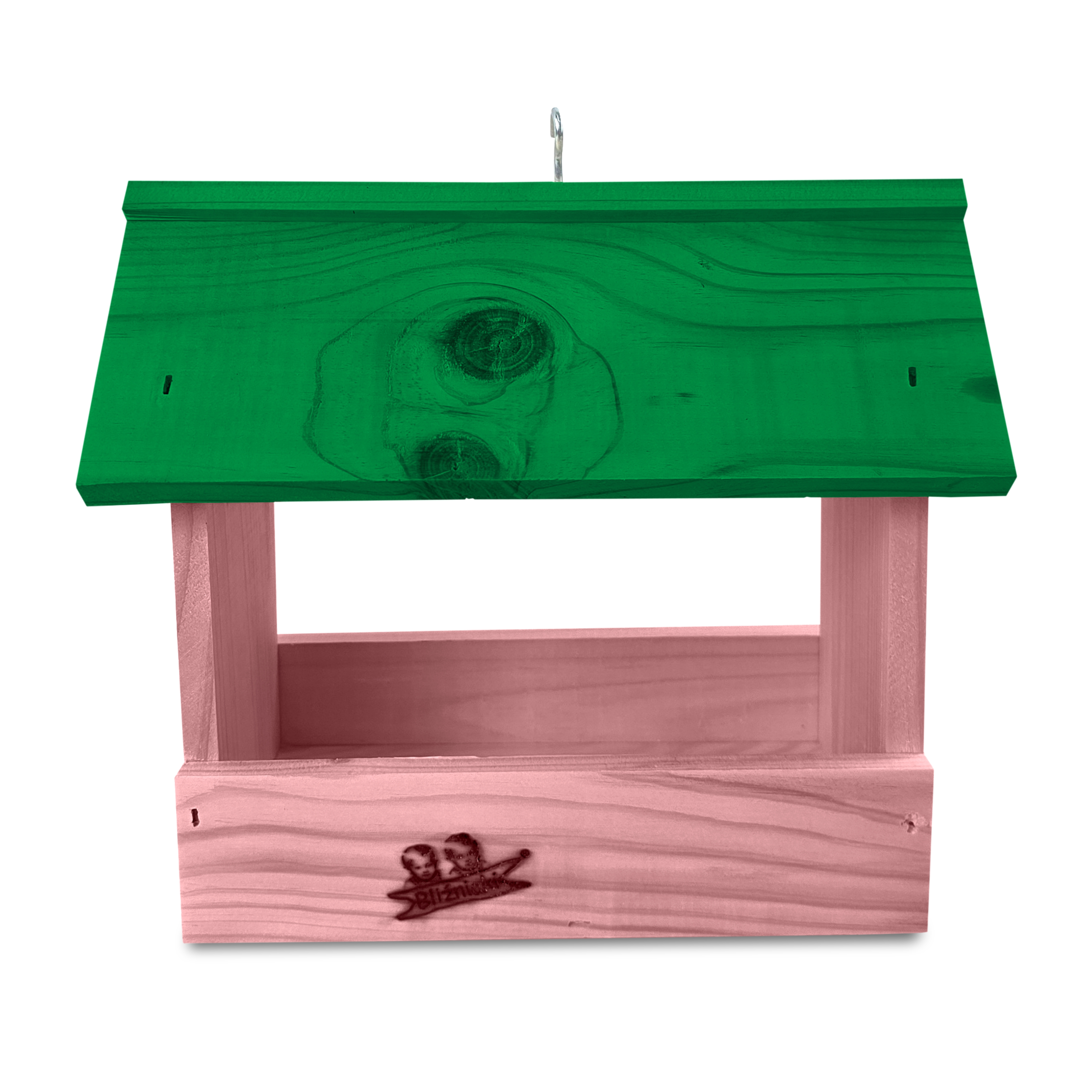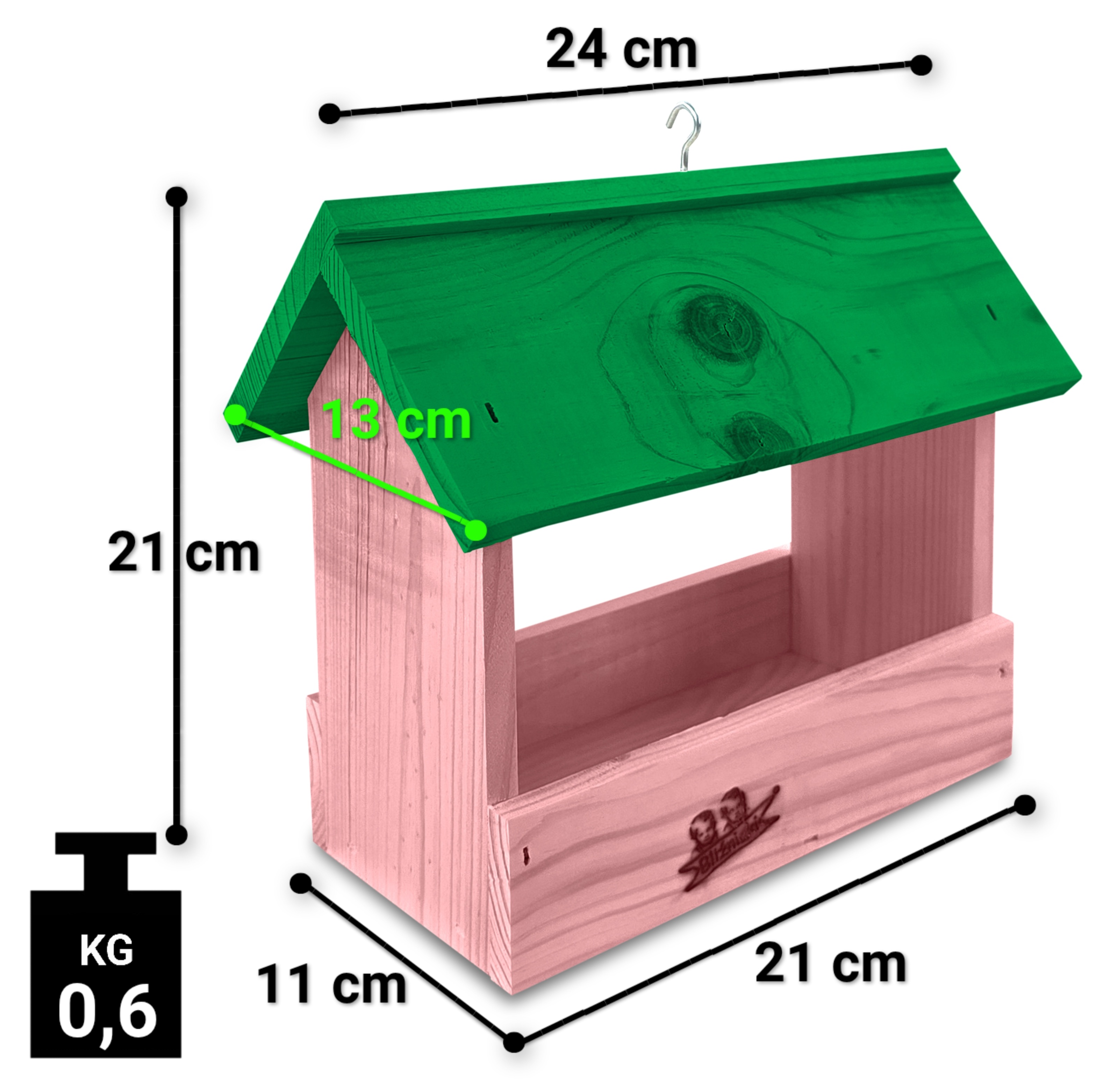 - Karmnik wykonany jest w całości z drewna iglastego, KOLOR PASTELOWY RÓŻ Z ZIELONYM DACHEM