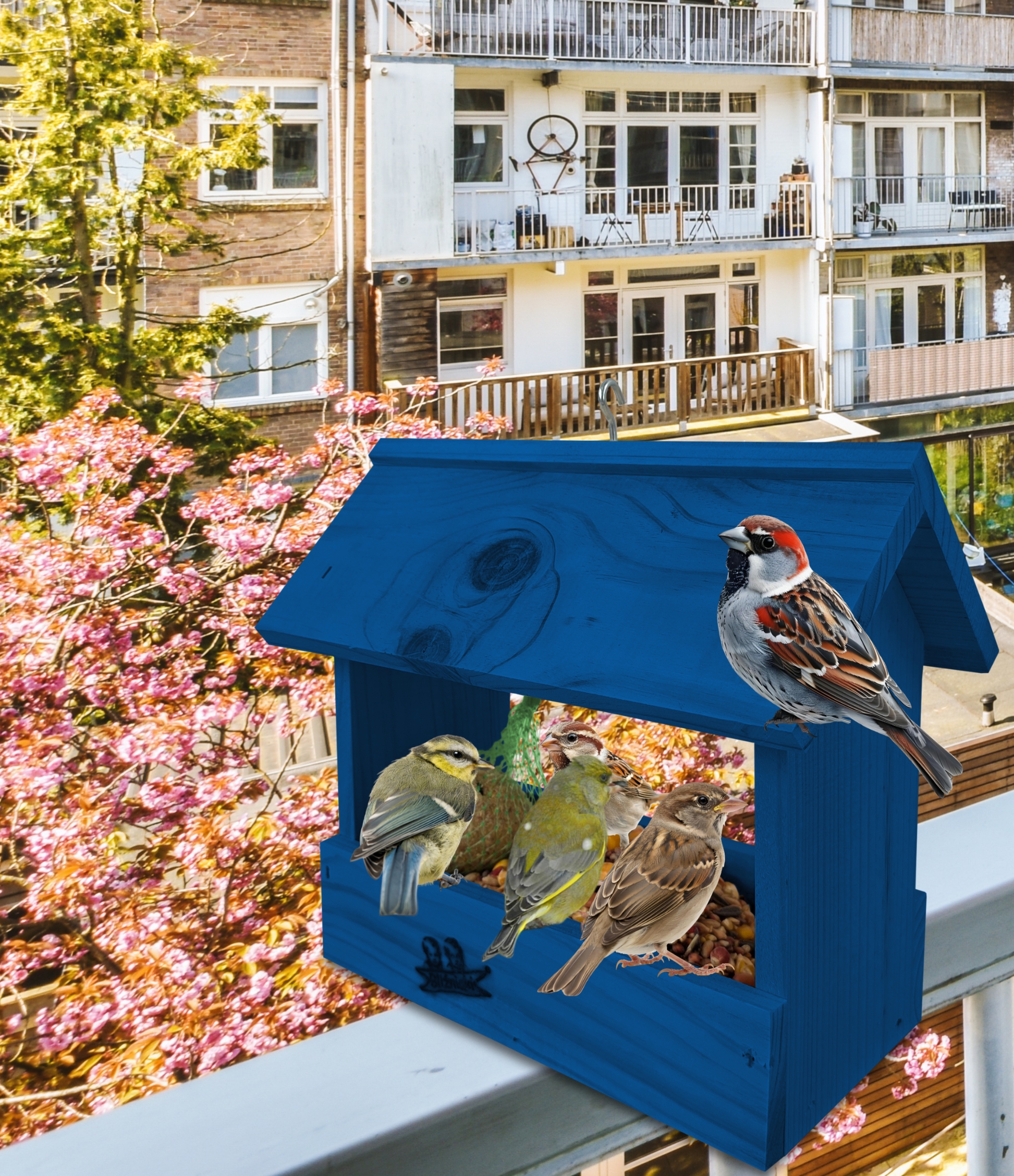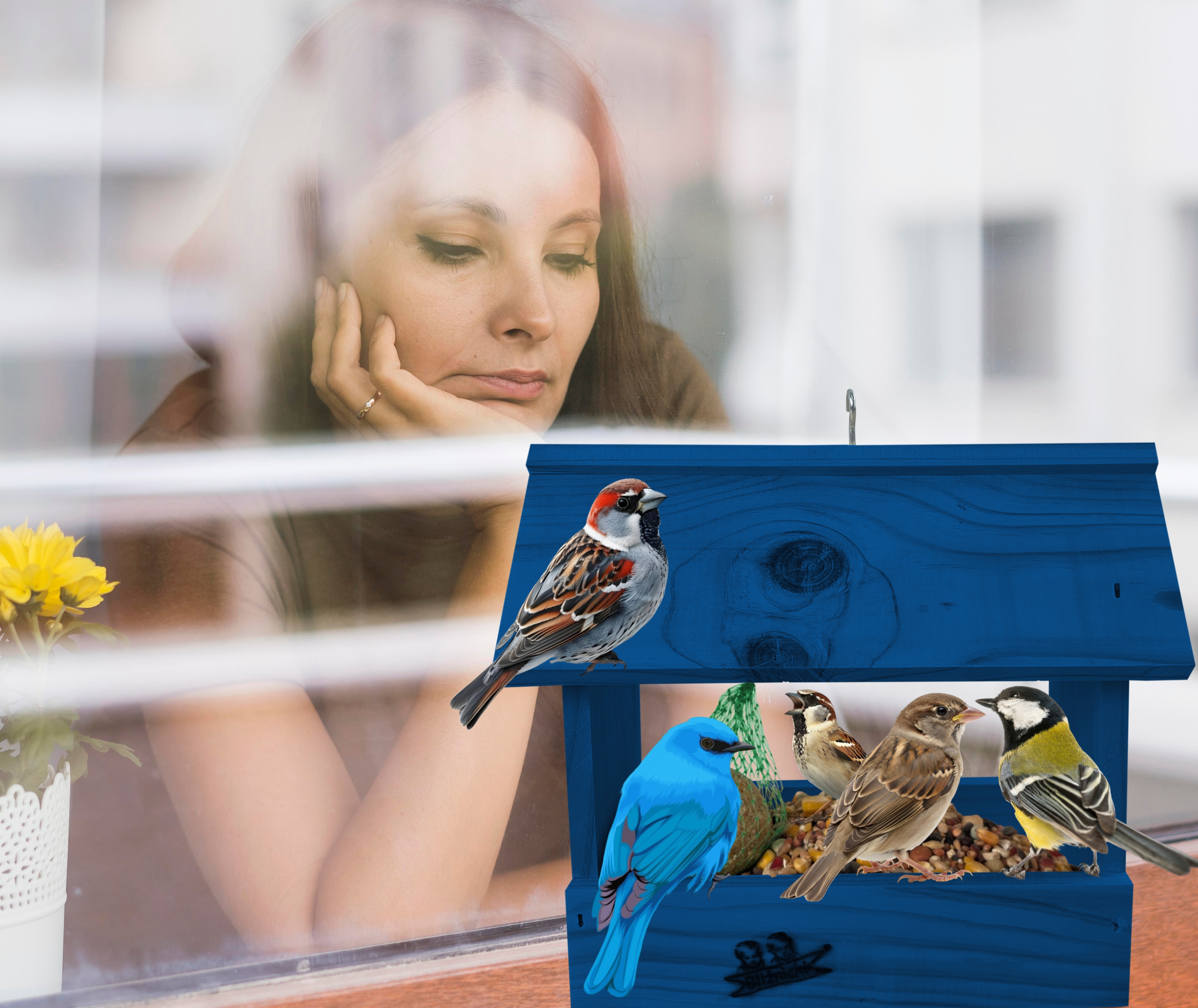 Przedmiotem sprzedaży jest ozdobny drewniany karmnik dla ptaków budka domek na balkon K204 NB w kolorze ciemnoniebieskim