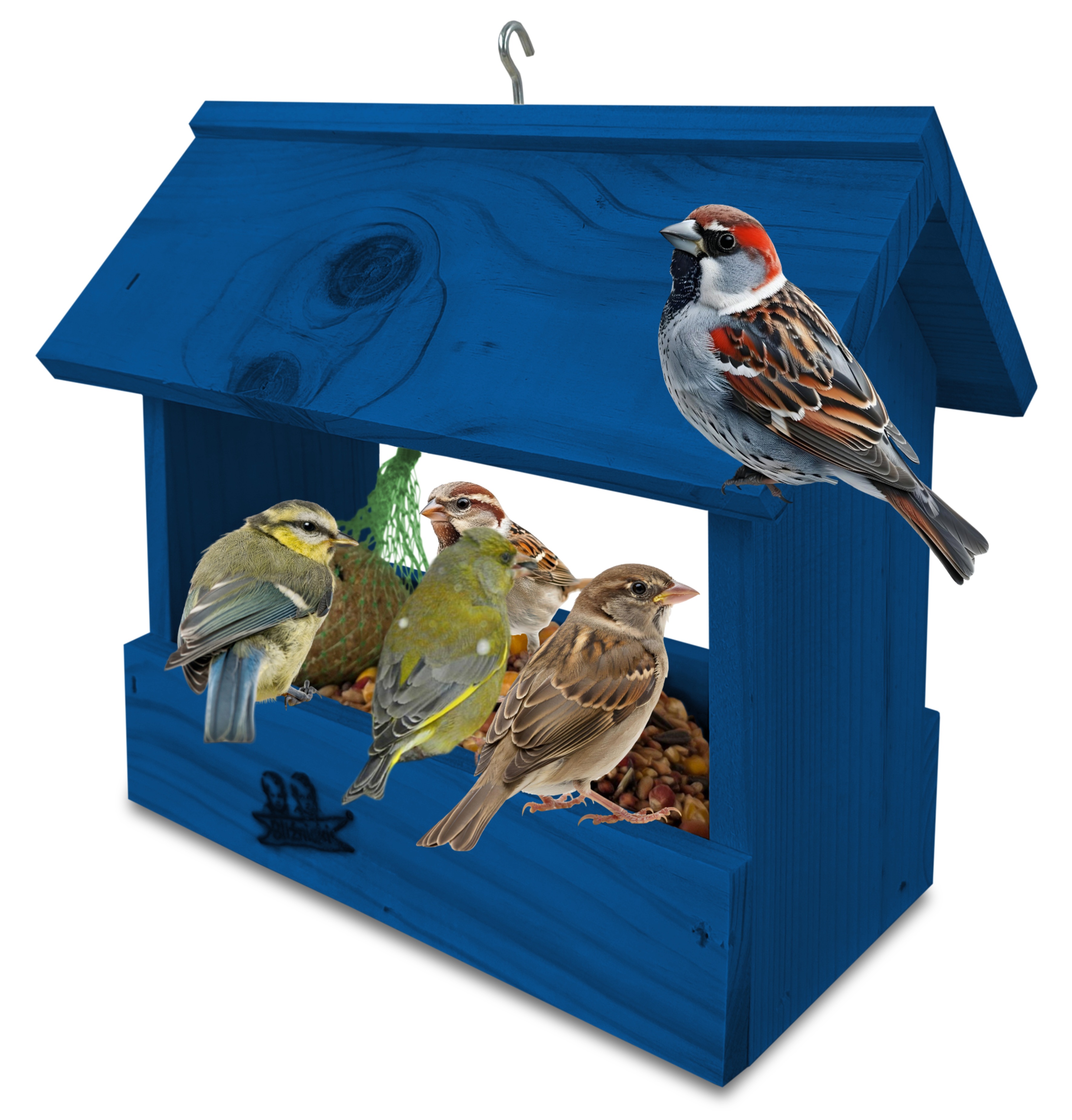 - U góry widoczny jest haczyk umożliwiający zawieszenie karmnika w dowolnym miejscu, możliwe jest również jego postawienie