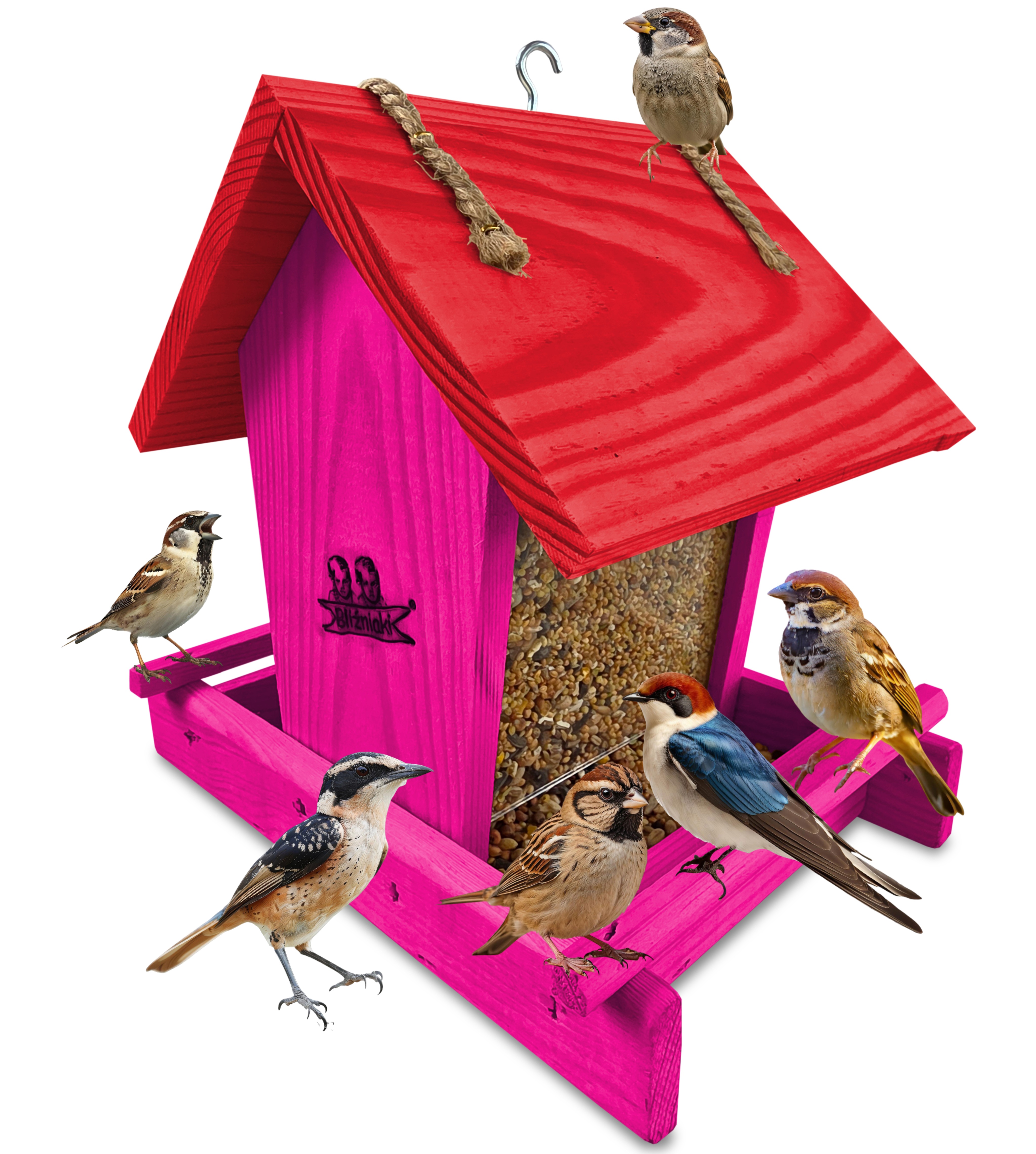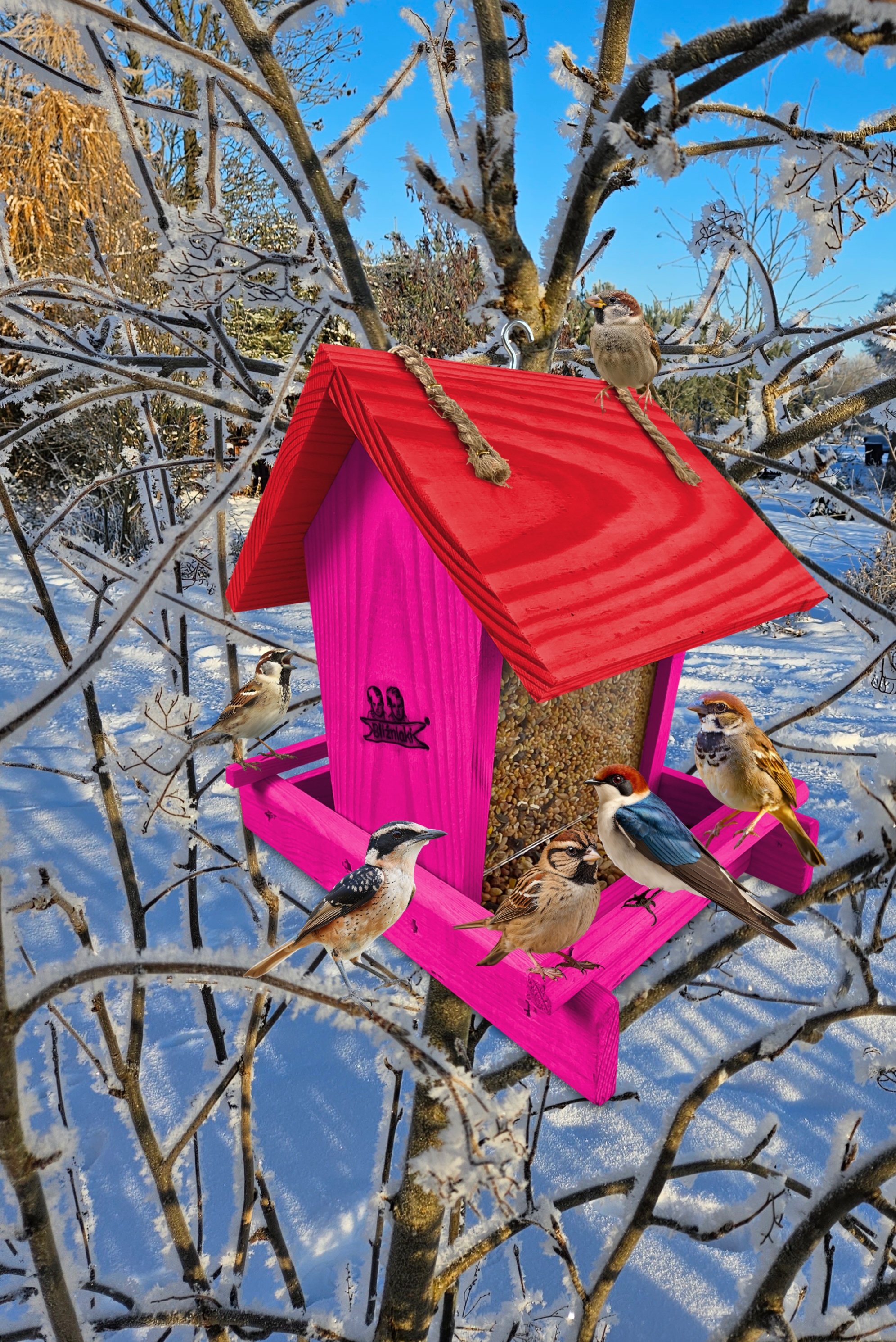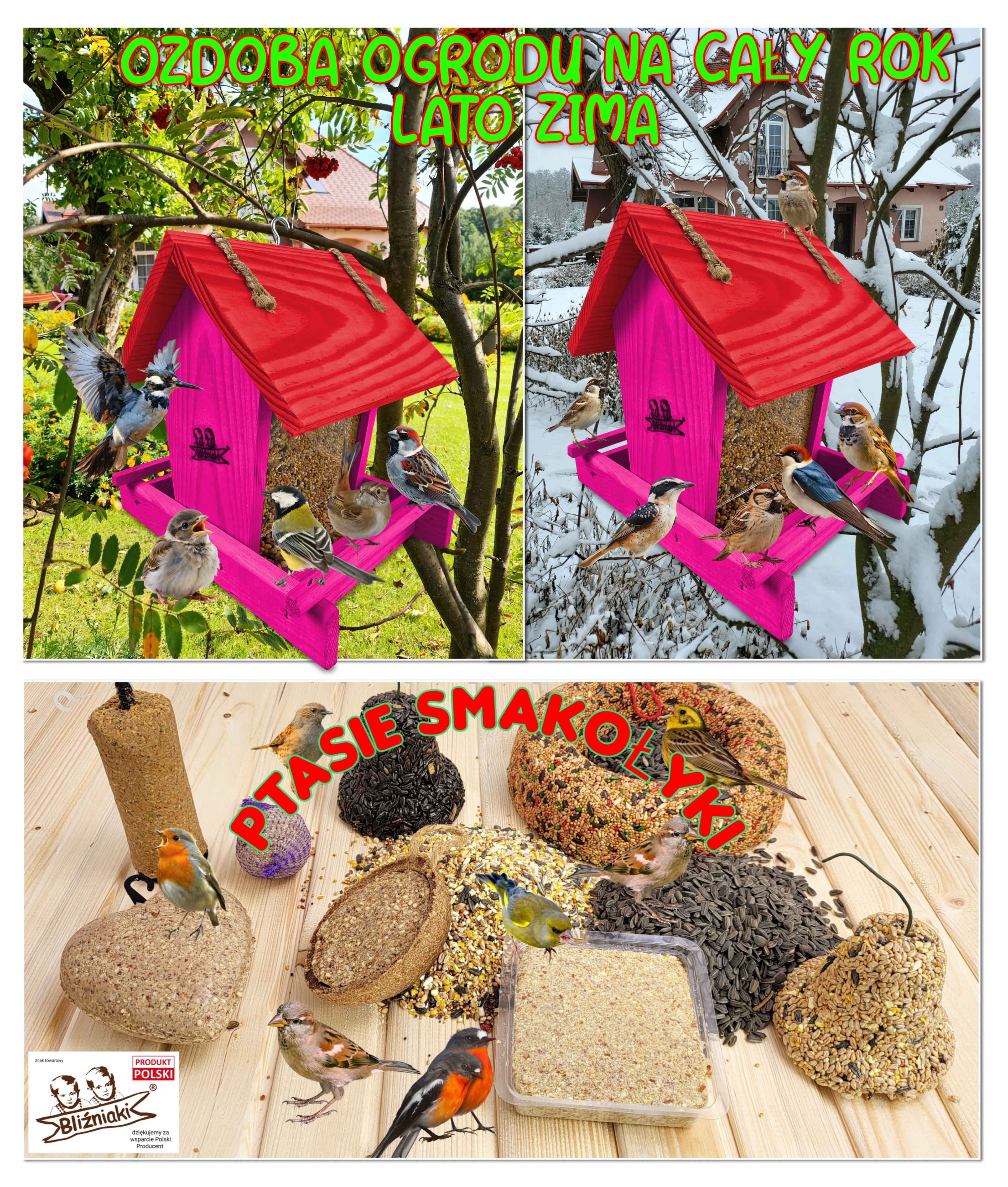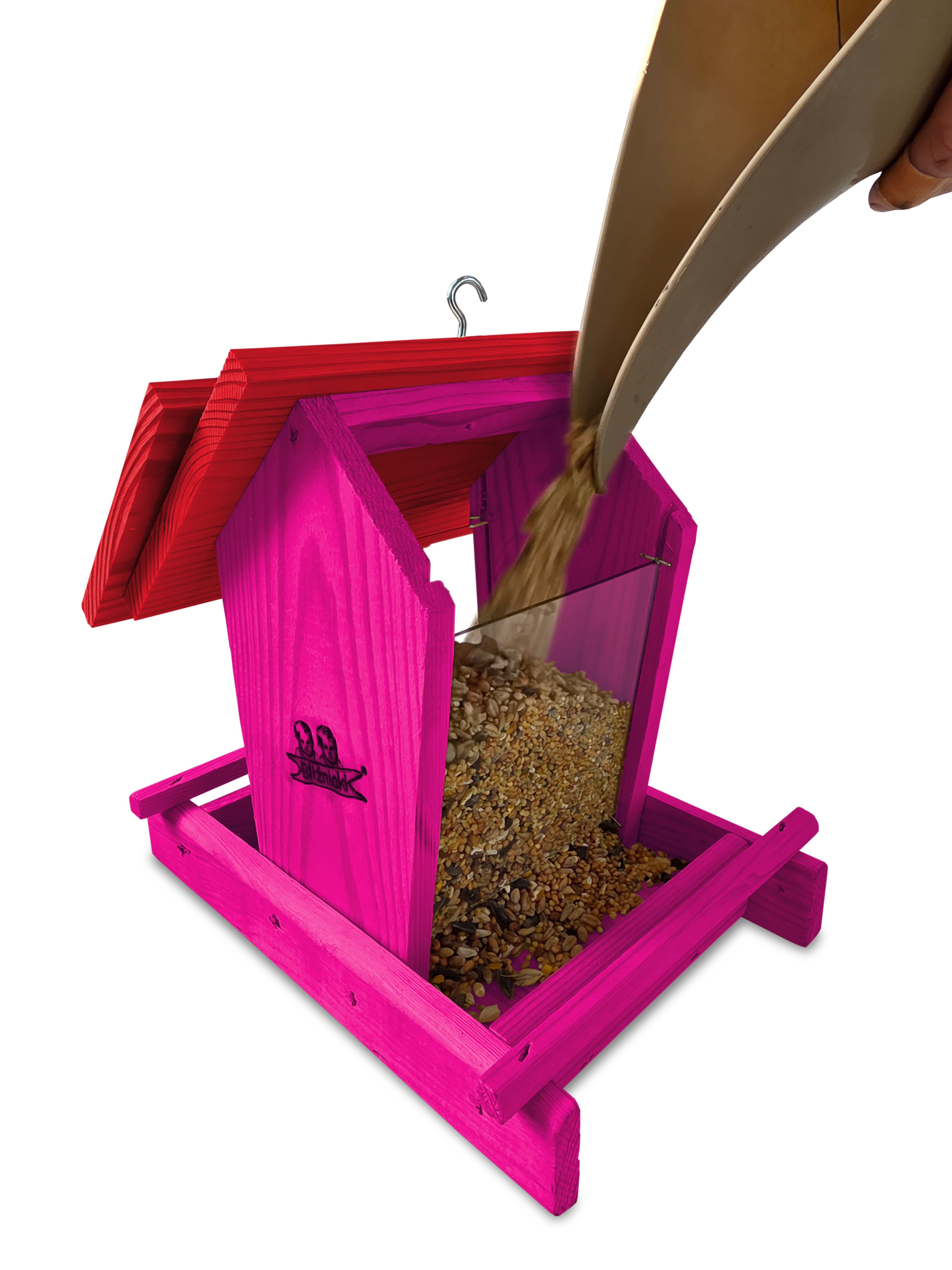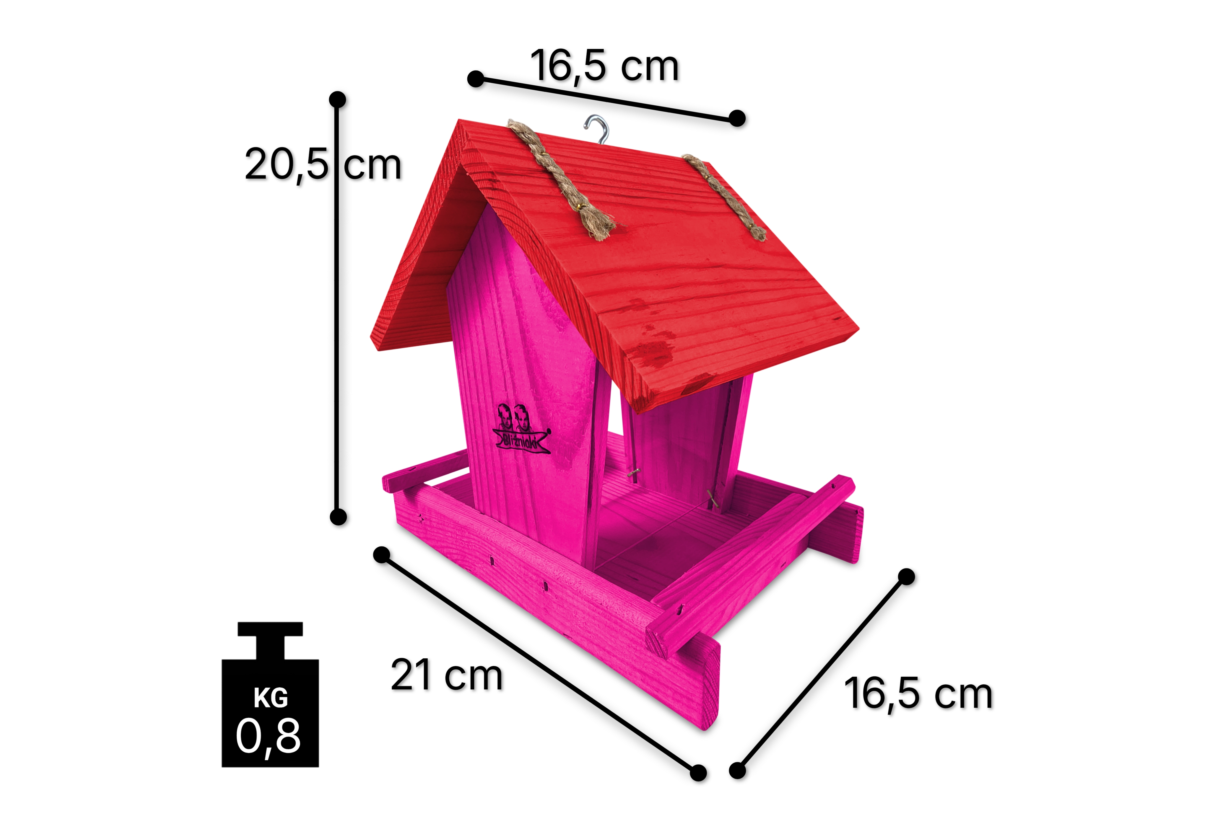 - Karmnik wykonany jest w całości z drewna iglastego, KOLOR CIEMNY RÓŻ Z CZERWONYM DACHEM