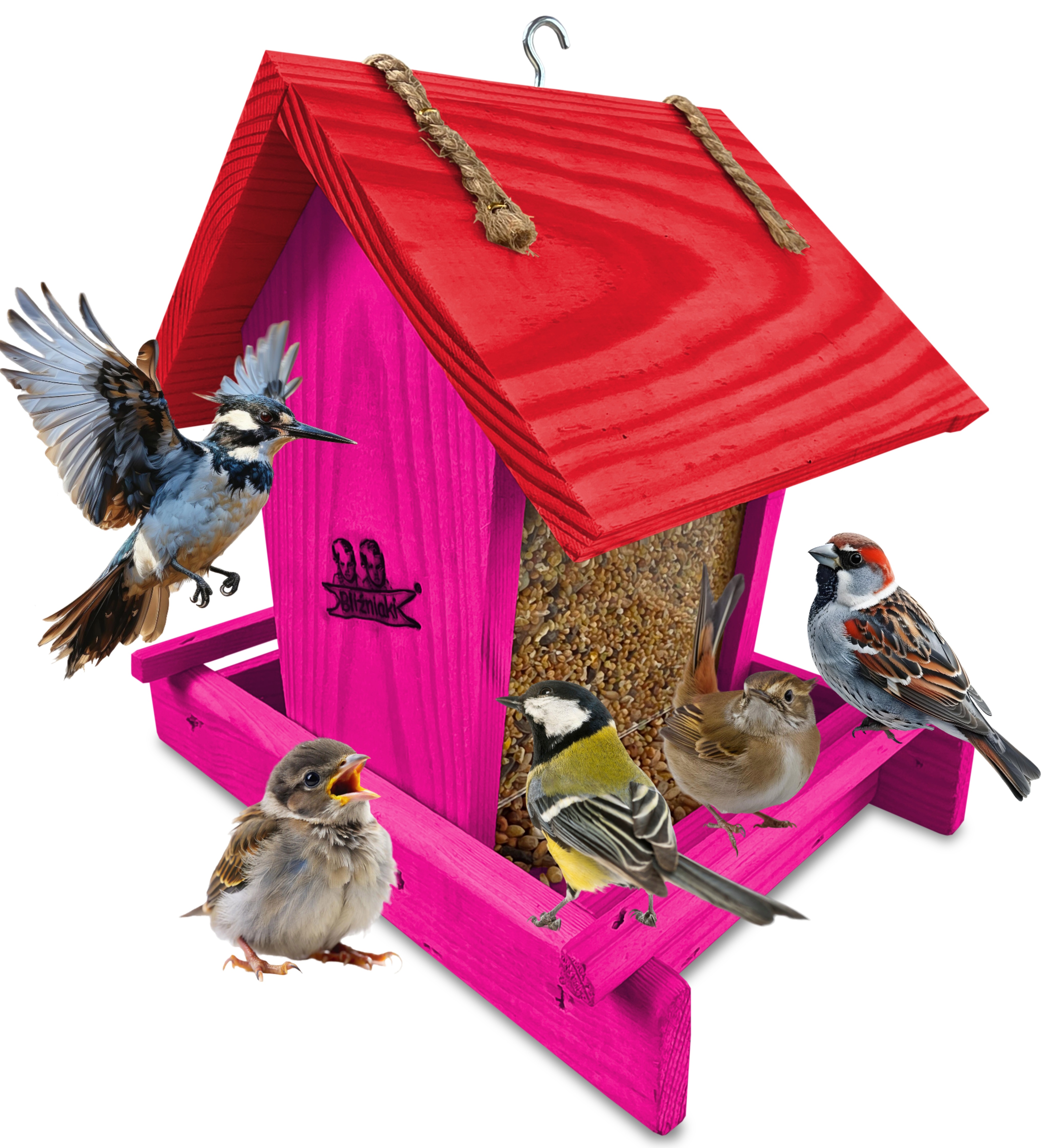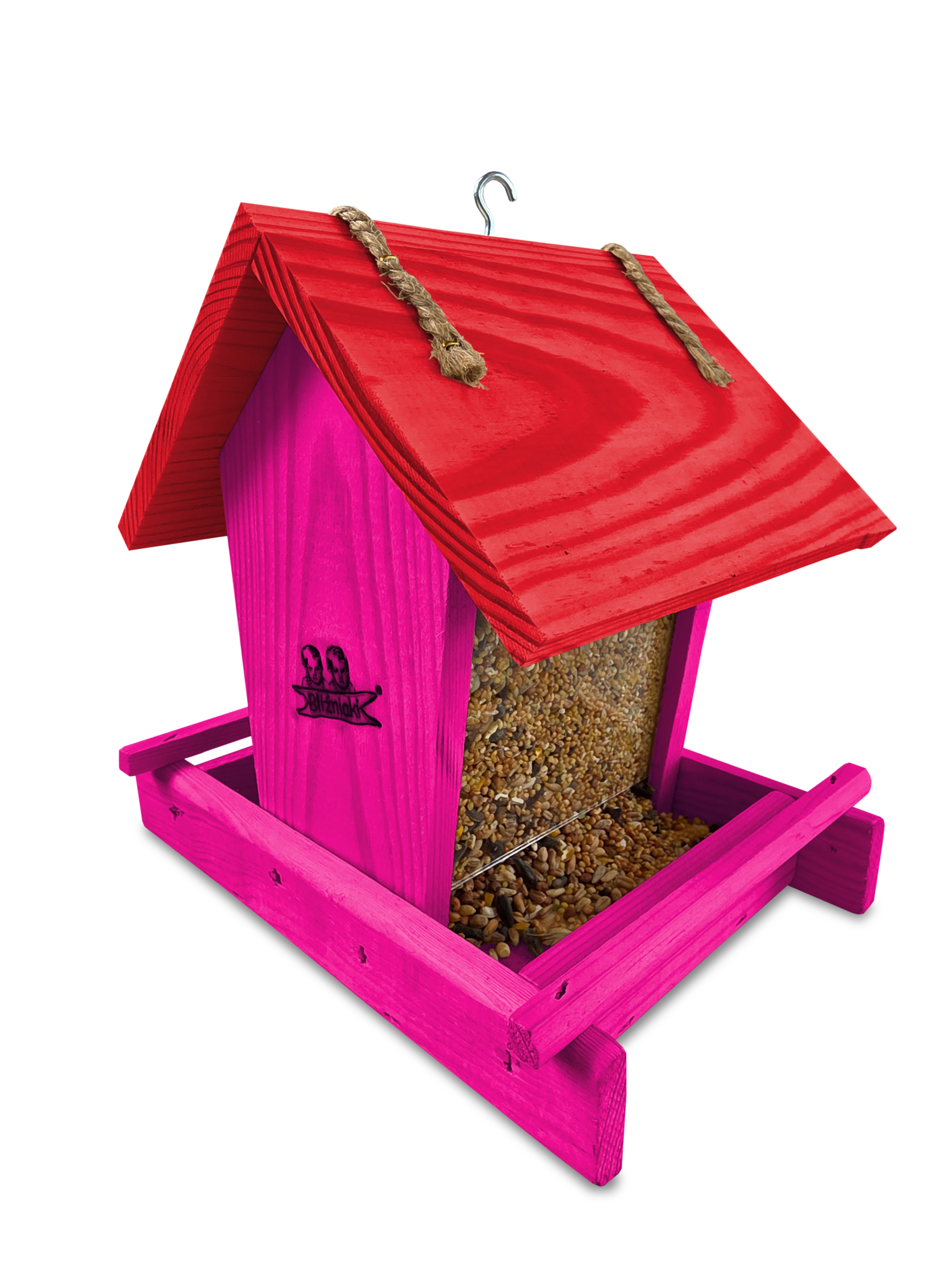 Przedmiotem sprzedaży jest ozdobny drewniany karmnik dla ptaków z dozownikiem ziarna model K29 RÓ CB kolor ciemny róż z czerwonym dachem