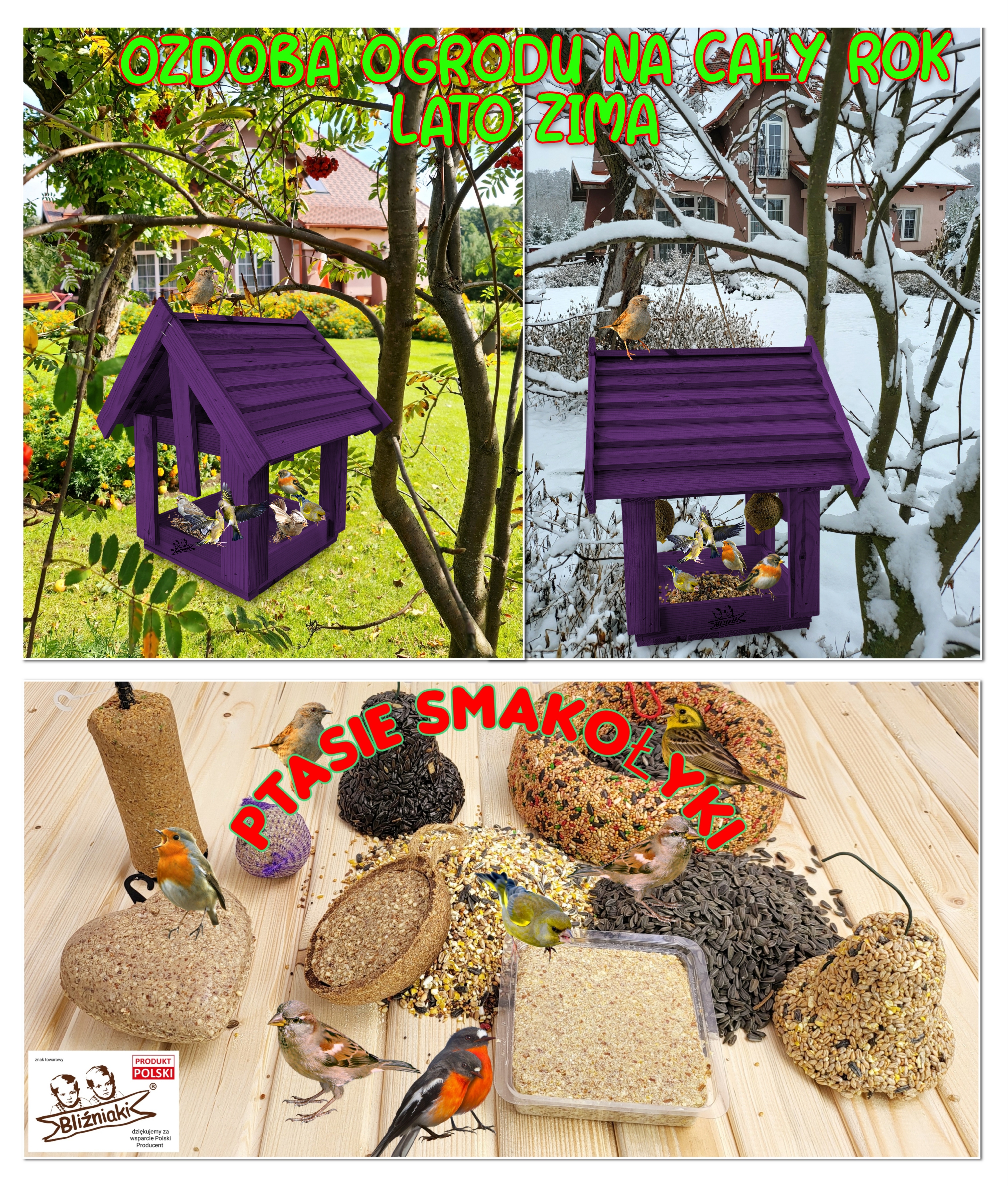 słonecznik ziarnisty łuszczony i niełuszczony, i wiele innych smakołyków w wygodnej formie pozwalającej powiesić produkt w dowolnym miejscu w ogrodzie, a także niezbędne do dokarmiania ptaków karmniki.