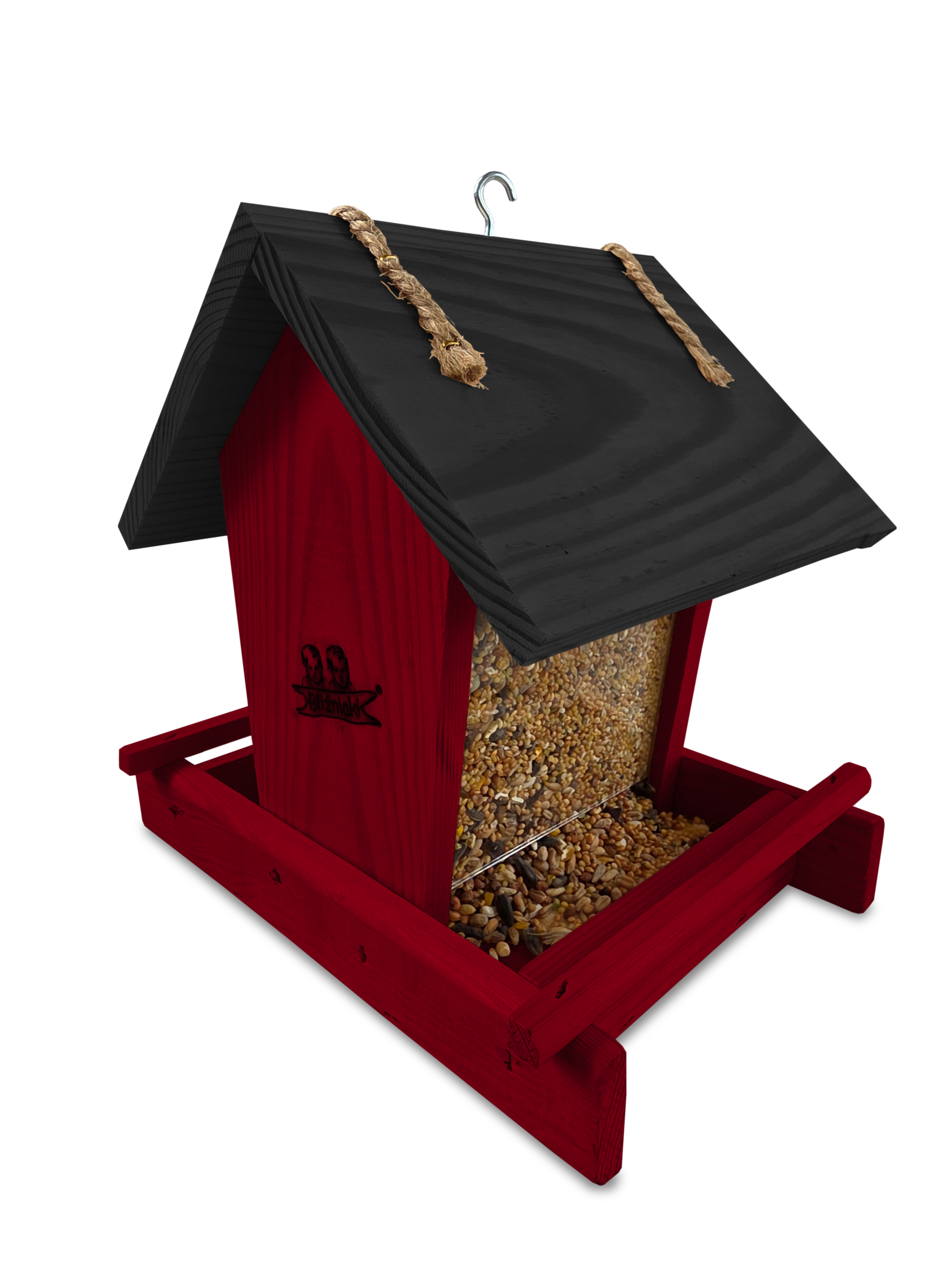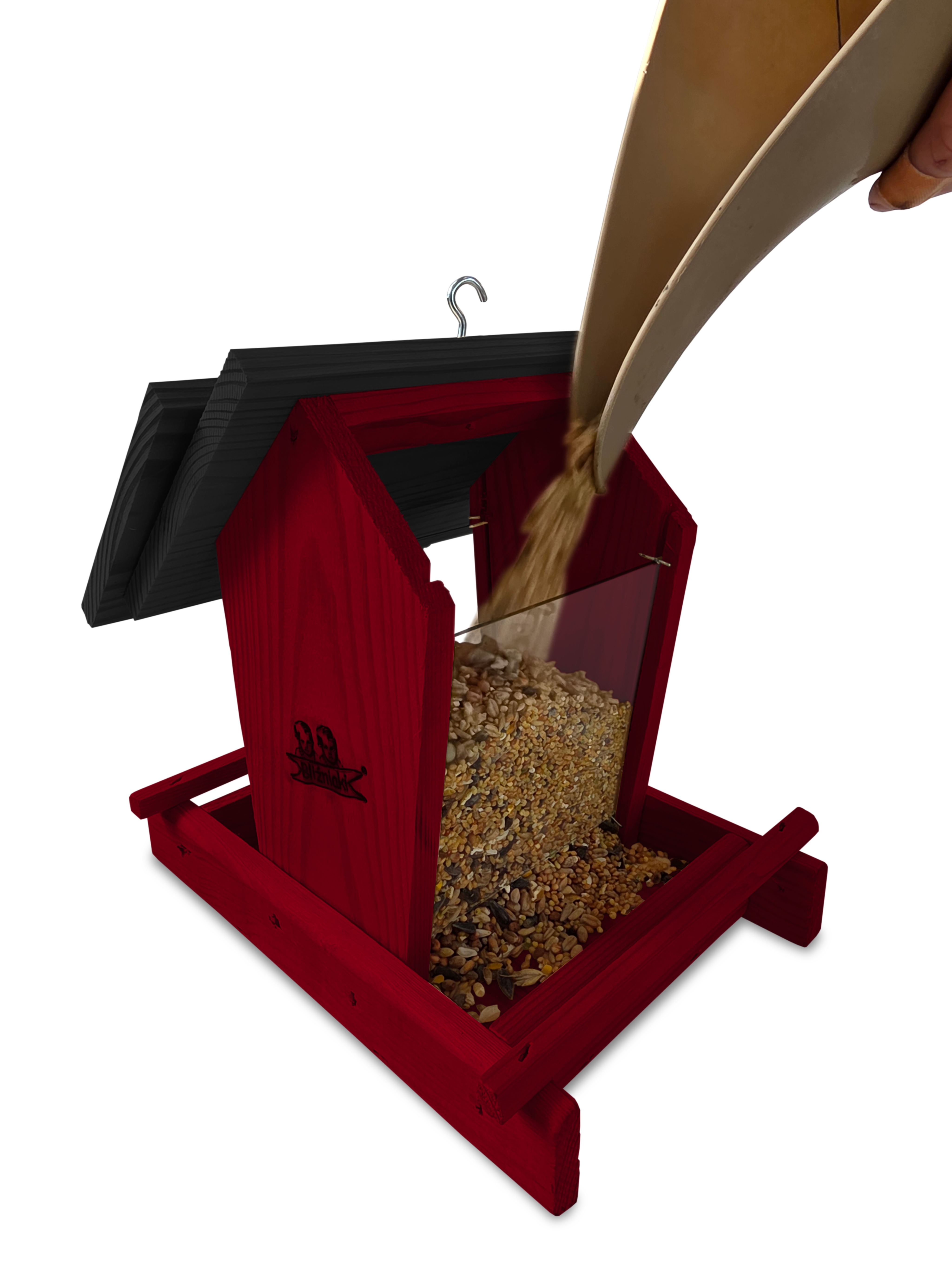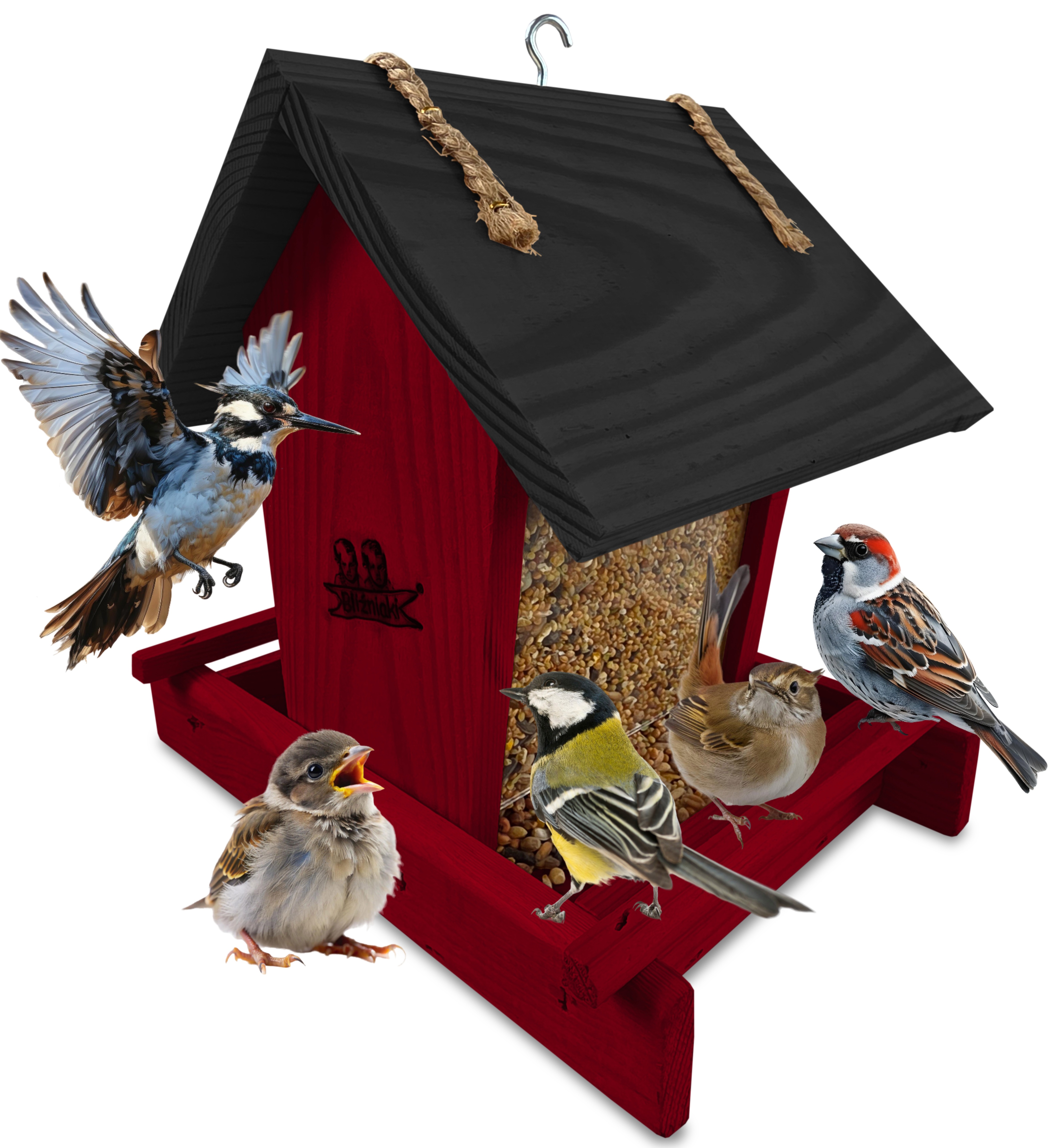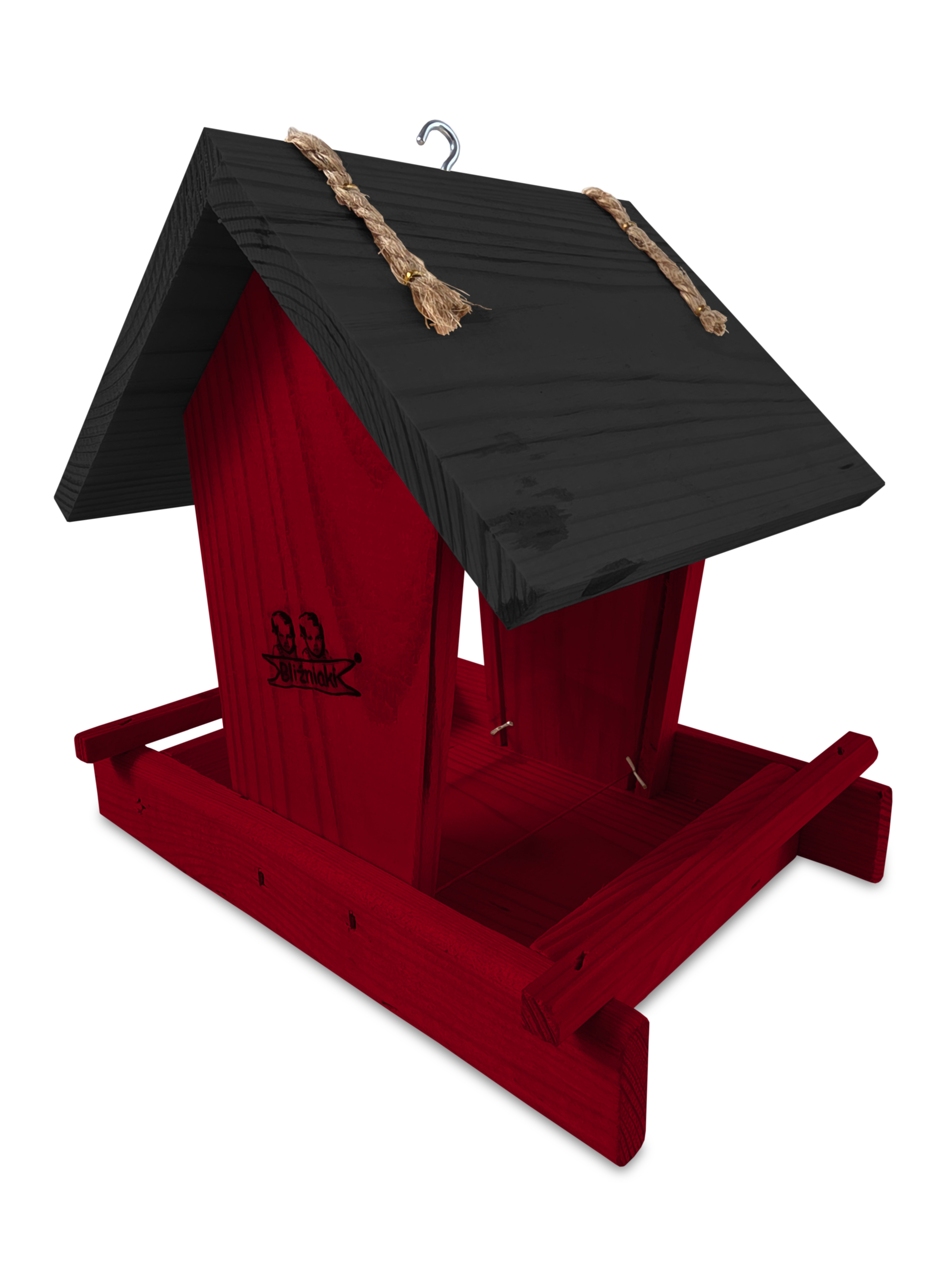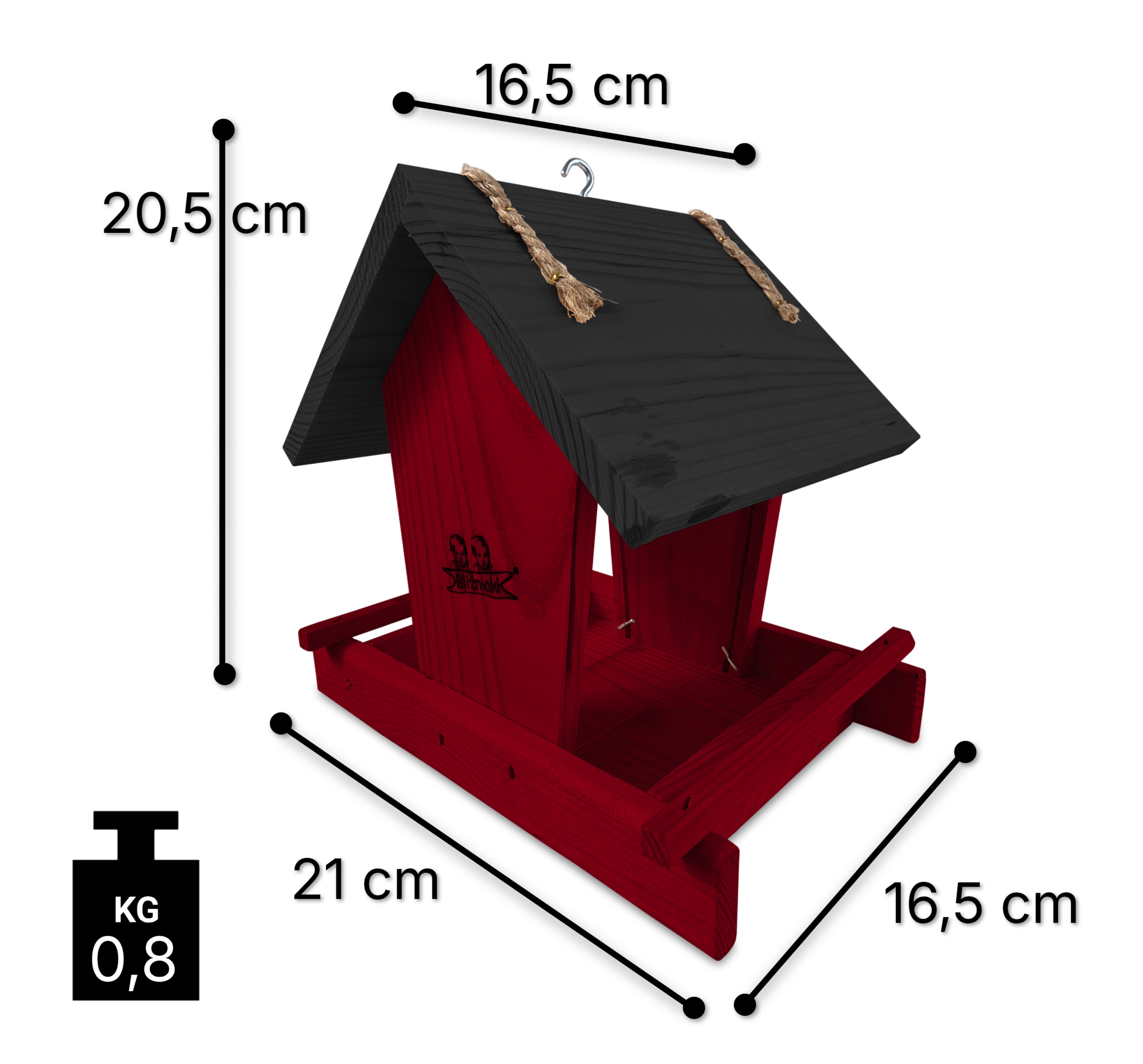 - Karmnik wykonany jest w całości z drewna iglastego, KOLOR MAHONIOWY Z CZARNYM DACHEM