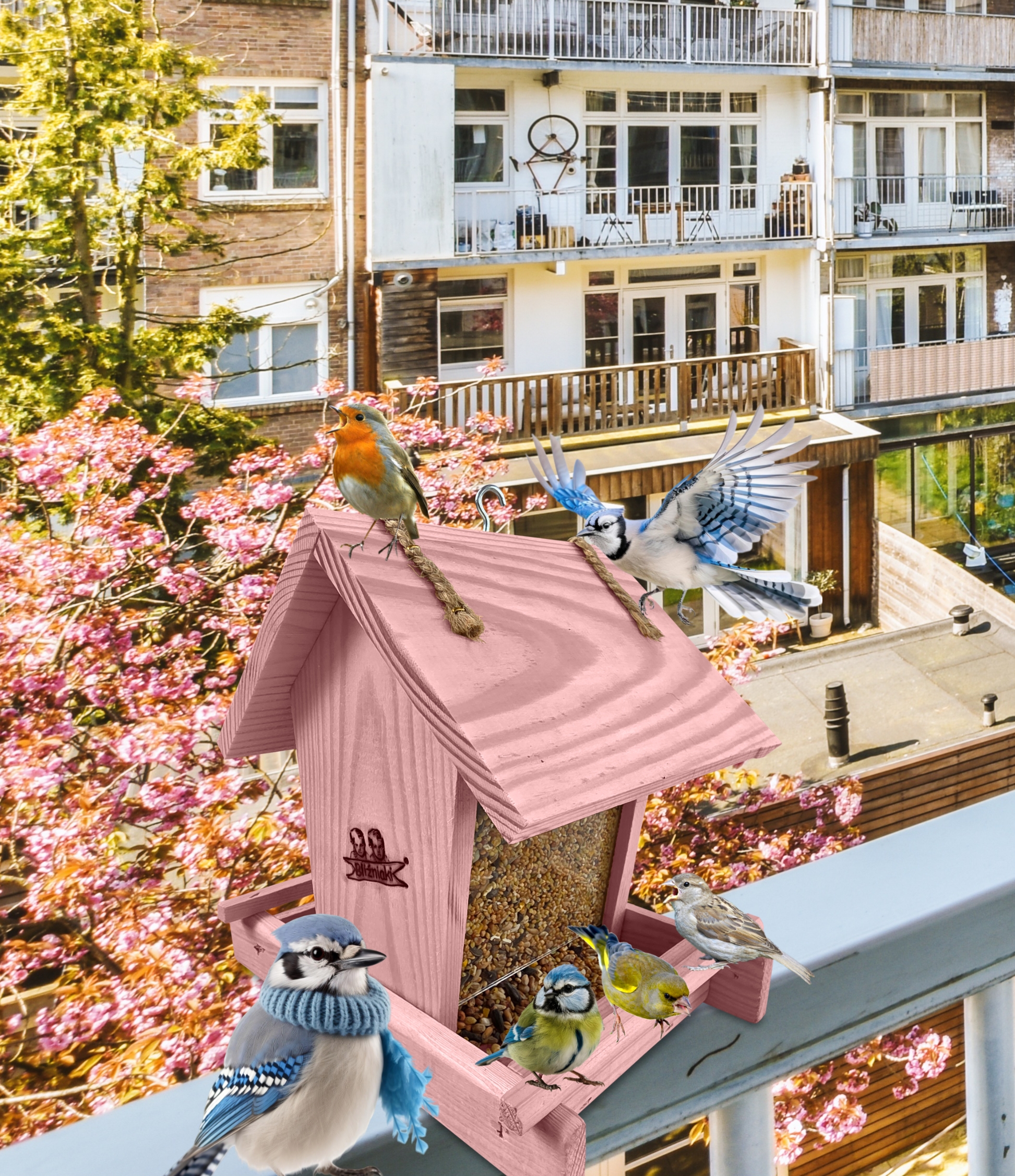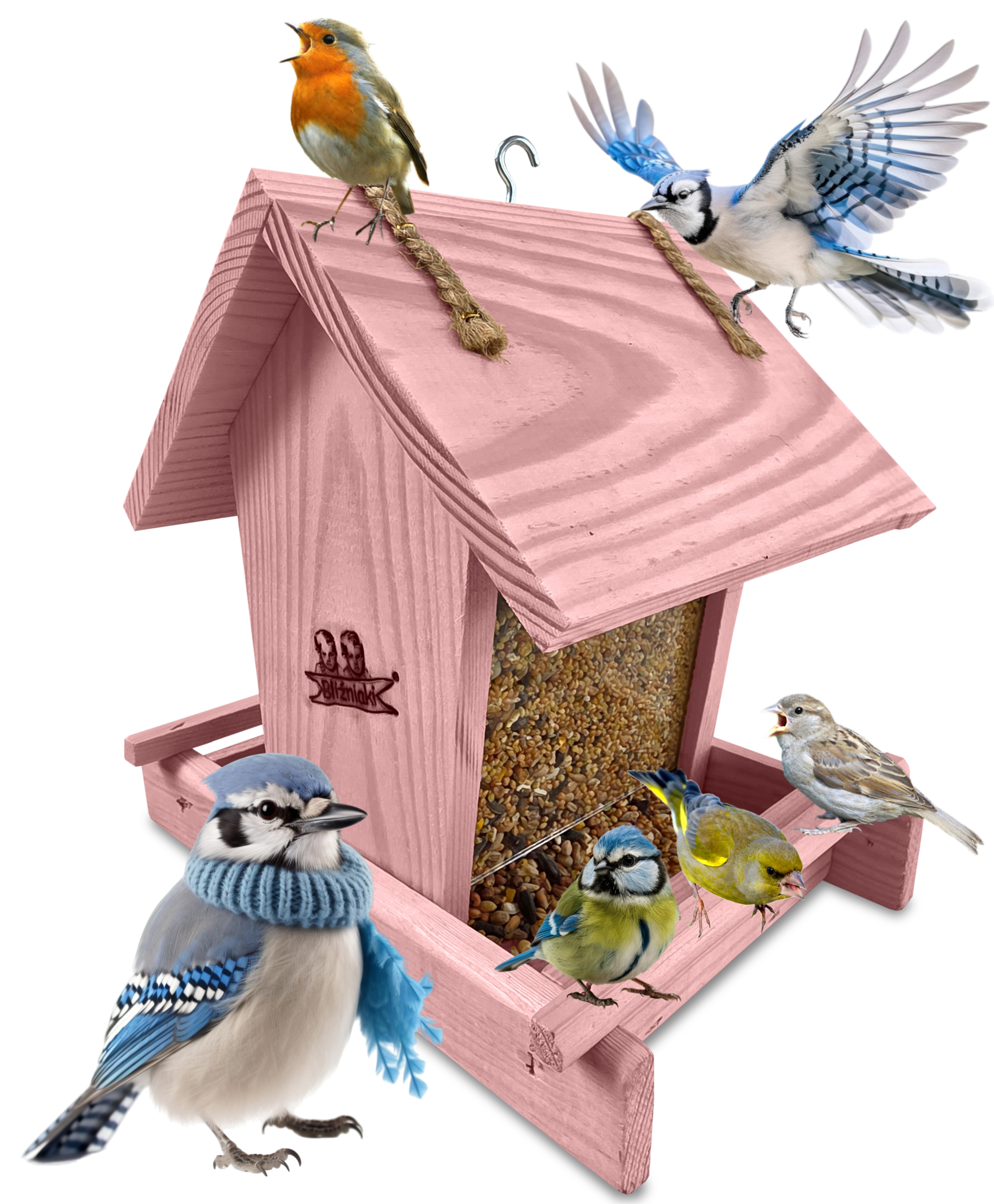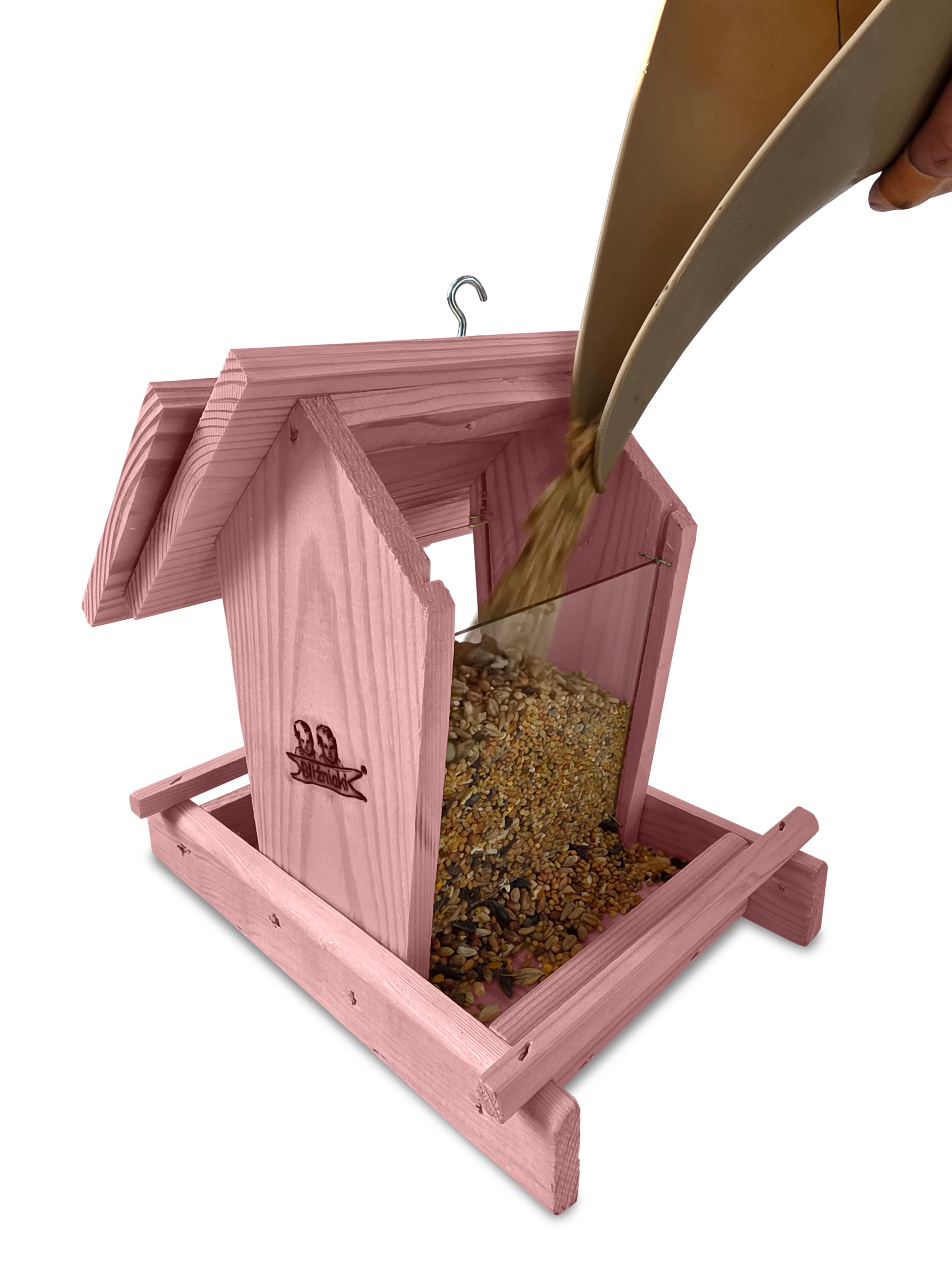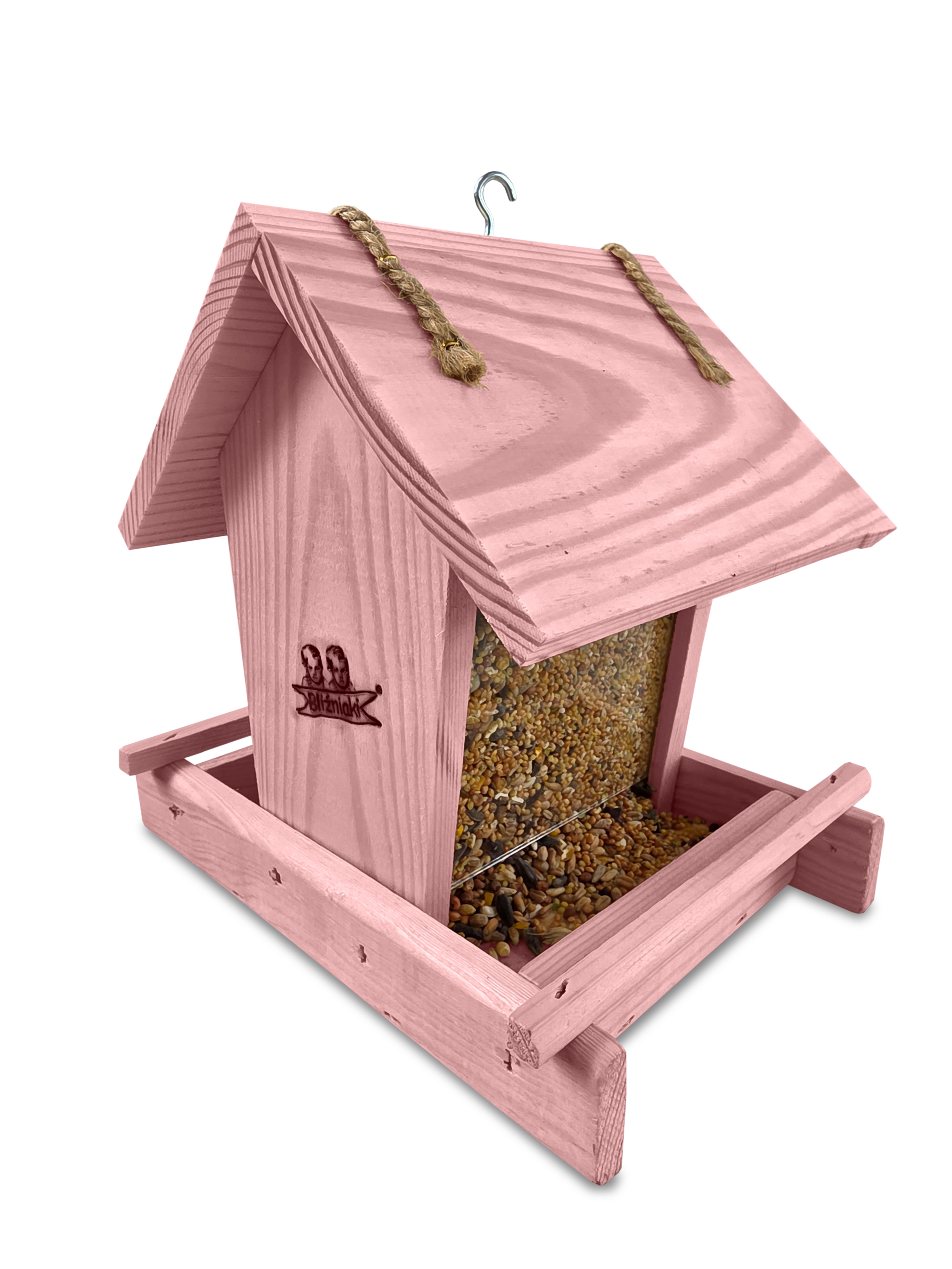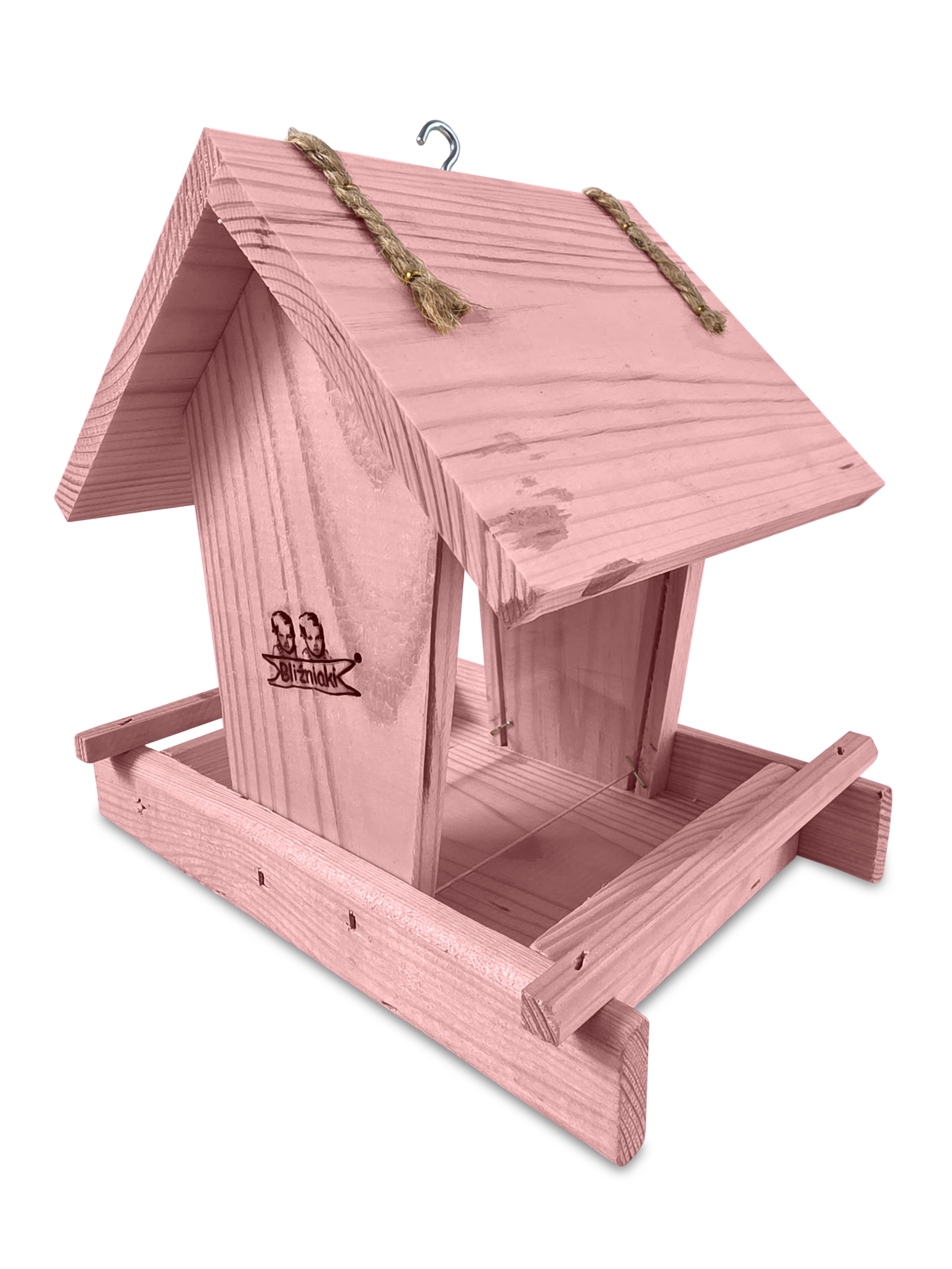Przedmiotem sprzedaży jest ozdobny drewniany Karmnik dla ptaków z dozownikiem ziarna model K29 RÓPP w kolorze pastelowego różu